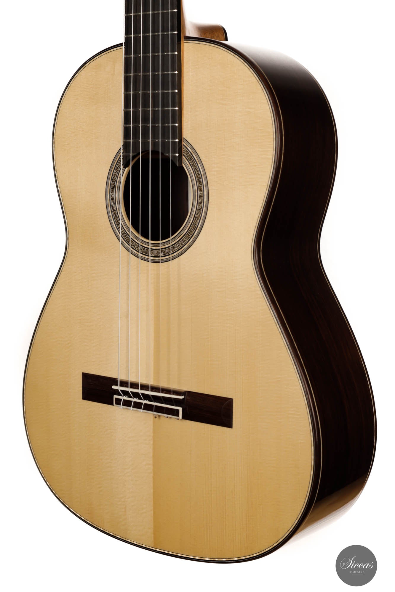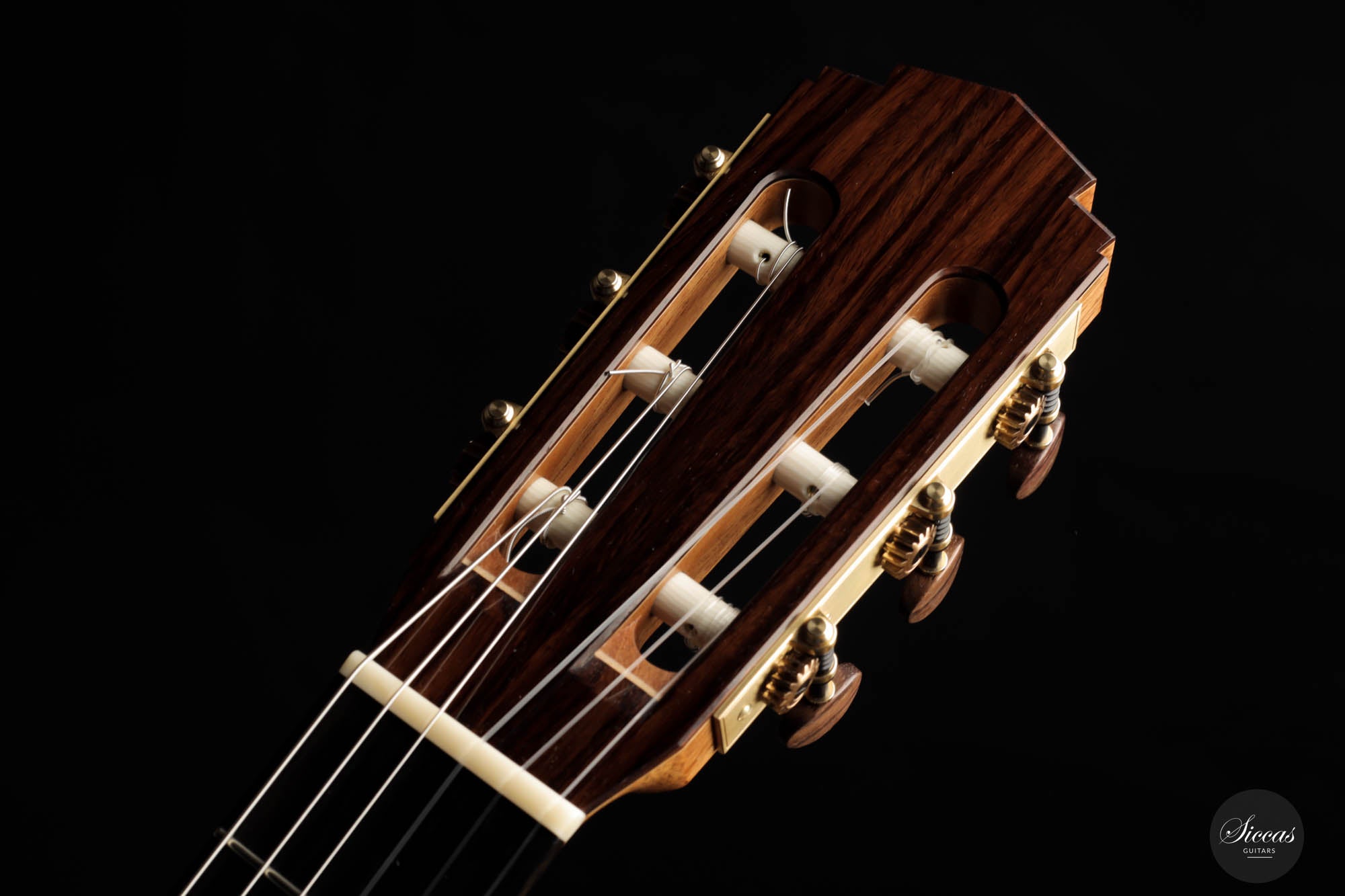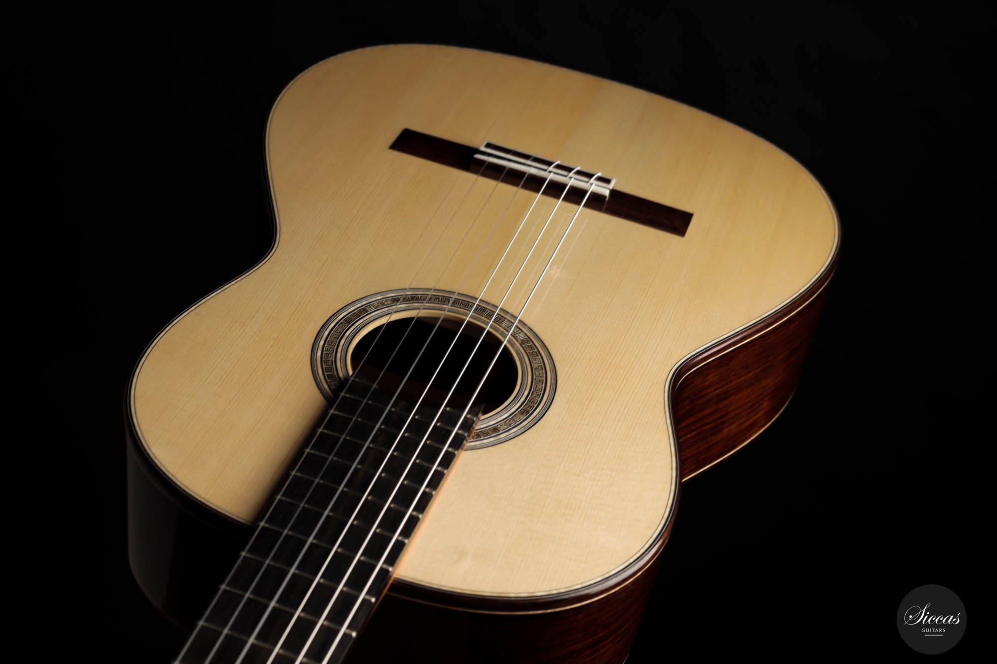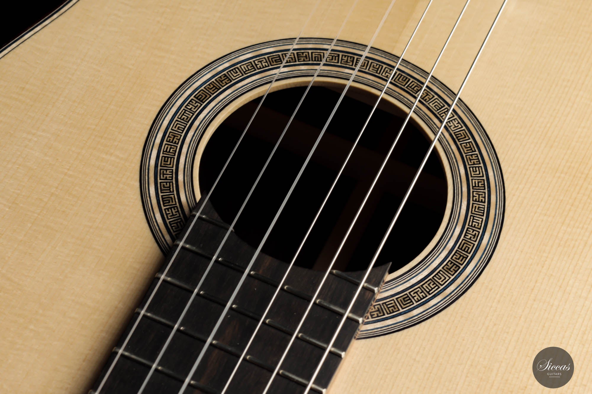 This beautiful instrument is a unique combination of a traditional Spanish guitar and a modern concert classical guitar. It has a traditional design that Jose L. Romanillos heavily influenced. Yet, it also features some modern elements in contemporary guitar making, such as elevated fingerboard, significant volume and projection, and excellent playability. This guitar displays Johanna's very high level of craftsmanship and artistry. The spruce soundboard was tuned to the F/F#, creating deep and hunting bass characteristics. Meanwhile, the crystal-clear trebles match the overall voicings in a charming proportion. This fine instrument is a true concert guitar that will fulfill the need of a guitarist of any level and for any concert situation.