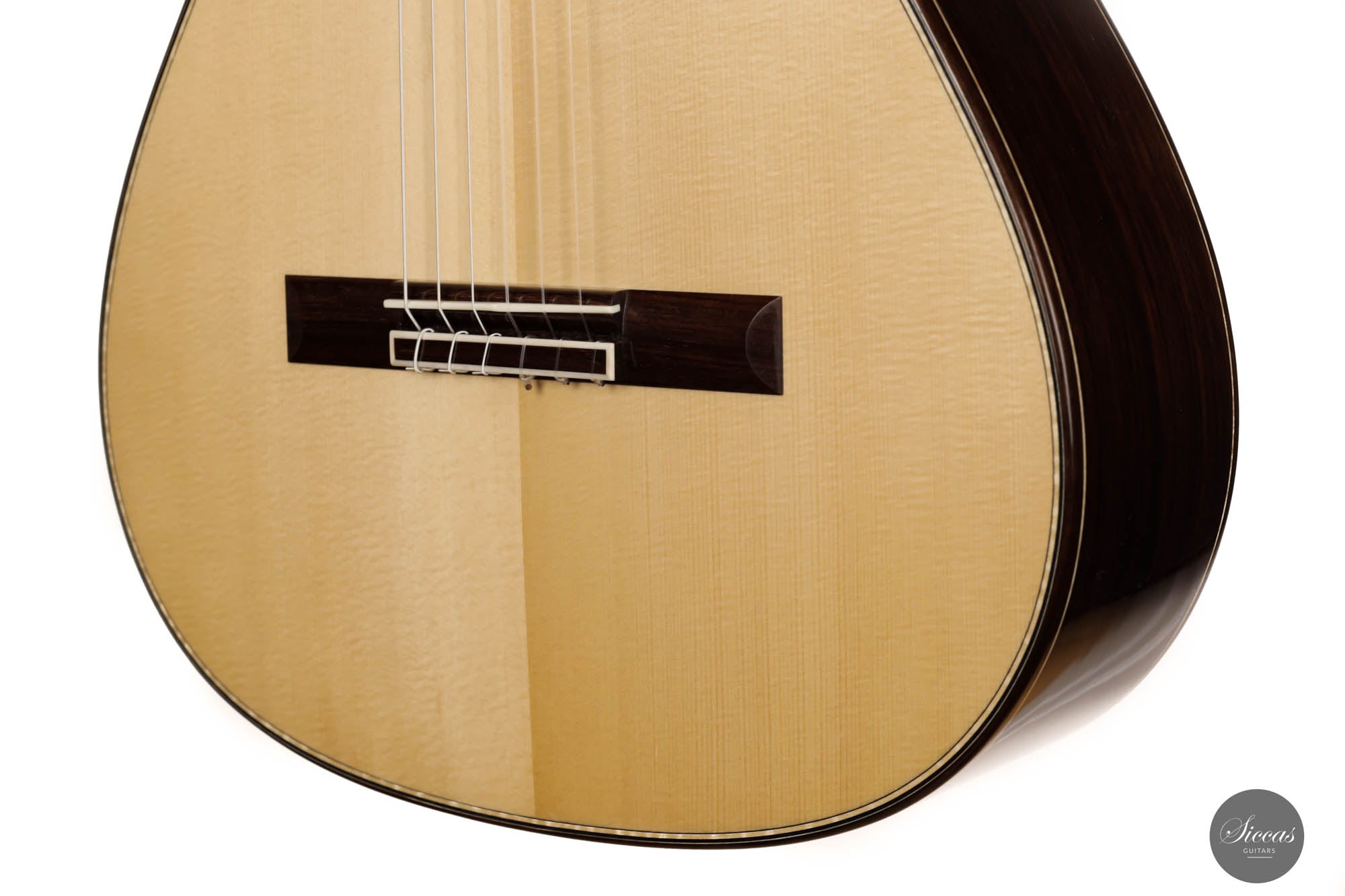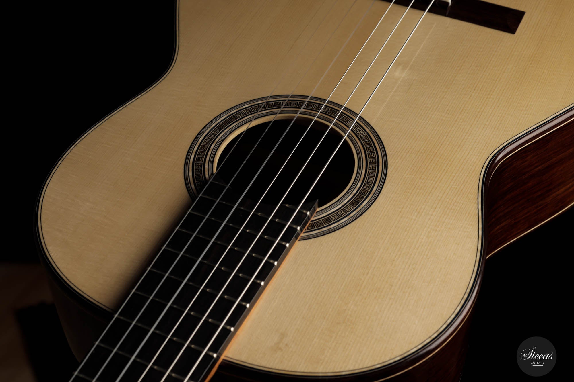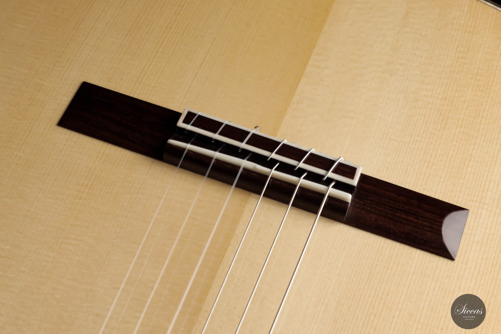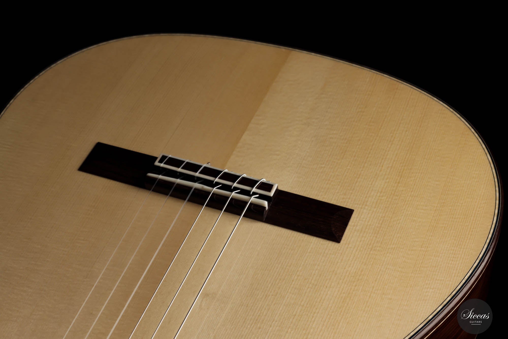 This beautiful instrument is a unique combination of a traditional Spanish guitar and a modern concert classical guitar. It has a traditional design that Jose L. Romanillos heavily influenced. Yet, it also features some modern elements in contemporary guitar making, such as elevated fingerboard, significant volume and projection, and excellent playability. This guitar displays Johanna's very high level of craftsmanship and artistry. The spruce soundboard was tuned to the F/F#, creating deep and hunting bass characteristics. Meanwhile, the crystal-clear trebles match the overall voicings in a charming proportion. This fine instrument is a true concert guitar that will fulfill the need of a guitarist of any level and for any concert situation.