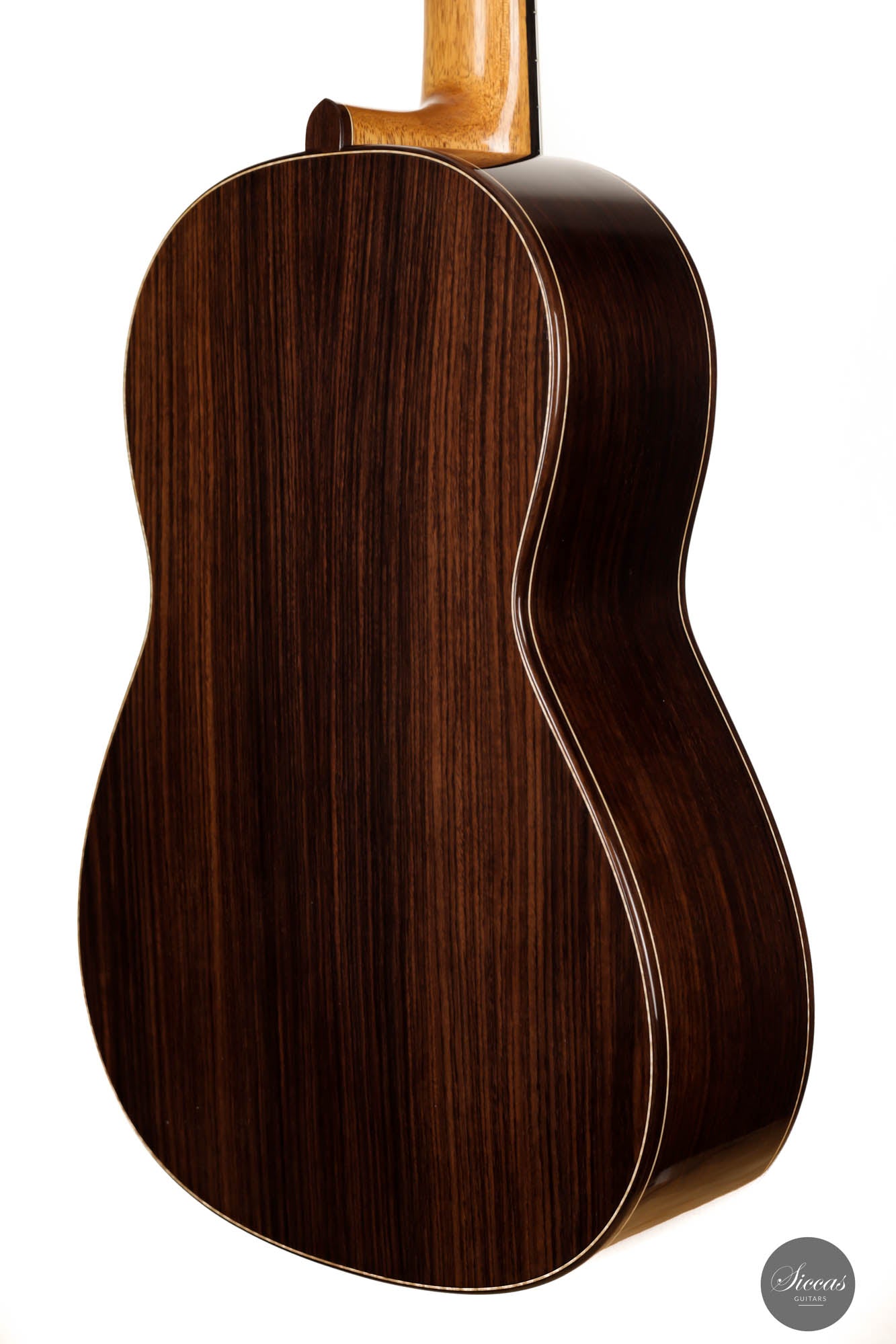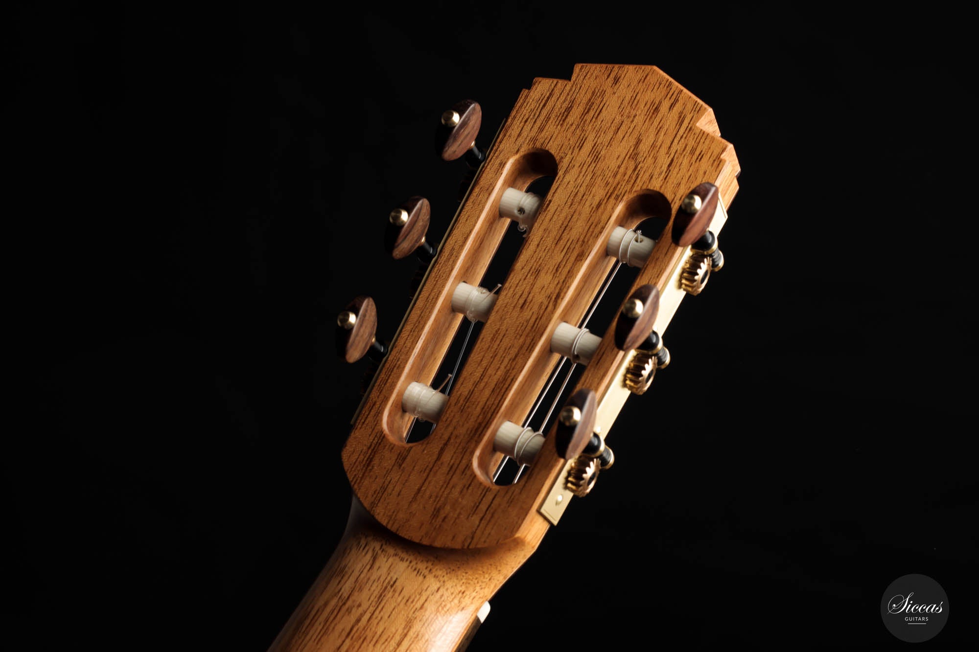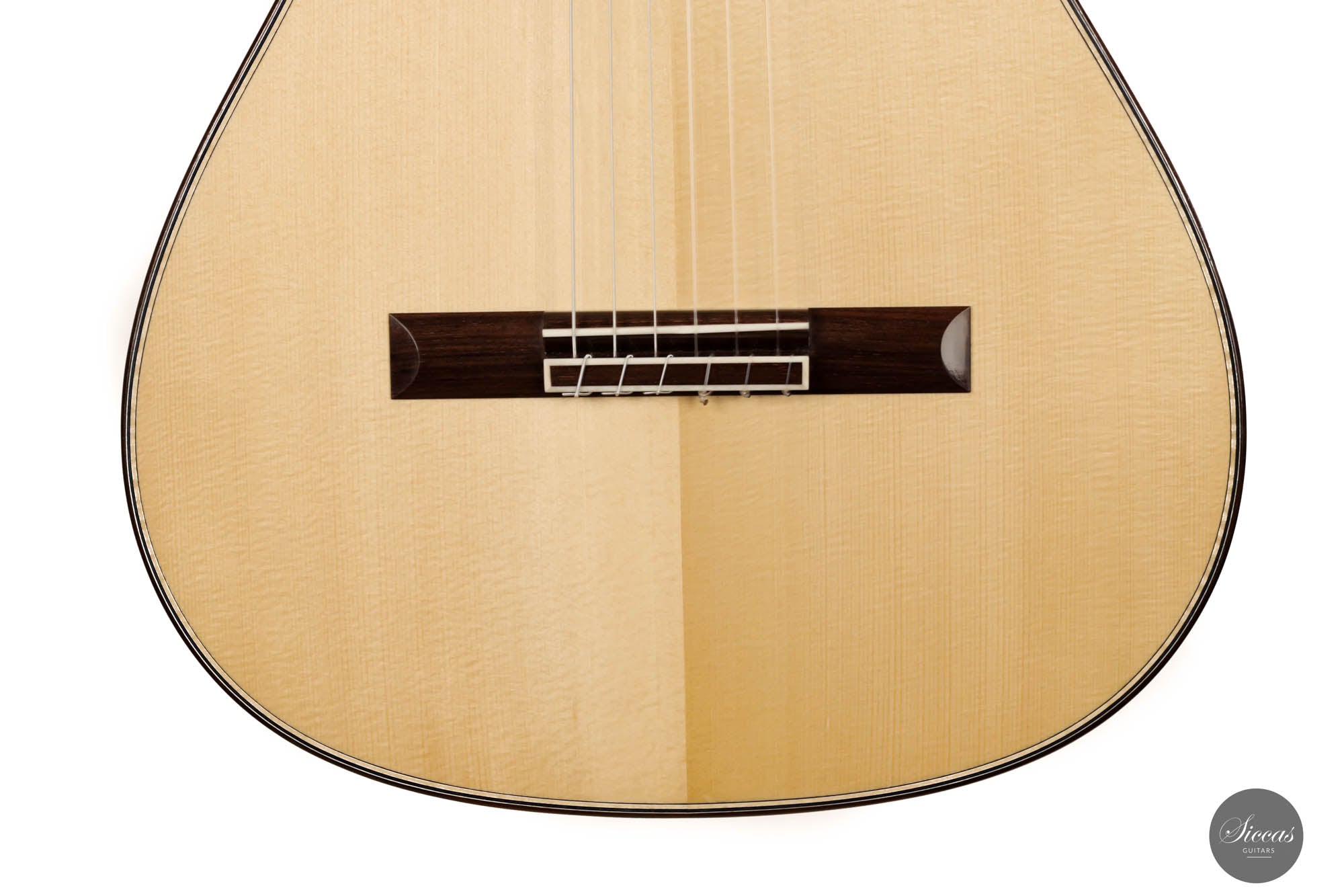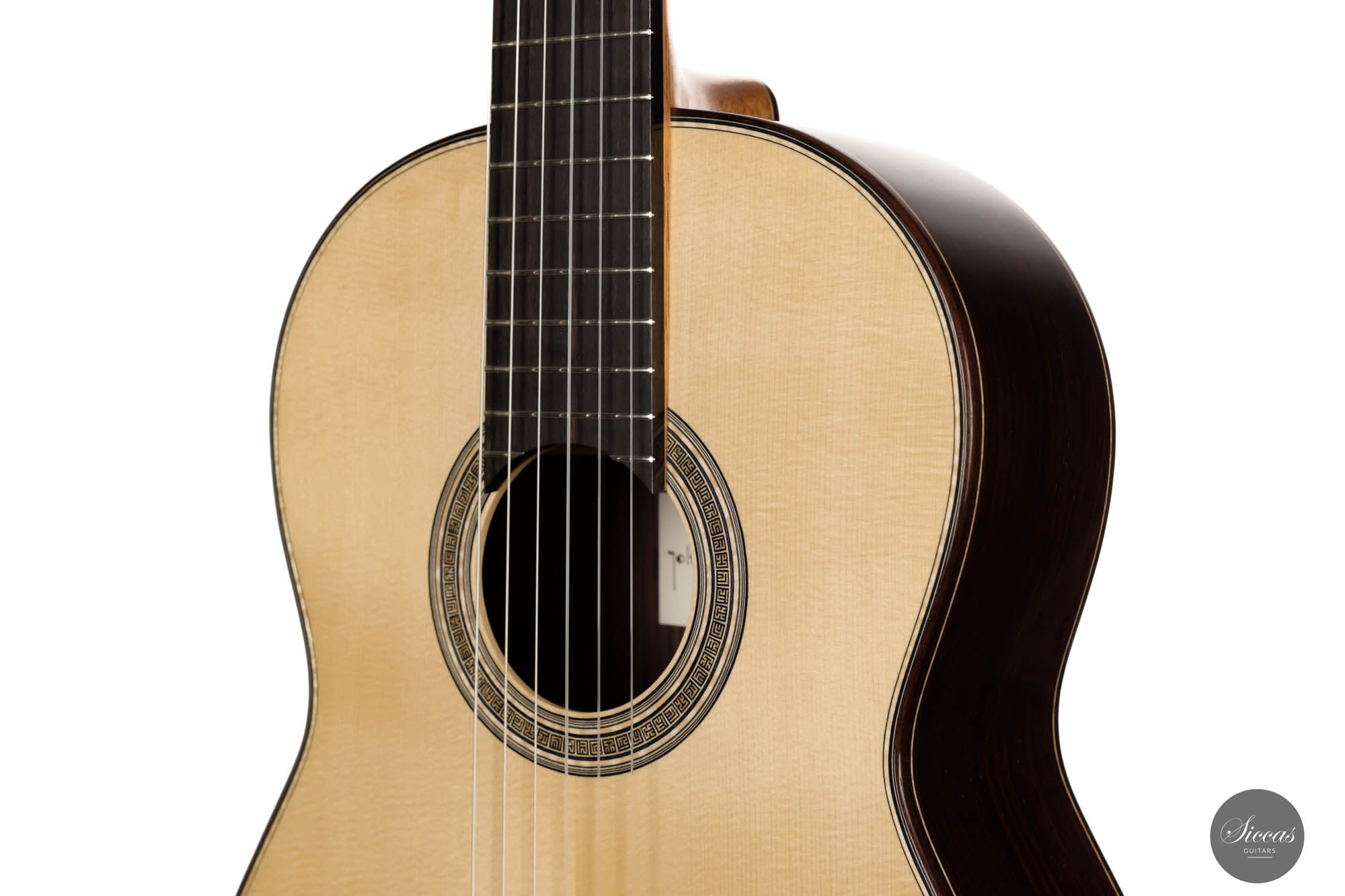 This beautiful instrument is a unique combination of a traditional Spanish guitar and a modern concert classical guitar. It has a traditional design that Jose L. Romanillos heavily influenced. Yet, it also features some modern elements in contemporary guitar making, such as elevated fingerboard, significant volume and projection, and excellent playability. This guitar displays Johanna's very high level of craftsmanship and artistry. The spruce soundboard was tuned to the F/F#, creating deep and hunting bass characteristics. Meanwhile, the crystal-clear trebles match the overall voicings in a charming proportion. This fine instrument is a true concert guitar that will fulfill the need of a guitarist of any level and for any concert situation.