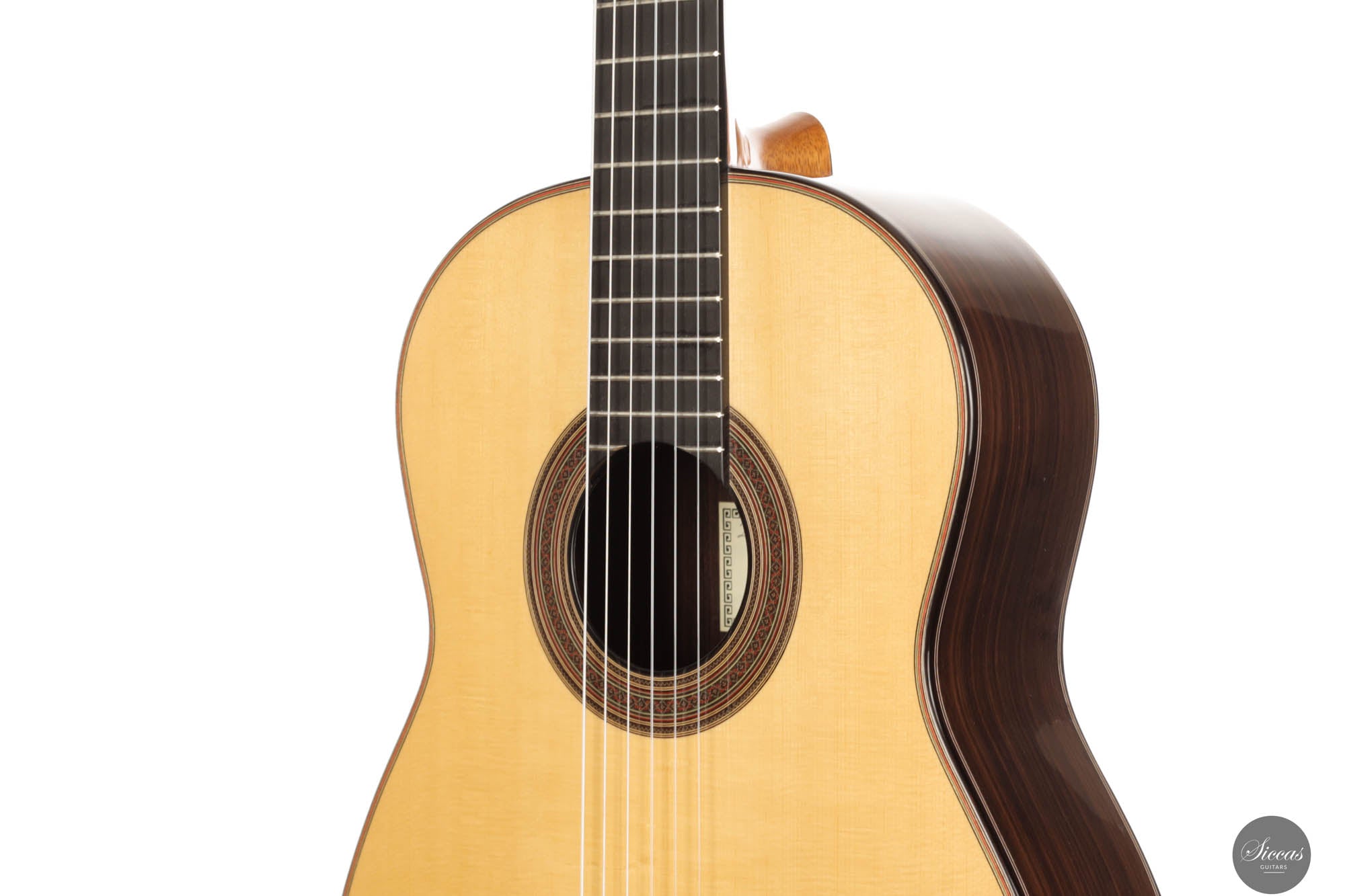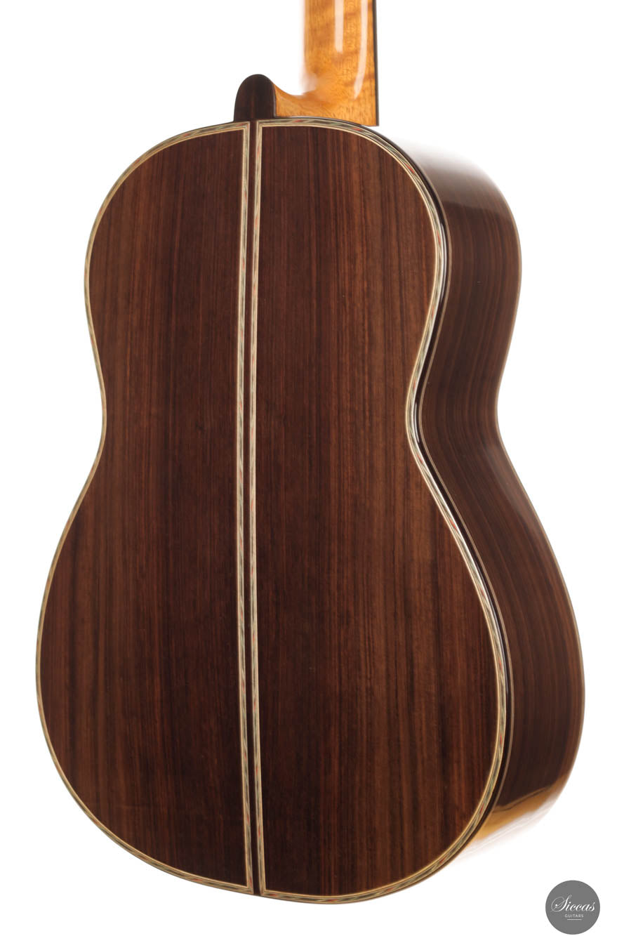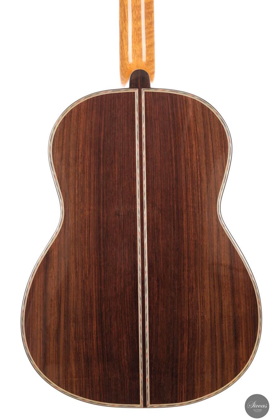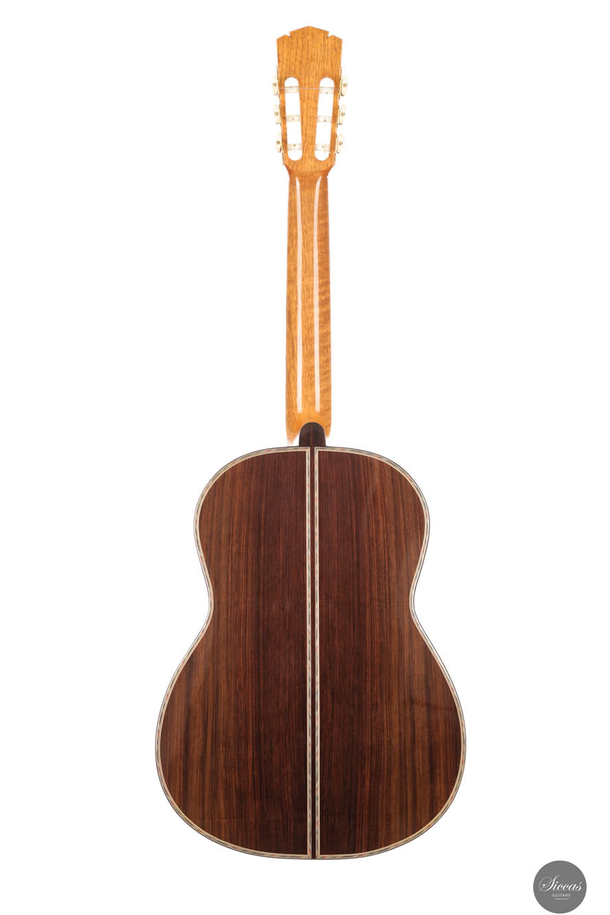 This beautiful guitar is a meticulously crafted replica of a Simplicio guitar. John's goal was not only to create an instrument that closely resembles the original aesthetically, but also one that adheres to the original dimensions, playability, and tonal qualites. The top of this guitar is made from spruce, while the back and sides are crafted from Indian rosewood. The sound is warmly inviting and mellow, with an exceptionally round and resonant mid-range that captivates the listener. The headstock is intricately carved and complemented by elegant Rodgers tuners, giving the instrument a refined beauty that echoes the work of master luthiers.