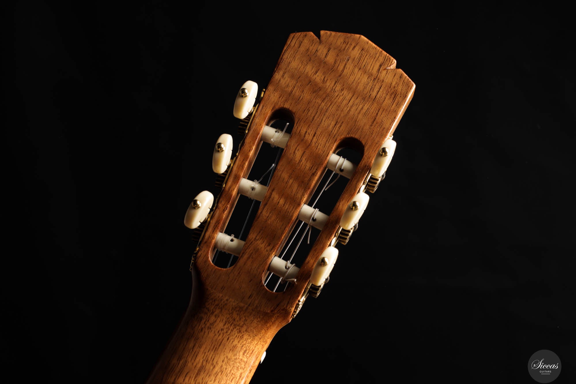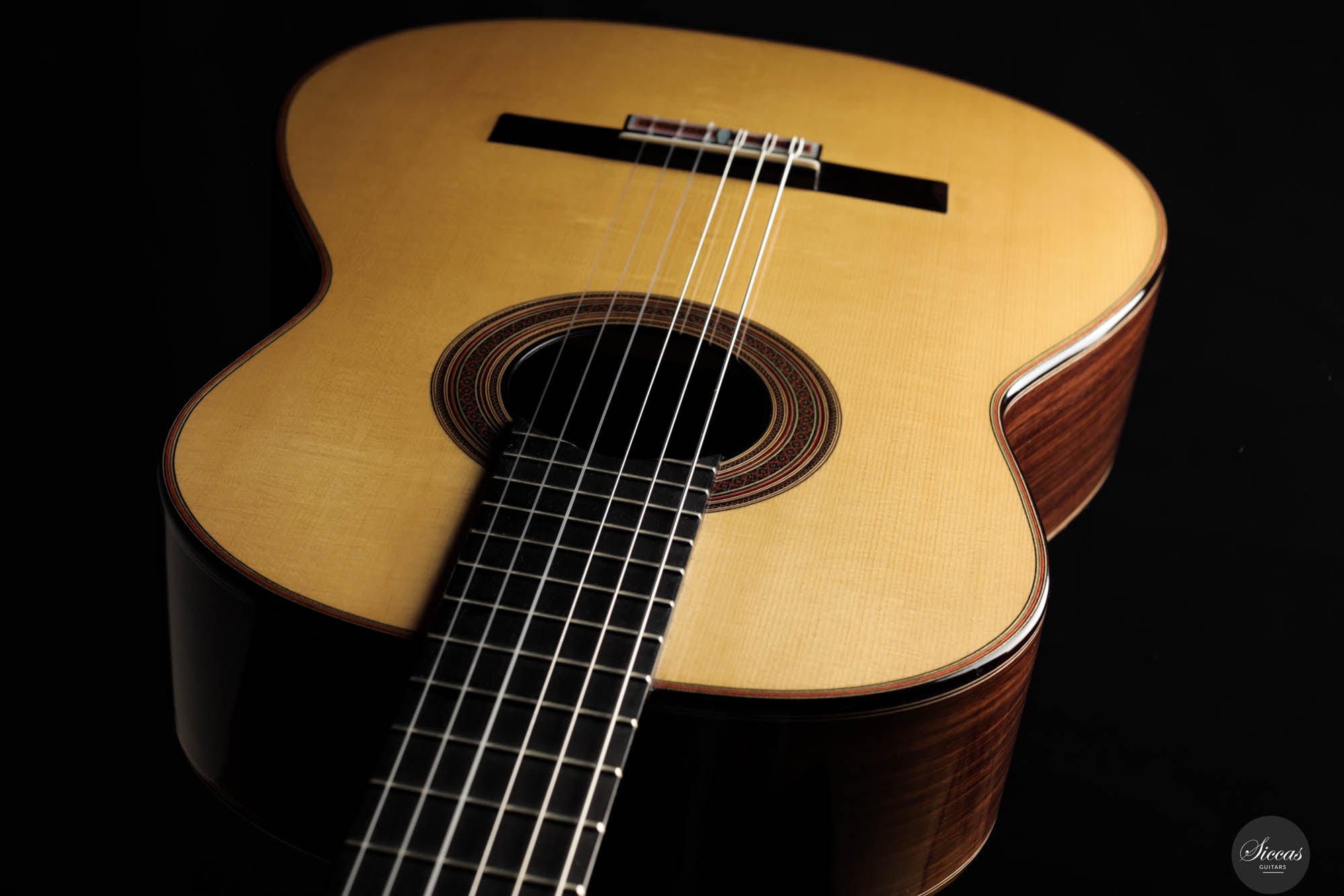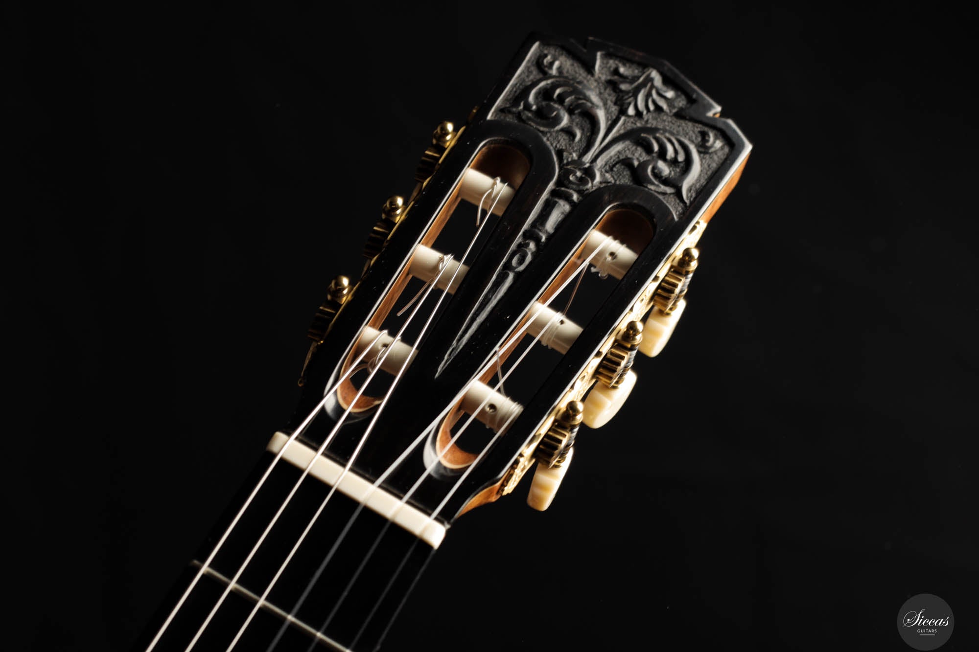 This beautiful guitar is a meticulously crafted replica of a Simplicio guitar. John's goal was not only to create an instrument that closely resembles the original aesthetically, but also one that adheres to the original dimensions, playability, and tonal qualites. The top of this guitar is made from spruce, while the back and sides are crafted from Indian rosewood. The sound is warmly inviting and mellow, with an exceptionally round and resonant mid-range that captivates the listener. The headstock is intricately carved and complemented by elegant Rodgers tuners, giving the instrument a refined beauty that echoes the work of master luthiers.