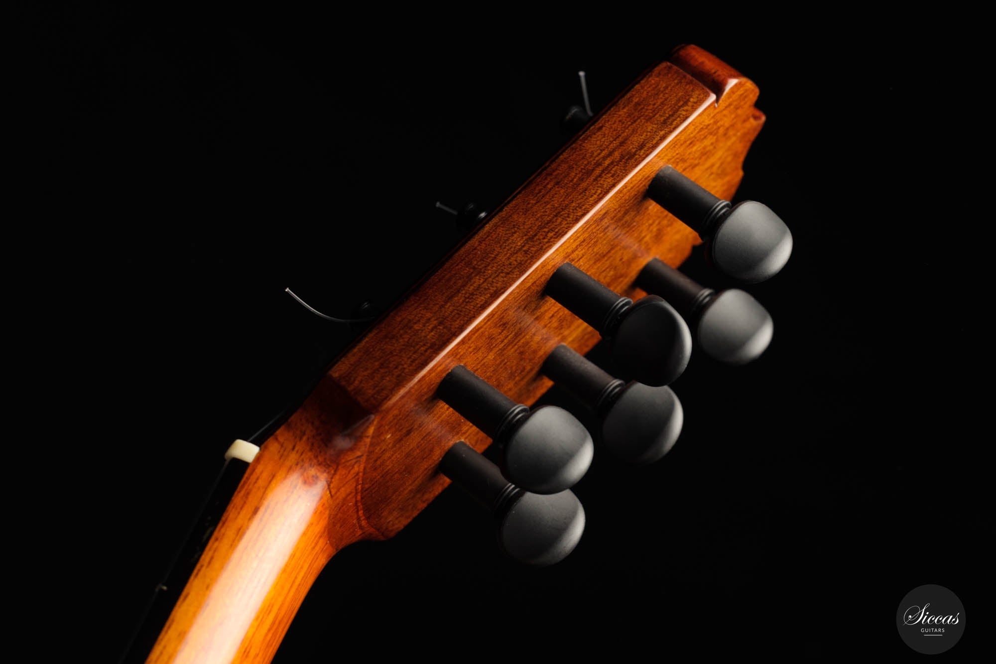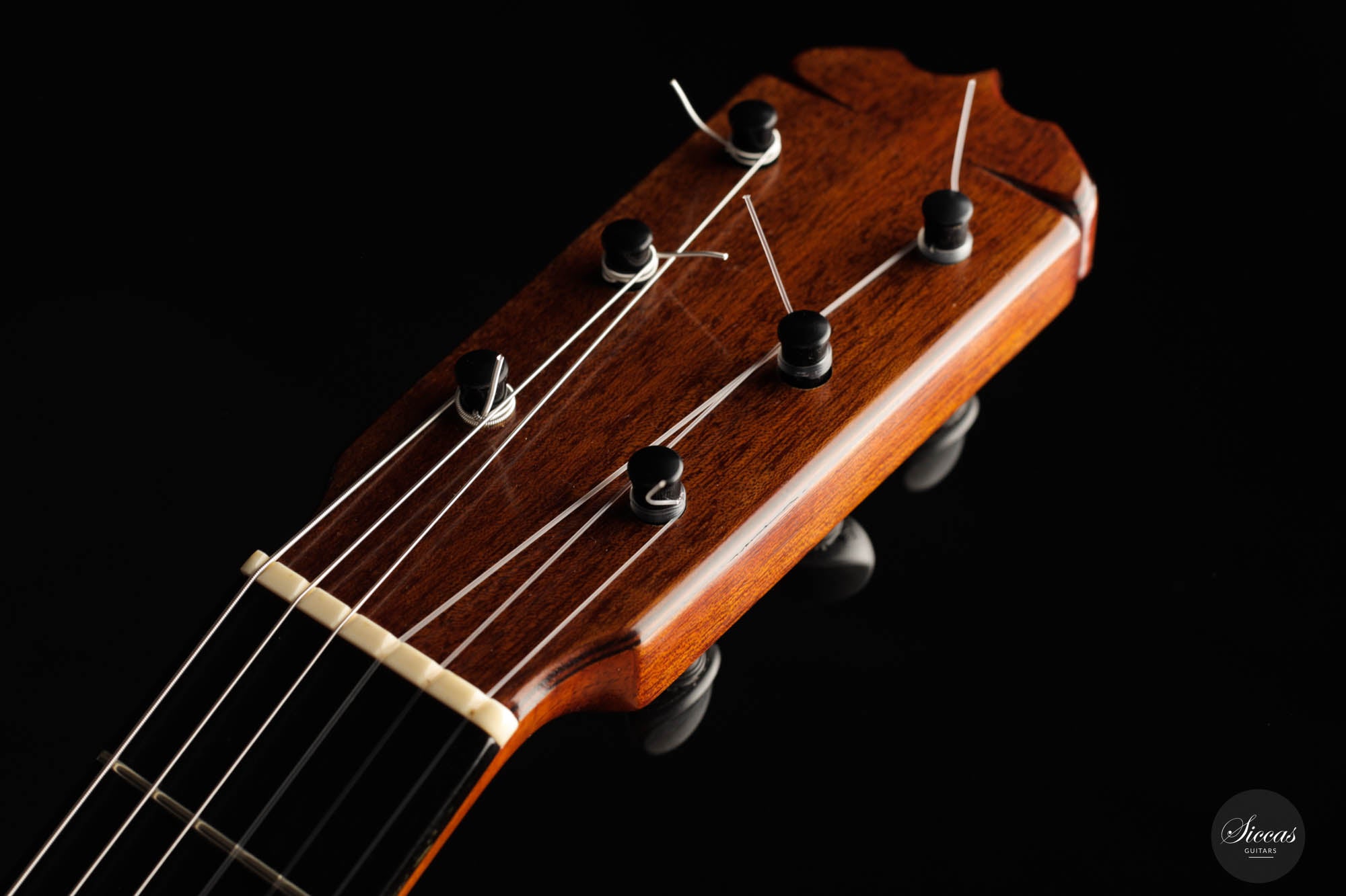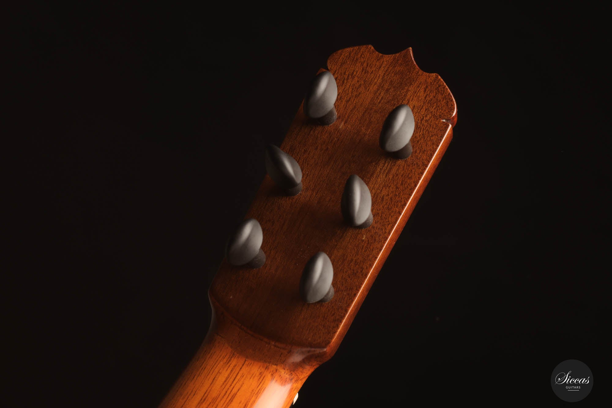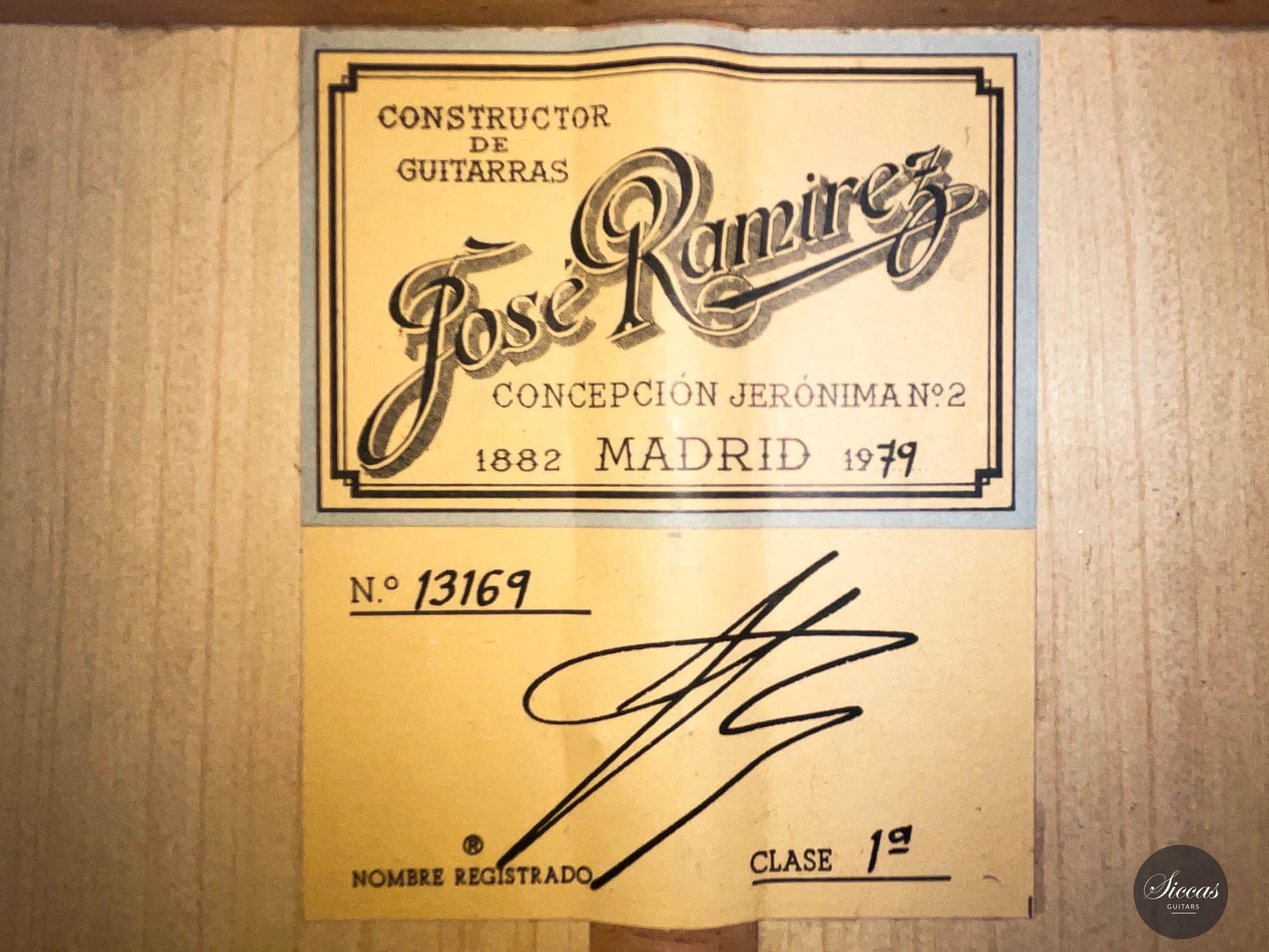 The 1979 José Ramirez III Flamenco Guitar No. 13169, known for its excellent craftsmanship and unparalleled sound quality, is a highly sought-after instrument in the flamenco music world. As an integral part of José Ramirez's legacy, this guitar combines superb performance with a captivating aesthetic. This specific guitar flaunts an exquisitely crafted Cypress back and sides that lend it a beautiful, natural look. The guitar also features a highly responsive cedar top, ensuring it not only looks great but sounds fantastic too. The incorporation of these tonewoods aids in achieving a robust and bright sound characteristic of traditional flamenco guitars. Despite being over four decades old, this José Ramirez III Flamenco Guitar No. 13169 remains in a remarkable condition, bearing only minimal signs of play, such as superficial playing marks. This endurance testifies to the durability and quality of the materials and the craftsmanship of Ramirez guitars. Moreover, the cedar soundboard bears the number 16 underneath, which shows that Pedro Jiménez Posadas built the guitar. This model is equipped with Peghead tuning machines, ensuring a seamless and smooth tuning experience. These precision tuners provide stability and ease-of-use, thereby improving the overall playing experience and the guitarist's performance. In terms of performance, this guitar produces a rich, powerful sound with a fast attack, making it an ideal instrument for flamenco players. The quick response and big sound of this guitar help flamenco guitarists deliver passionate, lively performances, capturing the true essence of flamenco music.
