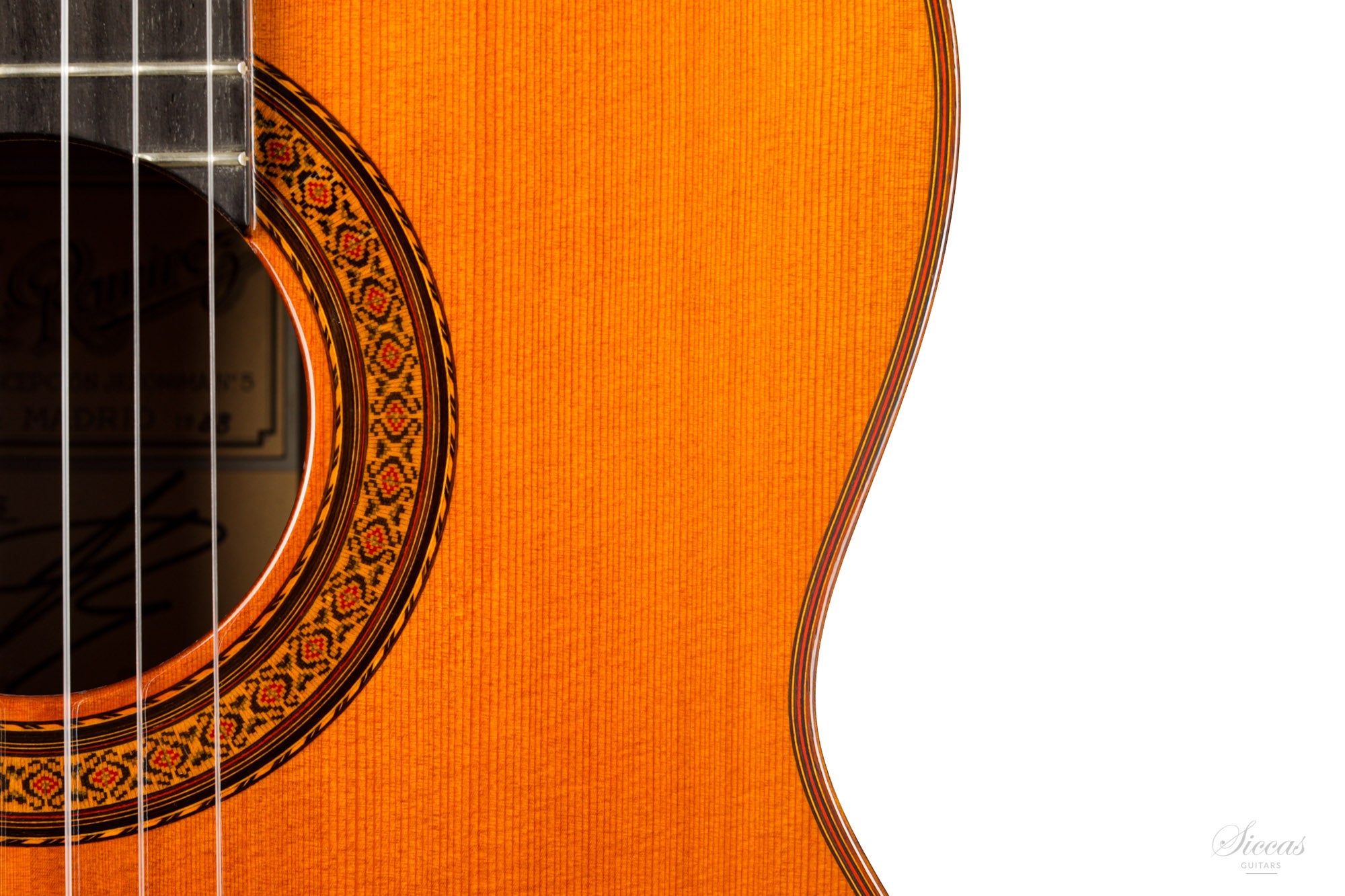 This instrument is really special as it features a red dot with a black 86 inscription on the label. This special feature highlights the major change made by José Ramirez III's workshop in 1986 at the request of the Japanese market: to develop a line of concert guitars with a scale of 65 cm instead of over 66 cm. These instruments, more suitable for smaller hands, offer exceptional playing comfort while remaining true to the "Ramirez" sound. This guitar is in very good condition. Entirely original, it has only a small flare repaired under the bridge.
