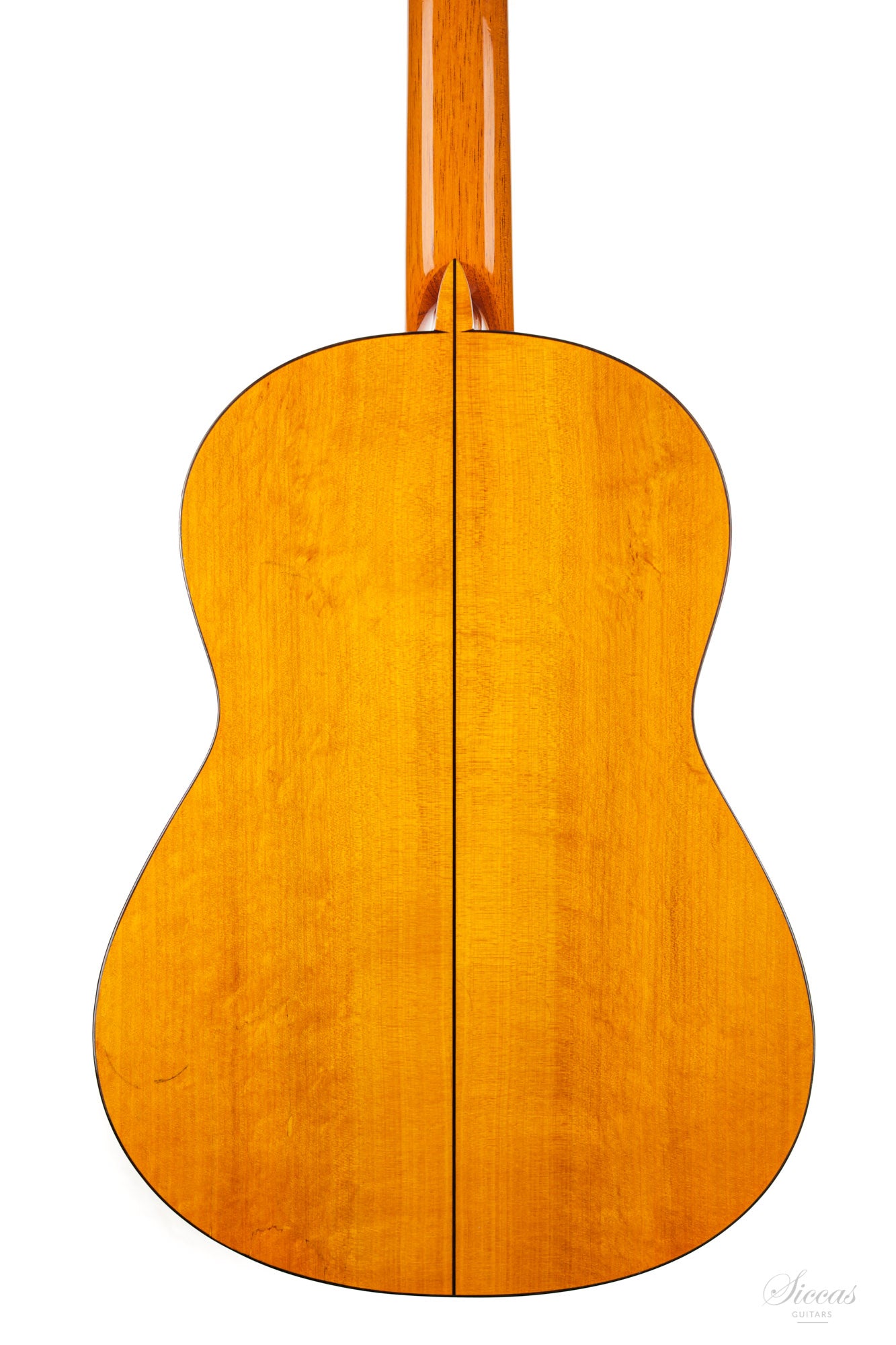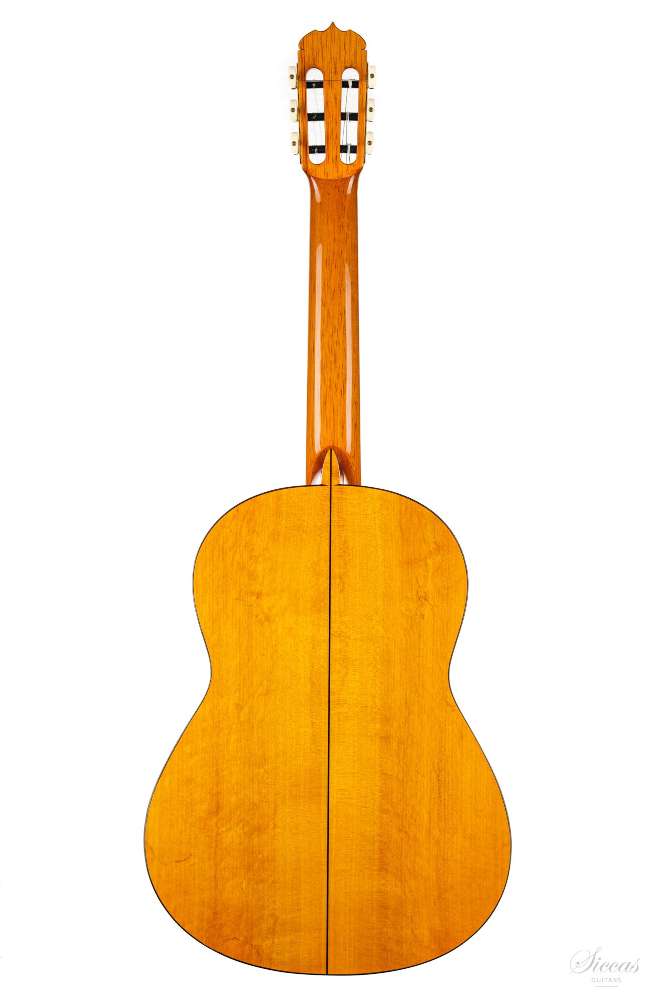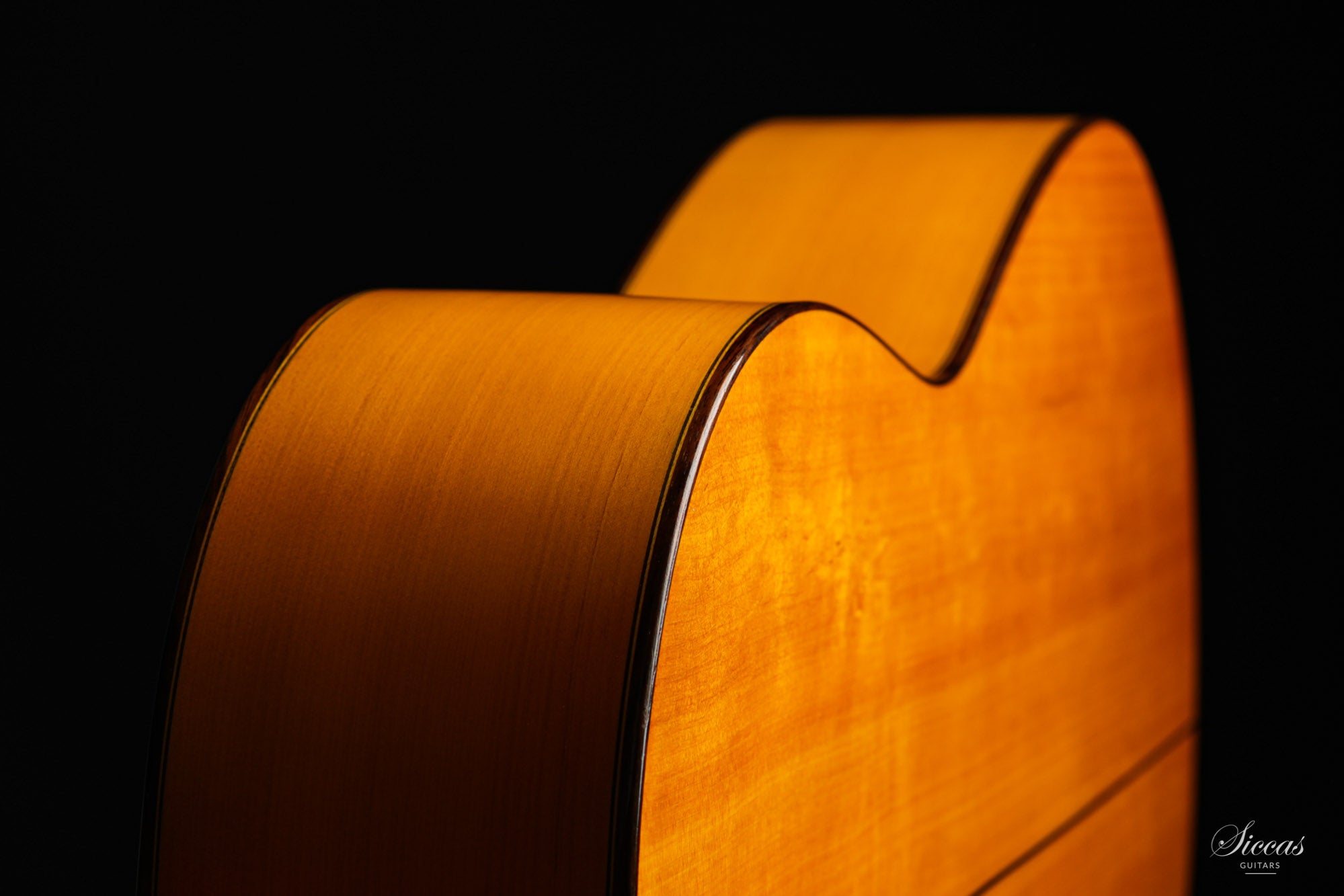 This guitar has a fantastic “Spanish” sound. It is super-responsive, has a warm and colourful tone, a great balance and a notable volume. The ambivalence between the cedar’s mellowness and the cypress’ spontaneity gives to the guitar an incredible range of colours and exceptional dynamic possibilities. There are very-well repaired cracks on the lower bout of the back and one on the back of the head. This guitar was not only used for flamenco music but also as classical guitar in the past. A hard-shell case is included.