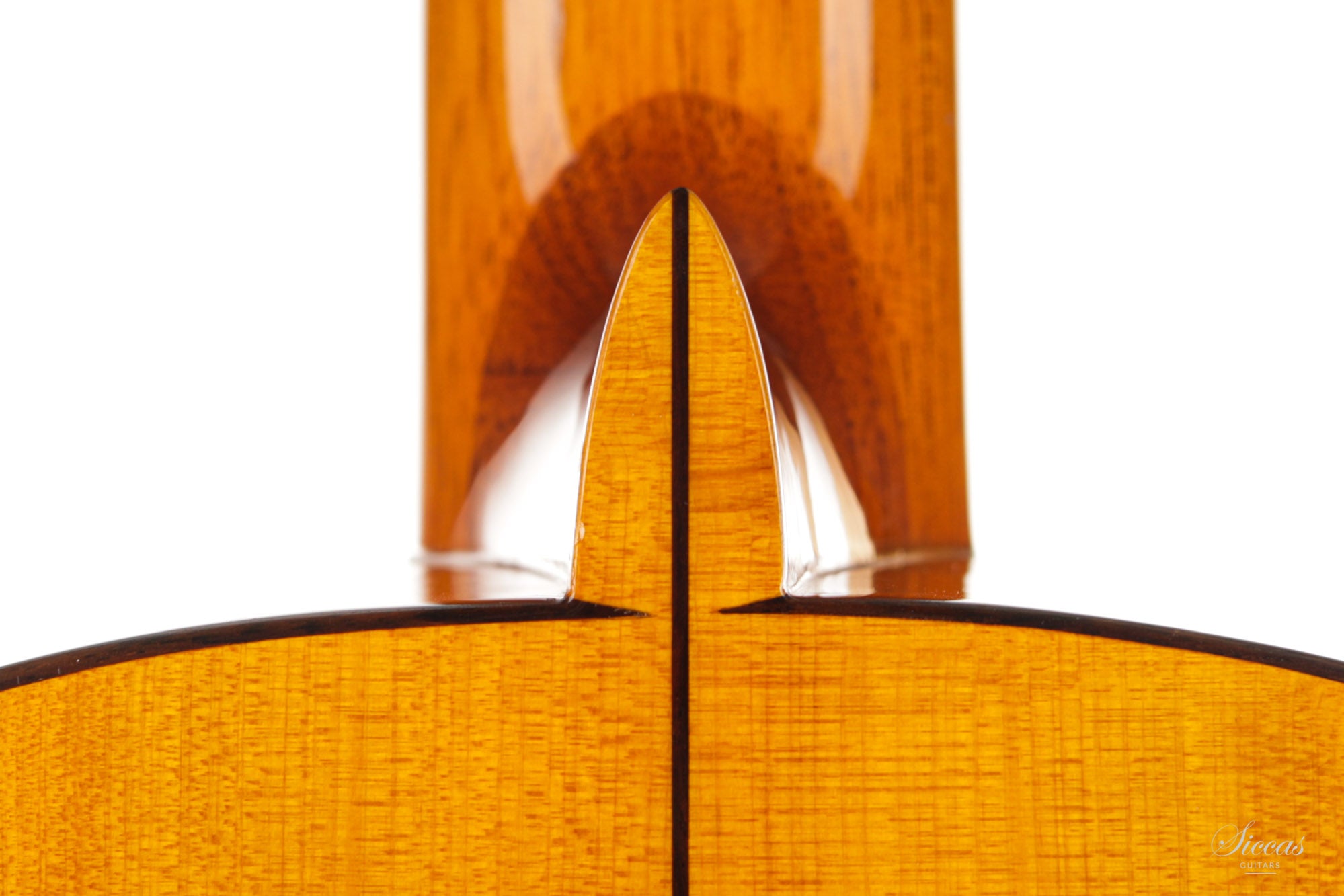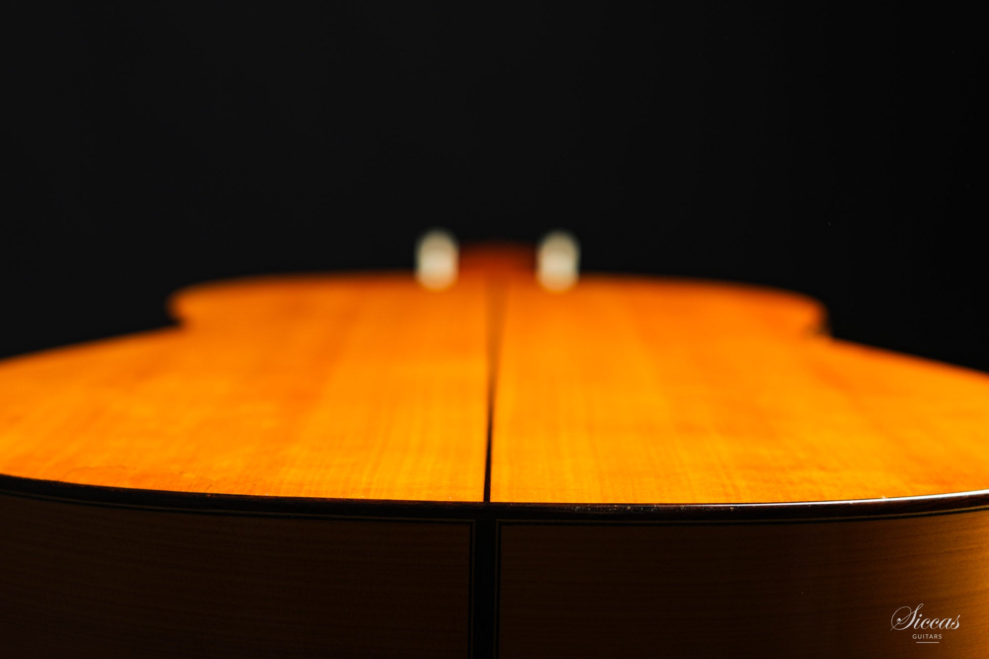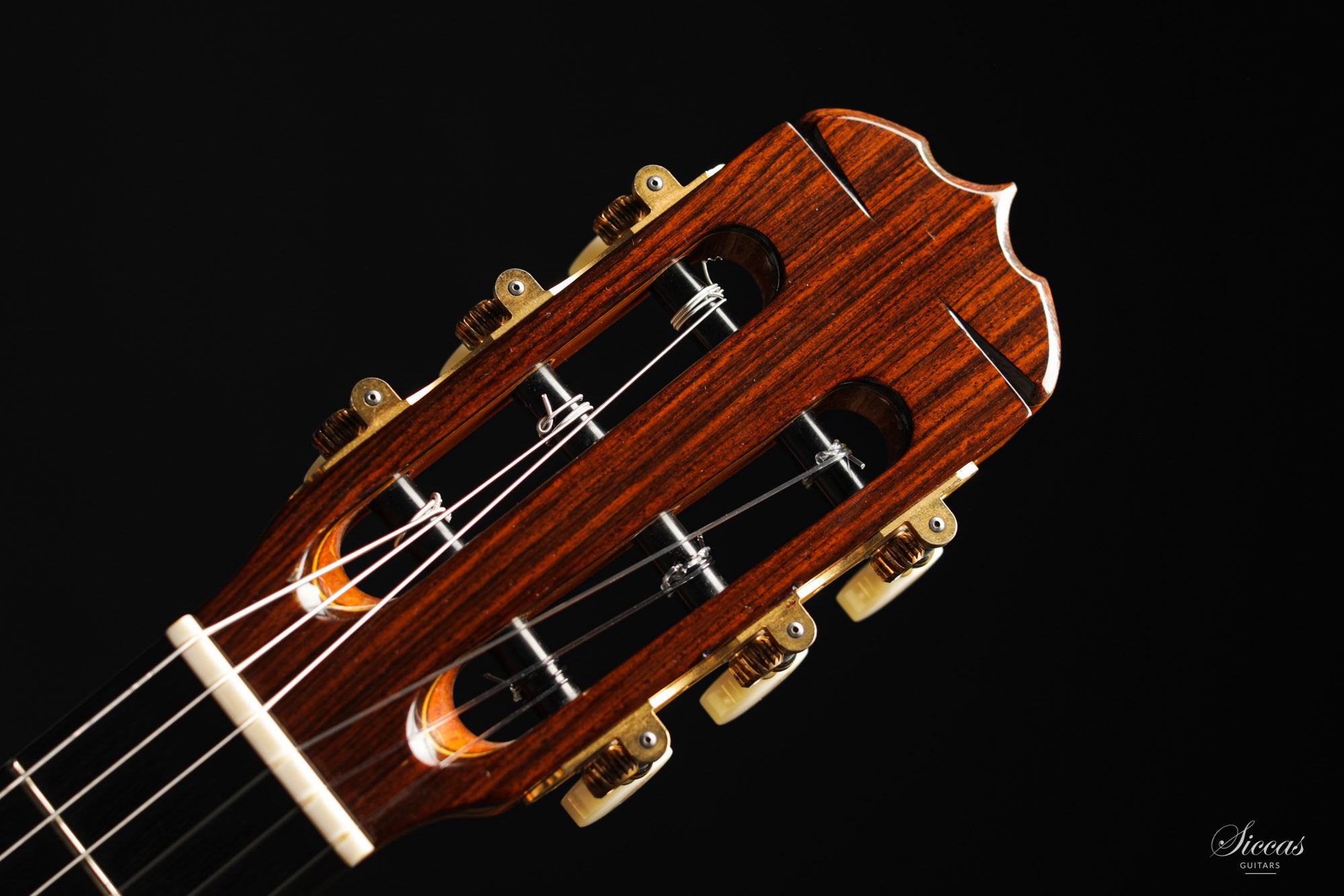 This guitar has a fantastic “Spanish” sound. It is super-responsive, has a warm and colourful tone, a great balance and a notable volume. The ambivalence between the cedar’s mellowness and the cypress’ spontaneity gives to the guitar an incredible range of colours and exceptional dynamic possibilities. There are very-well repaired cracks on the lower bout of the back and one on the back of the head. This guitar was not only used for flamenco music but also as classical guitar in the past. A hard-shell case is included.