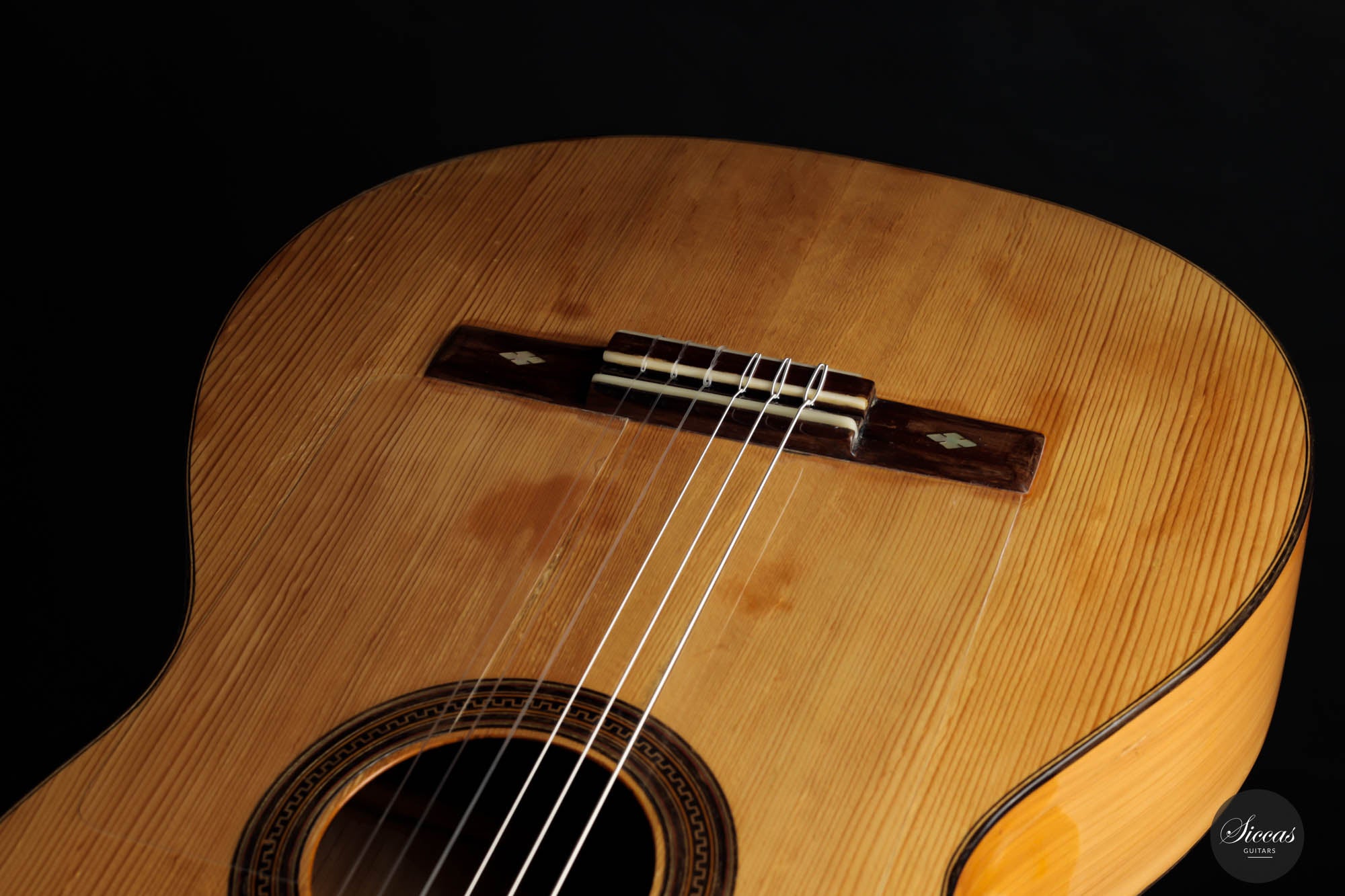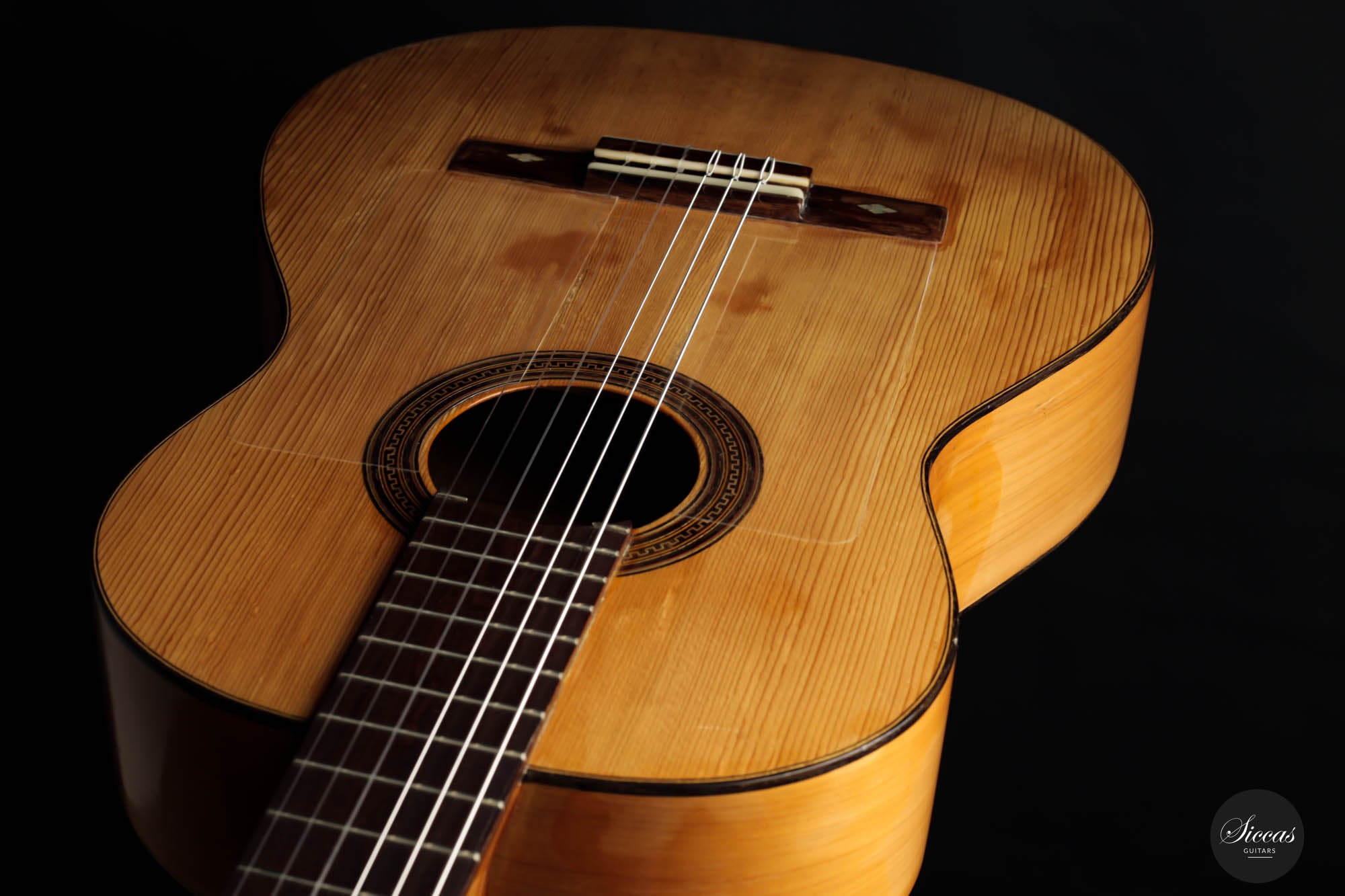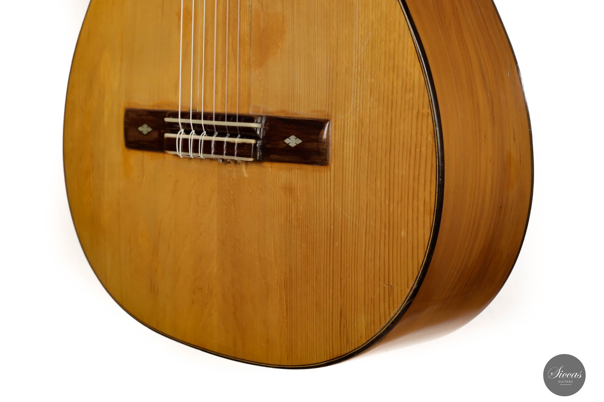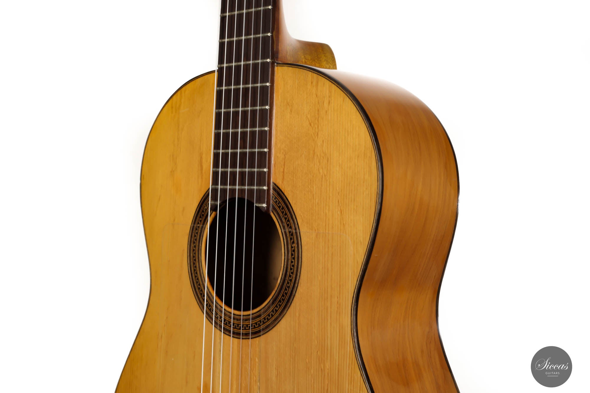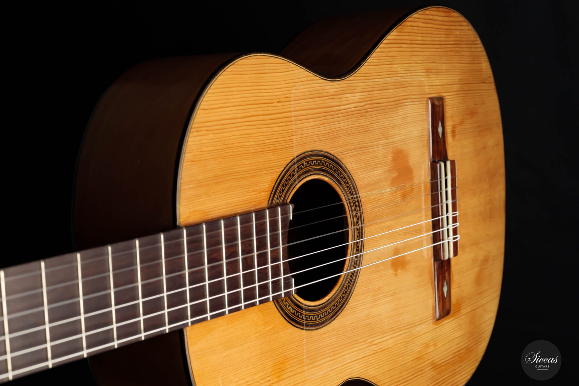 This instrument built in 1941 is a fantastic guitar that exemplifies and represents the special merit of the Ramirez workshop despite the difficult times during the Spanish Civil War. It is a simple yet attractive instrument which responds quickly to the right-hand attack with its bright, silvery, and voluminous tone. The spruce soundboard and Spanish cypress back and sides have several repaired cracks and have been refurnished. A rare opportunity to own and enjoy an instrument that is part of the exciting history of the legendary Ramirez dynasty.