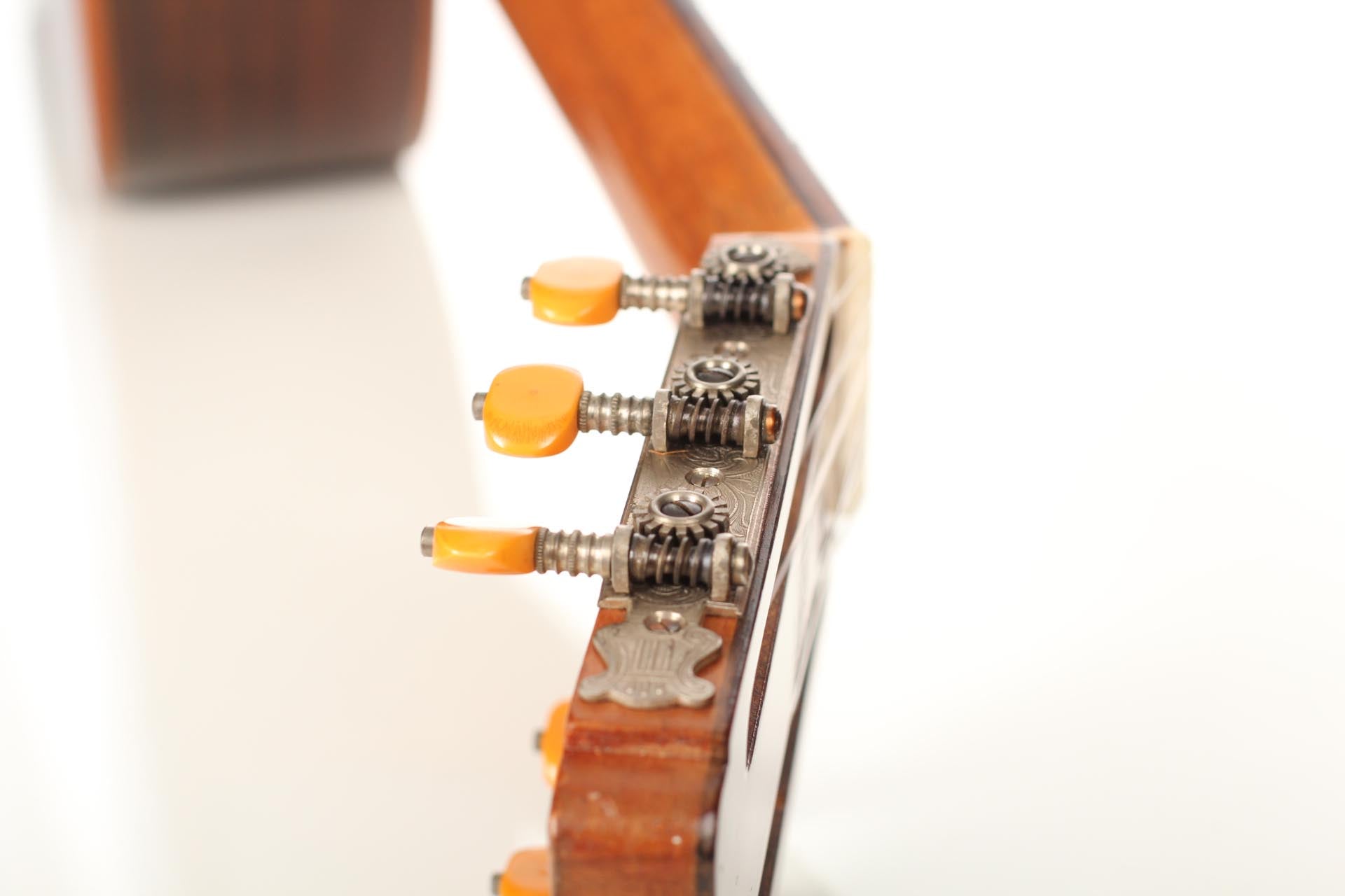 This very beautiful classical guitar was built in 1956 in Madrid by José Ramirez II. It has a spruce top and Indian rosewood back and sides. It is a very responsive instrument with a direct response and playful colours. This is a very special guitar with a bright, silvery and voluminous tone. The guitar is in overall very good condition for its age.There are some well restored cracks on the back and on the top. A hard-shell case is included.