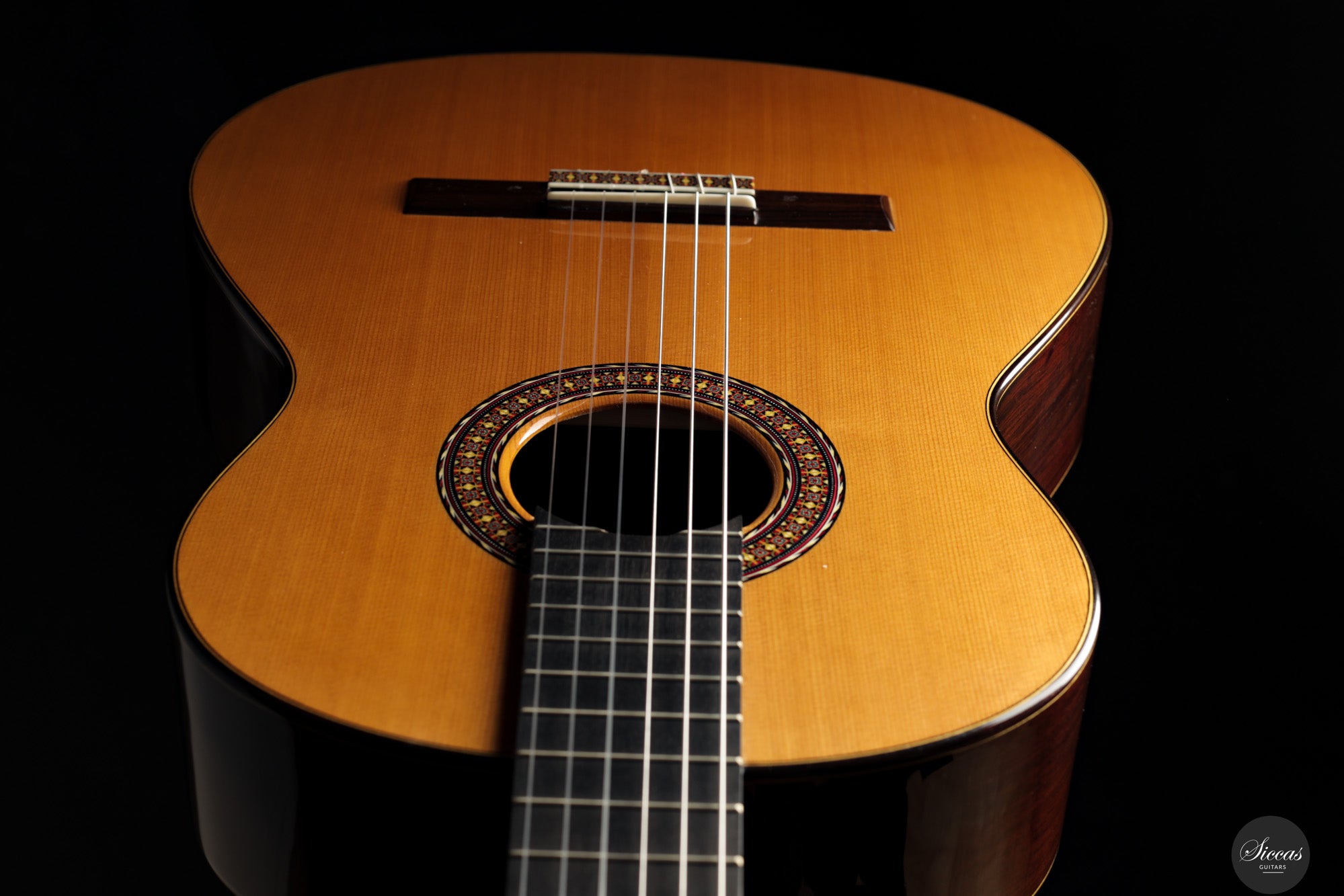 This 2025 model is traditionally built, featuring a cedar top and Madagascar rosewood back and sides. The polyurethane finish offers both durability and tonal directness. With an air body resonance between F♯ and G, the guitar delivers fast response and immediate tonal presence. The trebles carry a bright, almost flamenco-like edge, while the basses remain full and grounded. The result is a voice that is both colorful and precise, offering expressive clarity and dynamic capability. It is a compelling choice for players seeking a direct, vibrant sound with distinctly Spanish character.