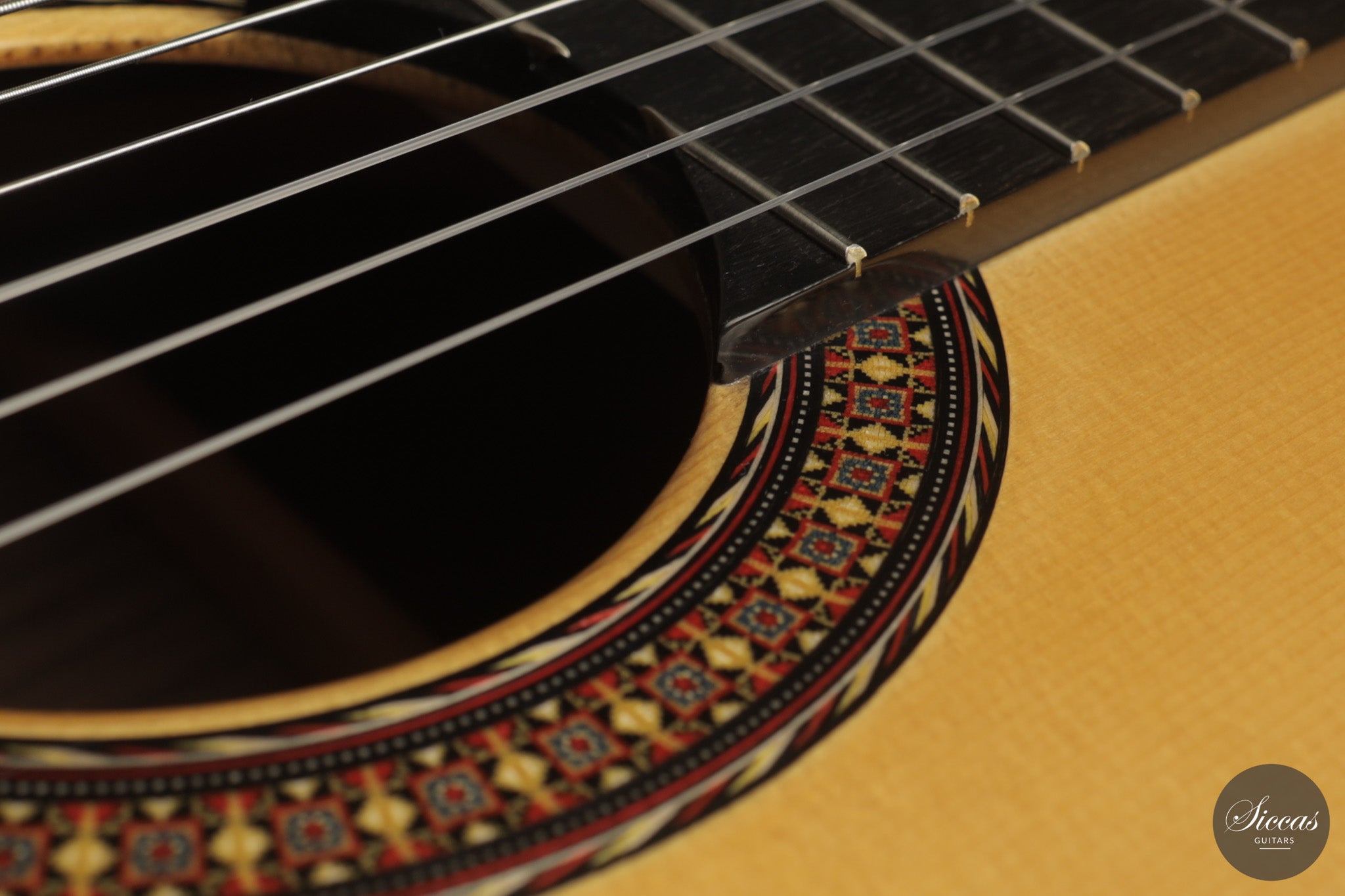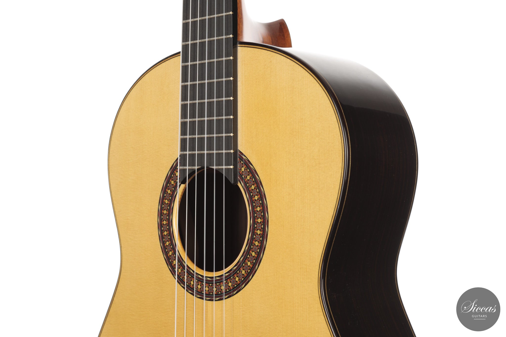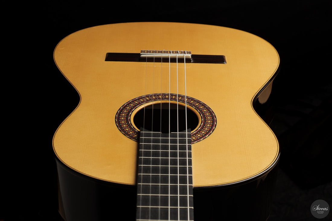 This classical concert model from 2026 was developed exclusively for Siccas Guitars and is built in traditional construction with a spruce top and Indian rosewood back and sides. The visual concept is refined and restrained, with discreet decorative elements that underline its Spanish character without excess.