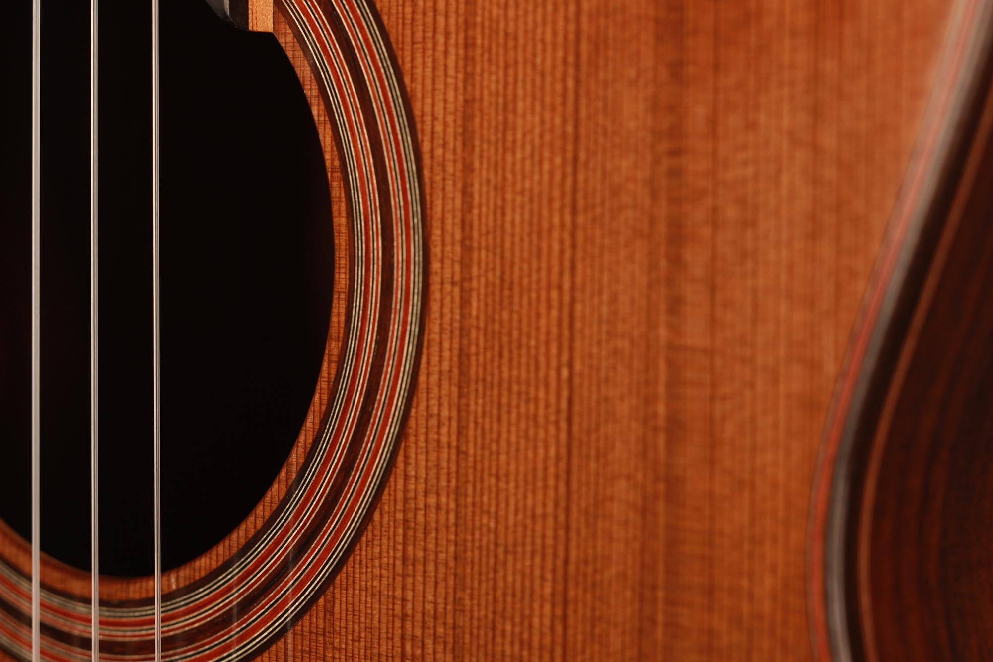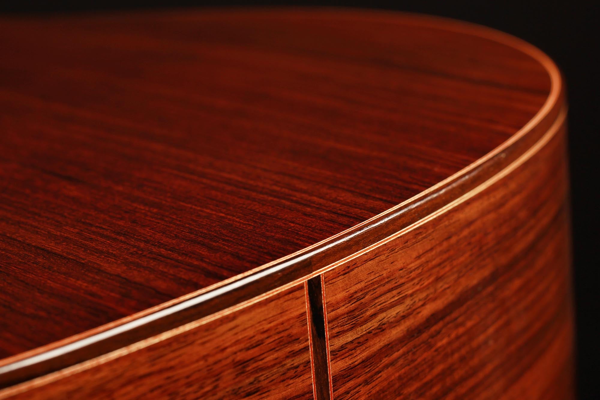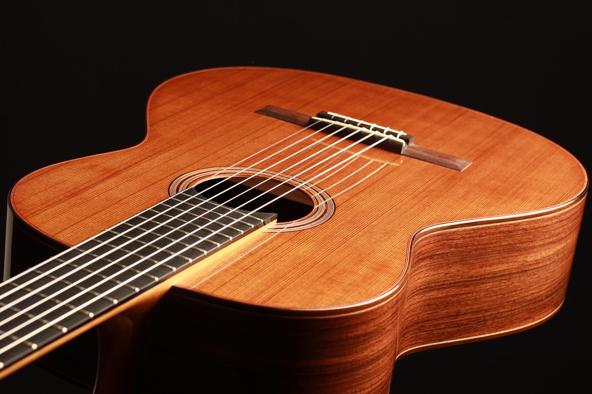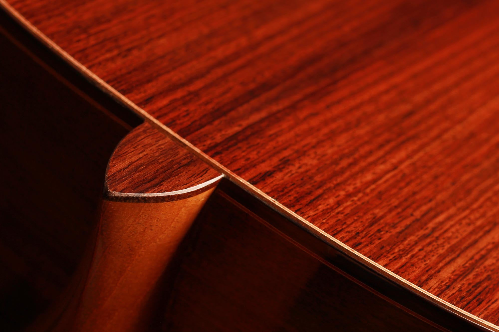 This model has been developed as a cost-effective alternative to the more elaborate instruments from the Kirschner workshop and offers high sound quality and best playability e.g. for students or guitarists with a limited budget. Built by Solveig and Andreas in their workshop and fully French polished, it is showing a very clean craftmanship as well as a a visually clear and pure aesthetic. A nice feature of this guitar is the cedar double top, which is combined with a traditional spruce fan bracing. This results in a powerful, warm sound with beautiful timbres. Only some superficial playing marks can be found on the soundboard. The playability is perfect and the instrument is excellently balanced, so that this guitar is ready to be played.