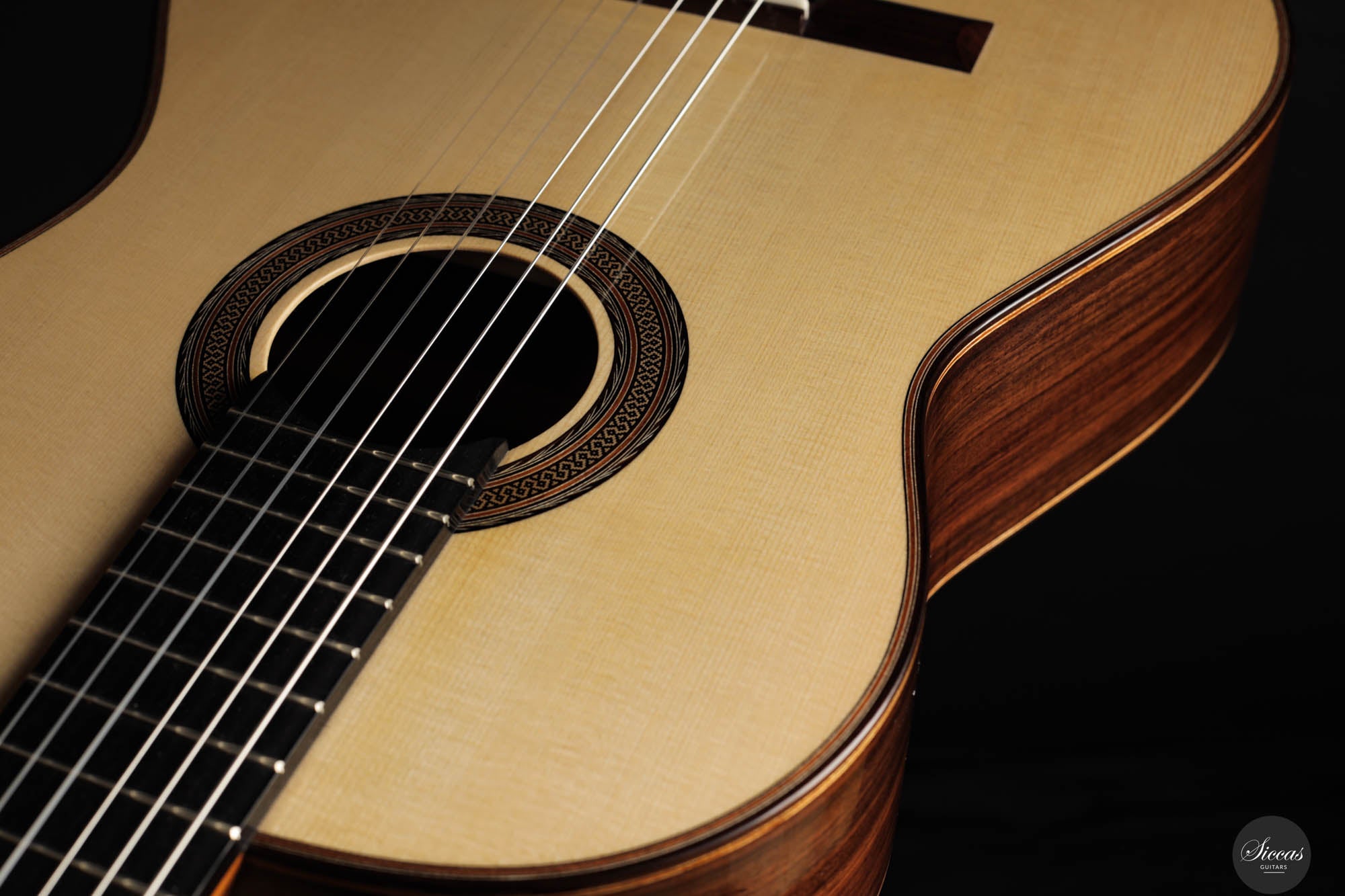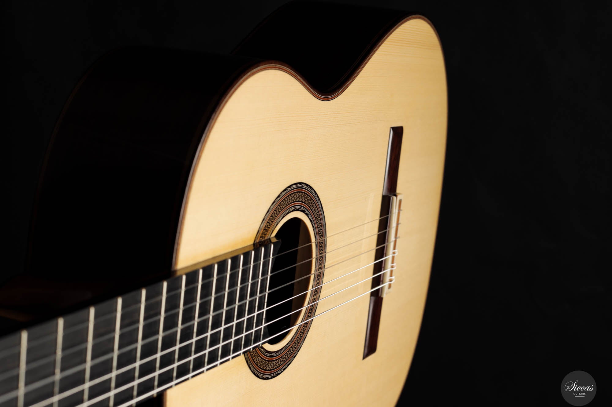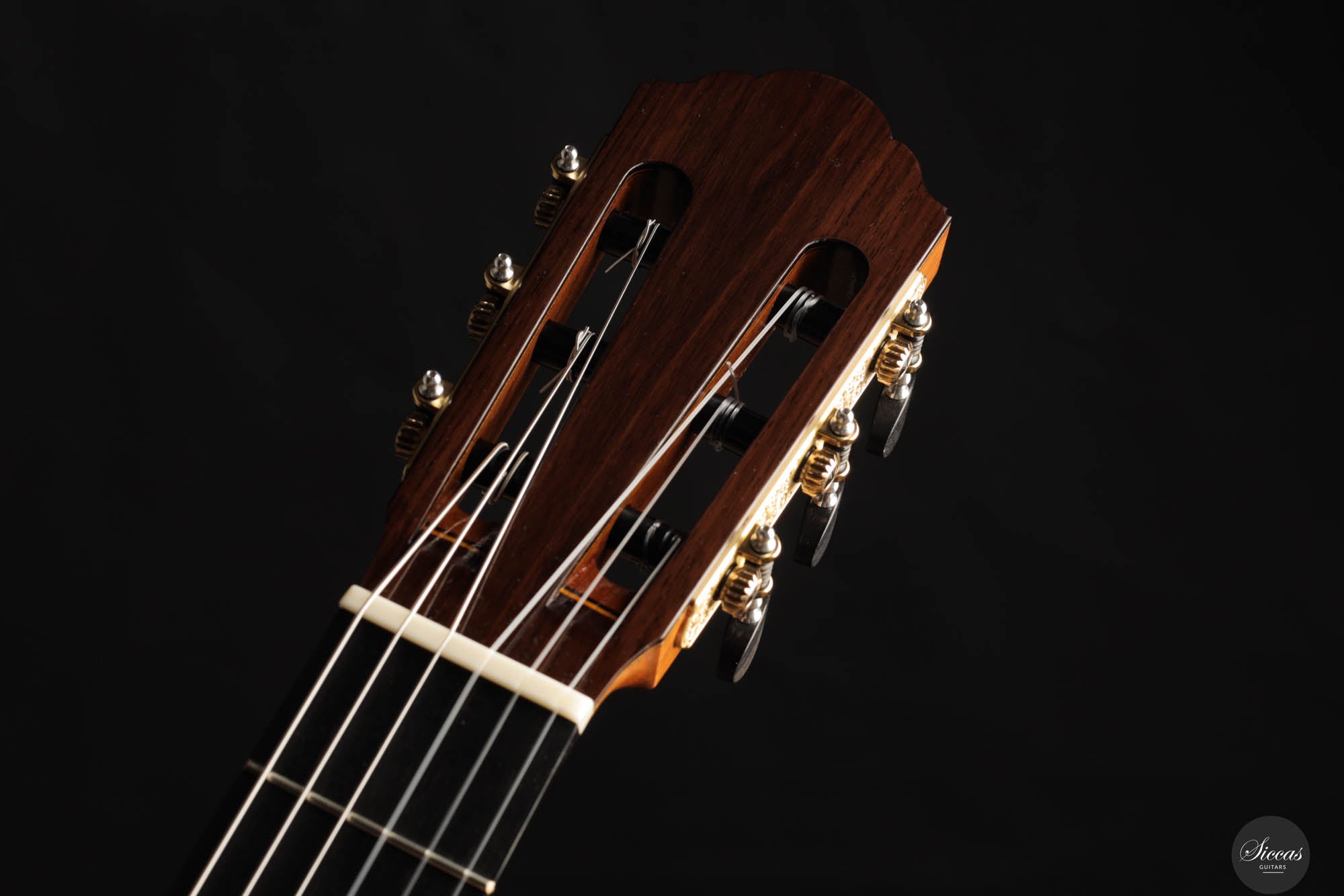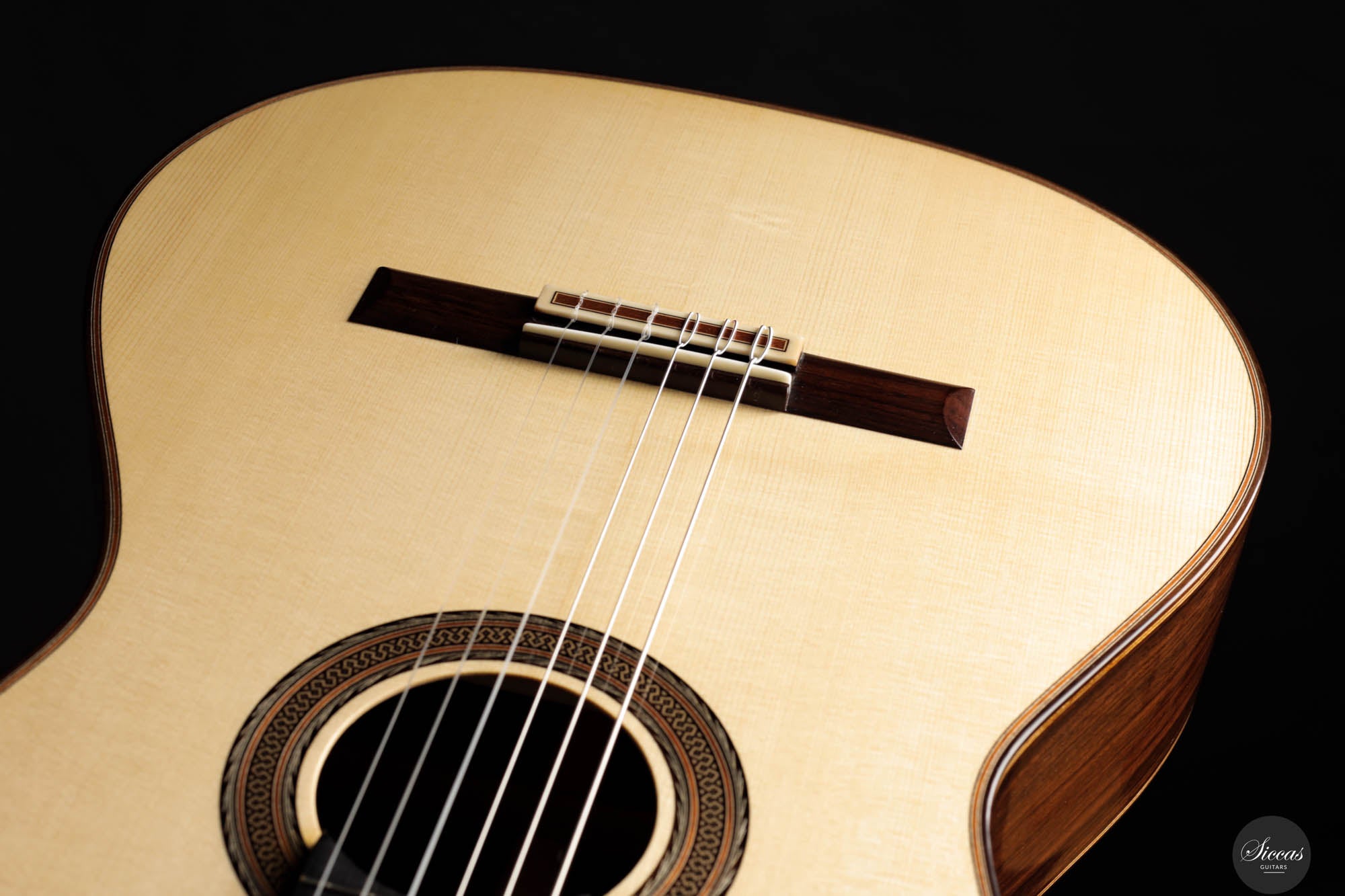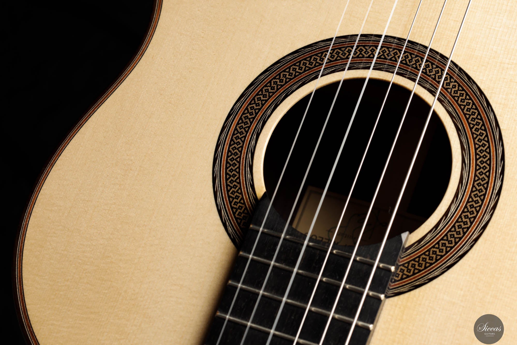 This 2024 concert model stands as an exemplar of lattice-braced guitars, steeped in tradition yet imbued with modern innovation. The meticulously implemented lattice bracing pattern crafted from spruce, is fortified by cedar inlays at every junction, lending the instrument both resilience and suppleness. The guitar’s visual allure, especially its intricately designed rosette, subtly evokes the aesthetics of the renowned Enrique Garcia, captivating the observer’s gaze. Beyond mere visual appeal, the guitar resonates with a harmonious aura, a quality effortlessly mirrored in its sonorous output. Upon strumming, the soundboard reacts instantaneously, releasing a rich, velvety timbre that speaks of depth and sophistication.
