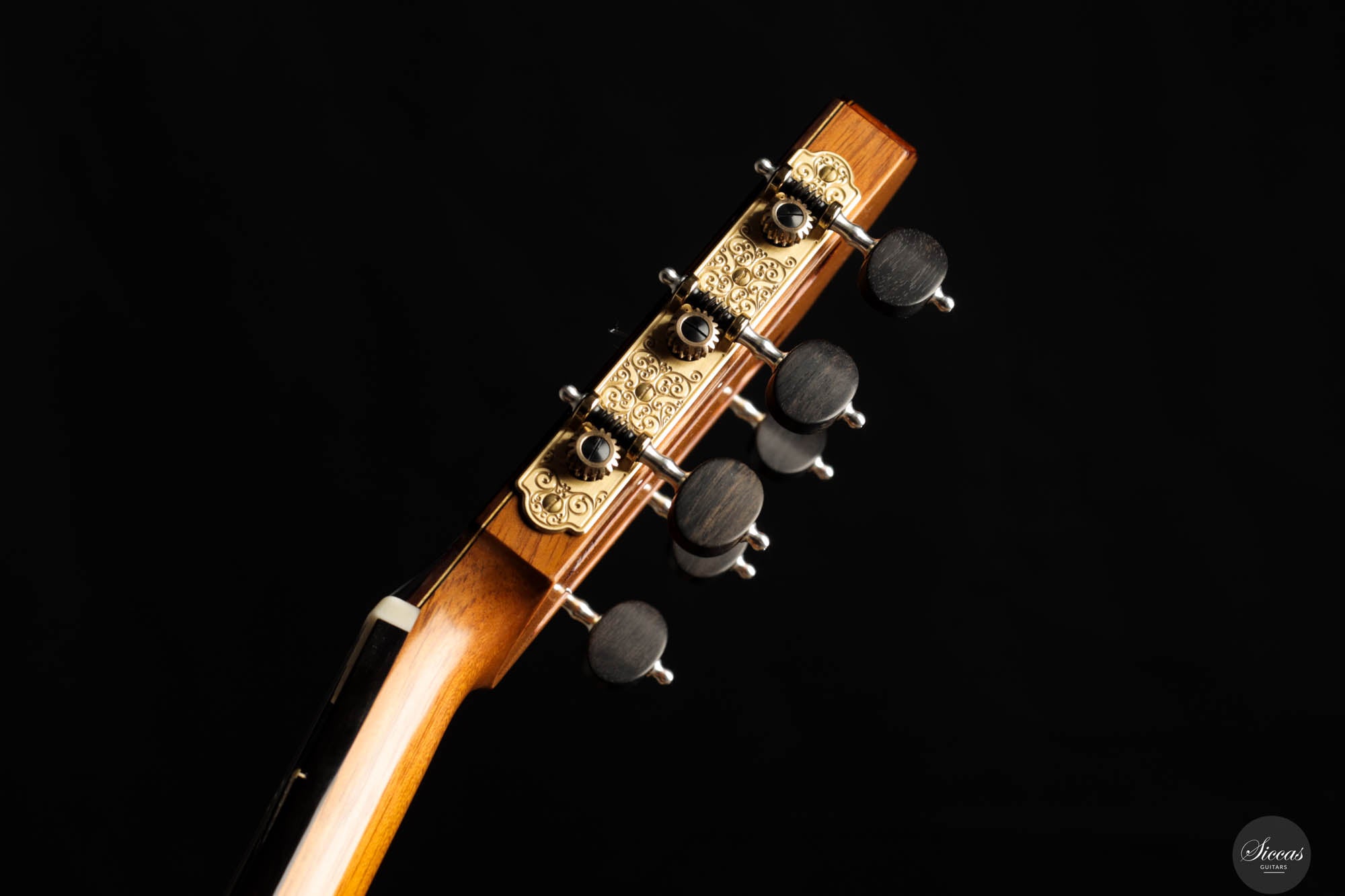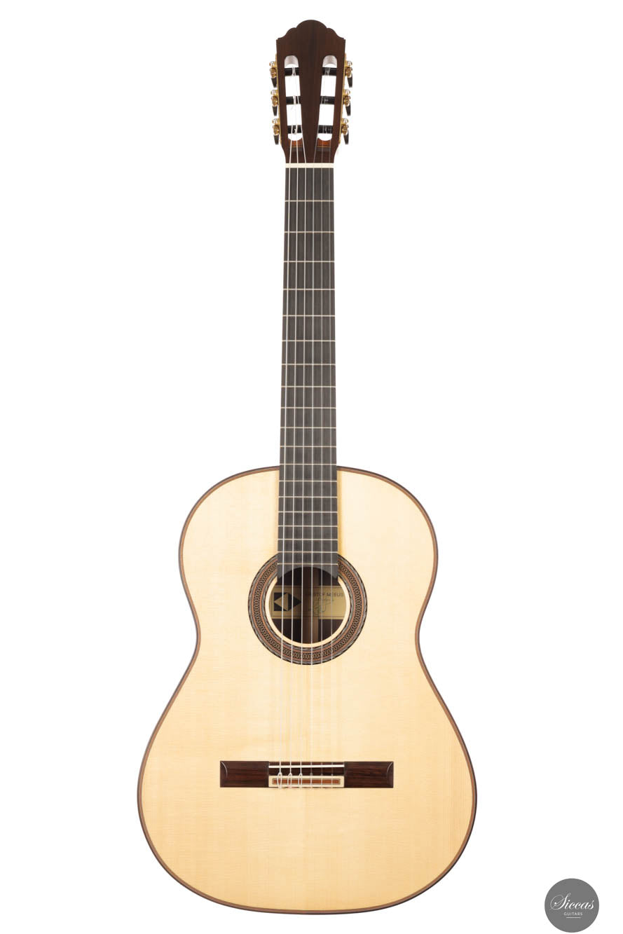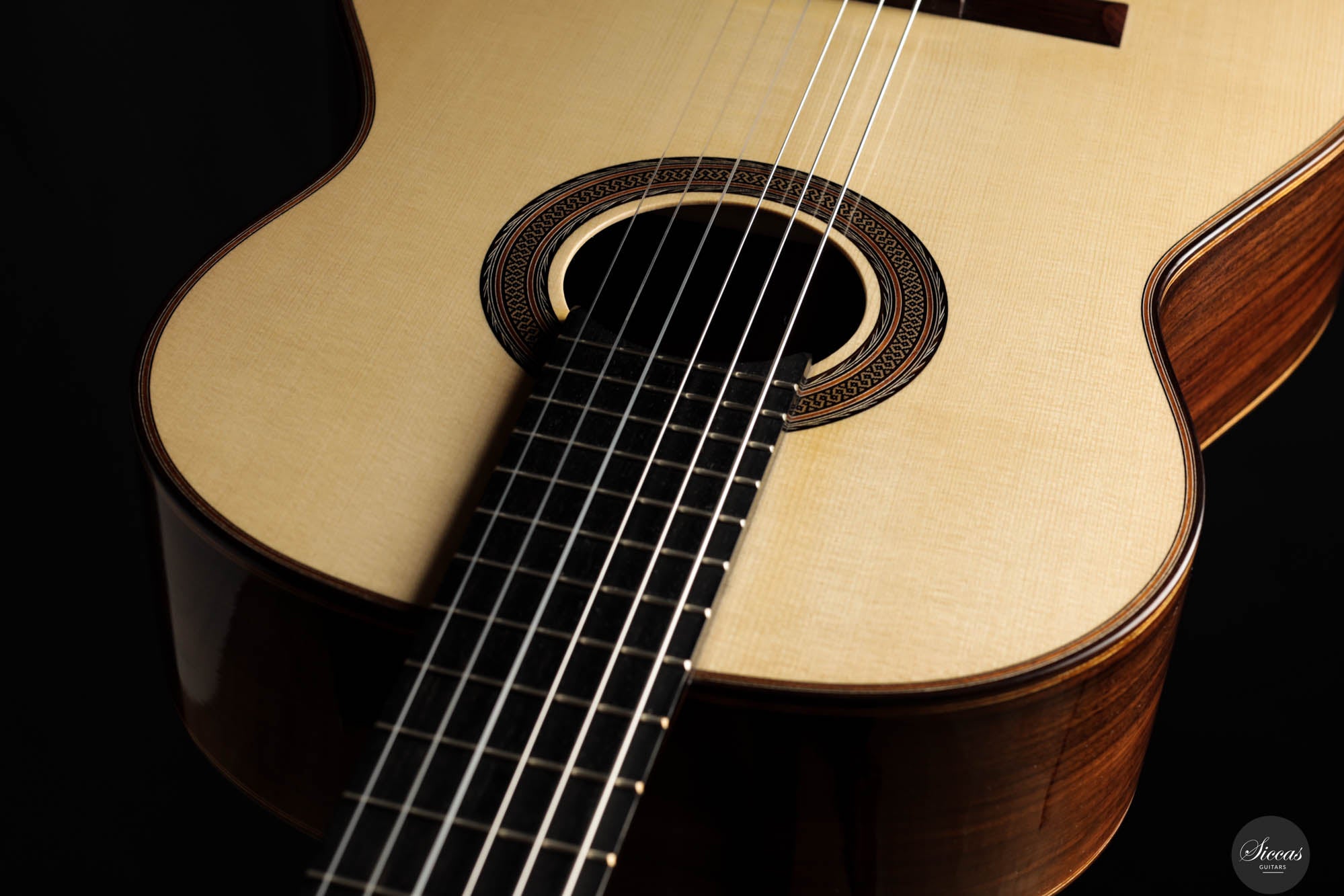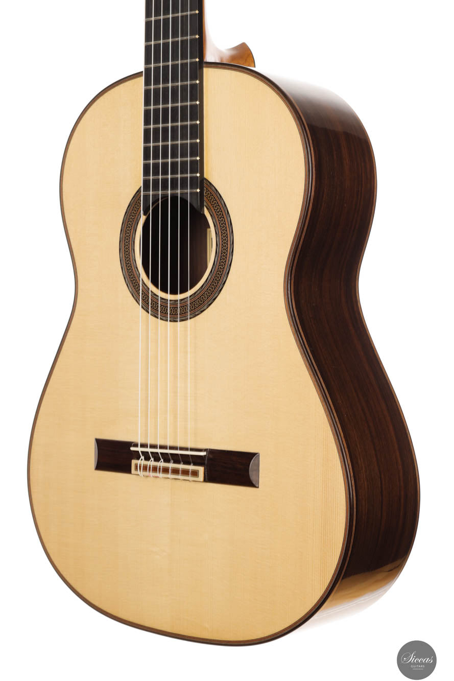 This 2024 concert model stands as an exemplar of lattice-braced guitars, steeped in tradition yet imbued with modern innovation. The meticulously implemented lattice bracing pattern crafted from spruce, is fortified by cedar inlays at every junction, lending the instrument both resilience and suppleness. The guitar’s visual allure, especially its intricately designed rosette, subtly evokes the aesthetics of the renowned Enrique Garcia, captivating the observer’s gaze. Beyond mere visual appeal, the guitar resonates with a harmonious aura, a quality effortlessly mirrored in its sonorous output. Upon strumming, the soundboard reacts instantaneously, releasing a rich, velvety timbre that speaks of depth and sophistication.