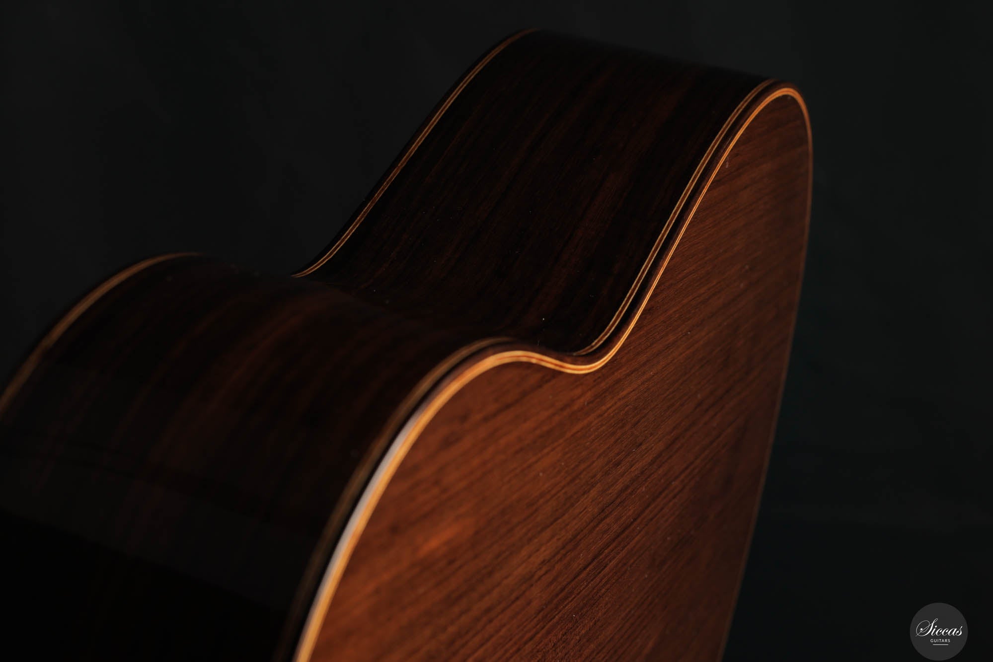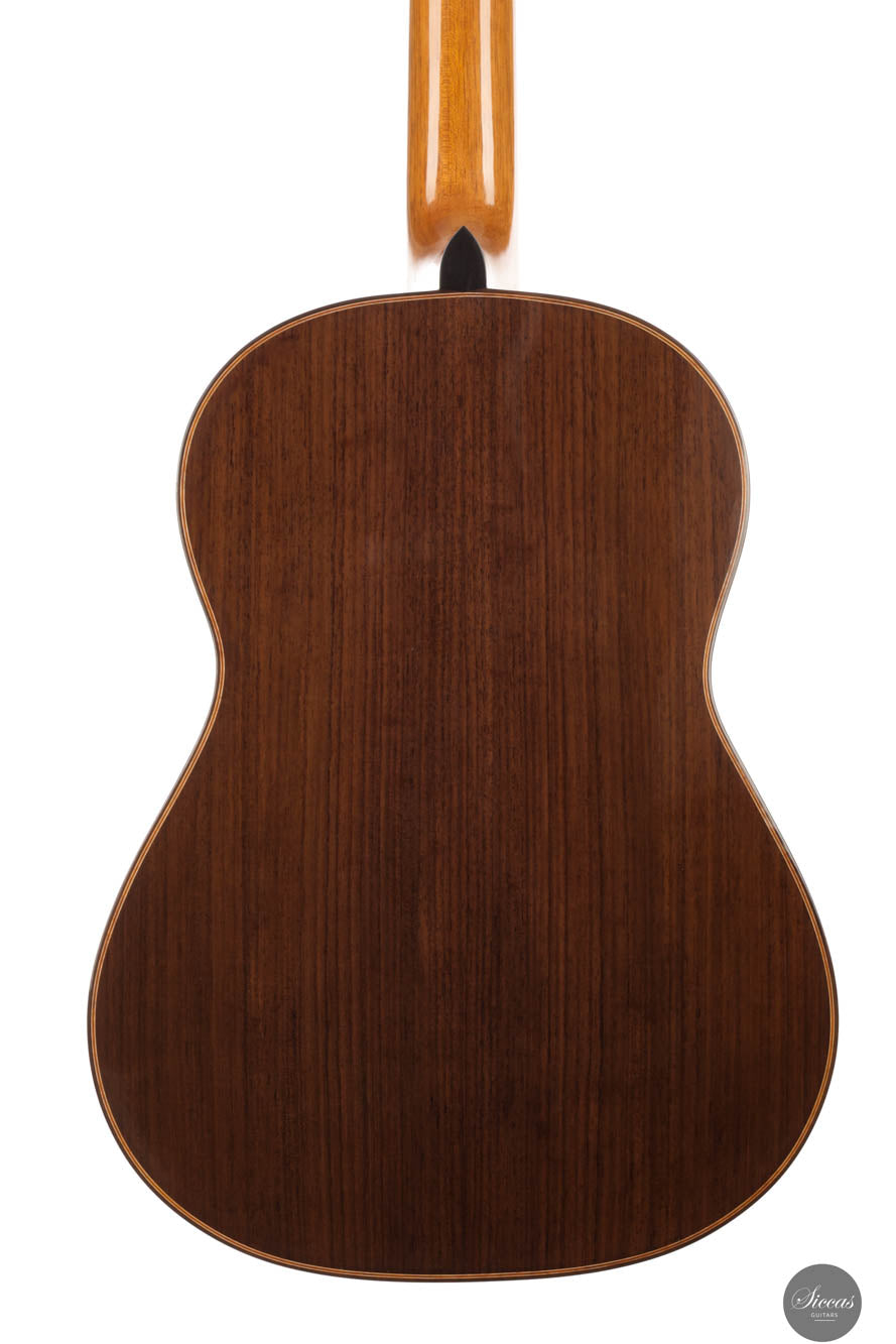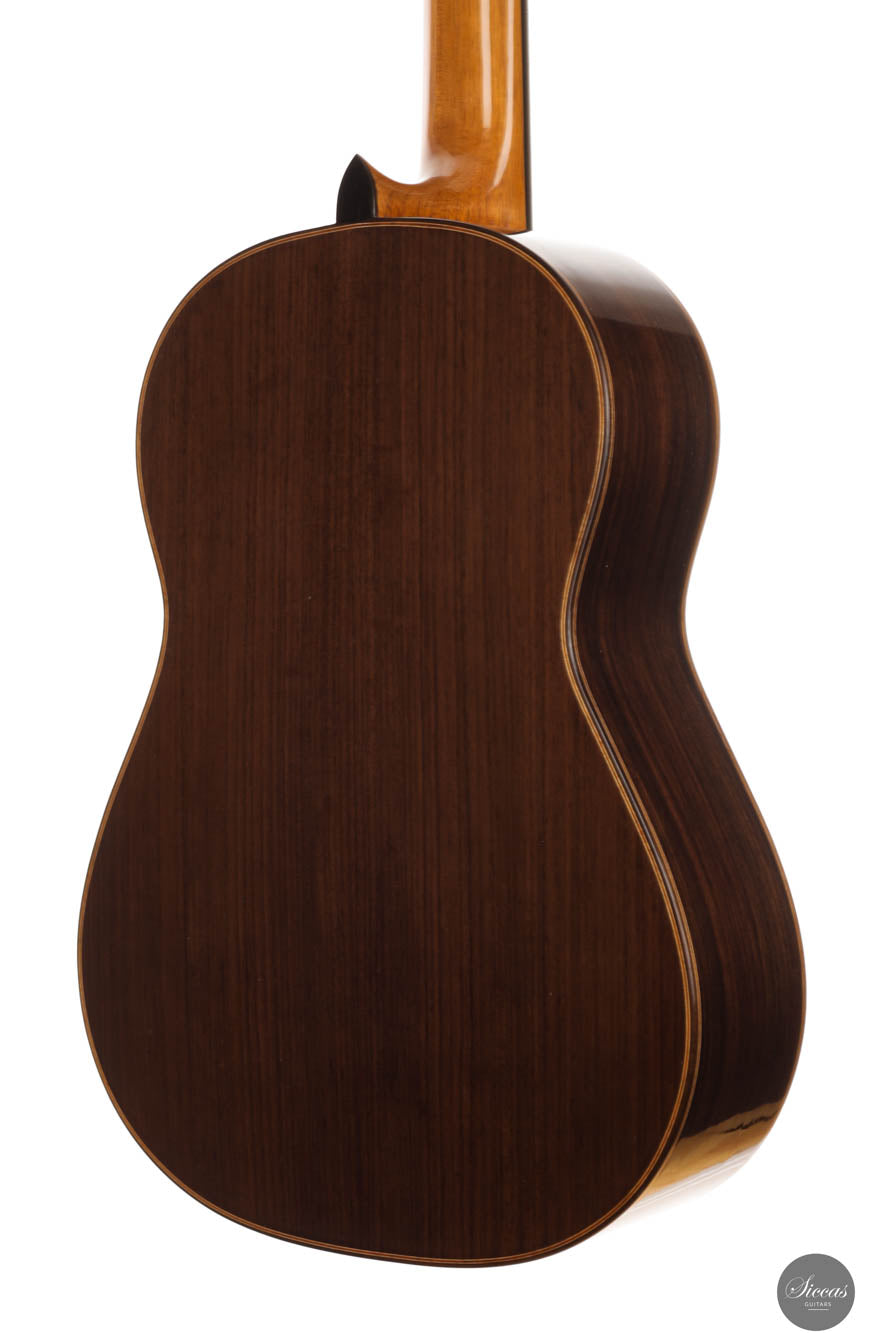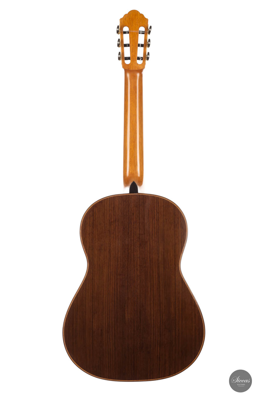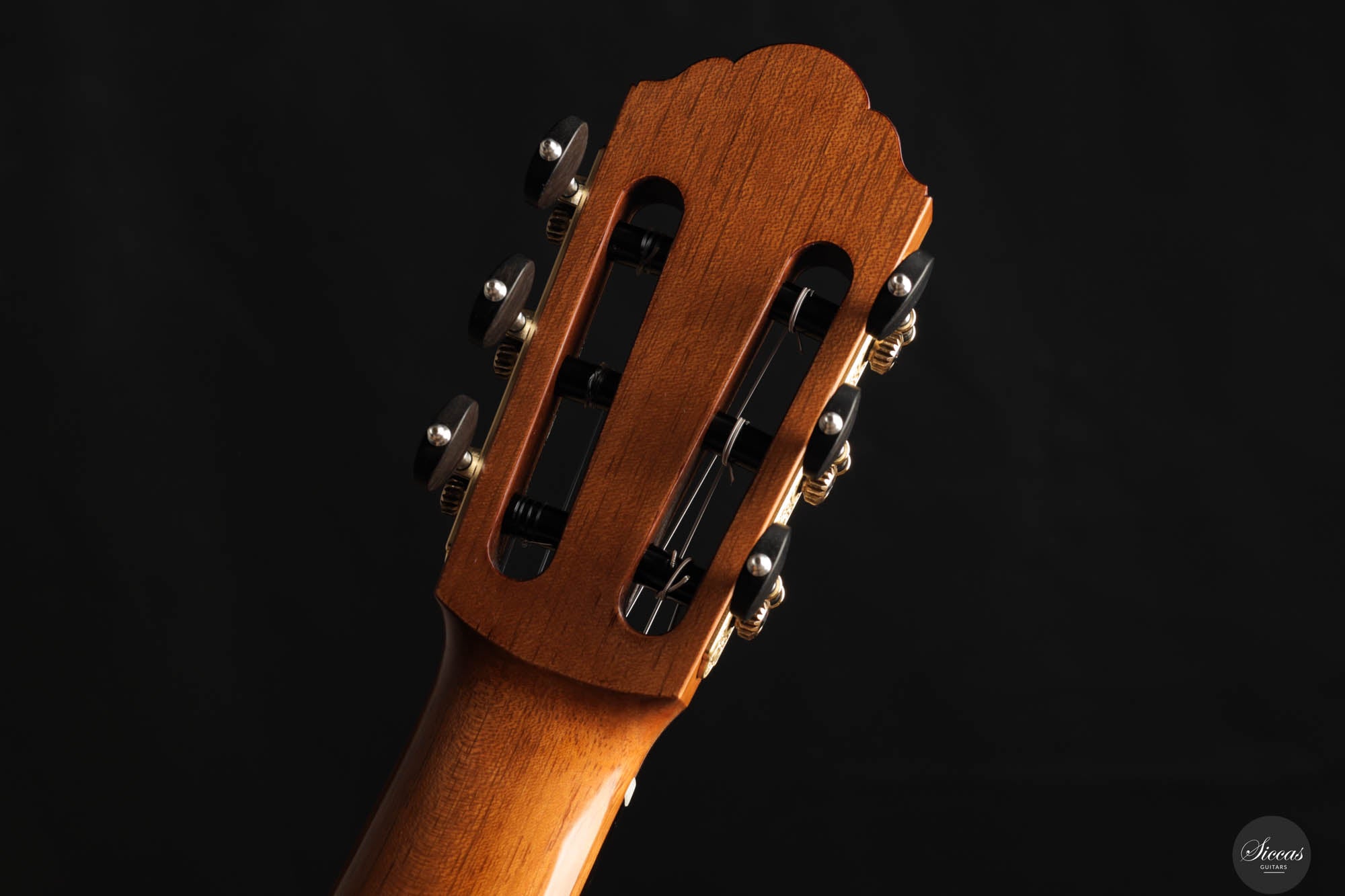 This 2024 concert model stands as an exemplar of lattice-braced guitars, steeped in tradition yet imbued with modern innovation. The meticulously implemented lattice bracing pattern crafted from spruce, is fortified by cedar inlays at every junction, lending the instrument both resilience and suppleness. The guitar’s visual allure, especially its intricately designed rosette, subtly evokes the aesthetics of the renowned Enrique Garcia, captivating the observer’s gaze. Beyond mere visual appeal, the guitar resonates with a harmonious aura, a quality effortlessly mirrored in its sonorous output. Upon strumming, the soundboard reacts instantaneously, releasing a rich, velvety timbre that speaks of depth and sophistication.