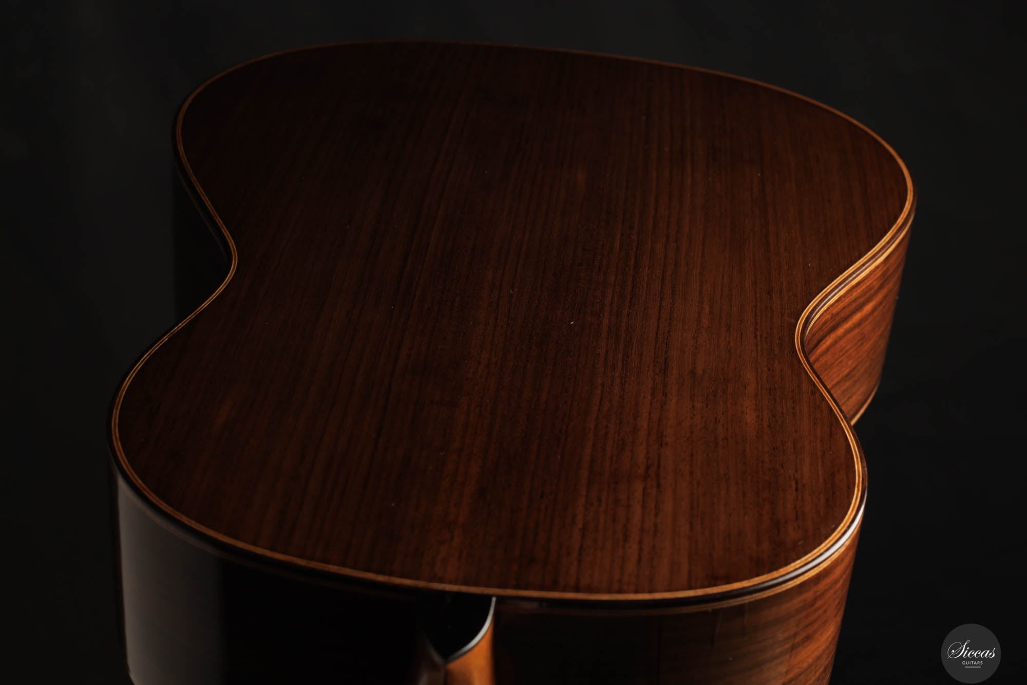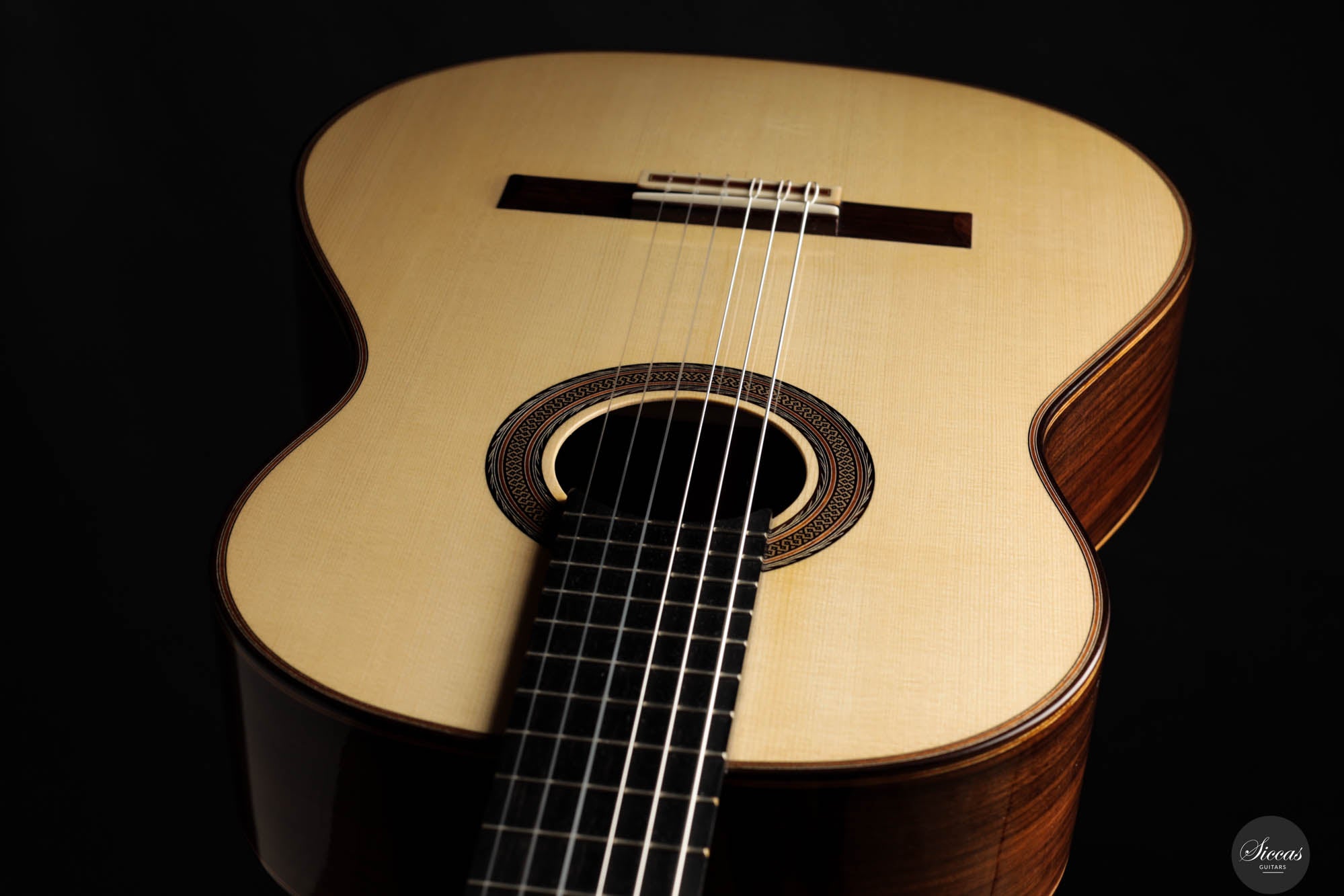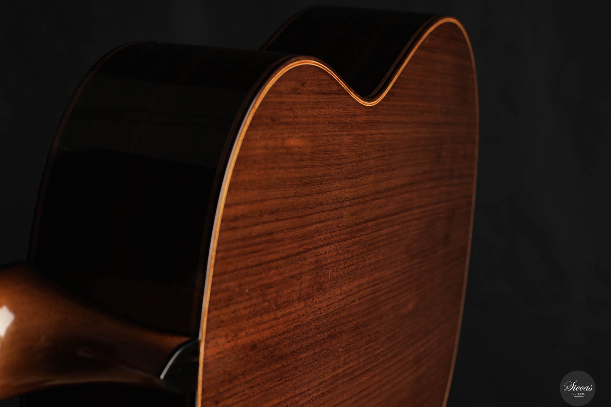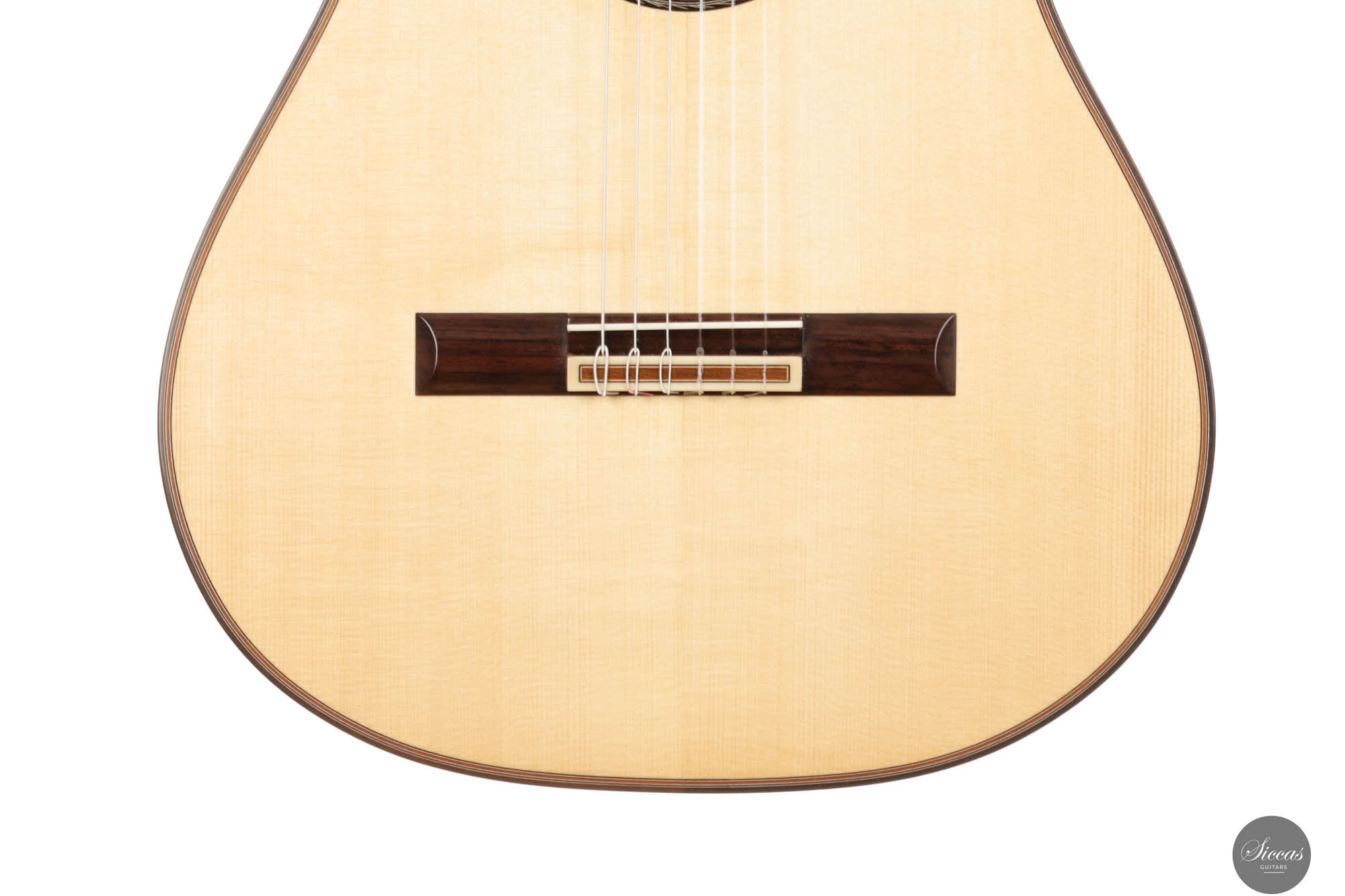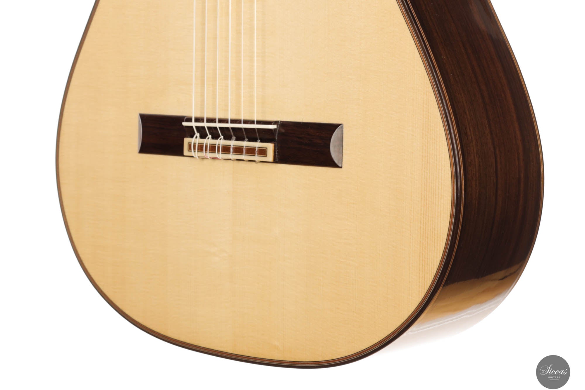 This 2024 concert model stands as an exemplar of lattice-braced guitars, steeped in tradition yet imbued with modern innovation. The meticulously implemented lattice bracing pattern crafted from spruce, is fortified by cedar inlays at every junction, lending the instrument both resilience and suppleness. The guitar’s visual allure, especially its intricately designed rosette, subtly evokes the aesthetics of the renowned Enrique Garcia, captivating the observer’s gaze. Beyond mere visual appeal, the guitar resonates with a harmonious aura, a quality effortlessly mirrored in its sonorous output. Upon strumming, the soundboard reacts instantaneously, releasing a rich, velvety timbre that speaks of depth and sophistication.