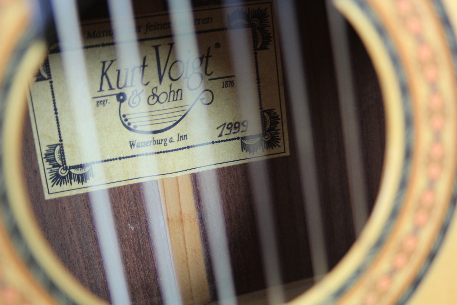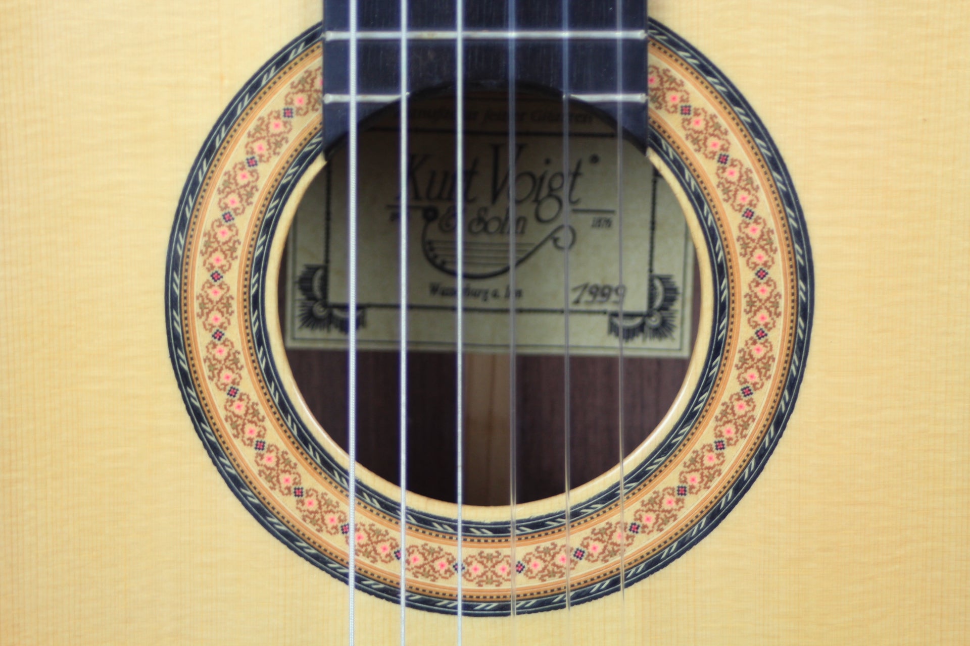 Questa chitarra è stata sviluppata e costruita da Curt Claus Voigt. La tavola armonica è in fine abete tedesco, fondo e fasce in palissandro indiano. La chitarra è stata laccata completamente con gommalacca. La chitarra è in ottime condizioni.
