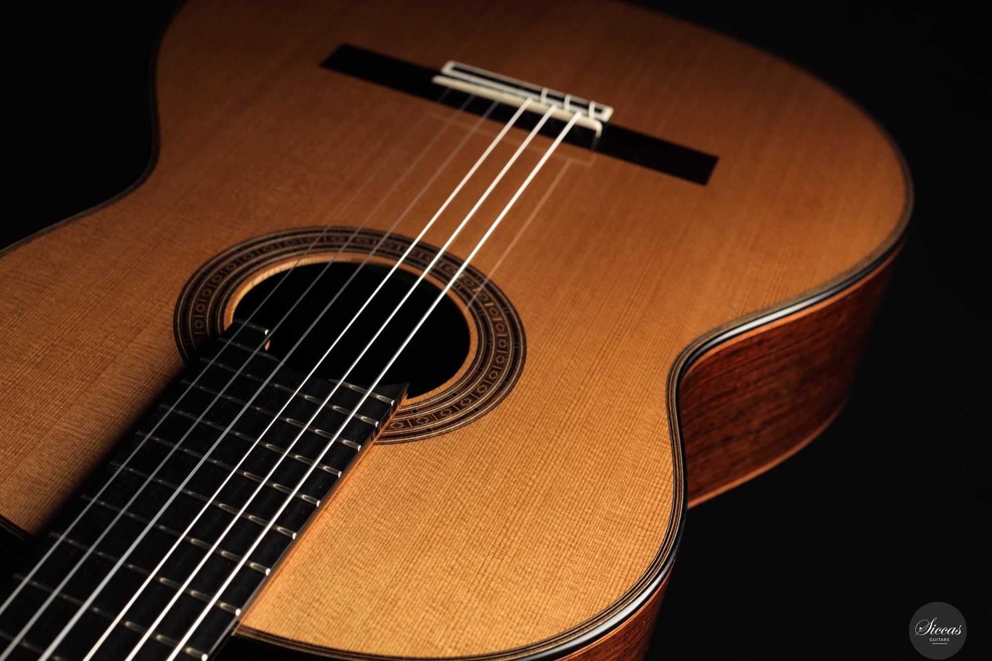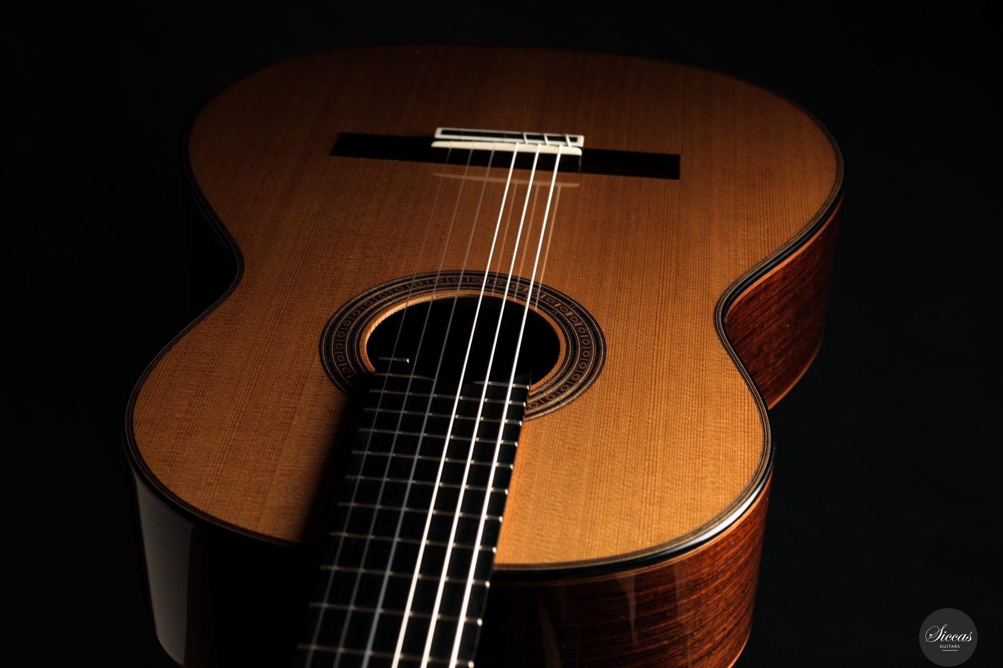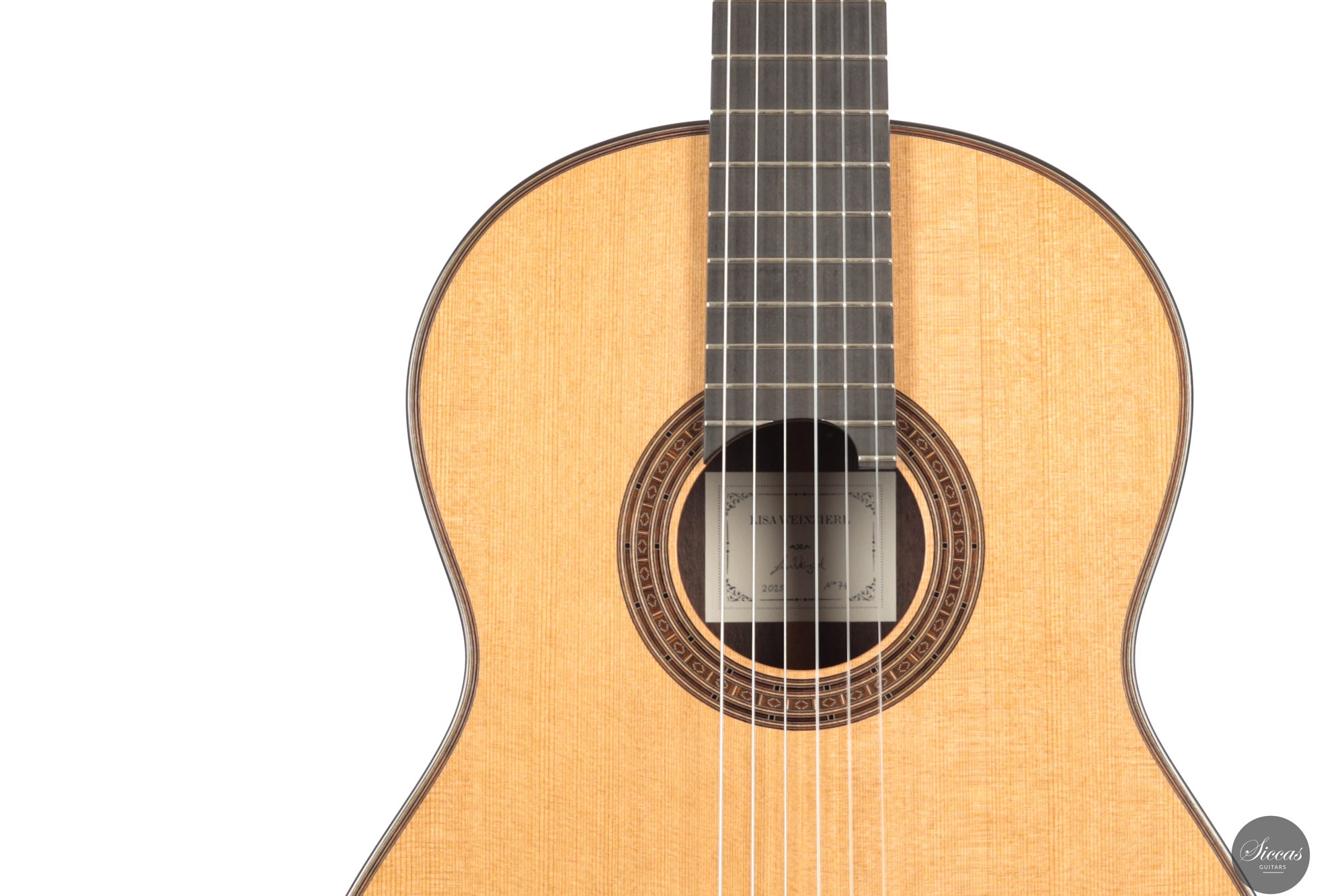 This 2025 cedar-top concert guitar by Lisa Weinzierl combines visual purity with outstanding tonal balance. It is a traditionally built instrument that achieves the power, volume, and coloristic depth often reserved for more modern constructions. The air resonance lies between F♯ and G, supporting a generous, sonorous tone. Its response is both fast and rounded, with a wide dynamic range and even projection across the full register. The basses are full and supportive, the trebles clear and refined, and the midrange richly blended — producing a voice that is lyrical without ever sounding forced.