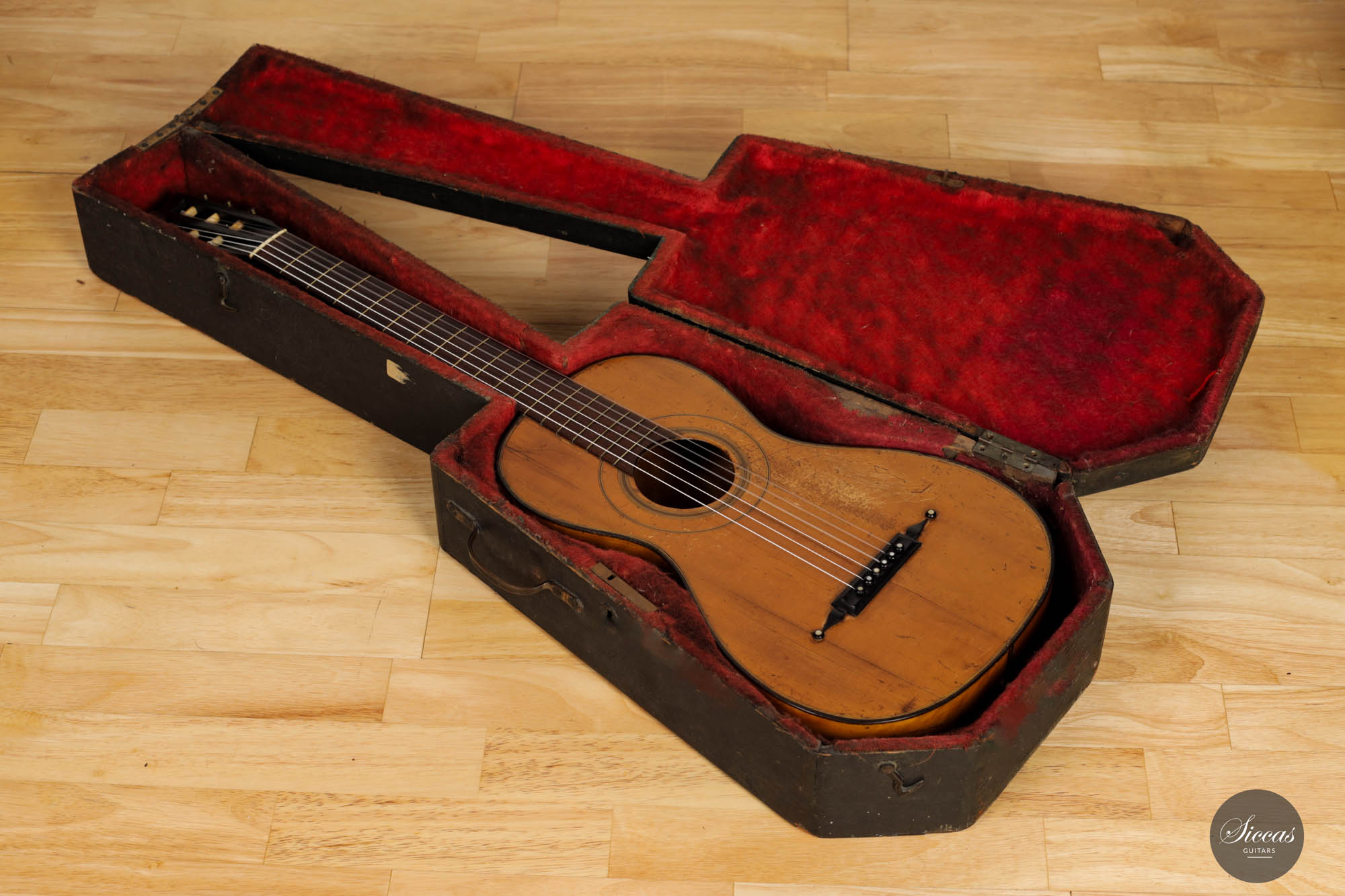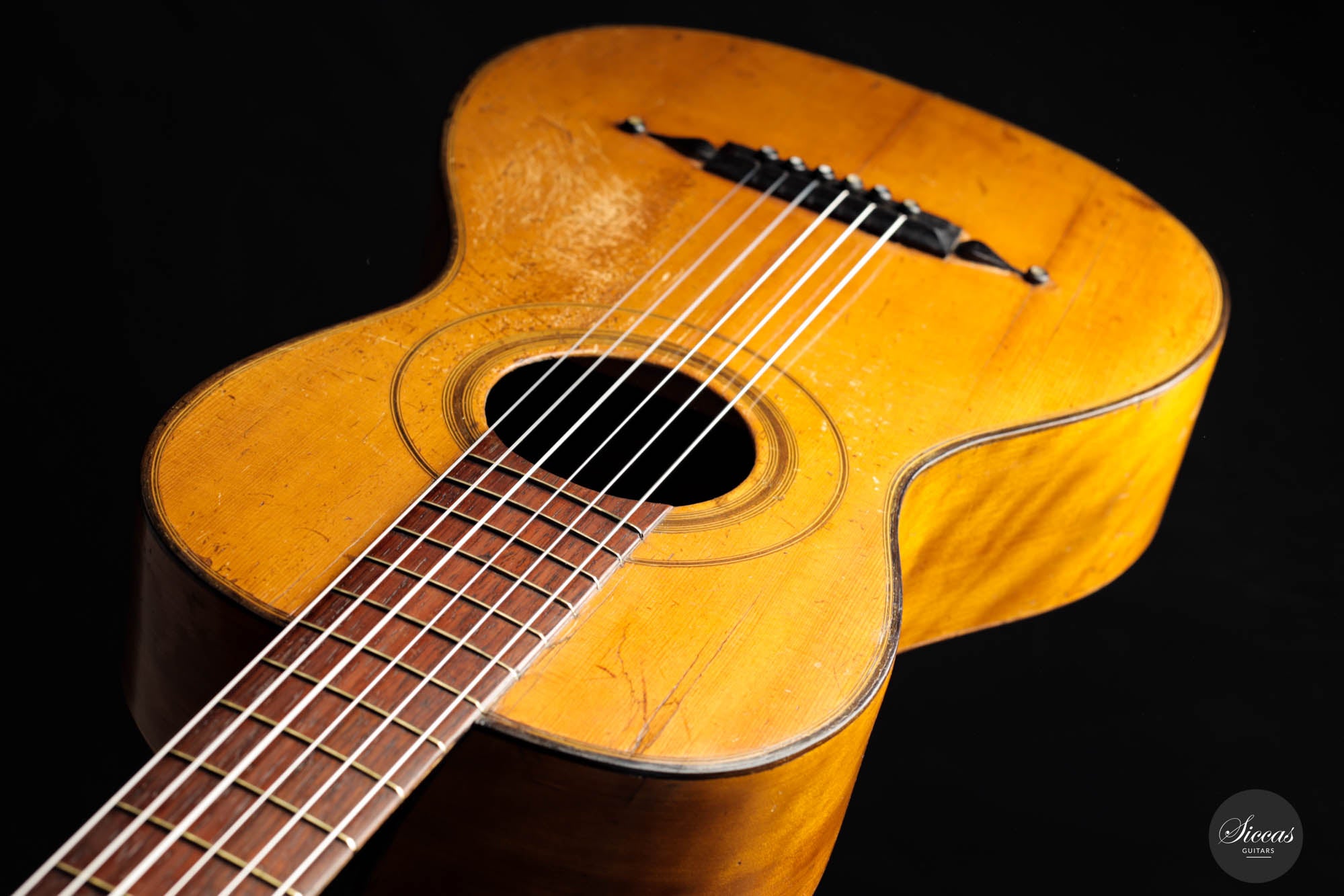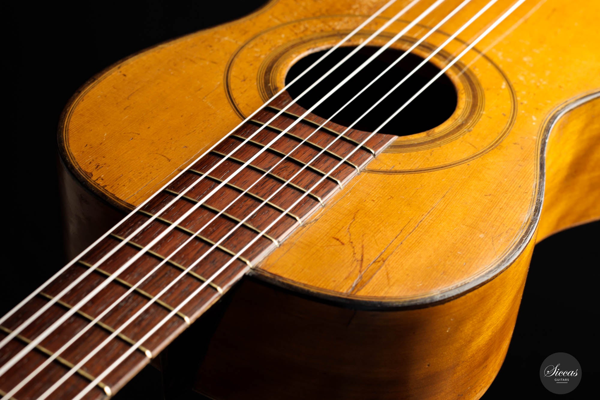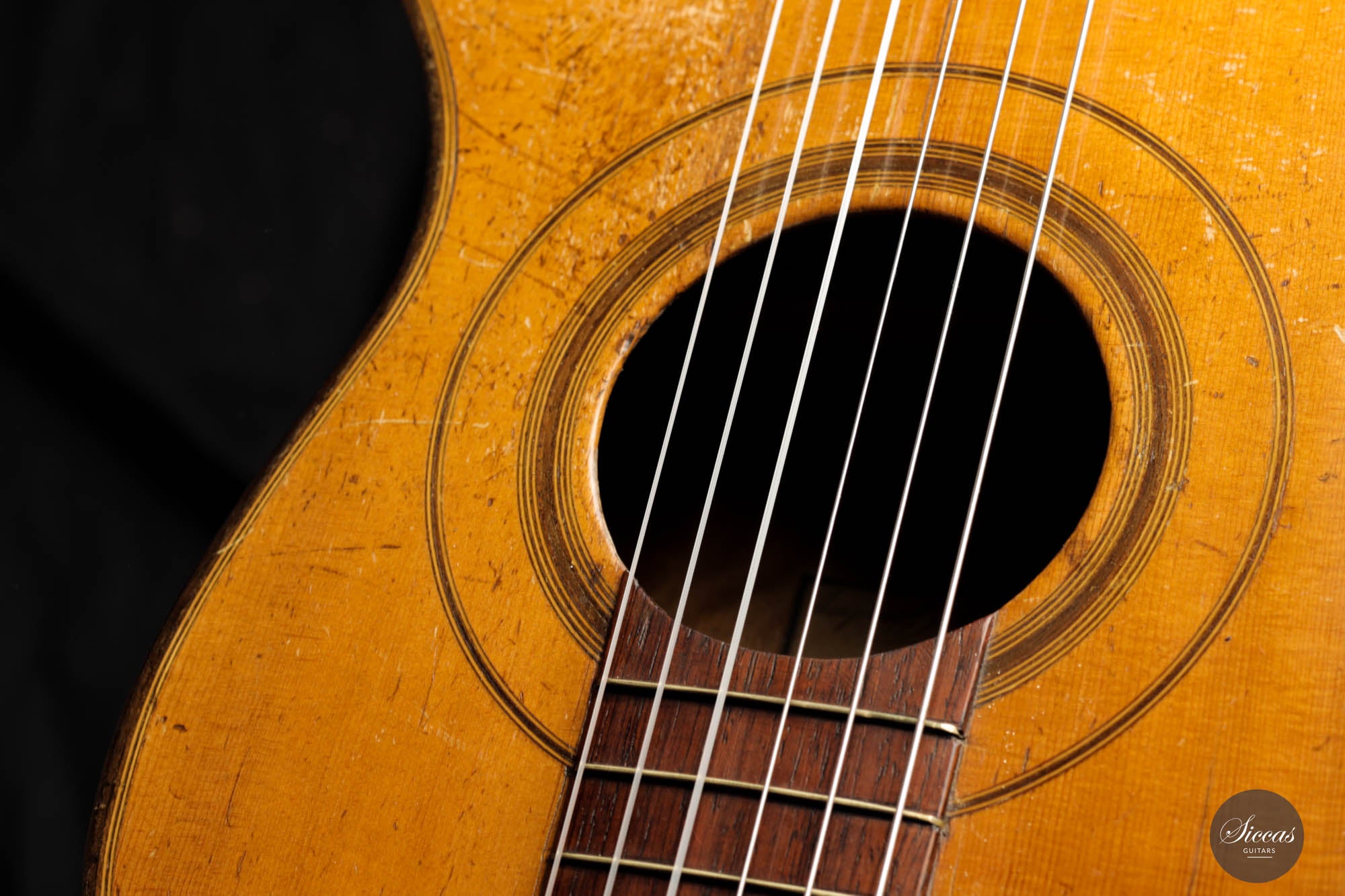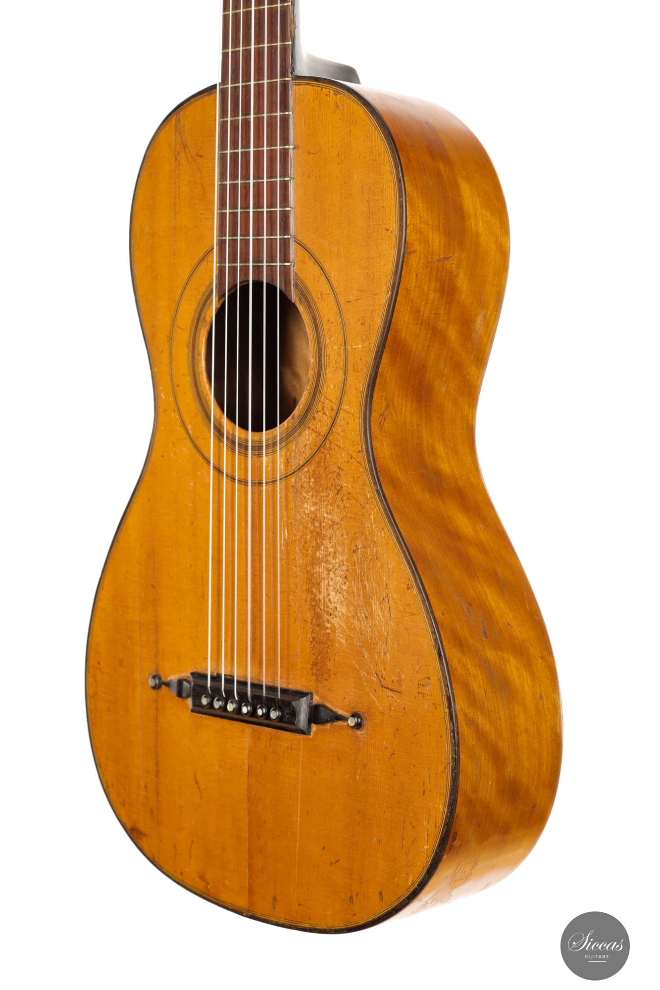 From the moment one lays eyes on this 1830 gem, the allure of its history is undeniable. The spruce top, despite the passage of nearly two centuries, still resonates with the whispers of countless melodies played upon it. Its timeworn visage, adorned with several gracefully repaired cracks, speaks not of damage, but of a life fully lived; a testament to the countless hands it has passed through and the stories it could tell.