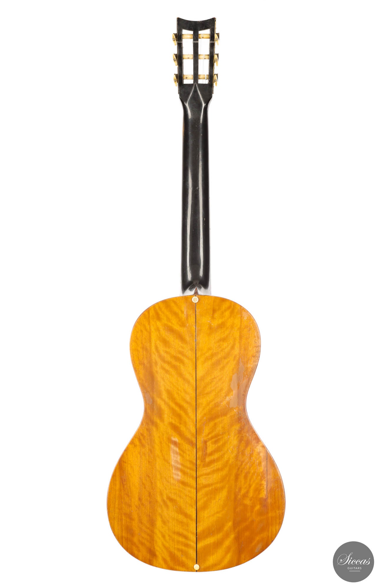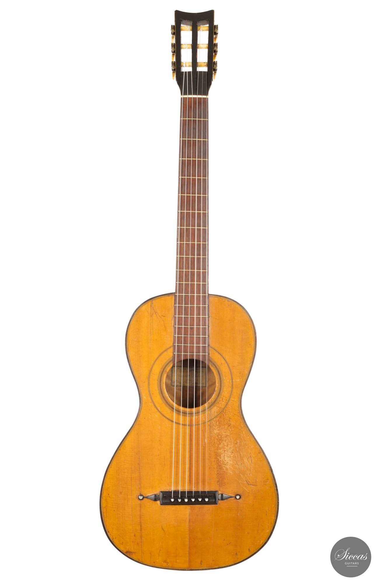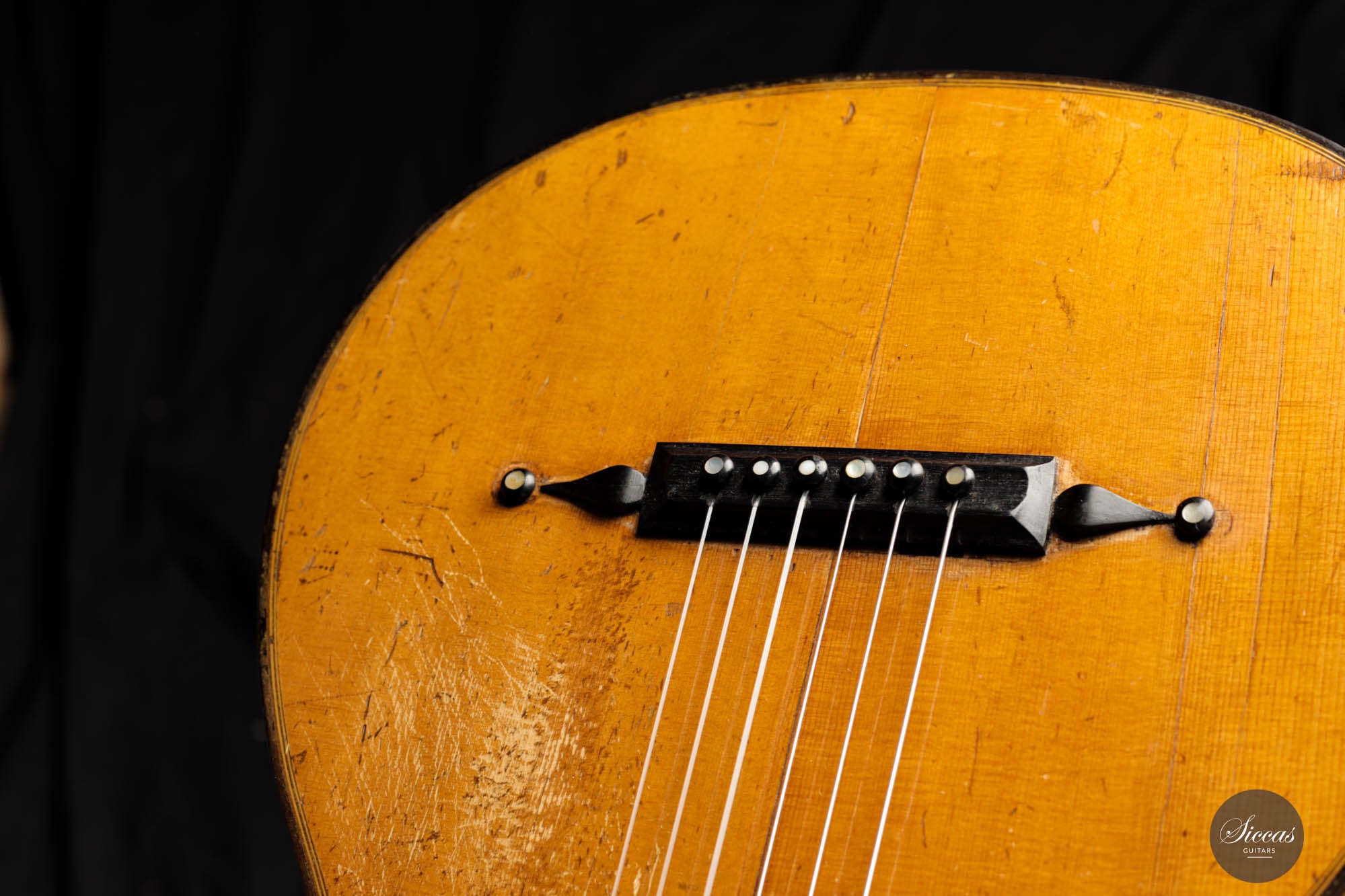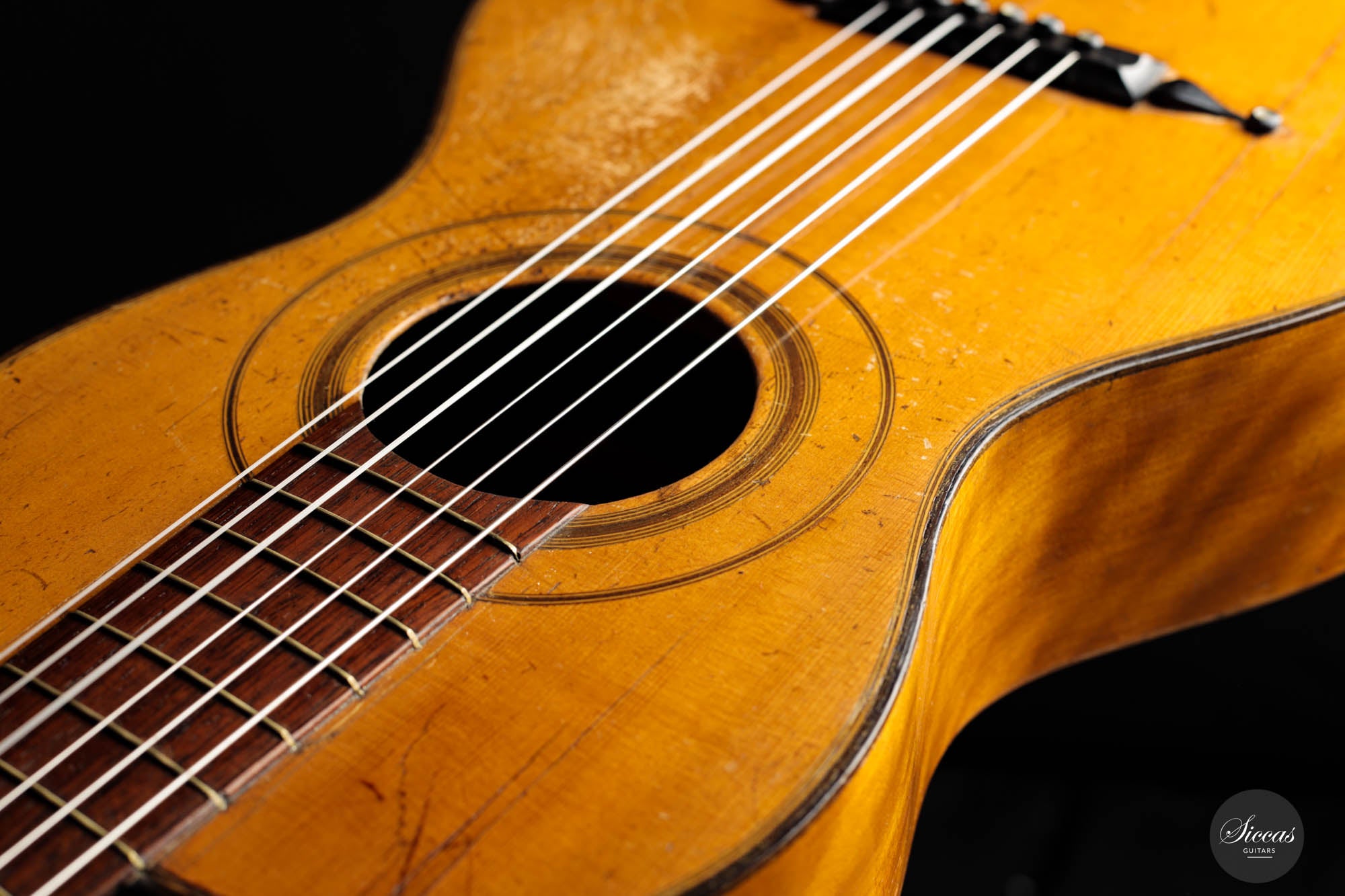 From the moment one lays eyes on this 1830 gem, the allure of its history is undeniable. The spruce top, despite the passage of nearly two centuries, still resonates with the whispers of countless melodies played upon it. Its timeworn visage, adorned with several gracefully repaired cracks, speaks not of damage, but of a life fully lived; a testament to the countless hands it has passed through and the stories it could tell.