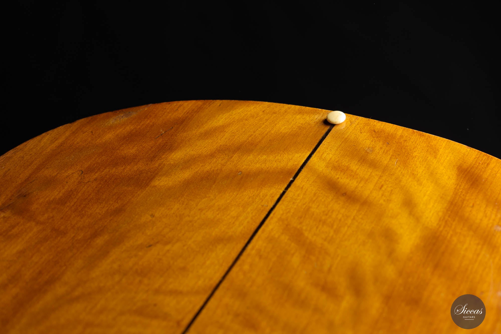 The flamed maple back and sides shimmer with an iridescence, their rich flame patterns dancing and changing as the light graces them, reminiscent of the flickering flames in a cozy fireplace. The two-piece back adds an understated elegance to its structure, hinting at the expert craftsmanship and attention to detail Panormo was renowned for.