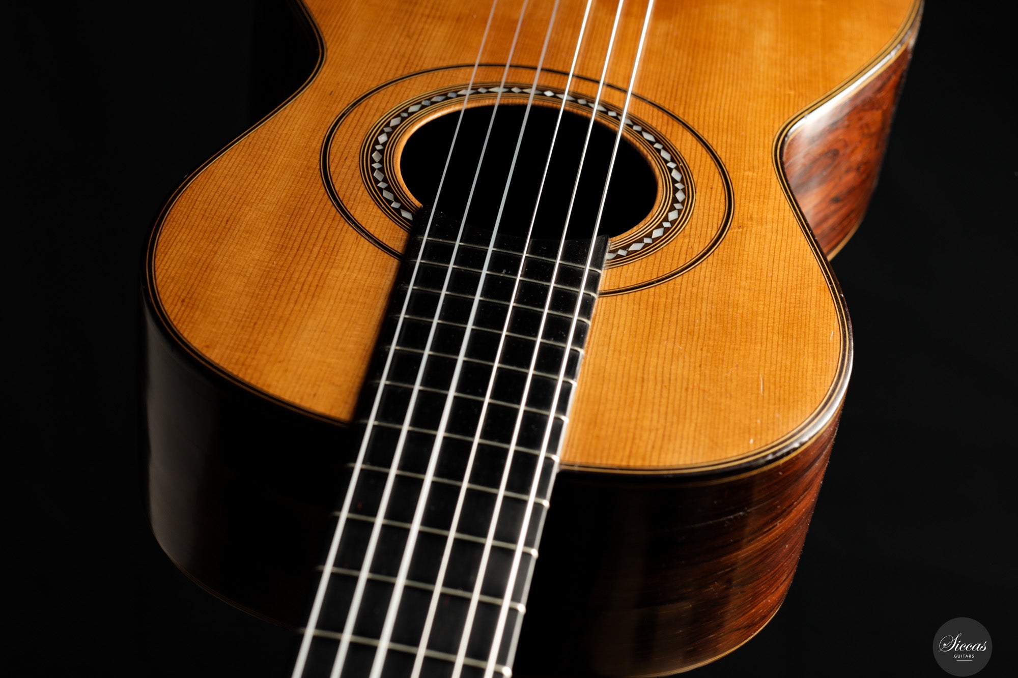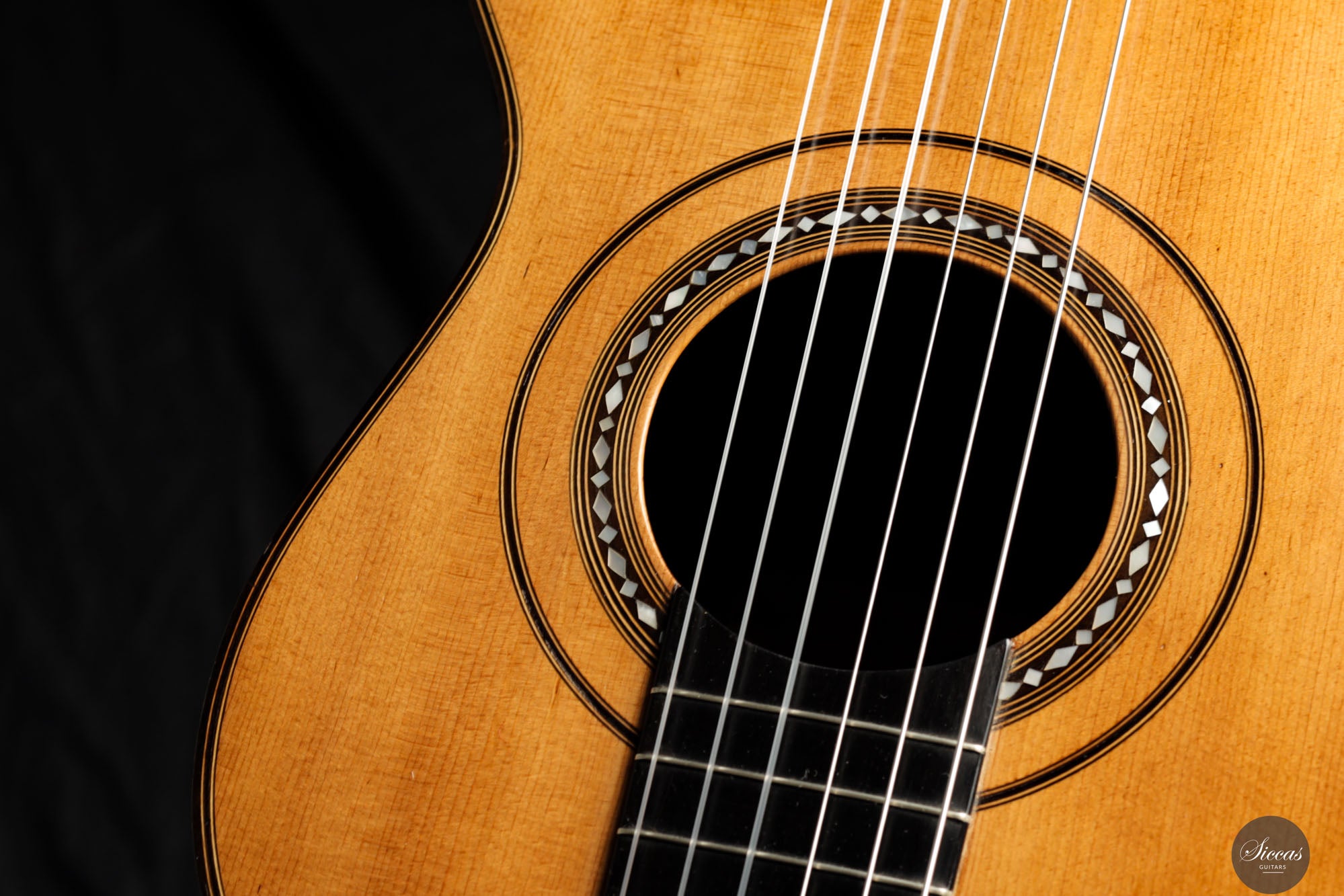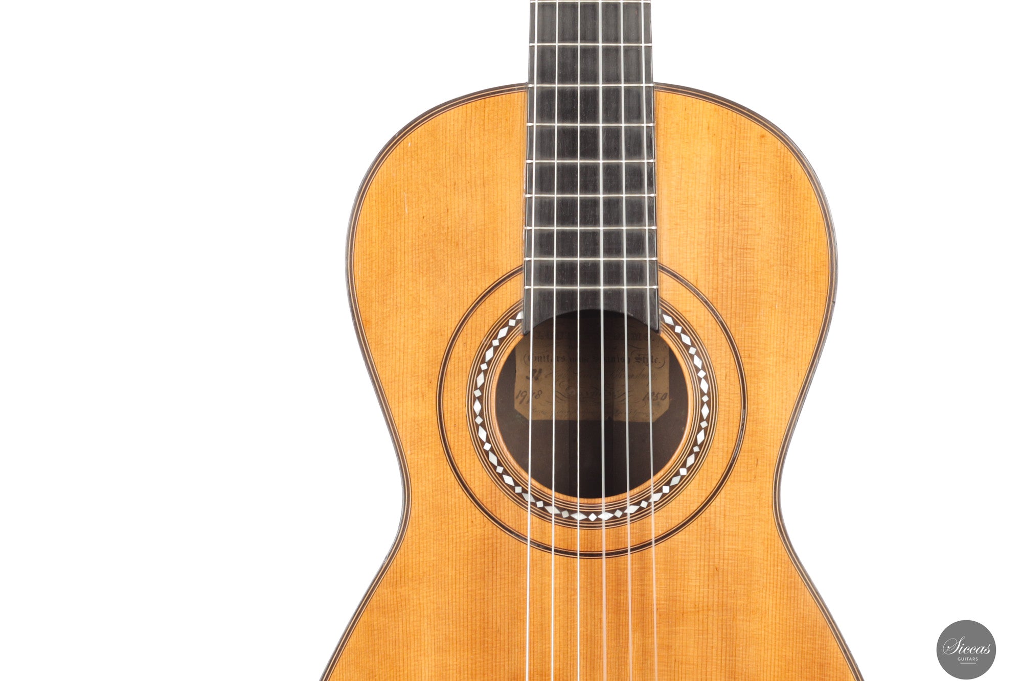 This guitar, built in 1850 and bearing the number 1978, is a representative example of Louis Panormo’s mature work. Its voice is refined and remarkably full, with a low air resonance that contributes to an exceptionally deep bass register. The treble strings respond with clarity and roundness, offering effortless sustain and a calm, vocal presence throughout the upper range. The tonal balance is natural and cohesive, with excellent separation that supports period repertoire with clarity. The seven-fan bracing, typical of Panormo's later guitars, imparts both structural lightness and tonal complexity, enhancing resonance without sacrificing control. The instrument’s shorter scale length and overall dimensions contribute to its intimate feel and ease of playability, especially suited to romantic literature.
