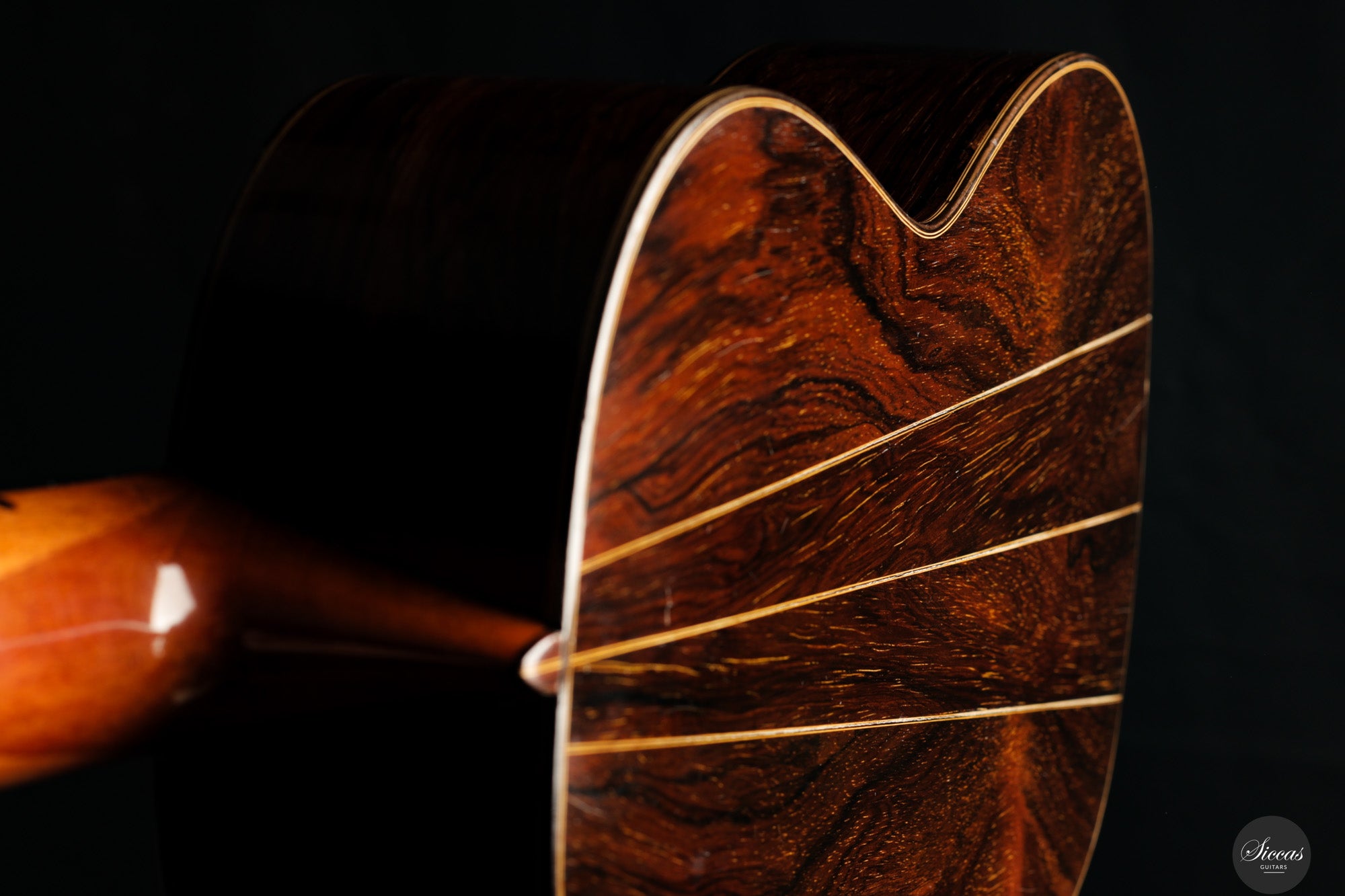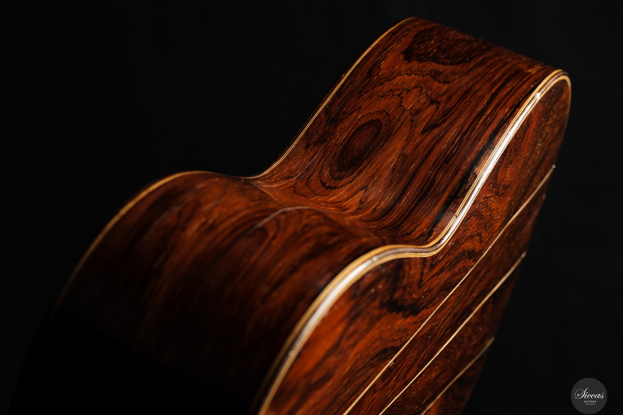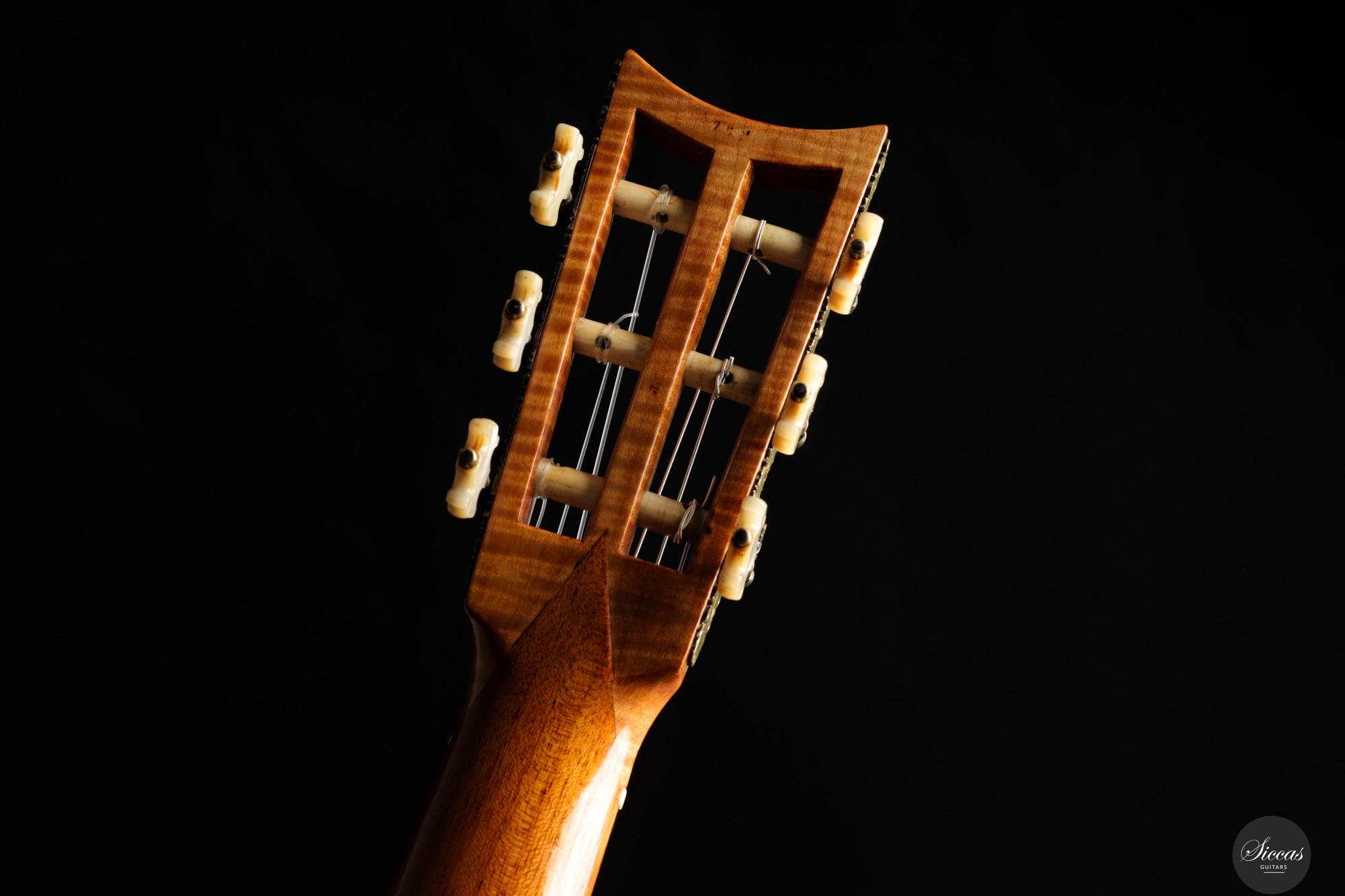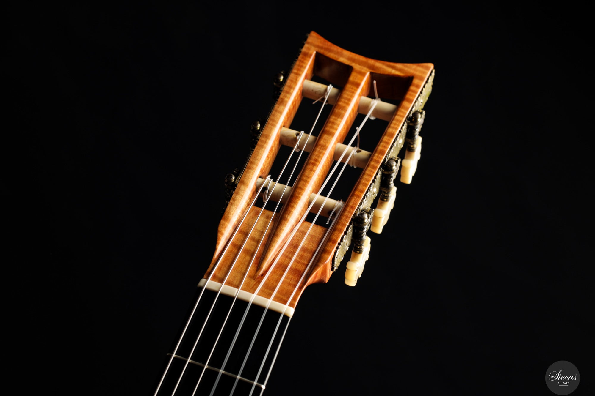 This guitar, built in 1850 and bearing the number 1978, is a representative example of Louis Panormo’s mature work. Its voice is refined and remarkably full, with a low air resonance that contributes to an exceptionally deep bass register. The treble strings respond with clarity and roundness, offering effortless sustain and a calm, vocal presence throughout the upper range. The tonal balance is natural and cohesive, with excellent separation that supports period repertoire with clarity. The seven-fan bracing, typical of Panormo's later guitars, imparts both structural lightness and tonal complexity, enhancing resonance without sacrificing control. The instrument’s shorter scale length and overall dimensions contribute to its intimate feel and ease of playability, especially suited to romantic literature.