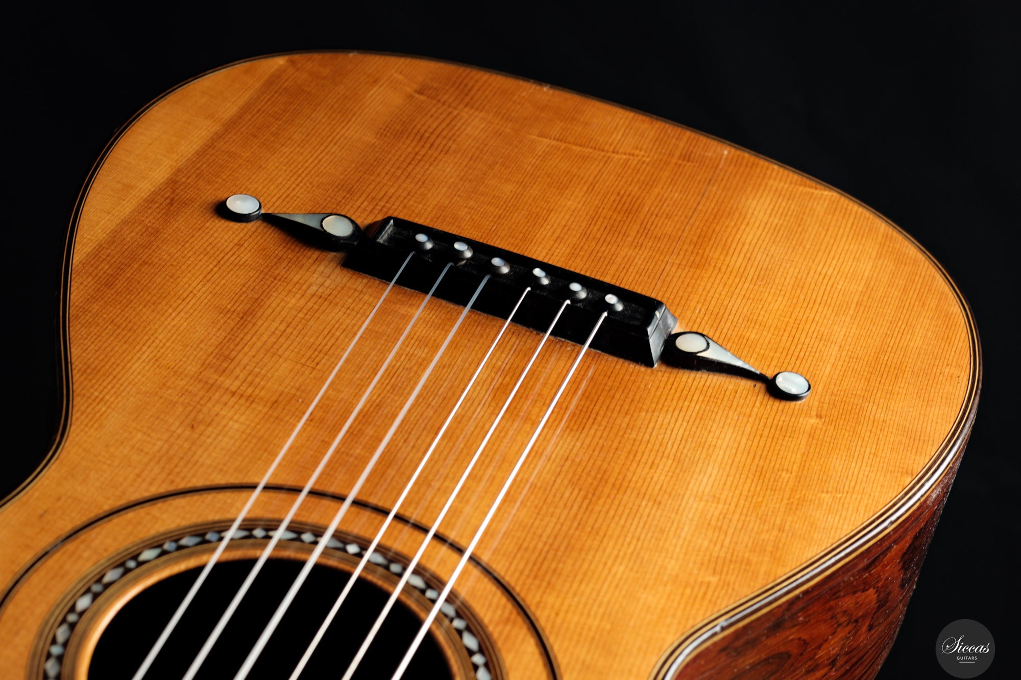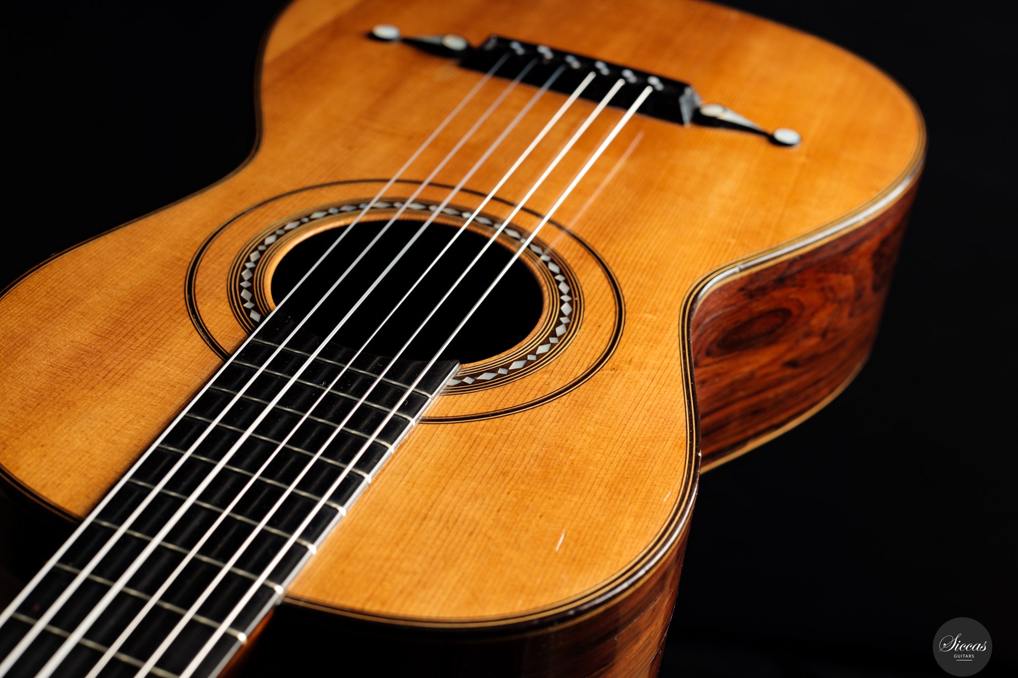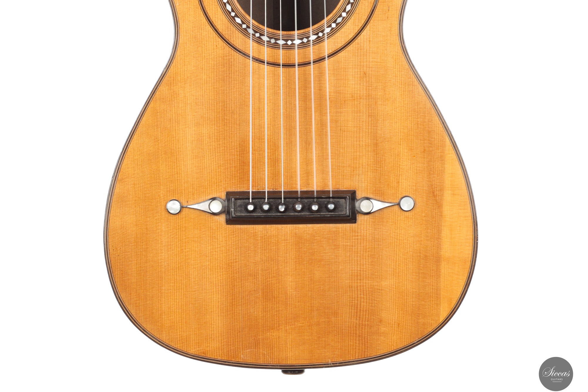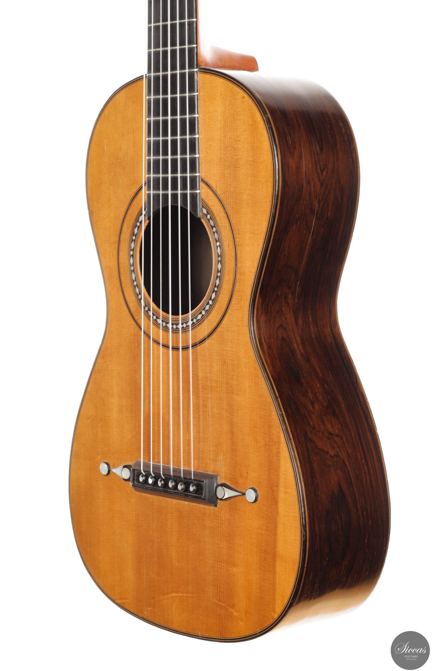 The guitar is in very good condition for its age. Several cracks on the sides have been professionally repaired without the use of cleats. The soundboard has one crack which has been reinforced with cleats. The original finish is preserved with French polish throughout, and the antique Baker tuners remain fully functional and feature intricate original engravings.