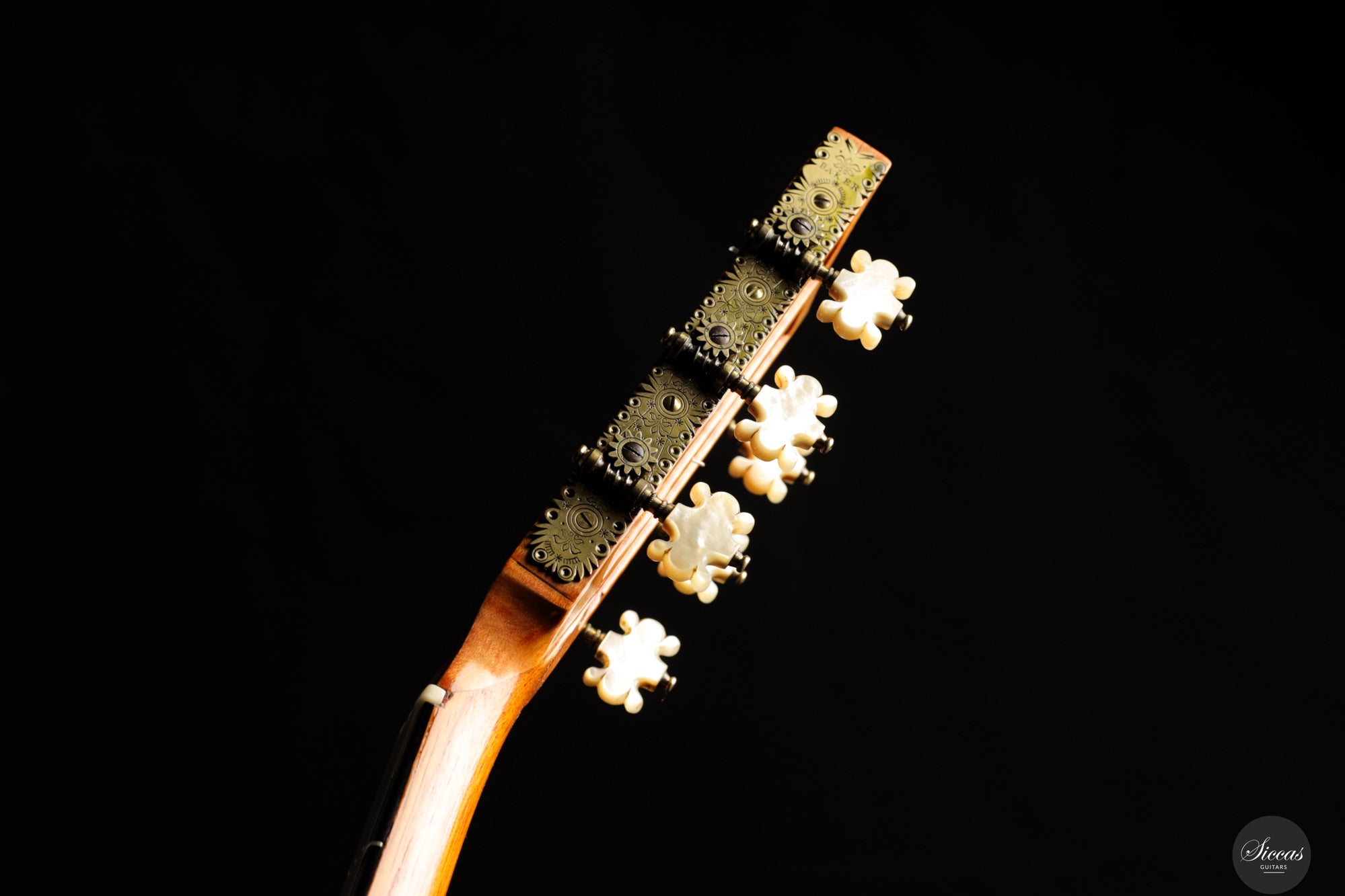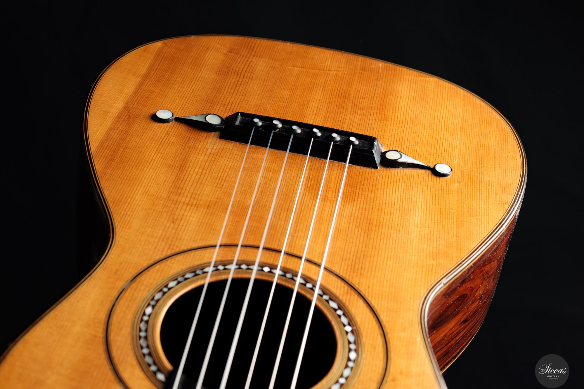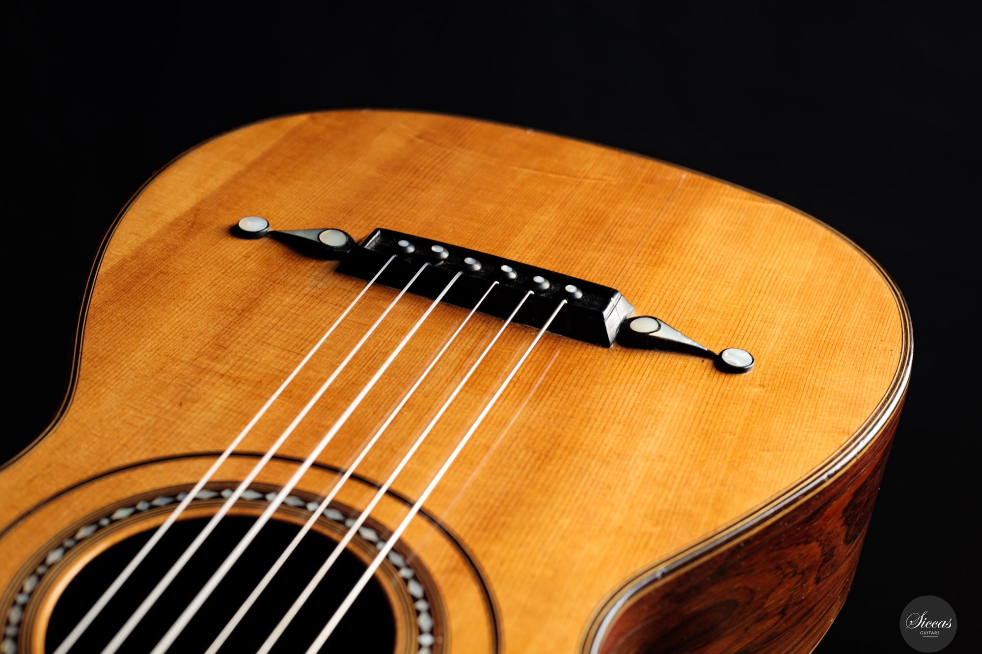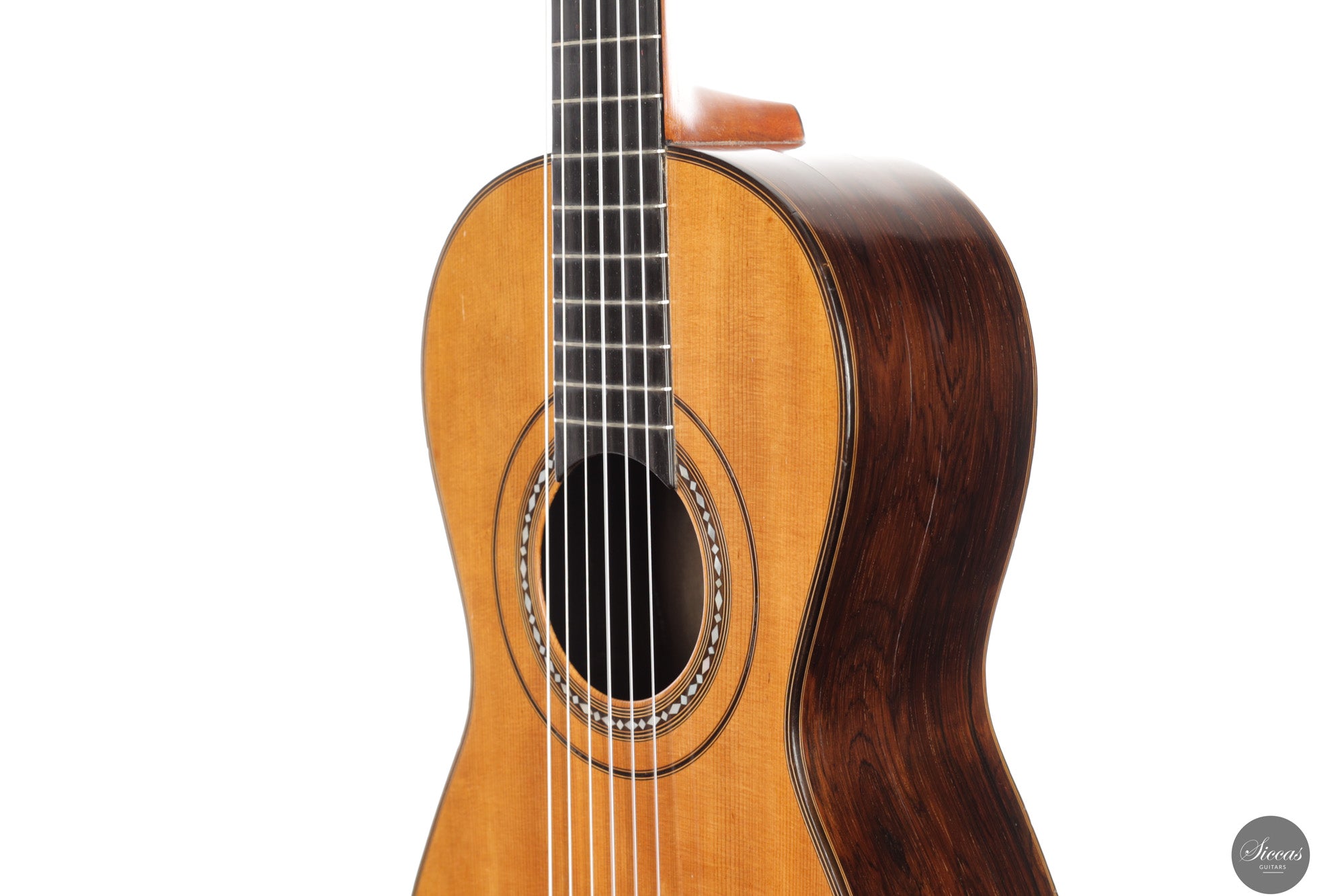 The guitar is in very good condition for its age. Several cracks on the sides have been professionally repaired without the use of cleats. The soundboard has one crack which has been reinforced with cleats. The original finish is preserved with French polish throughout, and the antique Baker tuners remain fully functional and feature intricate original engravings.