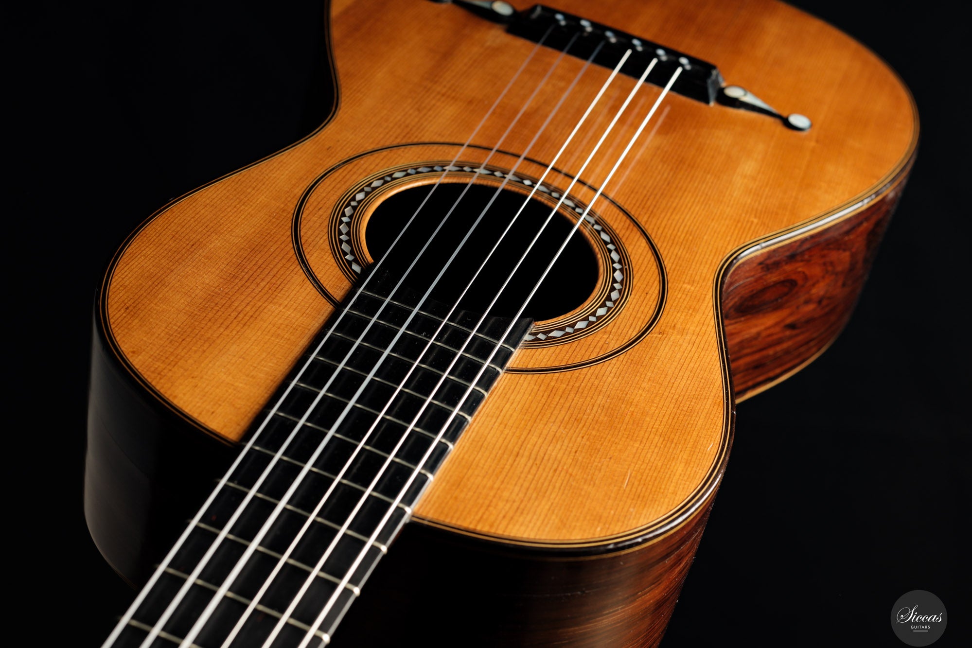 Louis Panormo was one of the most important guitar makers active in England during the first half of the nineteenth century. Born in Paris around 1784 into a family of instrument makers of Italian origin, he later settled in London, where he established himself as a leading figure in the development of the early romantic guitar. Panormo worked during a period of rapid evolution in guitar design and is widely credited with introducing Spanish-inspired fan bracing to instruments built in England. His work played a decisive role in shaping the voice and construction of the romantic guitar. Surviving instruments are rare and provide invaluable insight into the transition from early nineteenth-century guitar making toward the later Spanish school.