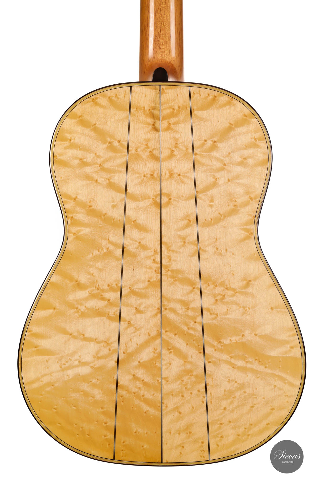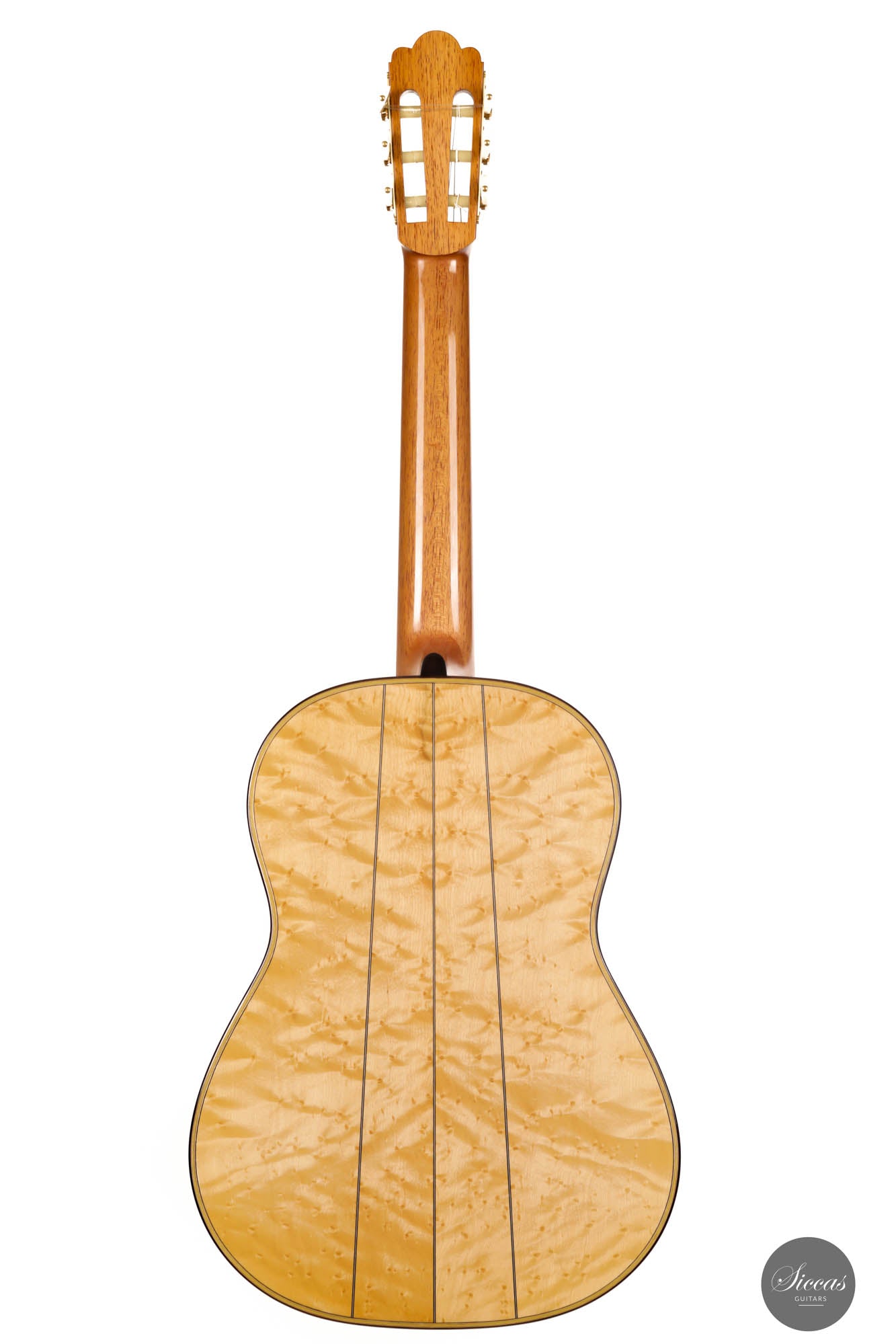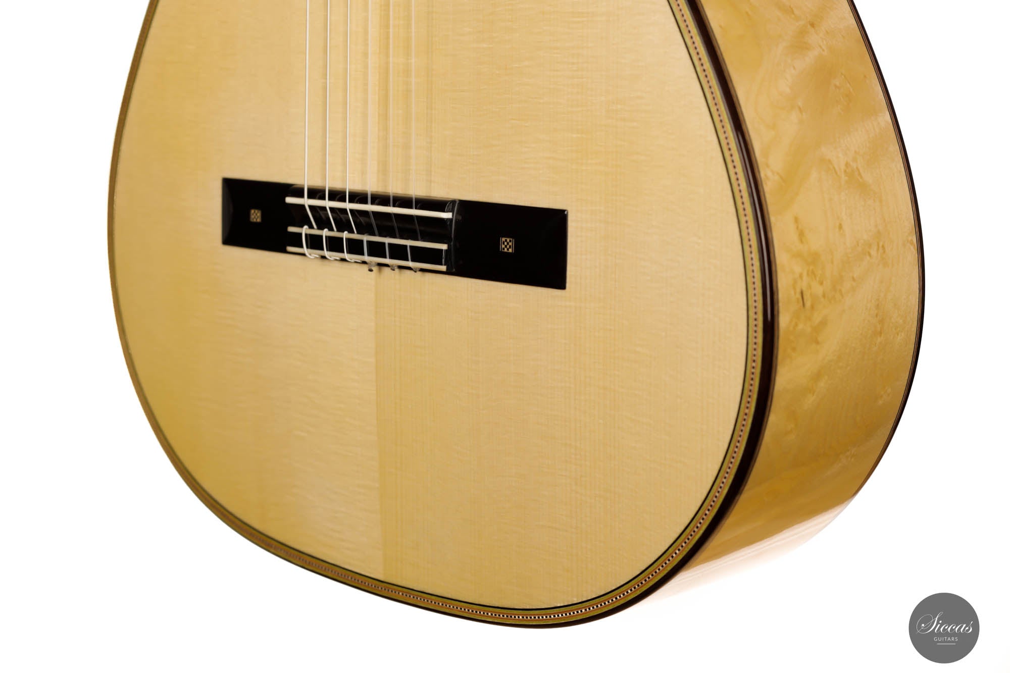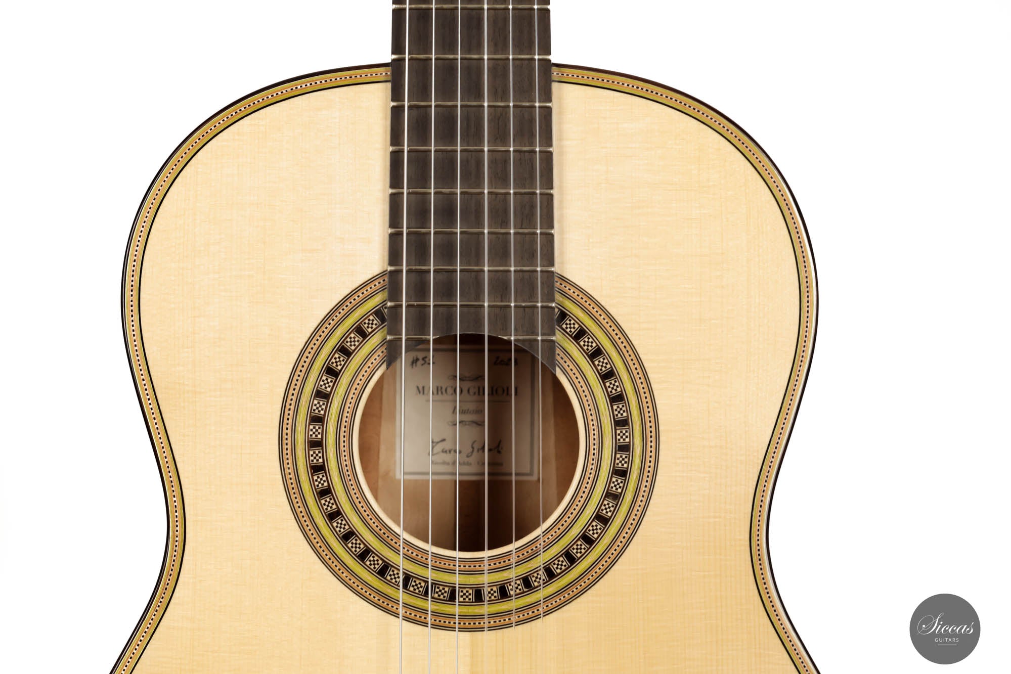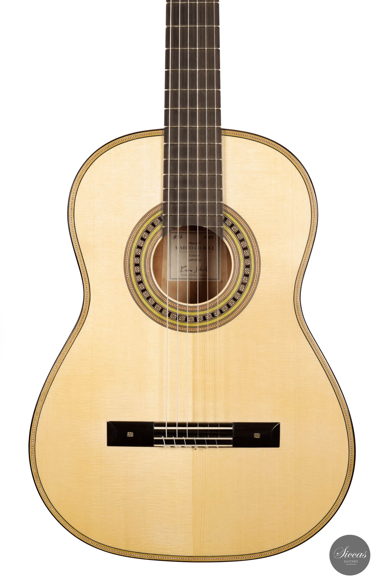 The 2023 Marco Gilioli Guitar no. 51 is a remarkable instrument, a genuine gem in the world of classical guitars. This concert-quality piece exhibits a perfectly harmonized blend of attributes designed to satisfy even the most demanding performance situations. Crafted with the highest level of workmanship, the instrument features a spruce soundboard paired with exquisite birdseye maple for the back and sides. This unique combination not only offers aesthetic beauty but also contributes to its amazing sound quality. This instrument was built after 1867 Antonio de Torres, with exact ornamentations. The construction of this guitar displays Gilioli's commitment to tradition, all the while infusing his distinct touch of modern luthiery. The Guitar No. 51 stands out for its smooth playability, allowing guitarists to express their musicality with ease and finesse. This aspect, combined with the guitar's excellent volume, provides a comprehensive package for both intimate performances and larger venues. One of the standout attributes of the 2023 Marco Gilioli Guitar no. 51 is its primary resonance in F/F#. This unique feature provides the instrument with bass notes that are deep and clear, giving richness to the lower tonal spectrum. In contrast, the trebles are lyrical and colorful, offering a balance that's essential for any concert-level guitar. In conclusion, the 2023 Marco Gilioli Guitar no. 51 is more than just a musical instrument. It's a testament to Gilioli's expertise and dedication, an embodiment of tradition and innovation, and a showcase of fine craftsmanship. Its balanced voicing, superior playability, and distinctive resonance make it an ideal choice for the discerning guitarist.