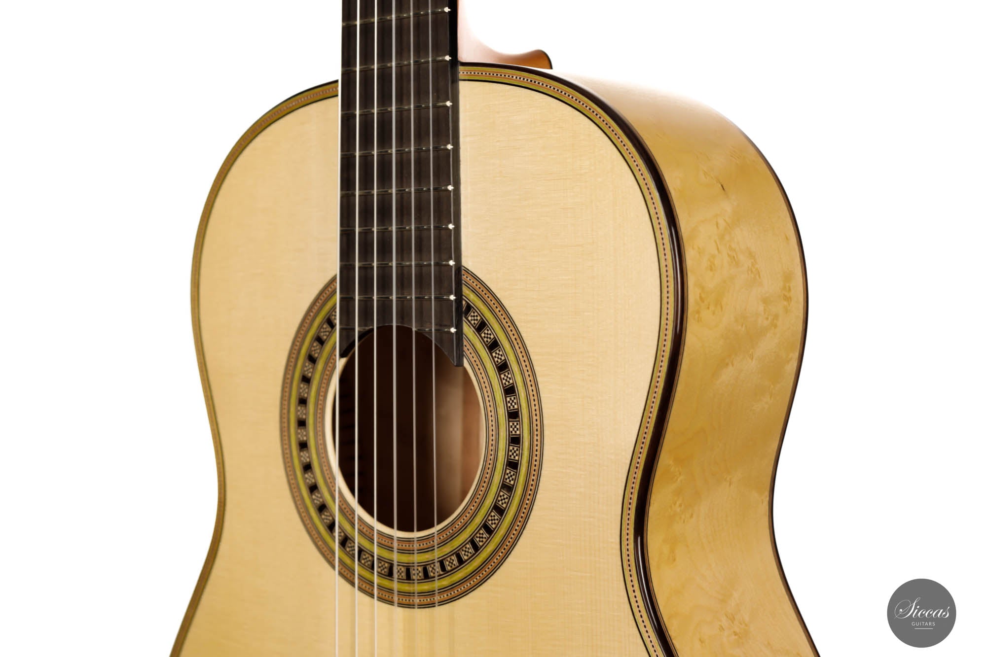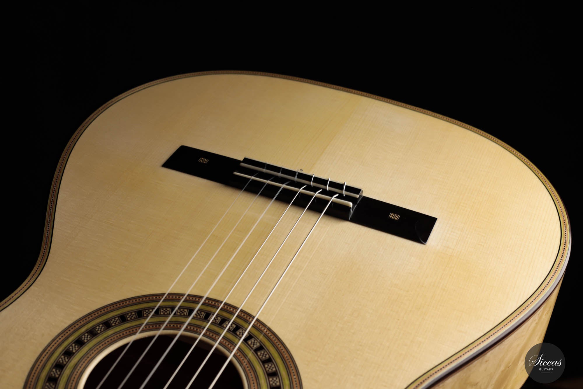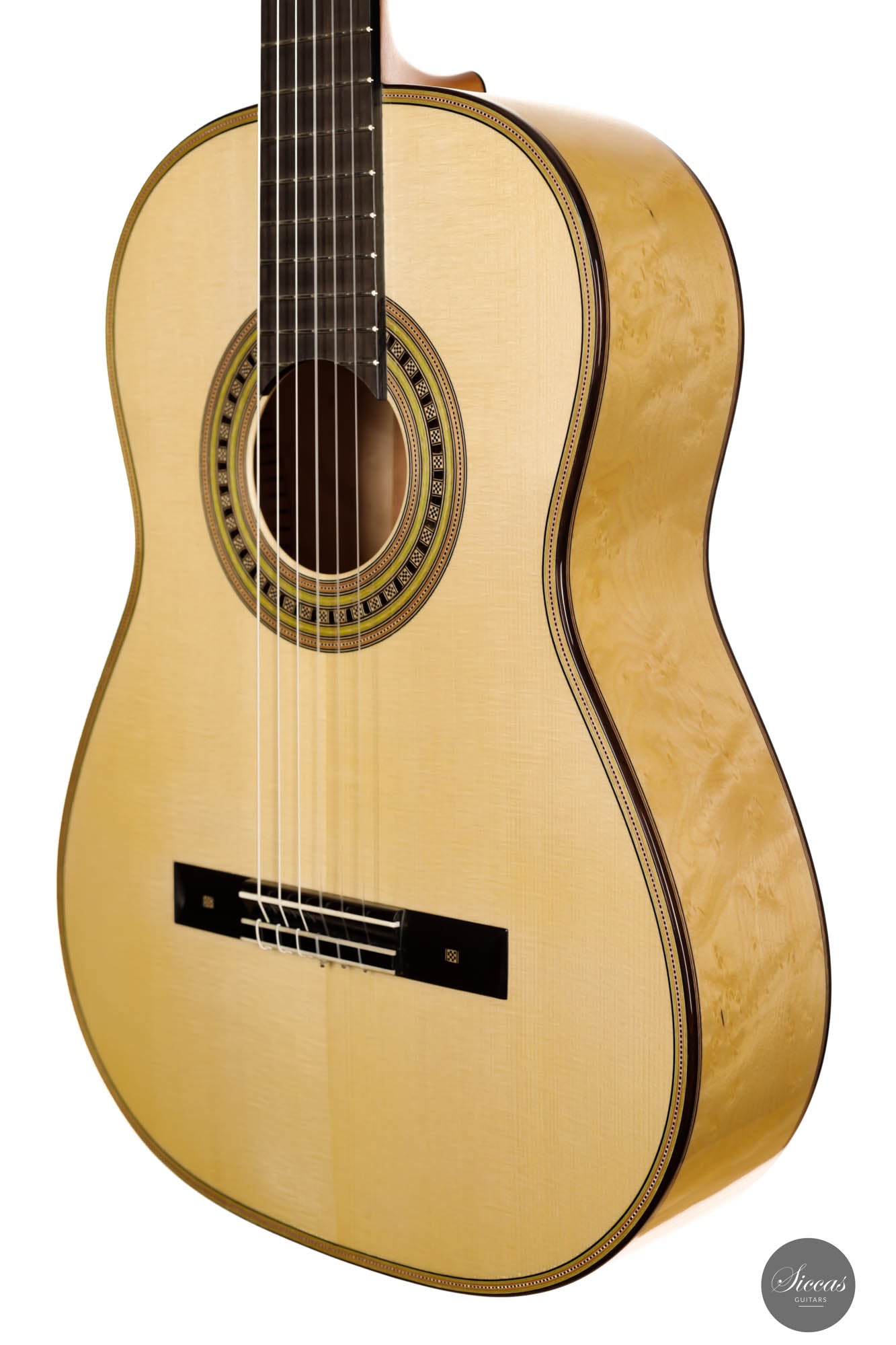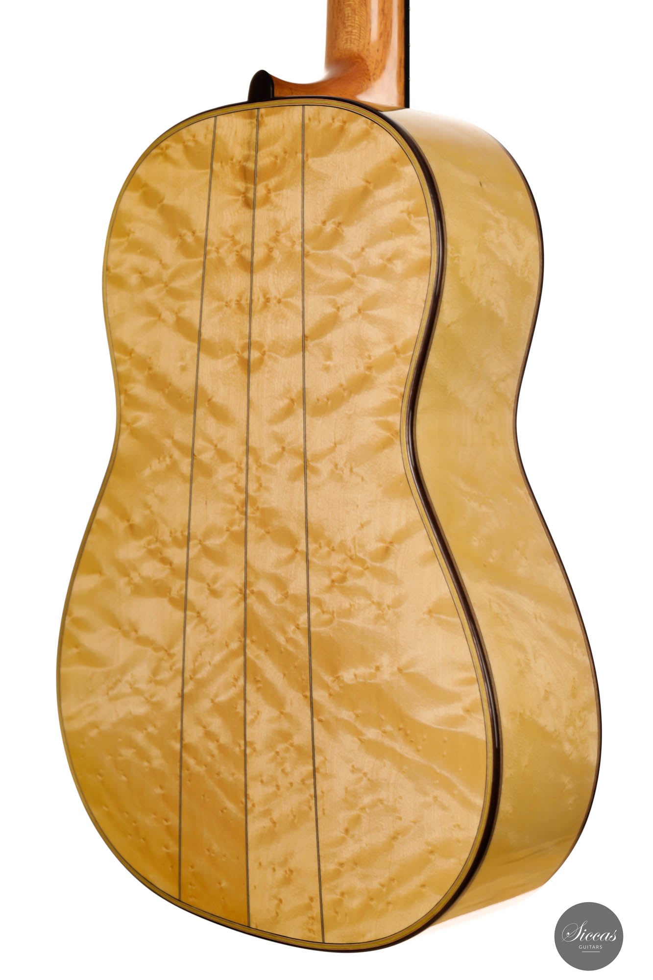 The 2023 Marco Gilioli Guitar no. 51 is a remarkable instrument, a genuine gem in the world of classical guitars. This concert-quality piece exhibits a perfectly harmonized blend of attributes designed to satisfy even the most demanding performance situations. Crafted with the highest level of workmanship, the instrument features a spruce soundboard paired with exquisite birdseye maple for the back and sides. This unique combination not only offers aesthetic beauty but also contributes to its amazing sound quality. This instrument was built after 1867 Antonio de Torres, with exact ornamentations. The construction of this guitar displays Gilioli's commitment to tradition, all the while infusing his distinct touch of modern luthiery. The Guitar No. 51 stands out for its smooth playability, allowing guitarists to express their musicality with ease and finesse. This aspect, combined with the guitar's excellent volume, provides a comprehensive package for both intimate performances and larger venues. One of the standout attributes of the 2023 Marco Gilioli Guitar no. 51 is its primary resonance in F/F#. This unique feature provides the instrument with bass notes that are deep and clear, giving richness to the lower tonal spectrum. In contrast, the trebles are lyrical and colorful, offering a balance that's essential for any concert-level guitar. In conclusion, the 2023 Marco Gilioli Guitar no. 51 is more than just a musical instrument. It's a testament to Gilioli's expertise and dedication, an embodiment of tradition and innovation, and a showcase of fine craftsmanship. Its balanced voicing, superior playability, and distinctive resonance make it an ideal choice for the discerning guitarist.