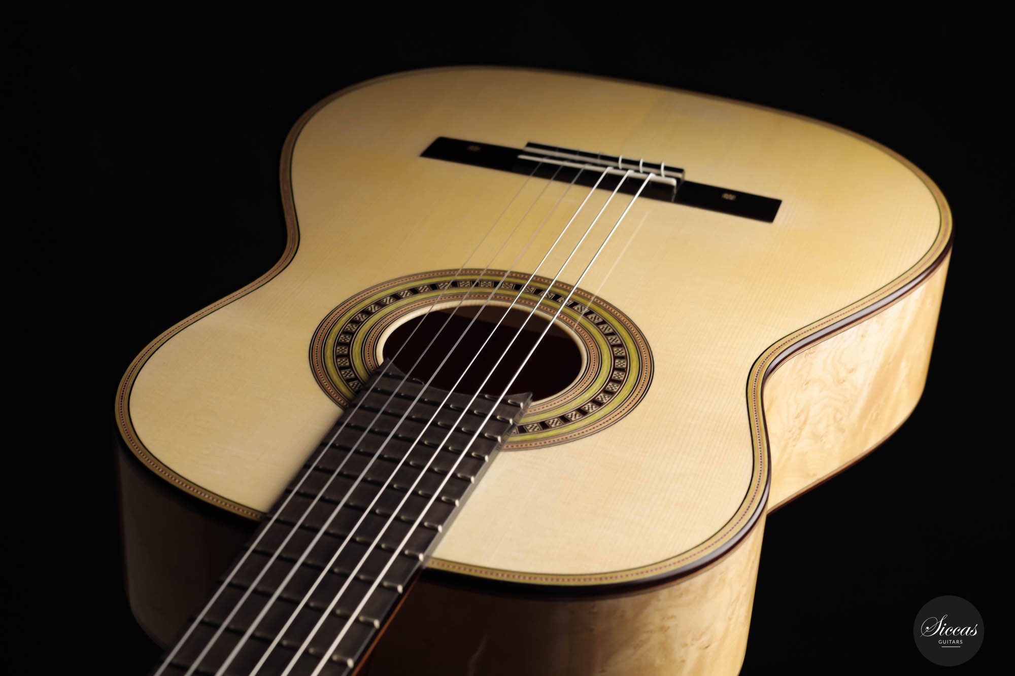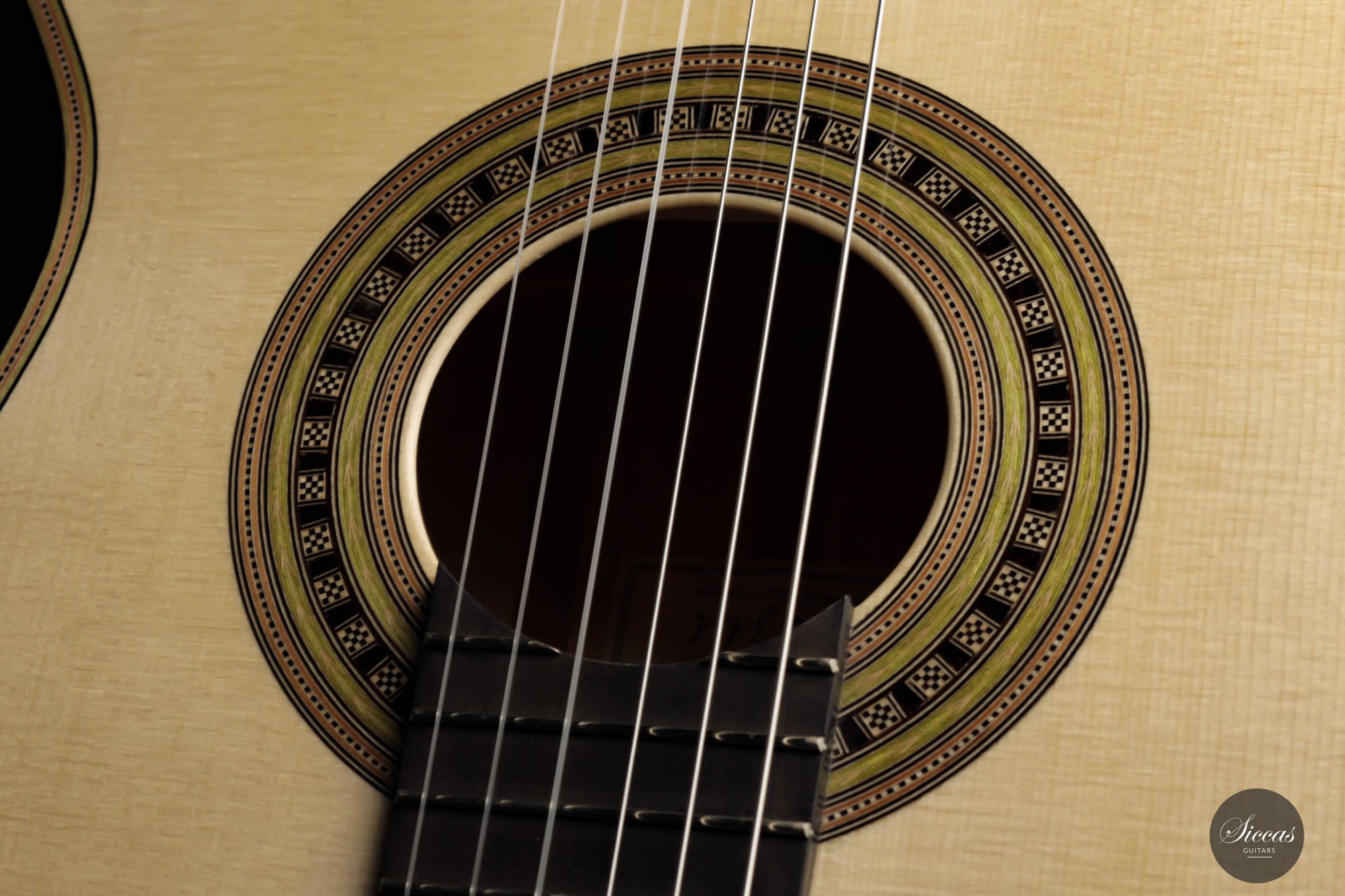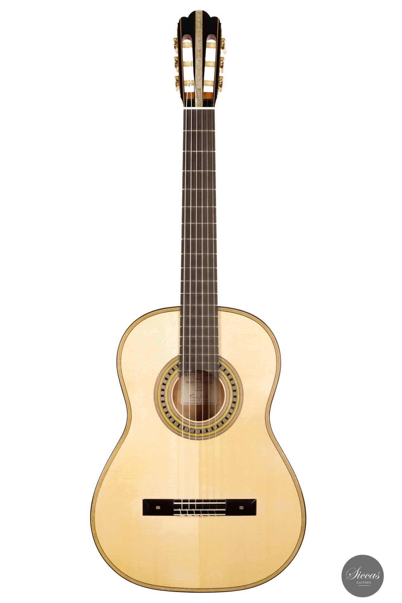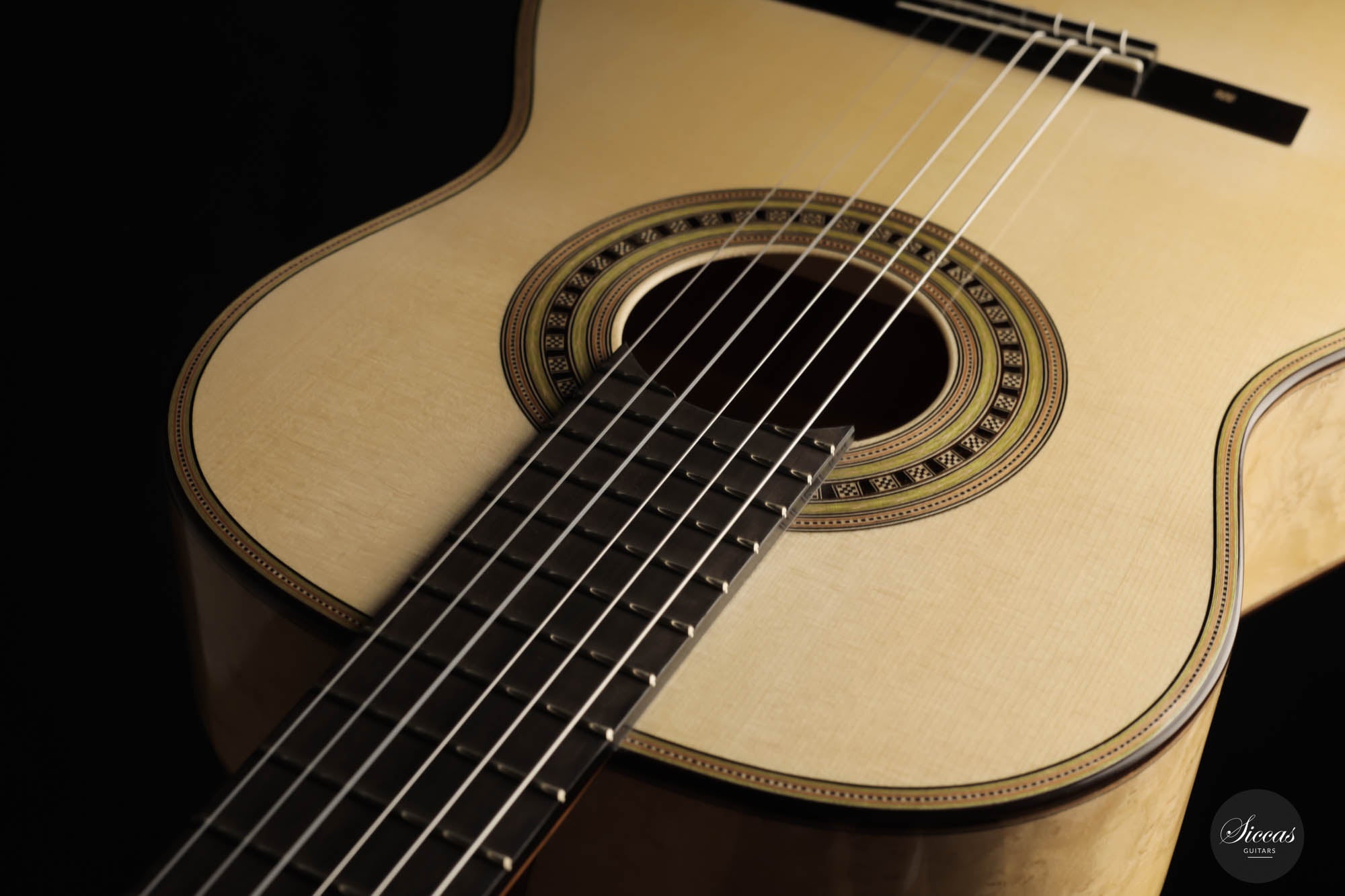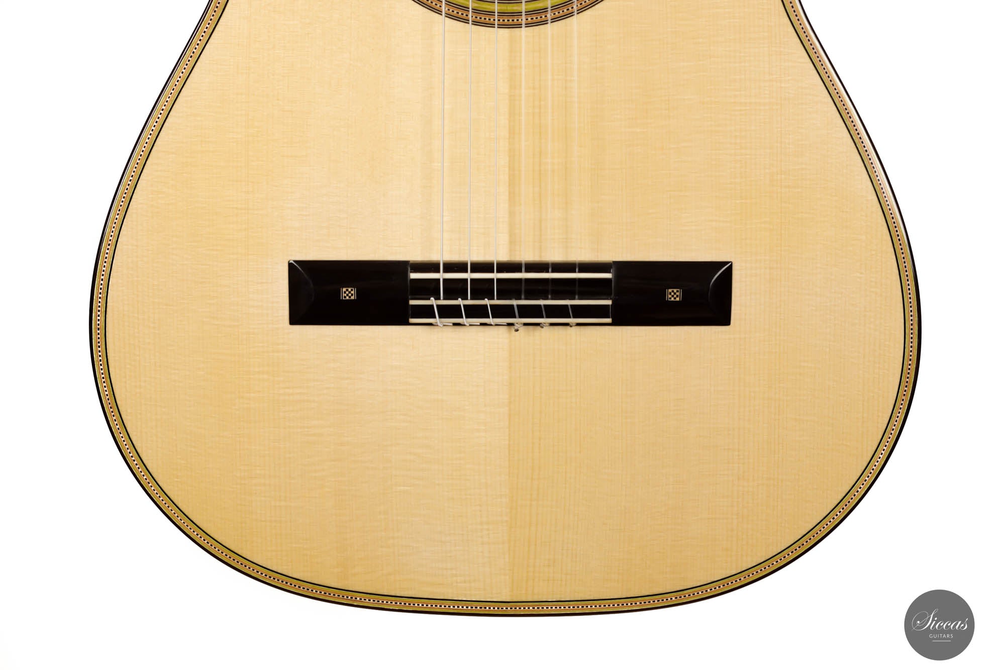 The 2023 Marco Gilioli Guitar no. 51 is a remarkable instrument, a genuine gem in the world of classical guitars. This concert-quality piece exhibits a perfectly harmonized blend of attributes designed to satisfy even the most demanding performance situations. Crafted with the highest level of workmanship, the instrument features a spruce soundboard paired with exquisite birdseye maple for the back and sides. This unique combination not only offers aesthetic beauty but also contributes to its amazing sound quality. This instrument was built after 1867 Antonio de Torres, with exact ornamentations. The construction of this guitar displays Gilioli's commitment to tradition, all the while infusing his distinct touch of modern luthiery. The Guitar No. 51 stands out for its smooth playability, allowing guitarists to express their musicality with ease and finesse. This aspect, combined with the guitar's excellent volume, provides a comprehensive package for both intimate performances and larger venues. One of the standout attributes of the 2023 Marco Gilioli Guitar no. 51 is its primary resonance in F/F#. This unique feature provides the instrument with bass notes that are deep and clear, giving richness to the lower tonal spectrum. In contrast, the trebles are lyrical and colorful, offering a balance that's essential for any concert-level guitar. In conclusion, the 2023 Marco Gilioli Guitar no. 51 is more than just a musical instrument. It's a testament to Gilioli's expertise and dedication, an embodiment of tradition and innovation, and a showcase of fine craftsmanship. Its balanced voicing, superior playability, and distinctive resonance make it an ideal choice for the discerning guitarist.
