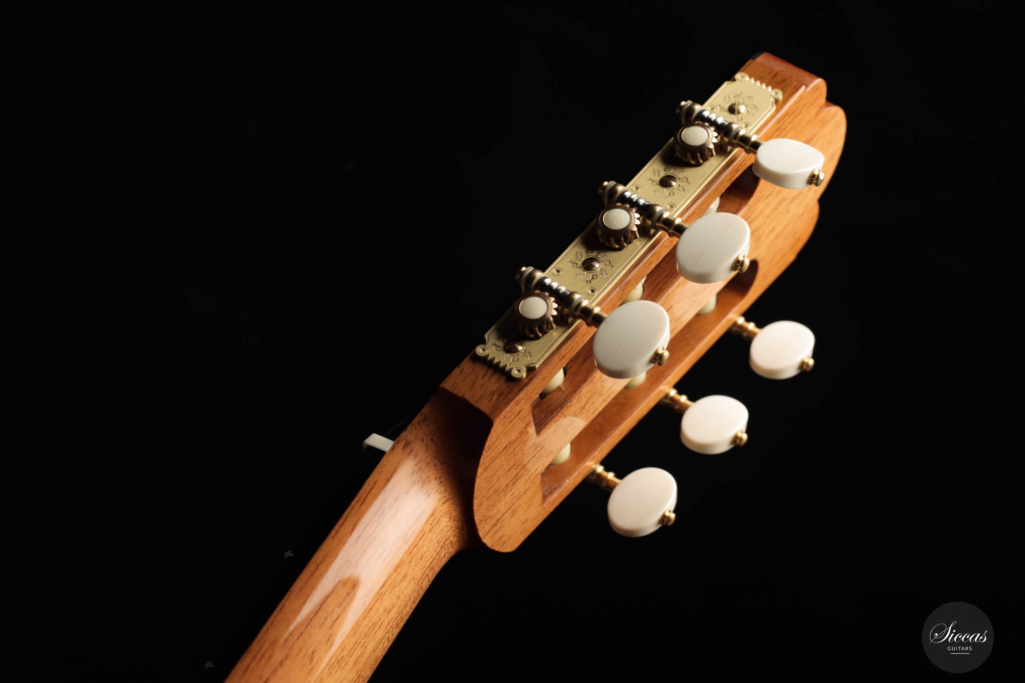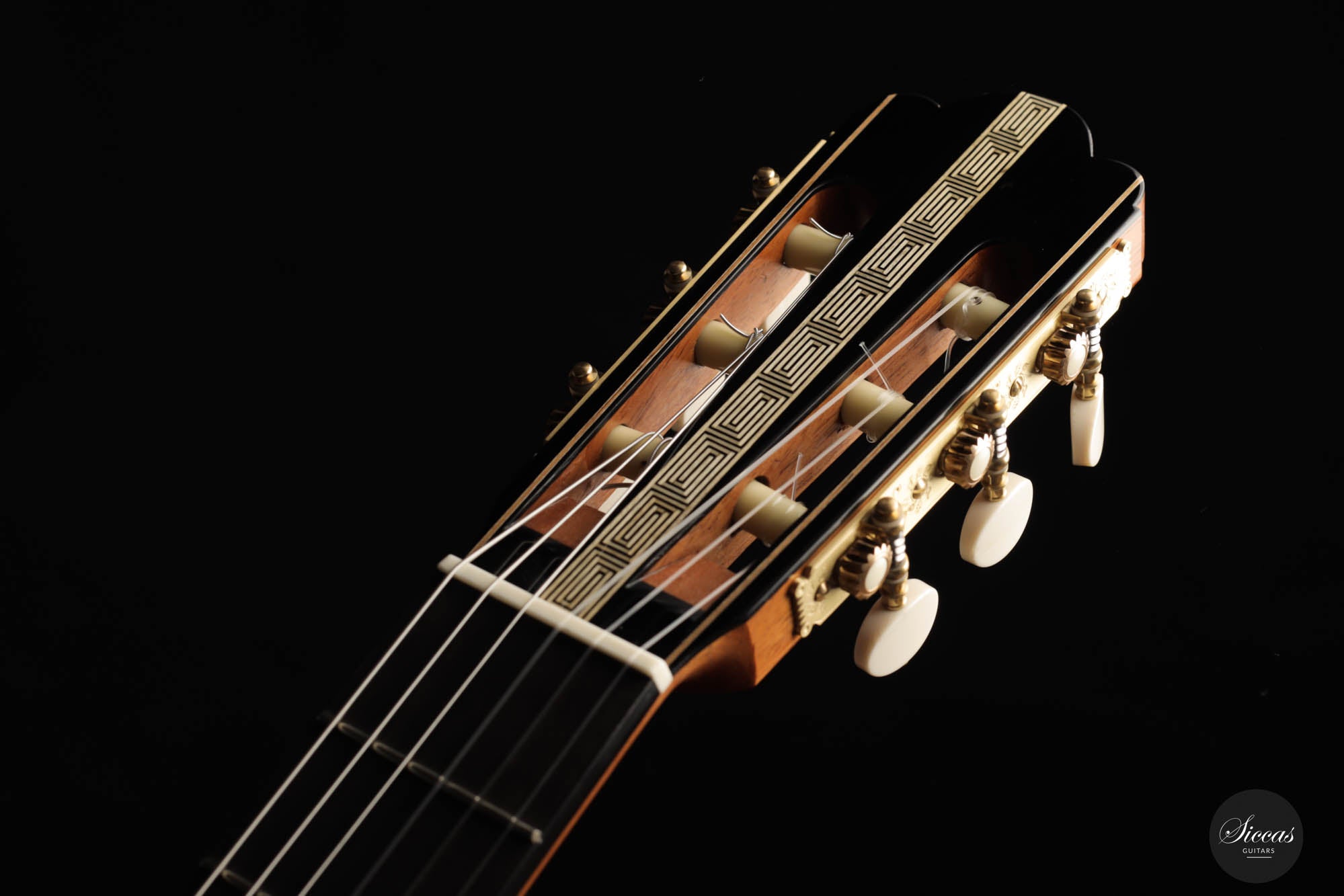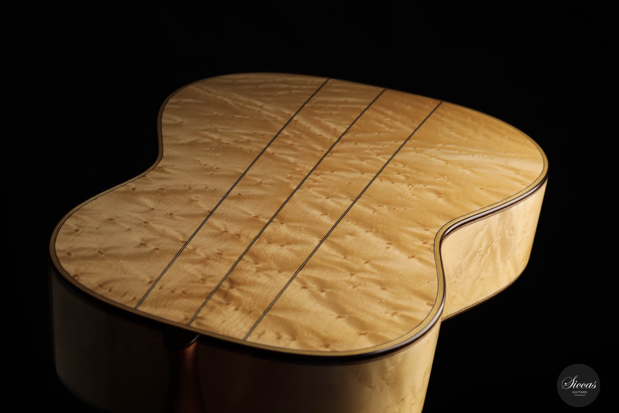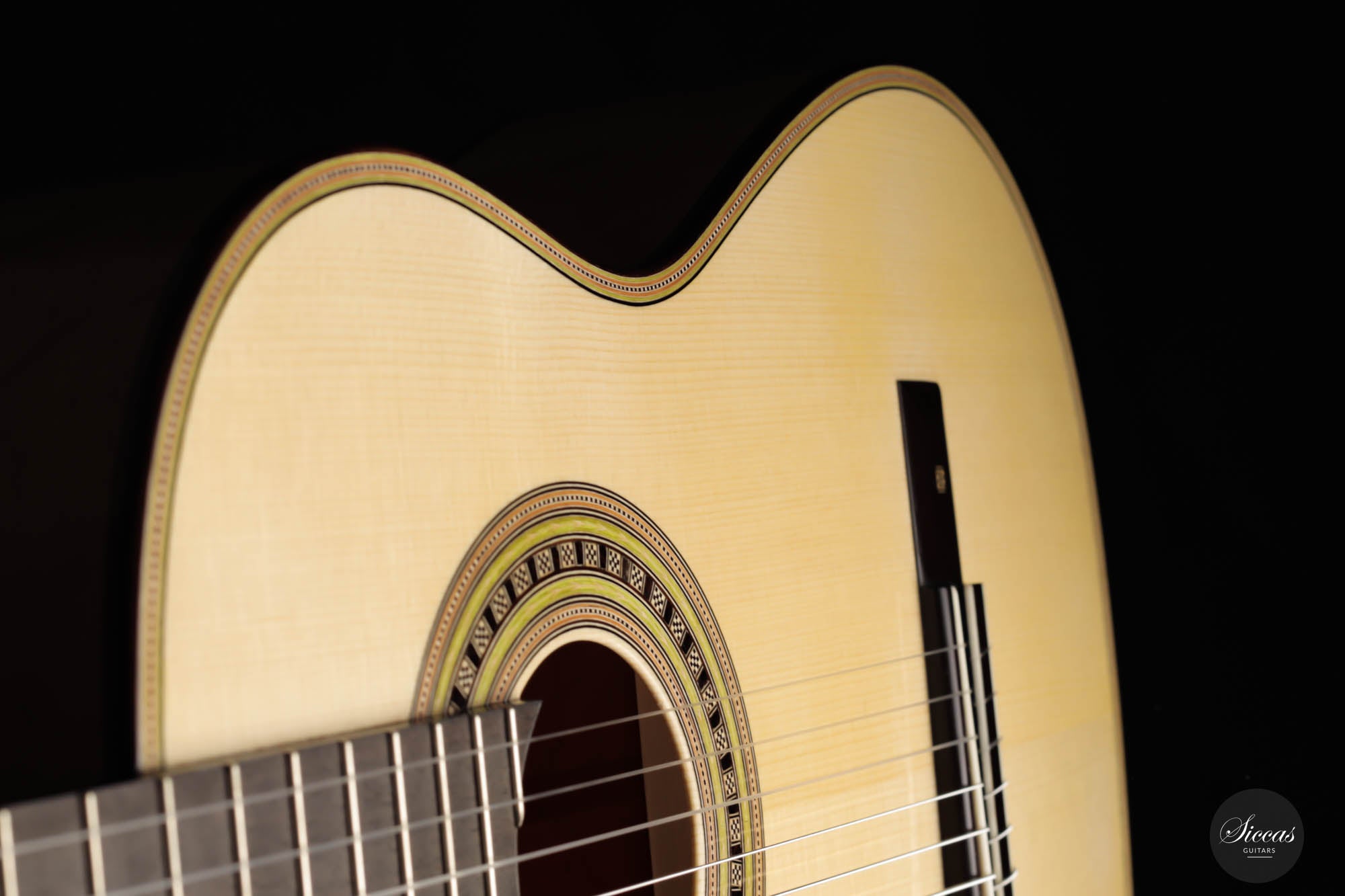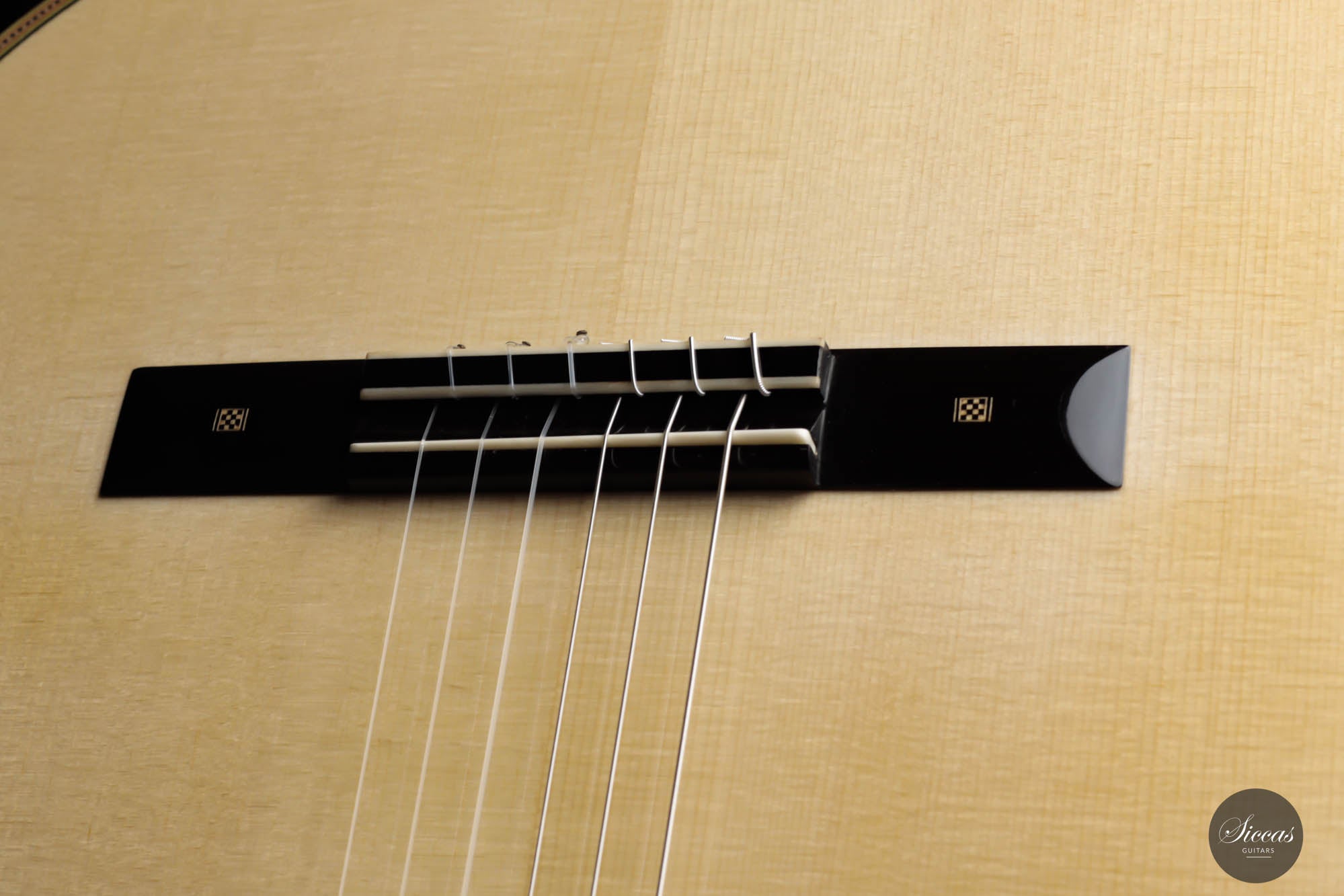 The 2023 Marco Gilioli Guitar no. 51 is a remarkable instrument, a genuine gem in the world of classical guitars. This concert-quality piece exhibits a perfectly harmonized blend of attributes designed to satisfy even the most demanding performance situations. Crafted with the highest level of workmanship, the instrument features a spruce soundboard paired with exquisite birdseye maple for the back and sides. This unique combination not only offers aesthetic beauty but also contributes to its amazing sound quality. This instrument was built after 1867 Antonio de Torres, with exact ornamentations. The construction of this guitar displays Gilioli's commitment to tradition, all the while infusing his distinct touch of modern luthiery. The Guitar No. 51 stands out for its smooth playability, allowing guitarists to express their musicality with ease and finesse. This aspect, combined with the guitar's excellent volume, provides a comprehensive package for both intimate performances and larger venues. One of the standout attributes of the 2023 Marco Gilioli Guitar no. 51 is its primary resonance in F/F#. This unique feature provides the instrument with bass notes that are deep and clear, giving richness to the lower tonal spectrum. In contrast, the trebles are lyrical and colorful, offering a balance that's essential for any concert-level guitar. In conclusion, the 2023 Marco Gilioli Guitar no. 51 is more than just a musical instrument. It's a testament to Gilioli's expertise and dedication, an embodiment of tradition and innovation, and a showcase of fine craftsmanship. Its balanced voicing, superior playability, and distinctive resonance make it an ideal choice for the discerning guitarist.