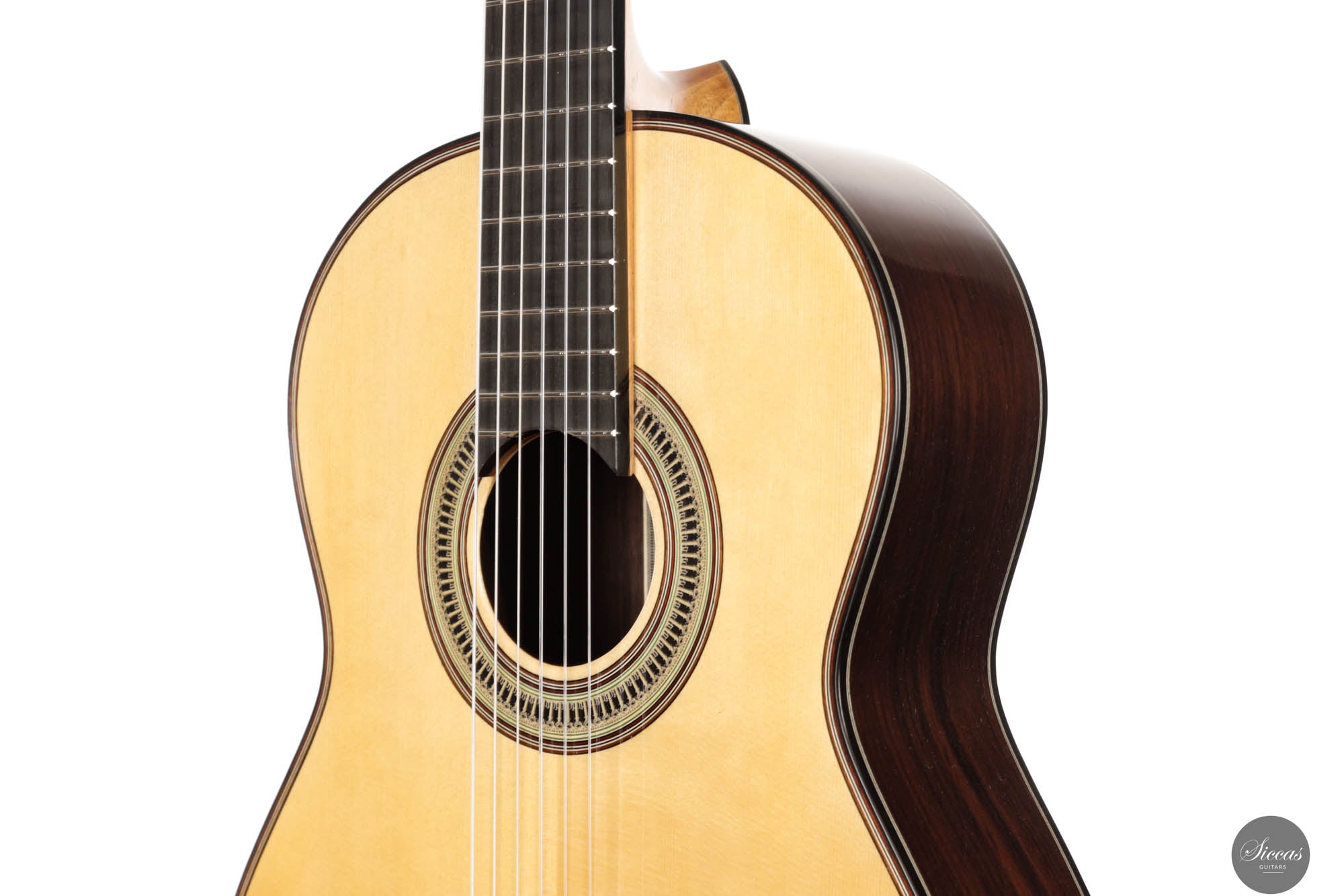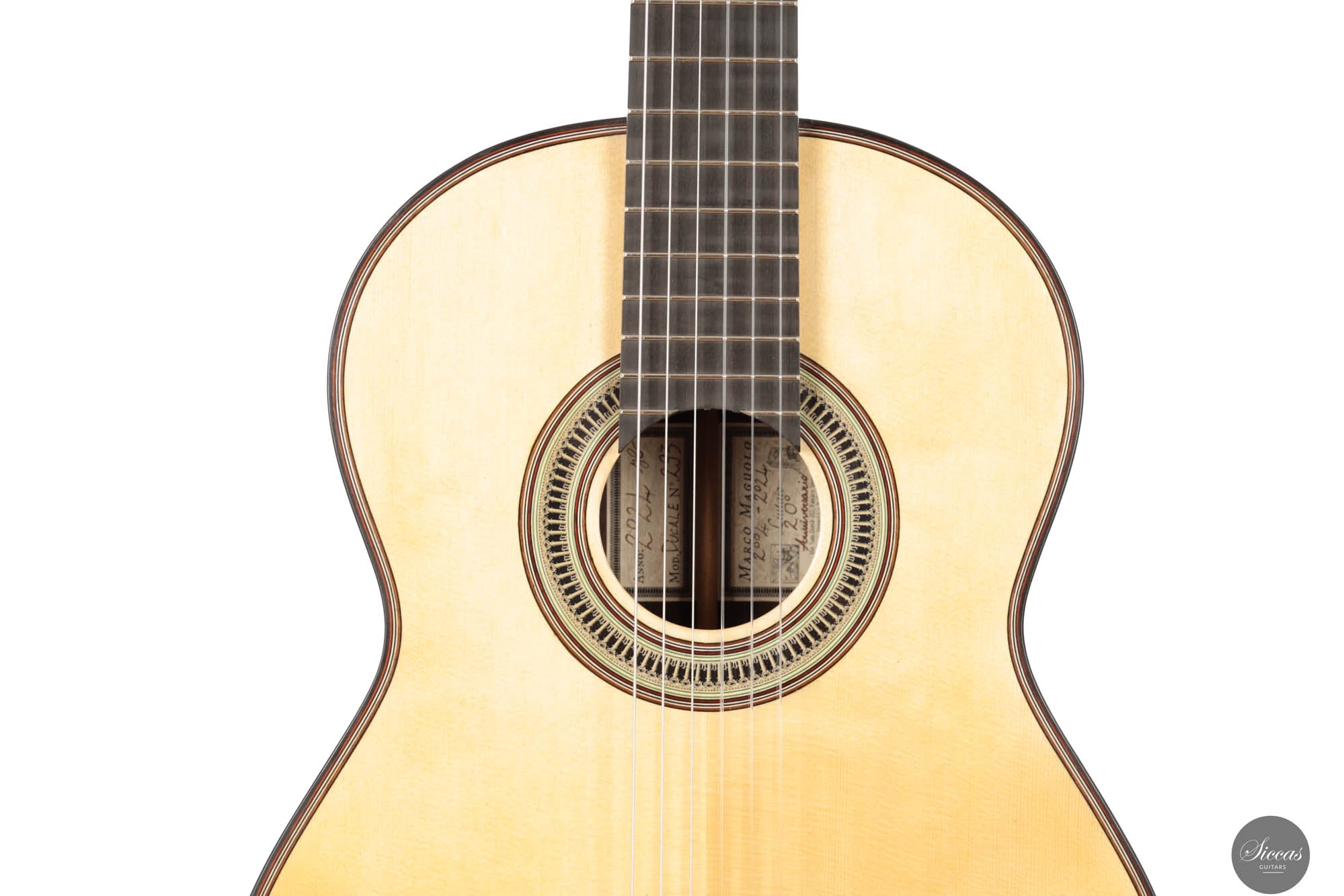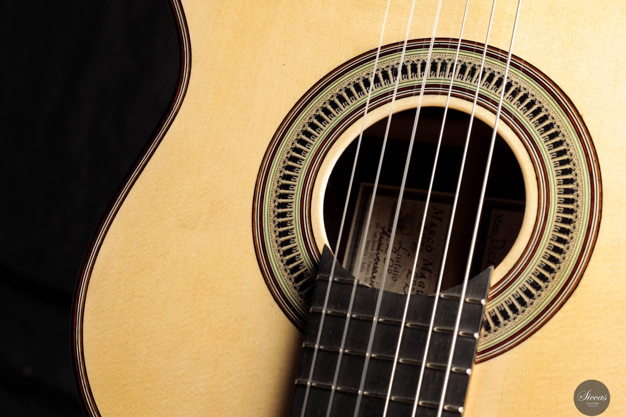 Marco Maguolo was born in Mestre (Venice, Italy) in 1976. After attending technical schools, his passion for the guitar took over, and he started building his first guitar under the guidance of Maestro M. Novelli. Starting from the autumn of 2003, he devoted himself entirely to making classical guitars. On top of his classical guitar-making skills, Marco Maguolo attended a bow service and repair course at the Civica Scuola di Liuteria di Milano held by Maestro Pietro Cavalazzi, and a violin-making course at the Scuola di Liuteria di Pieve di Cento in Bologna under the guidance of Maestro Marcello Bellei. Since 2004, Marco Maguolo’s waiting list kept growing quickly, and his guitars, played in concerts worldwide, gained broad recognition for their tone qualities and projection.