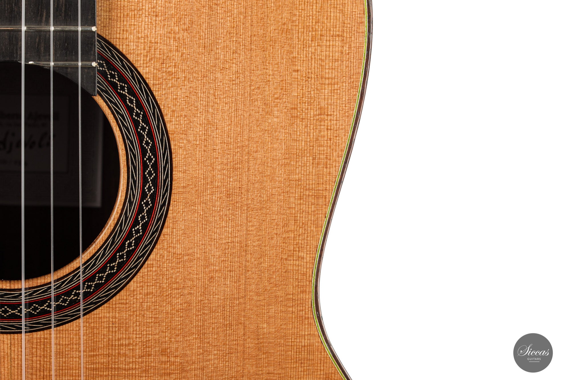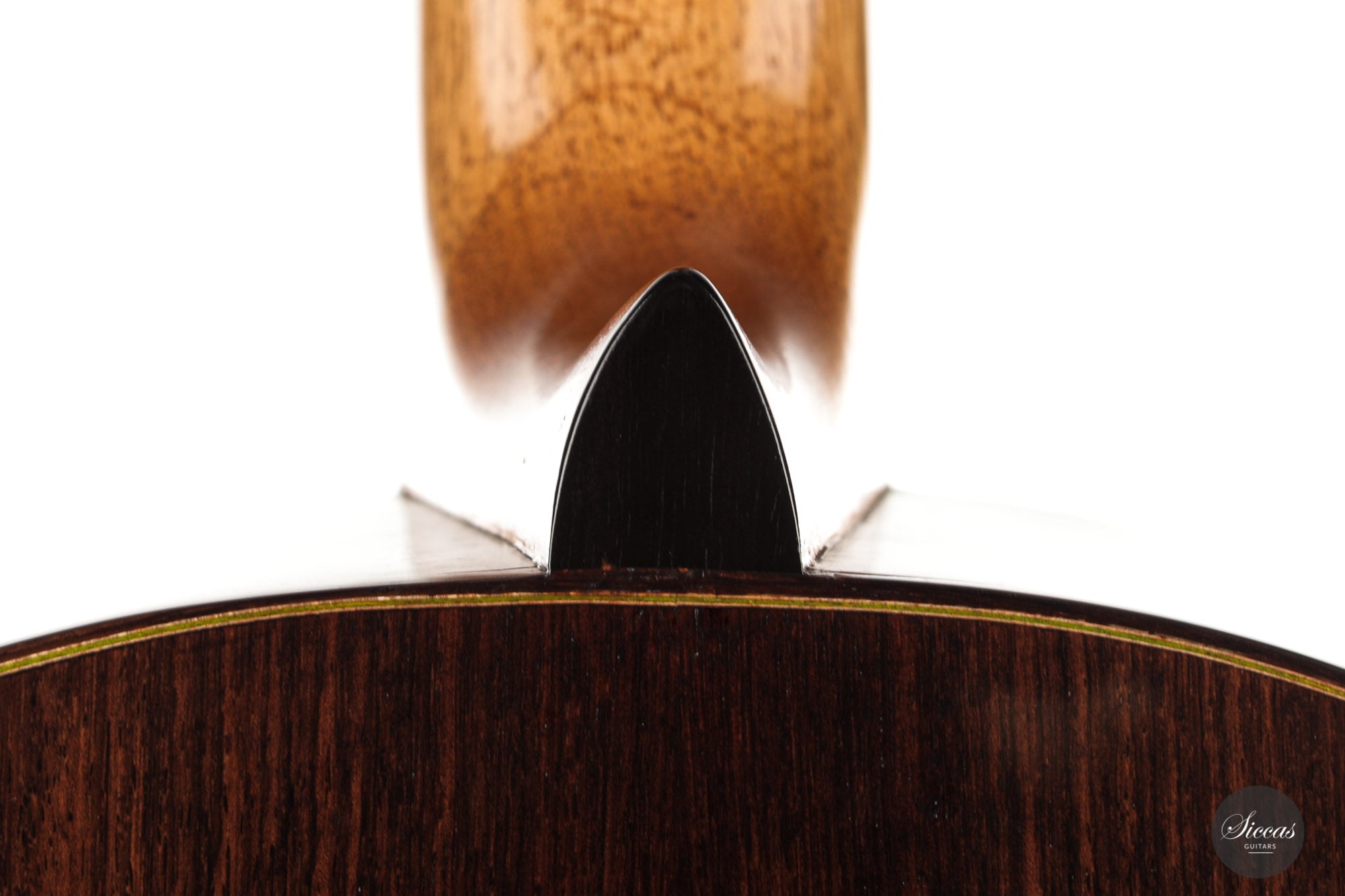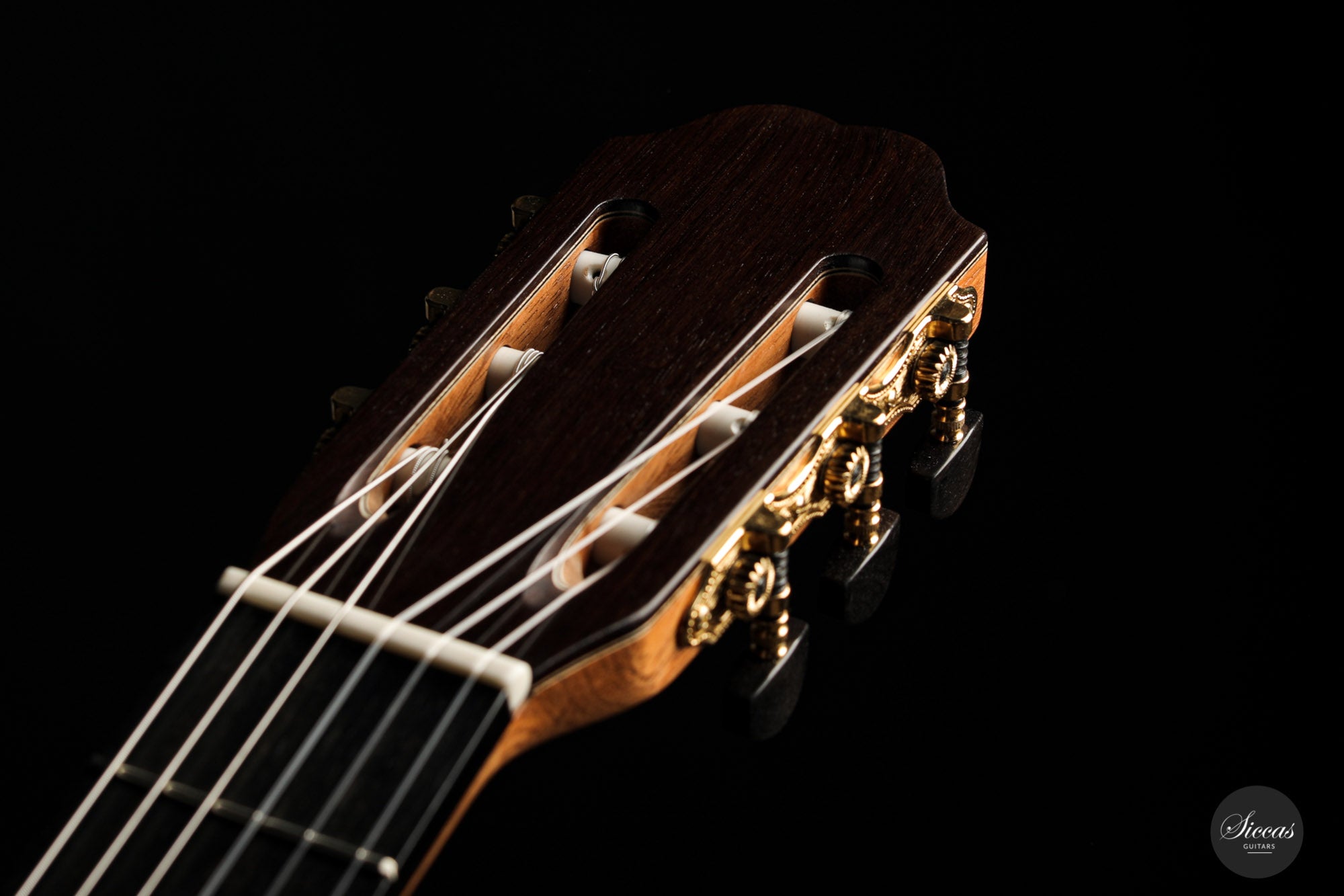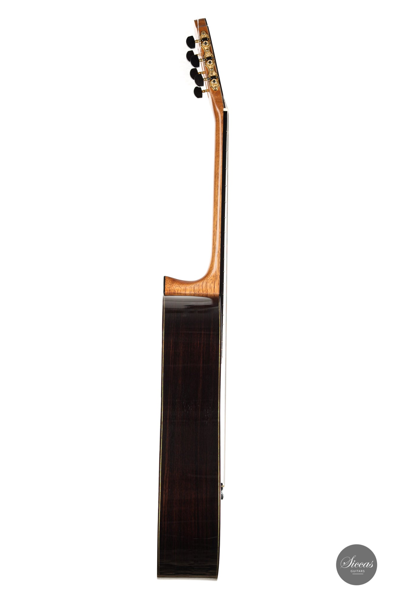 This exquisite guitar, built in 2021 and bearing the number 134, features the combination of woods that characterize many great concert guitars: a cedar top and Indian rosewood back and sides. This pairing has proven itself over the last fifty years and once again offers a truly outstanding result. The sound is very full and rich, with a long sustain and a warm, well-rounded tone. There is an immediate pleasure in playing, and the possibilities of timbre and dynamics are particularly delightful. Overall, a truly wonderful instrument, built in the style of Robert Bouchet.