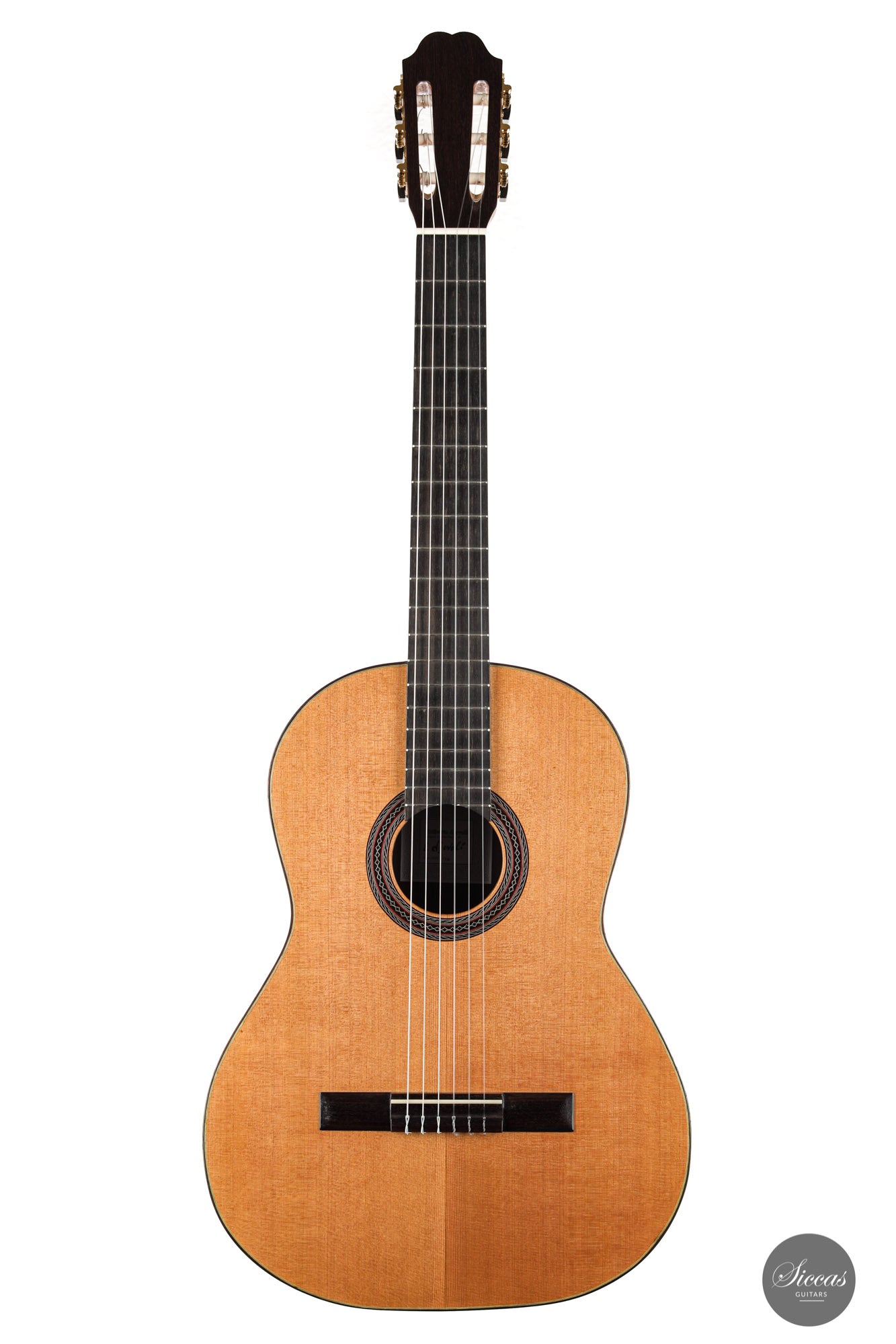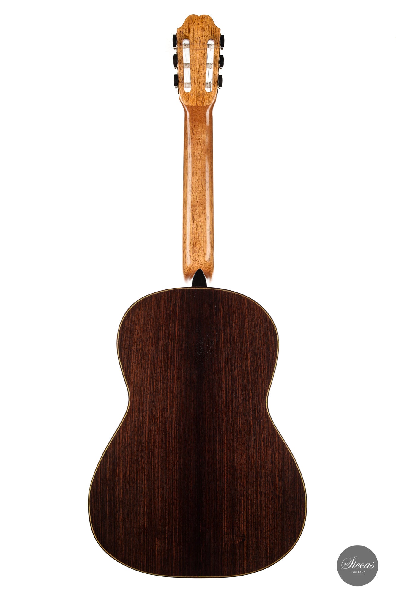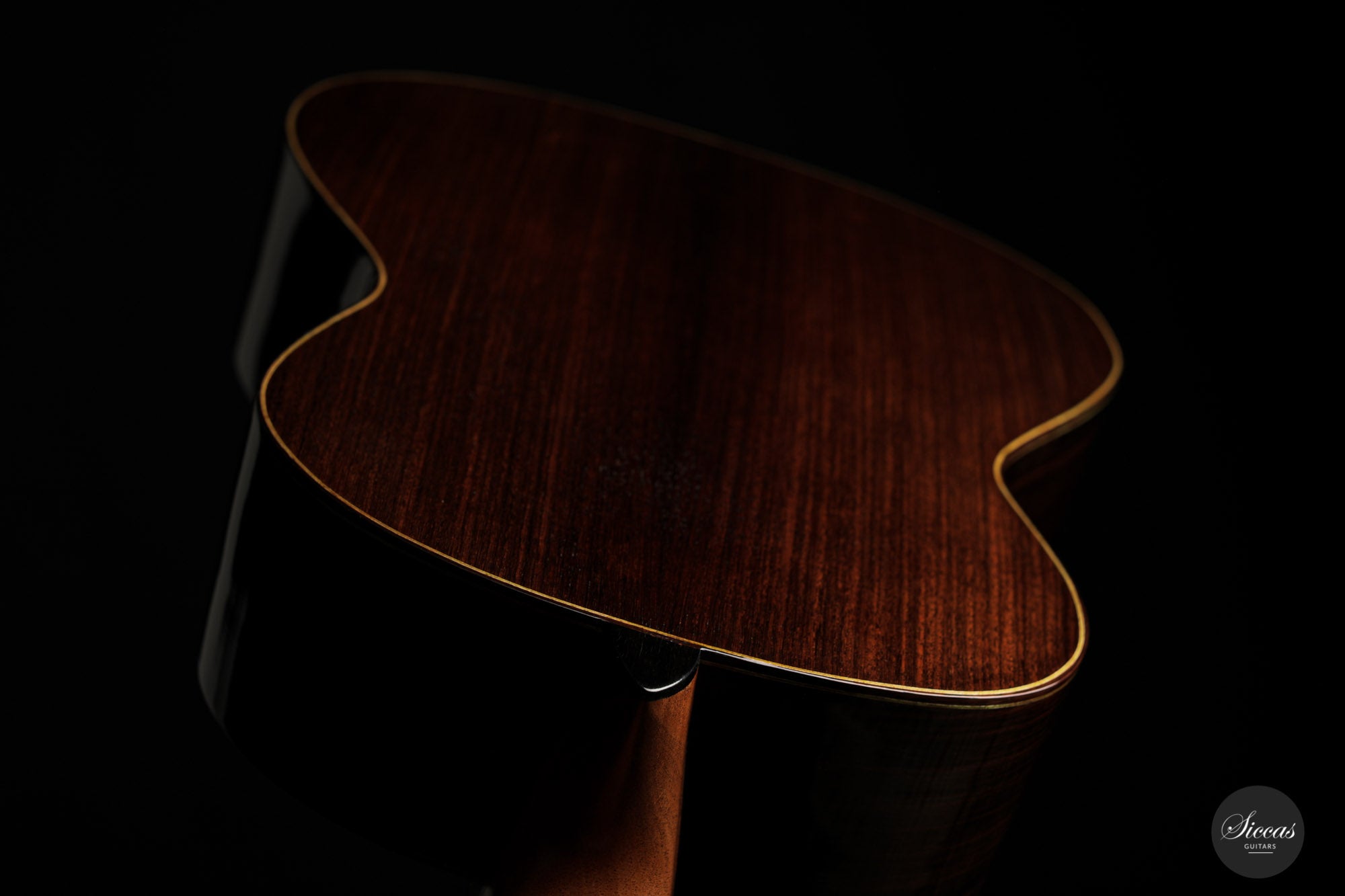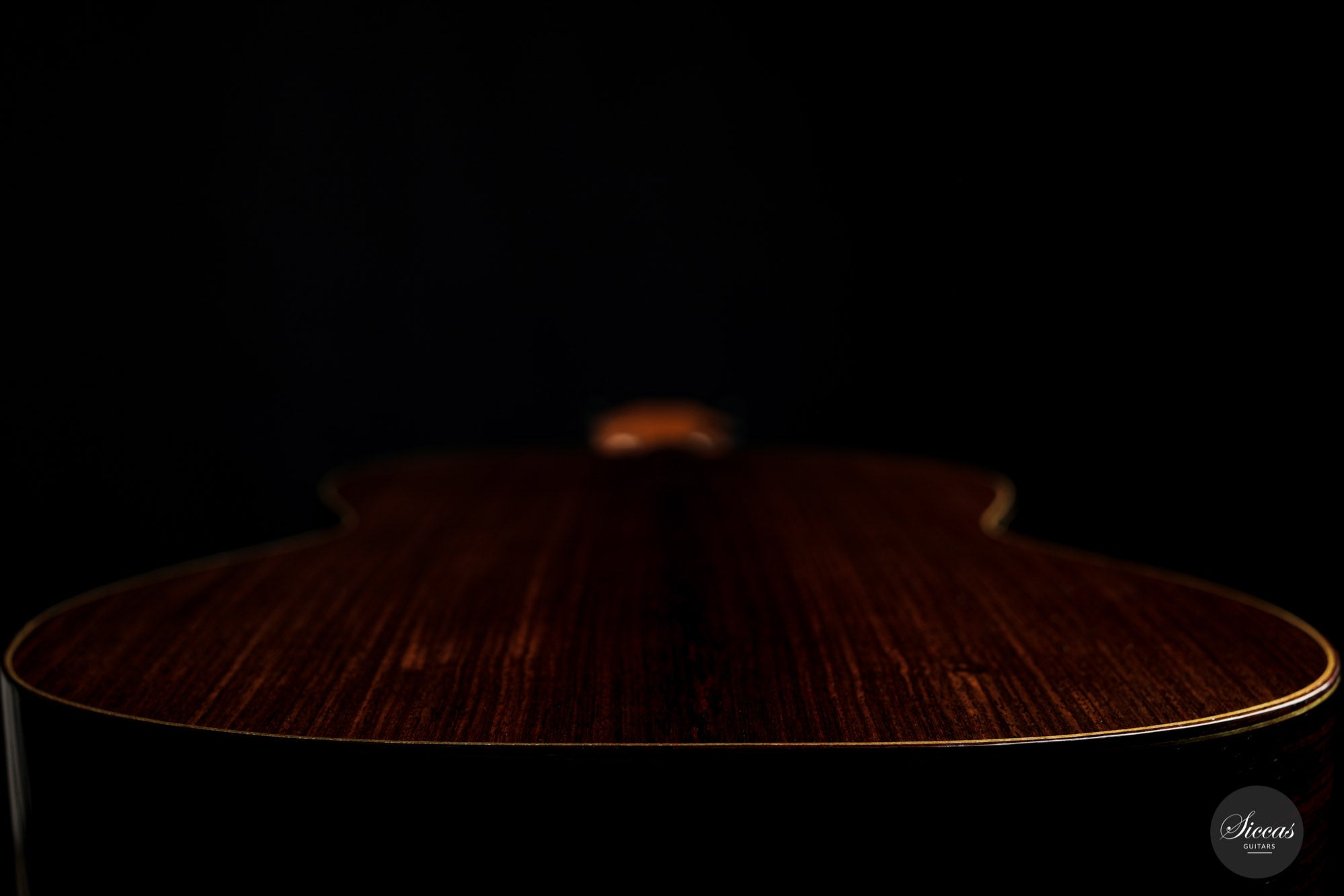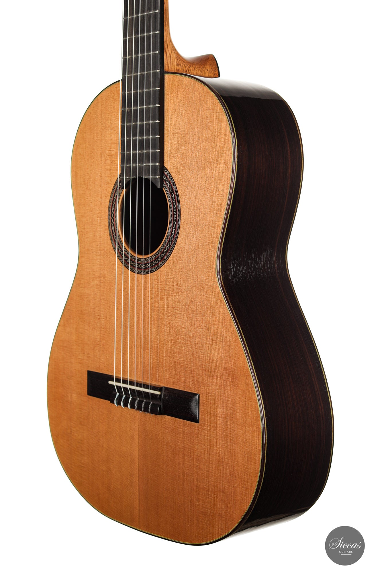 This exquisite guitar, built in 2021 and bearing the number 134, features the combination of woods that characterize many great concert guitars: a cedar top and Indian rosewood back and sides. This pairing has proven itself over the last fifty years and once again offers a truly outstanding result. The sound is very full and rich, with a long sustain and a warm, well-rounded tone. There is an immediate pleasure in playing, and the possibilities of timbre and dynamics are particularly delightful. Overall, a truly wonderful instrument, built in the style of Robert Bouchet.