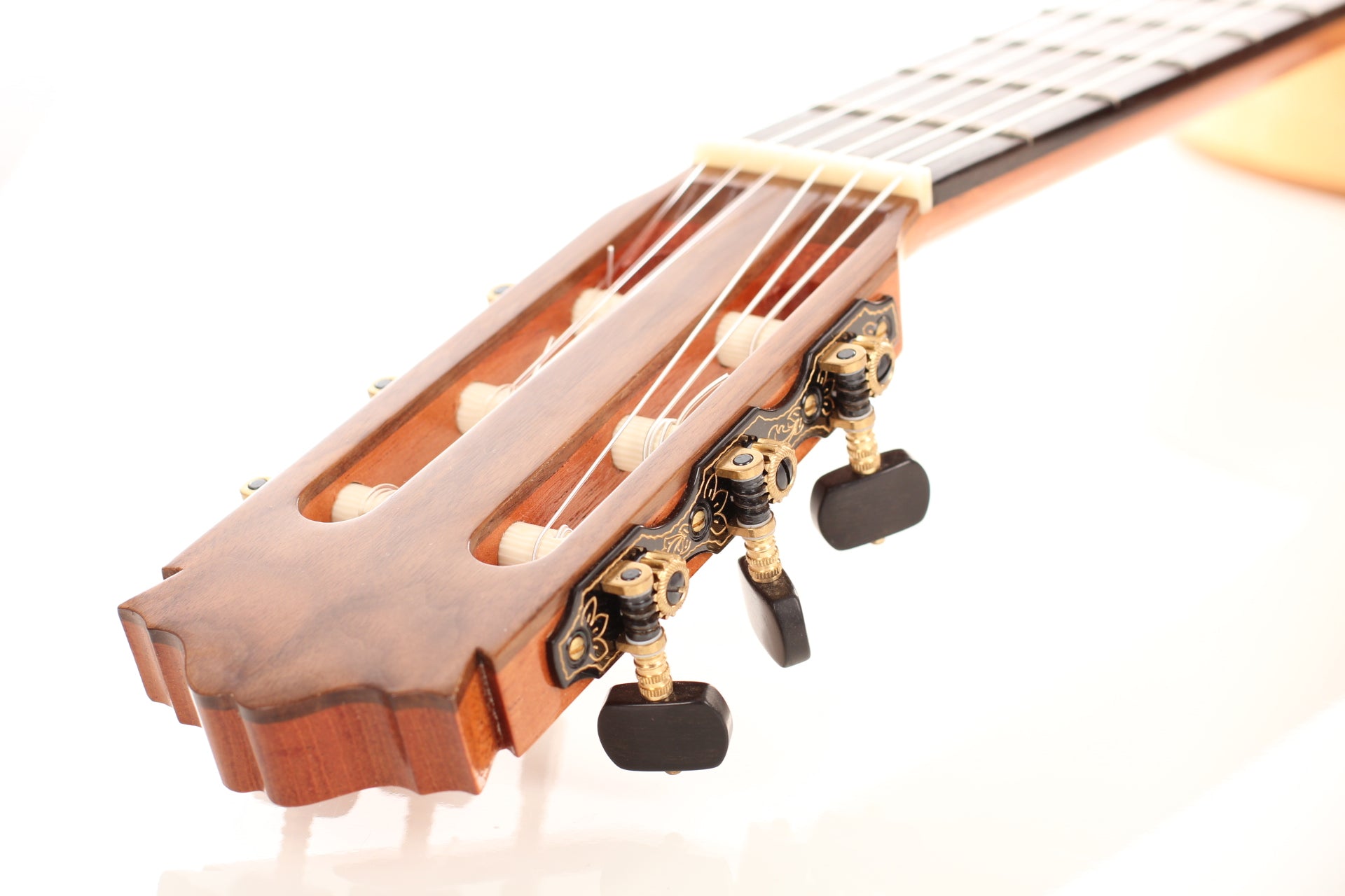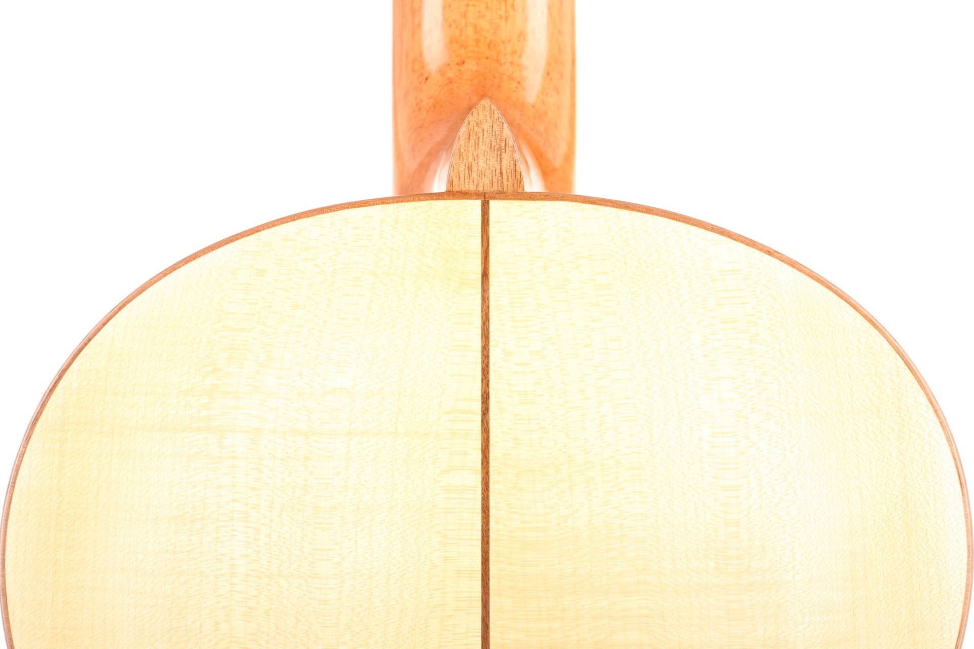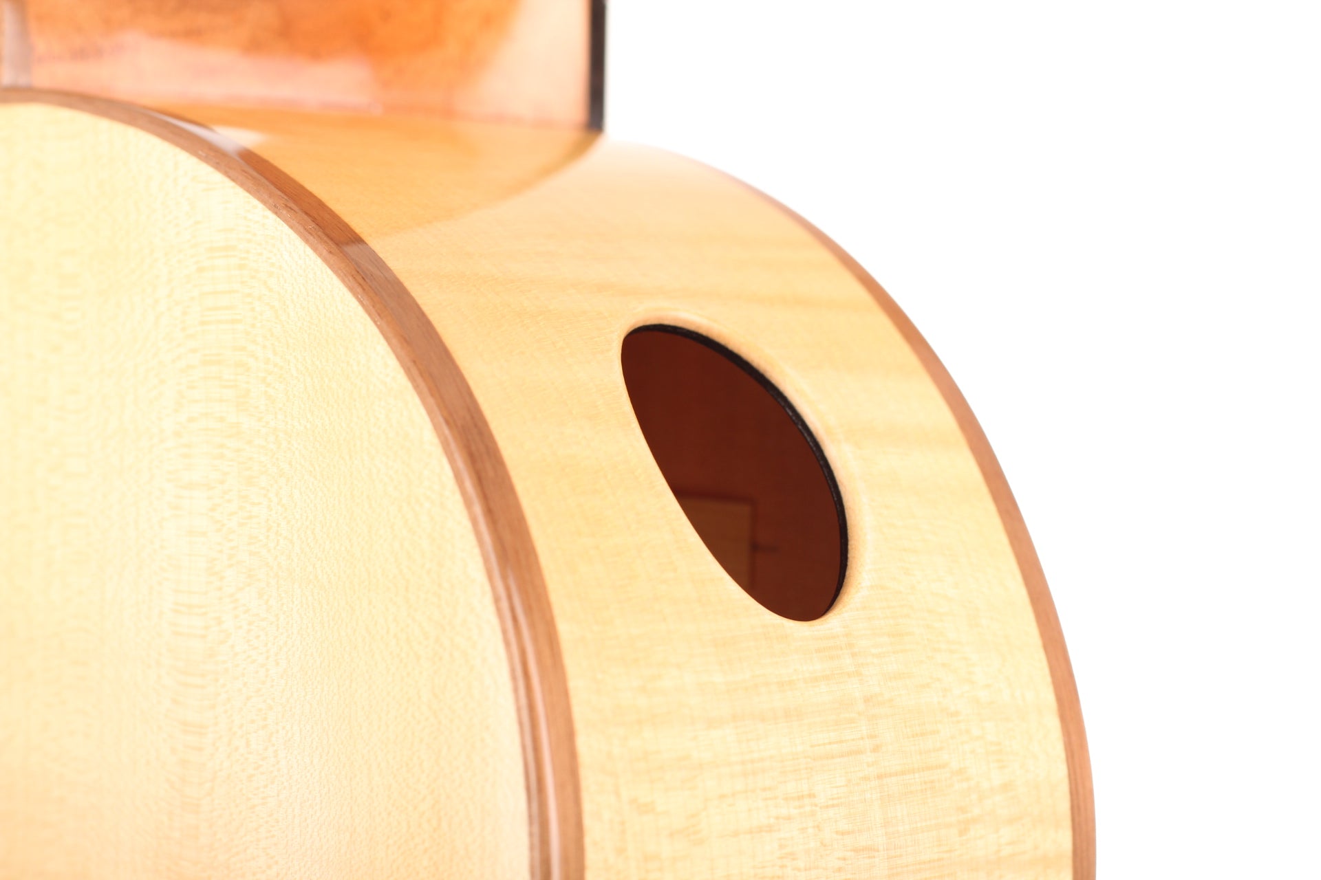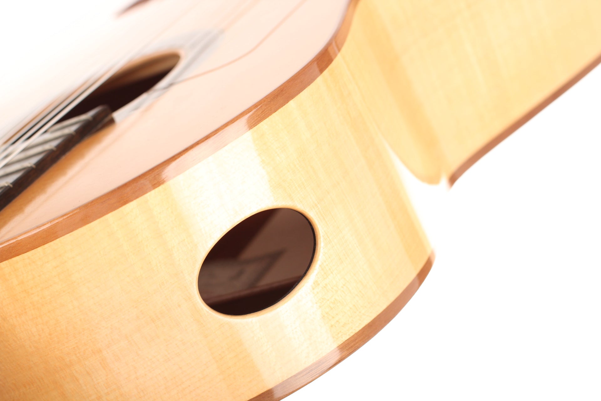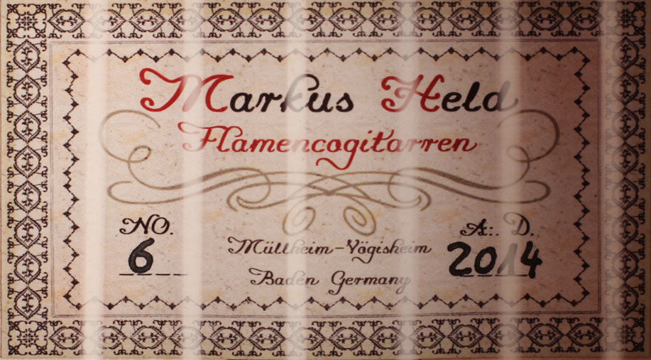 Markus Held was born in 1973 in Heidenheim, Germany. At the age of seven he started to play classical guitar. Since ten years he builds traditional Spanish classical and flamenco guitars. Today he lives in the south of Germany (Müllheim-Vögisheim) where he has also his workshop. His guitars have a very powerful sound, strong basses and the voices have a very good separation. The top of this guitar is made of spruce, back and sides are made of Maple. A special feature is the soundport in the upper bout sides near the heel that increases the air flow through the body which lets the soundboard move more freely. These hole not only increase the presence of the sound for the player but also add to the volume, clarity, openness and depth for the listener. All French-polished. A hardshell case is included.