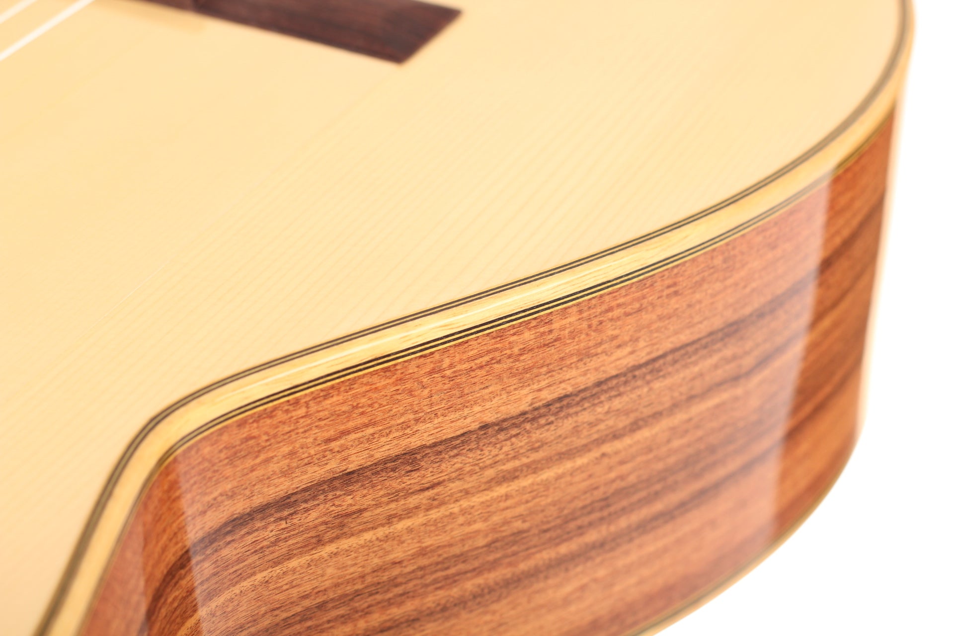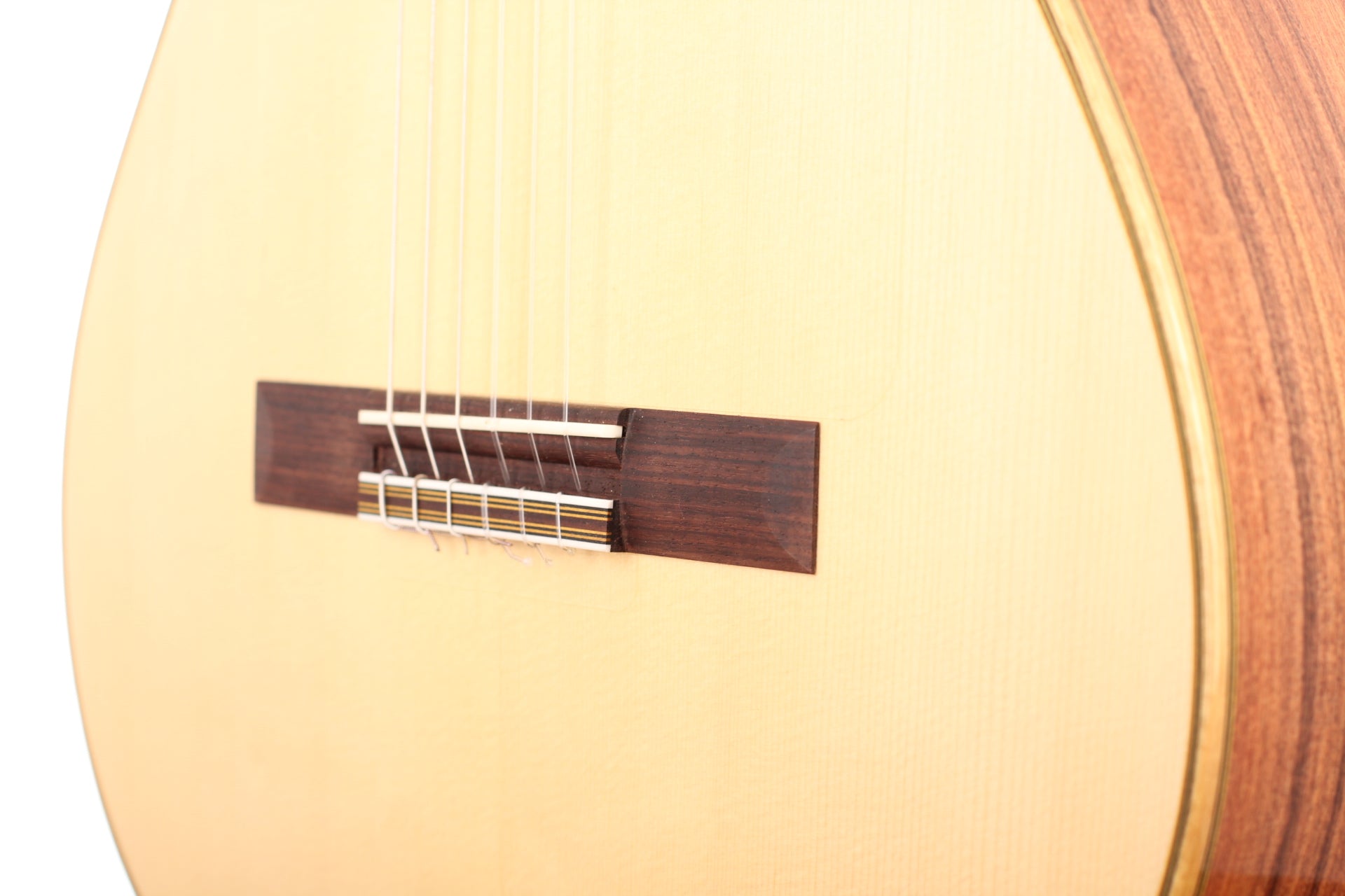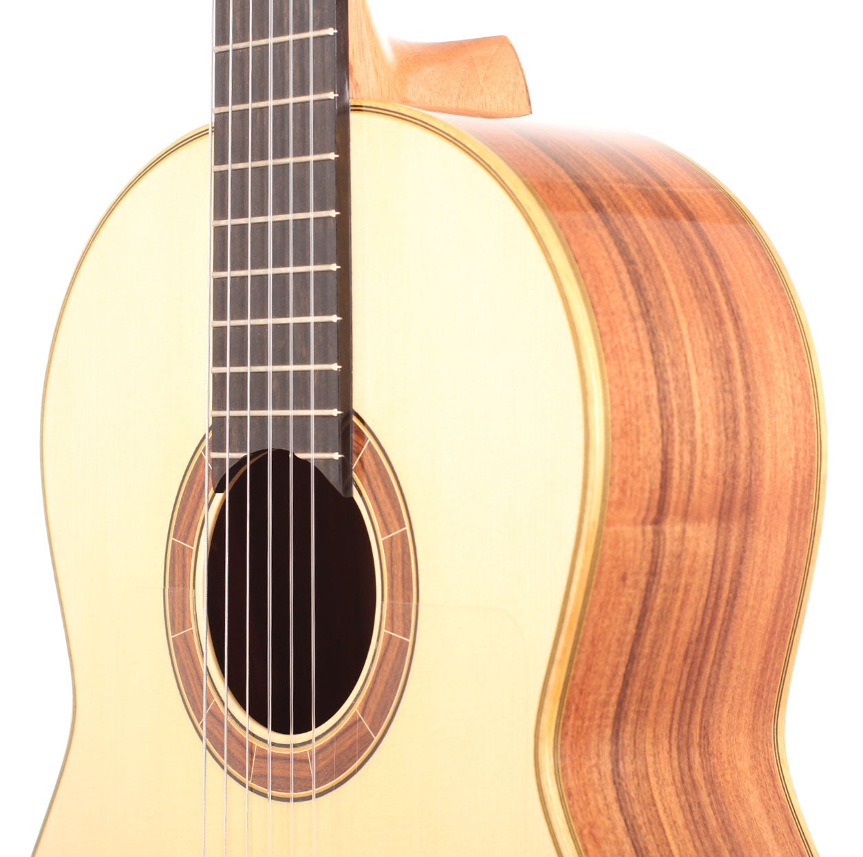 Markus Held was born in 1973 in Heidenheim, Germany. At the age of seven he started to play classical guitar. Since ten years he builds traditional Spanish classical and flamenco guitars. Today he lives in the south of Germany (Müllheim-Vögisheim) where he has also his workshop. His guitars have a very powerful sound, strong basses and the voices have a very good separation. The top of this guitar is made of spruce, back and sides are made of Pao Ferro. A special feature is the soundport in the upper bout sides near the heel that increases the air flow through the body which lets the soundboard move more freely. These hole not only increase the presence of the sound for the player but also add to the volume, clarity, openness and depth for the listener. All French-polished. A hardshell case is included.