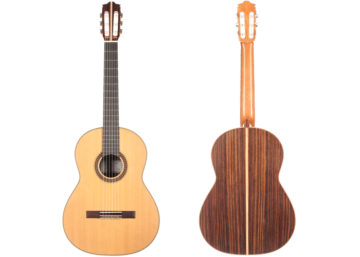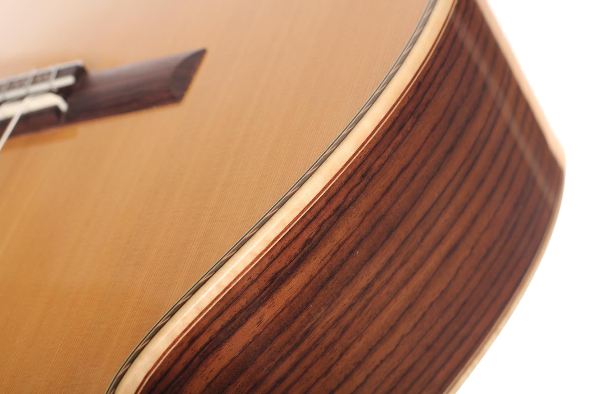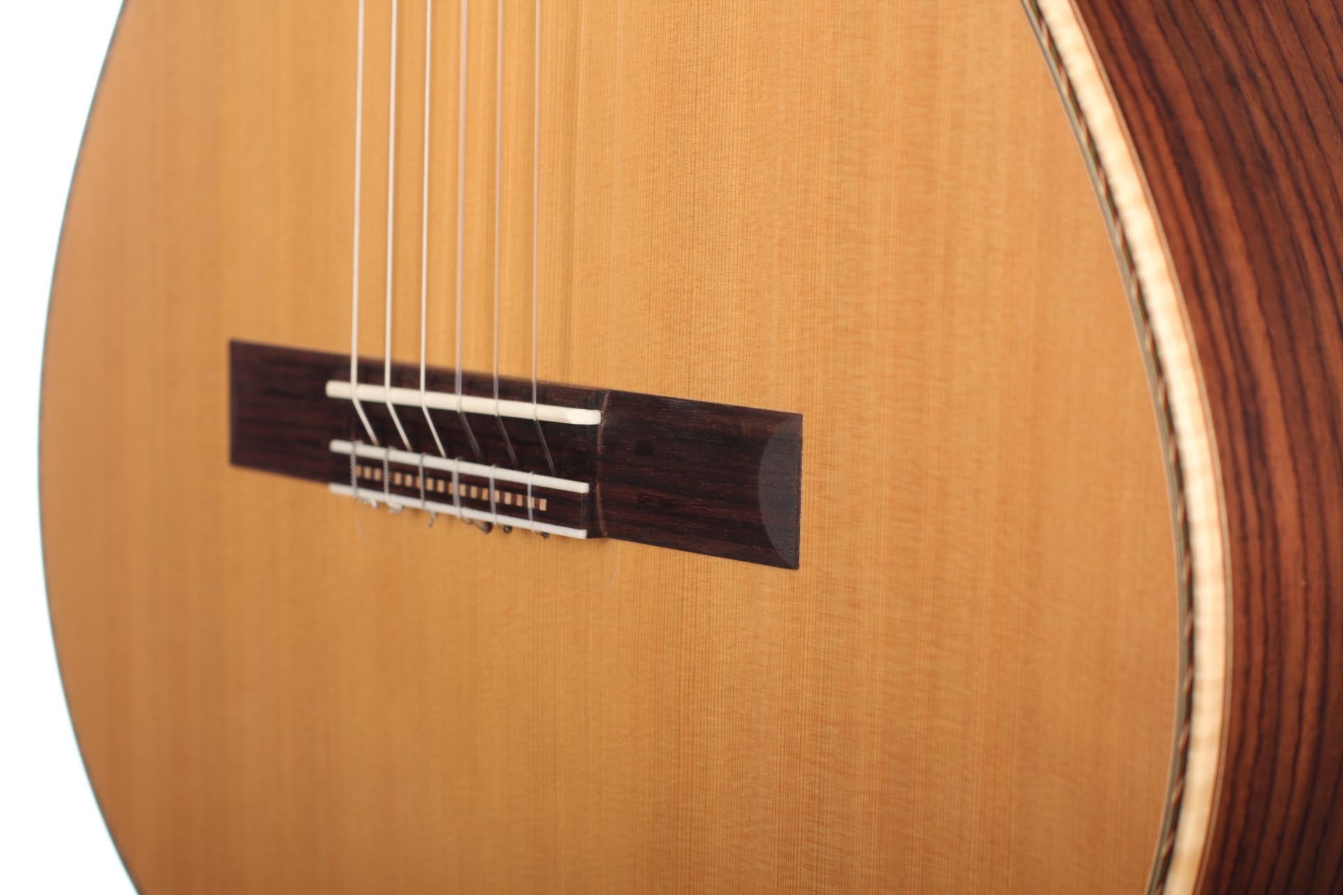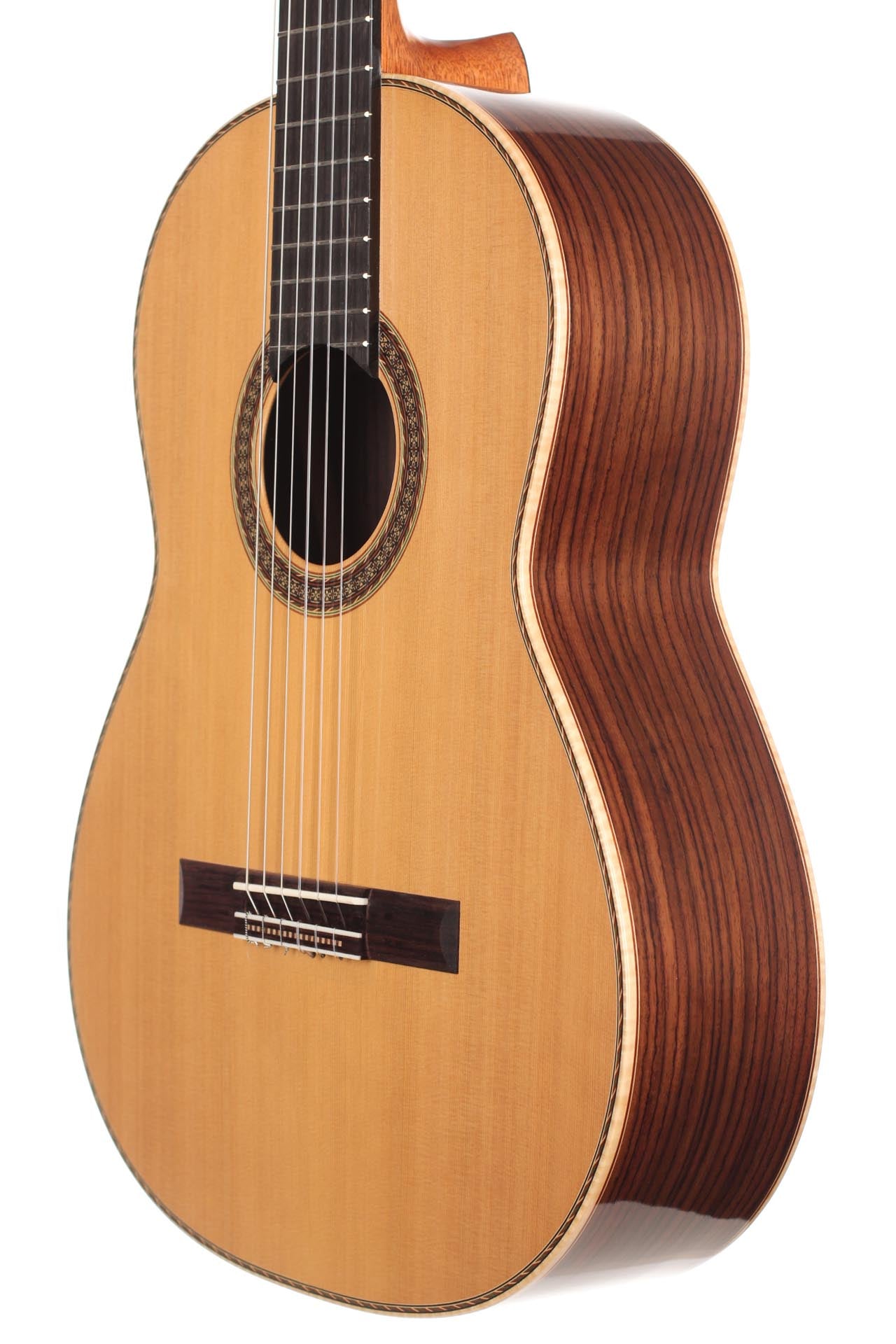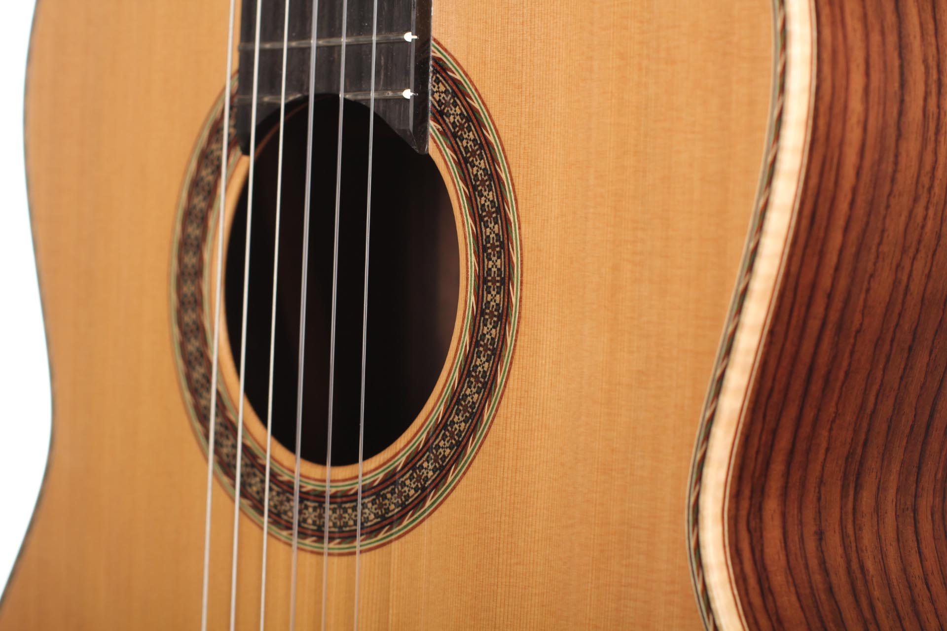The top of this guitar is made of cedar - back and sides are made of Indian rosewood. The tuners are made by Schaller. All French-polished. A hard-shell case is included.