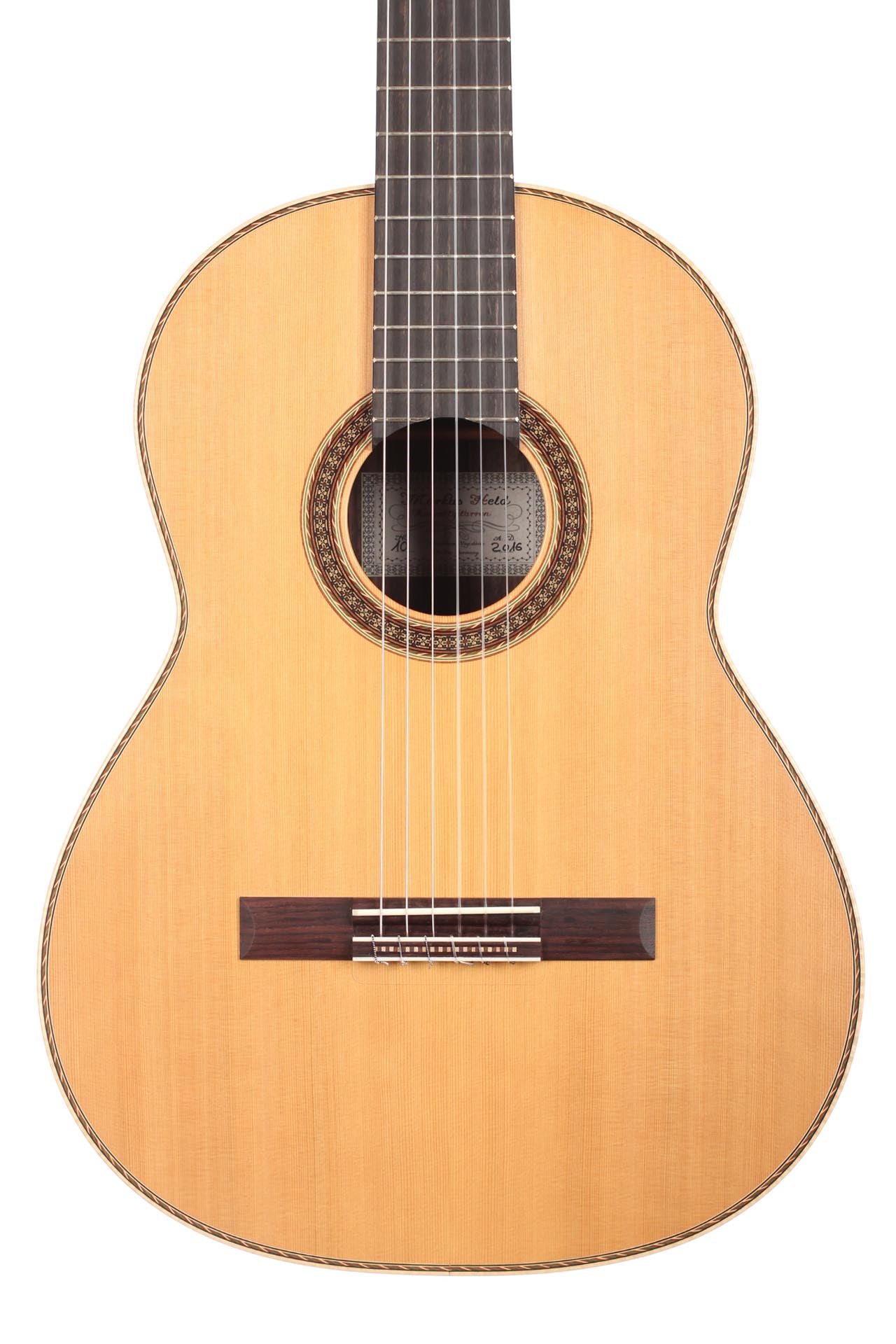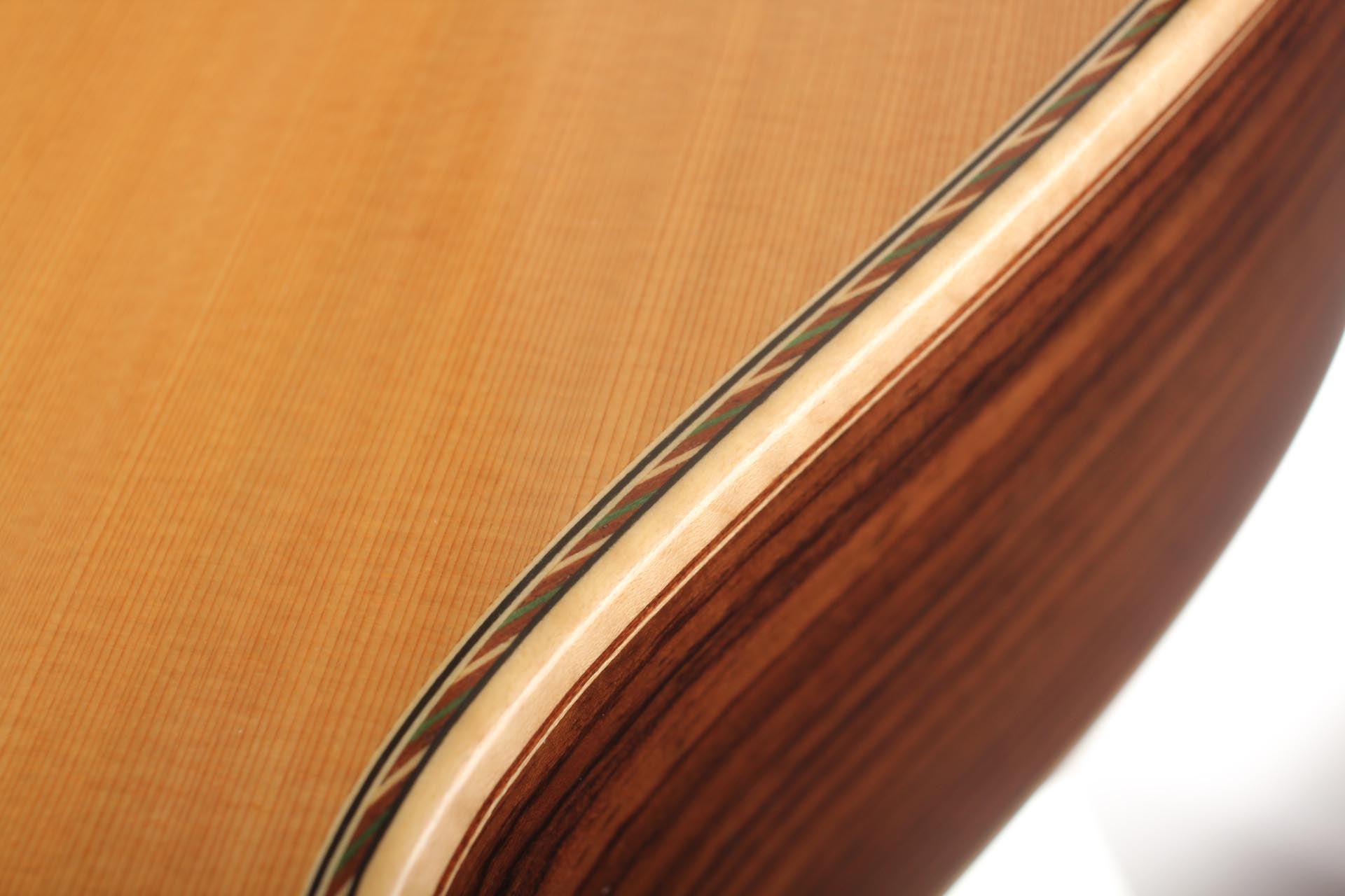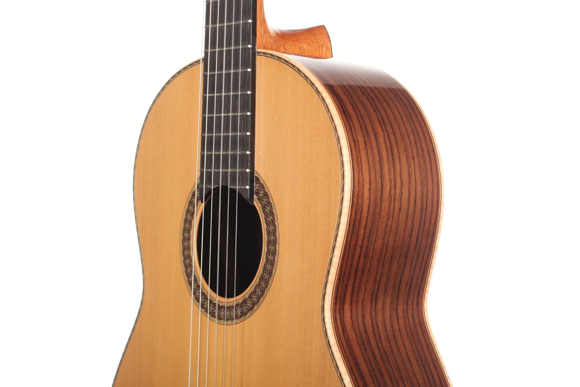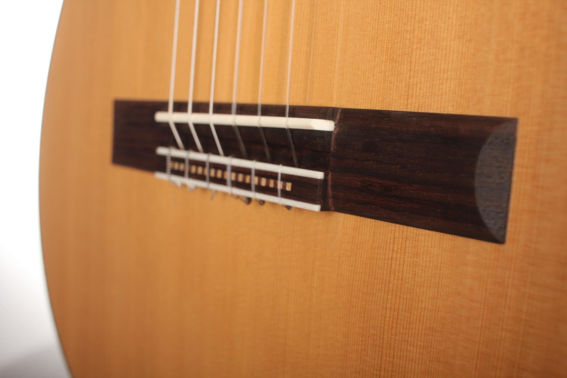 The top of this guitar is made of cedar - back and sides are made of Indian rosewood. The tuners are made by Schaller. All French-polished. A hard-shell case is included.