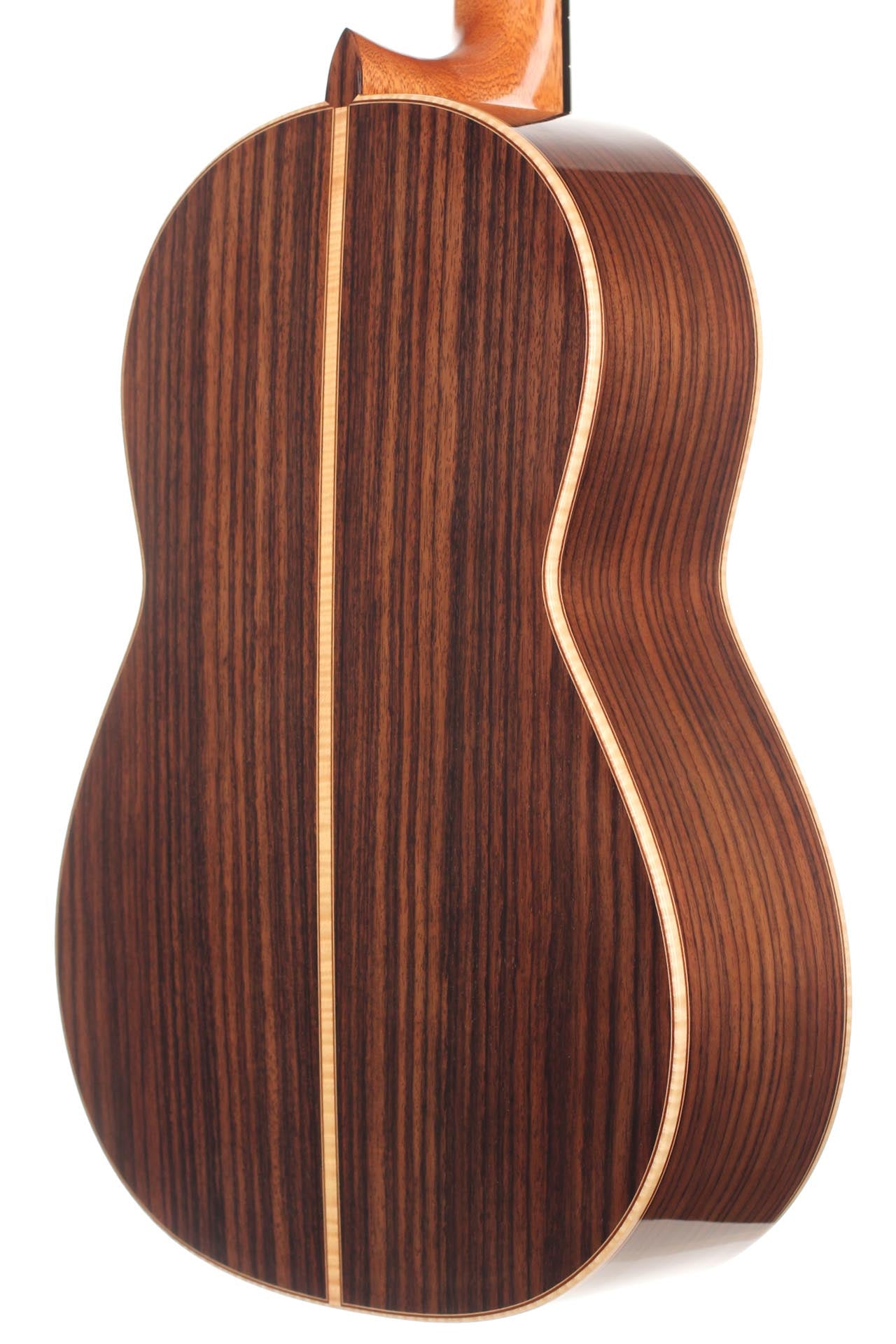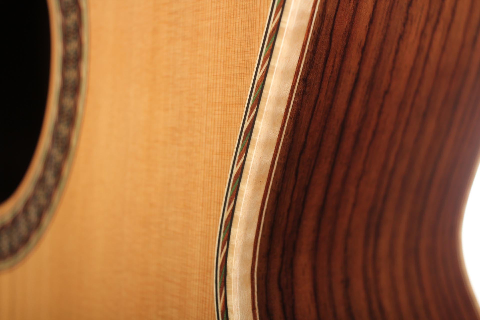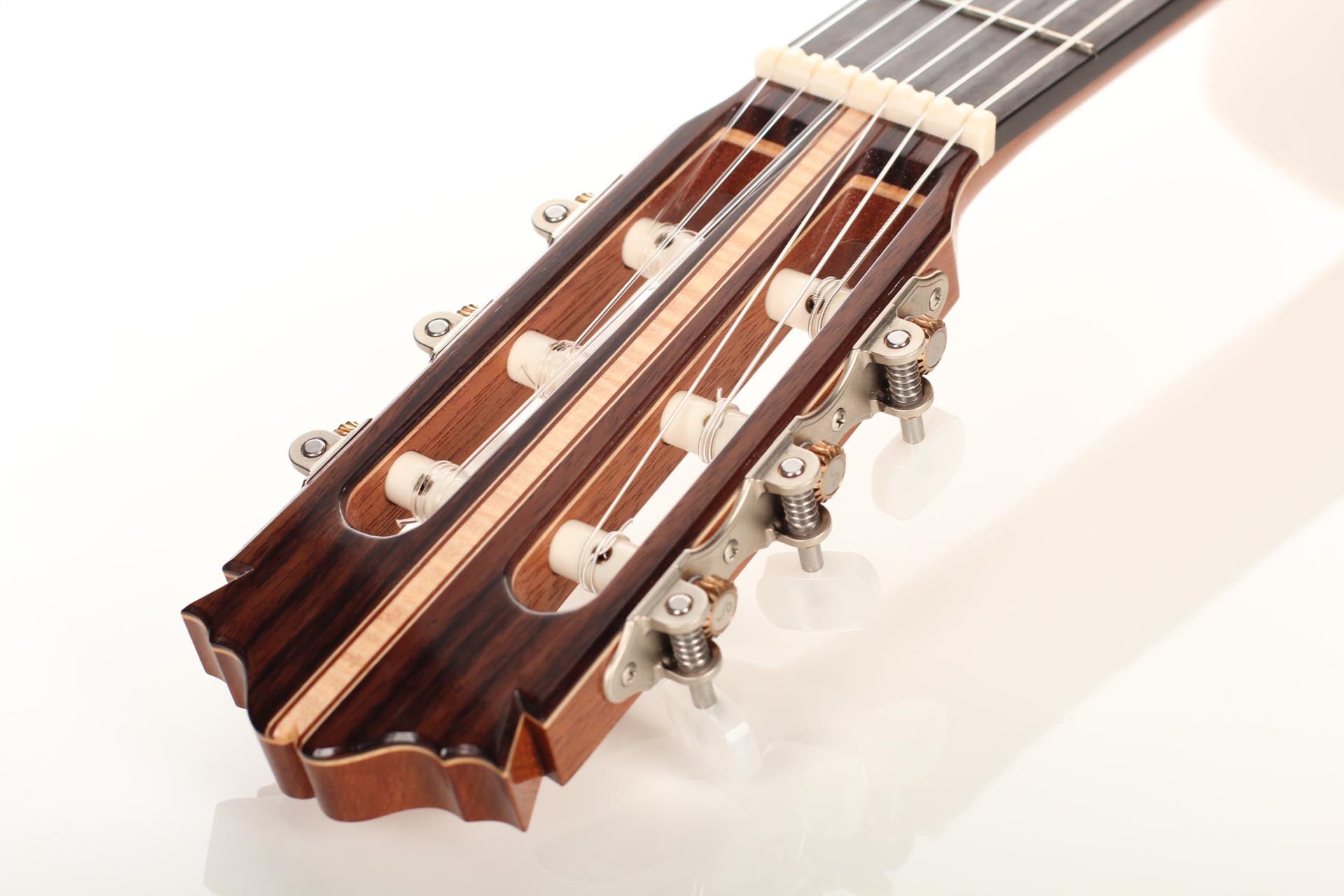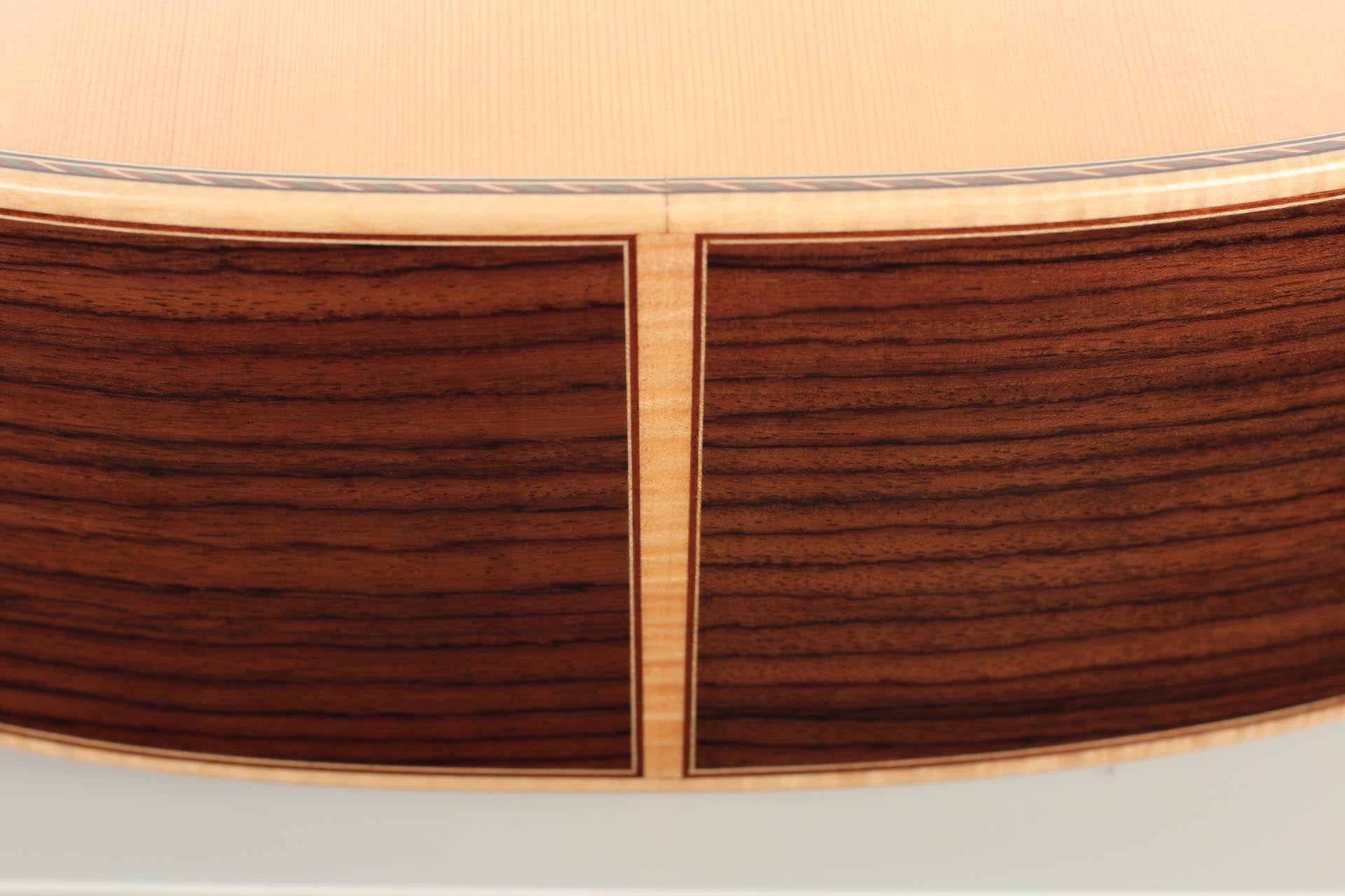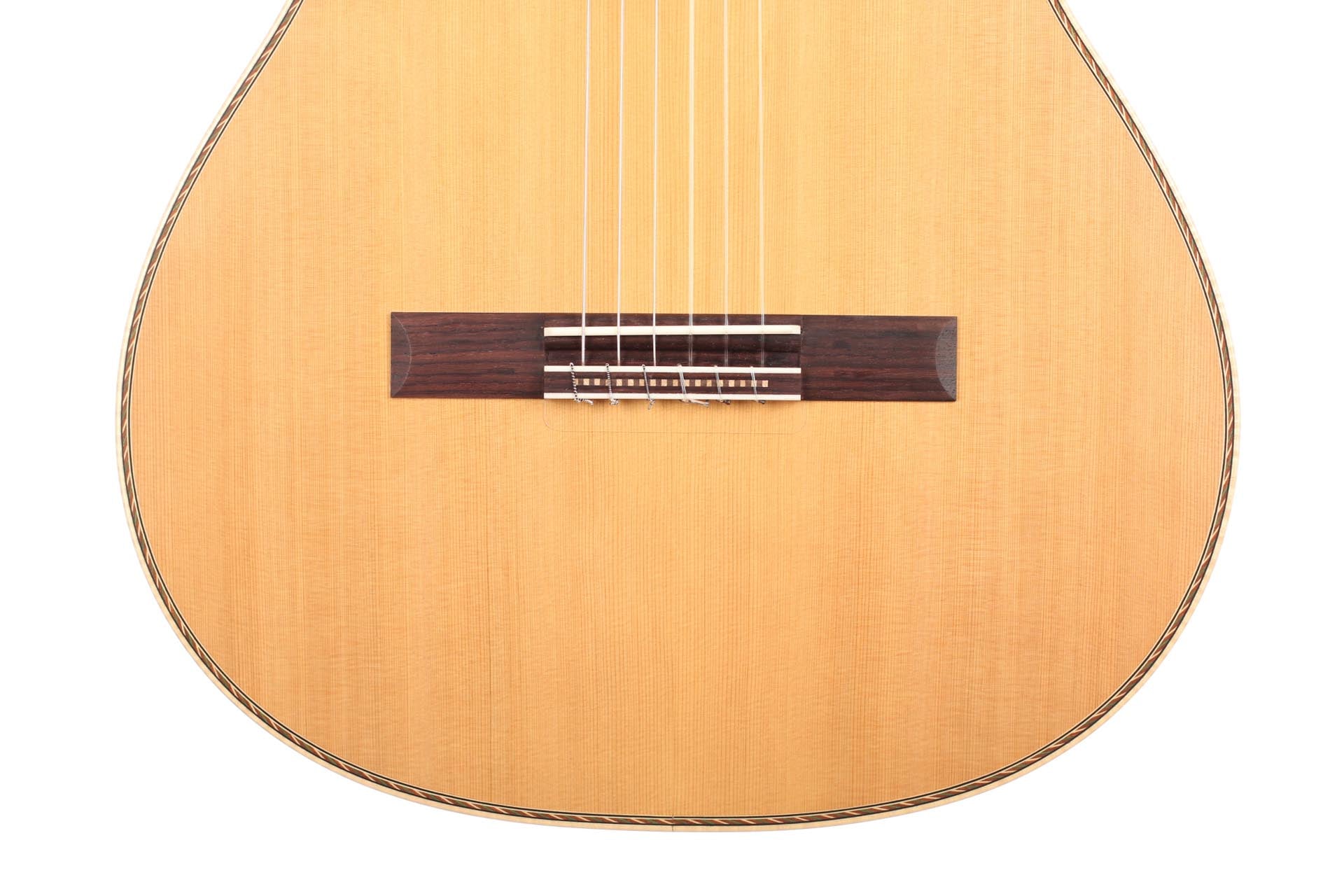 The top of this guitar is made of cedar - back and sides are made of Indian rosewood. The tuners are made by Schaller. All French-polished. A hard-shell case is included.