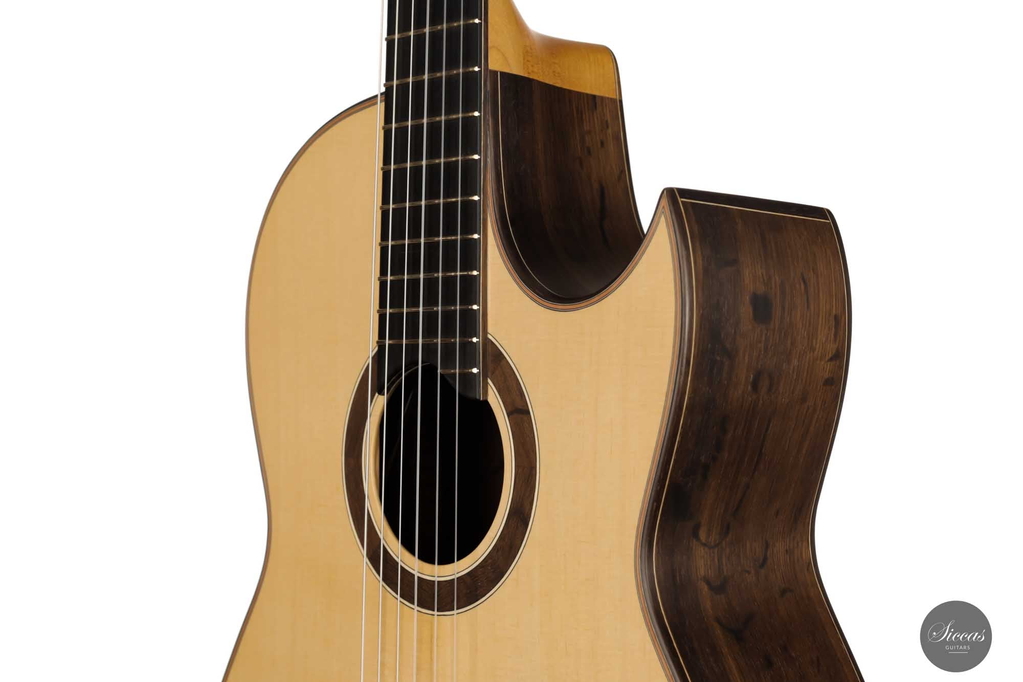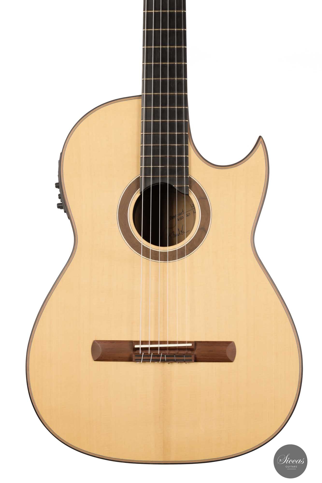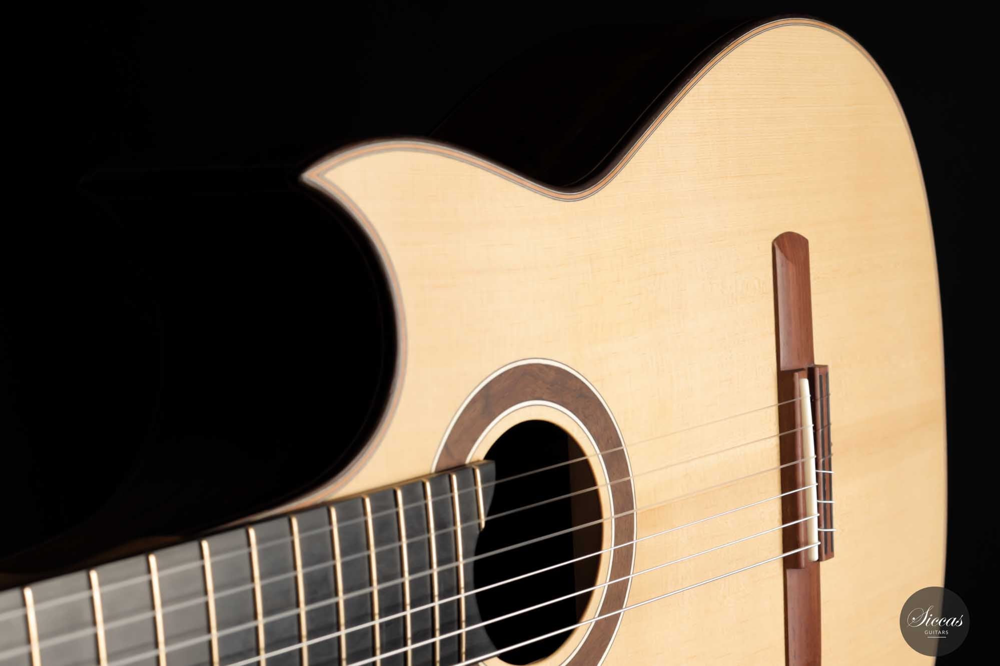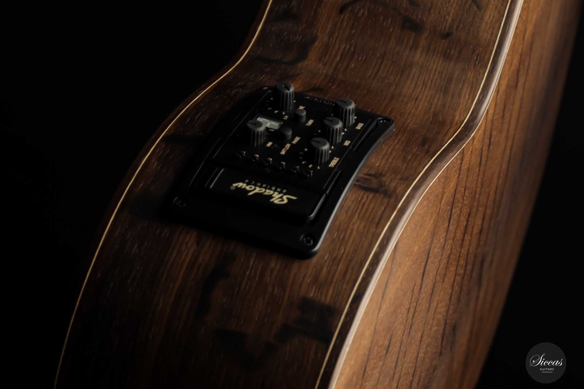 The flow cut model is a cutaway classical guitar that was developed for easy fingering and improved playability in the high registers. This guitar's volume and tonal qualities are also ideal for demanding improvisations and jazz pieces. This beautiful instrument features a unique selection of woods: a beautiful spruce soundboard combined with smoked oak back and sides. Furthermore, the fingerboard has a 12" radius, which makes this instrument exceptionally comfortable to play for the left hand. This brand-new guitar also features a Shadow SH4020 pickup system.