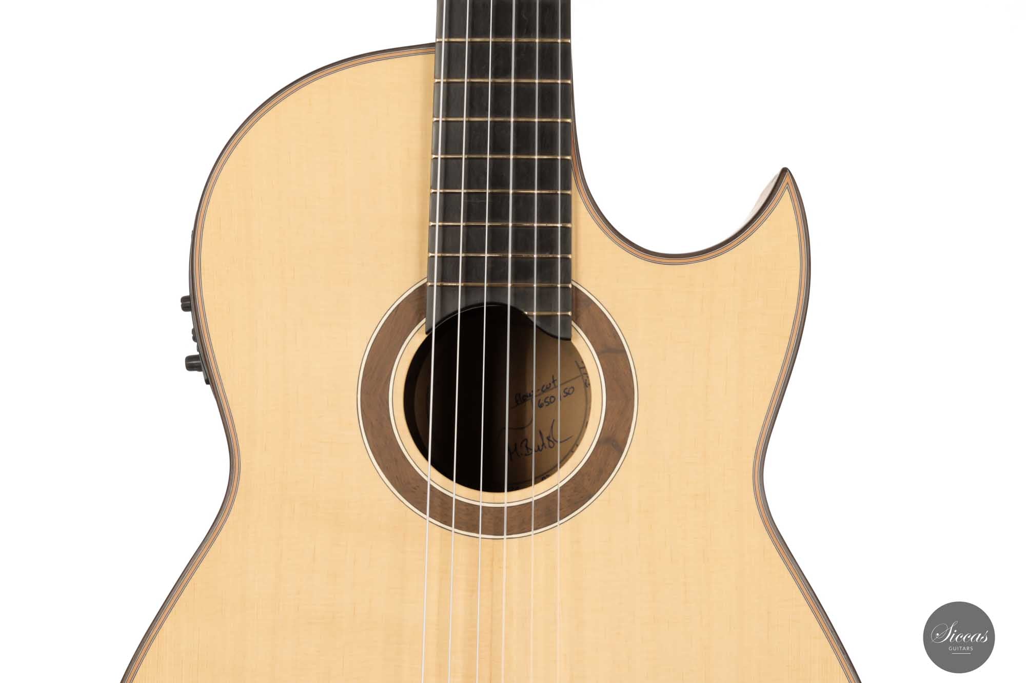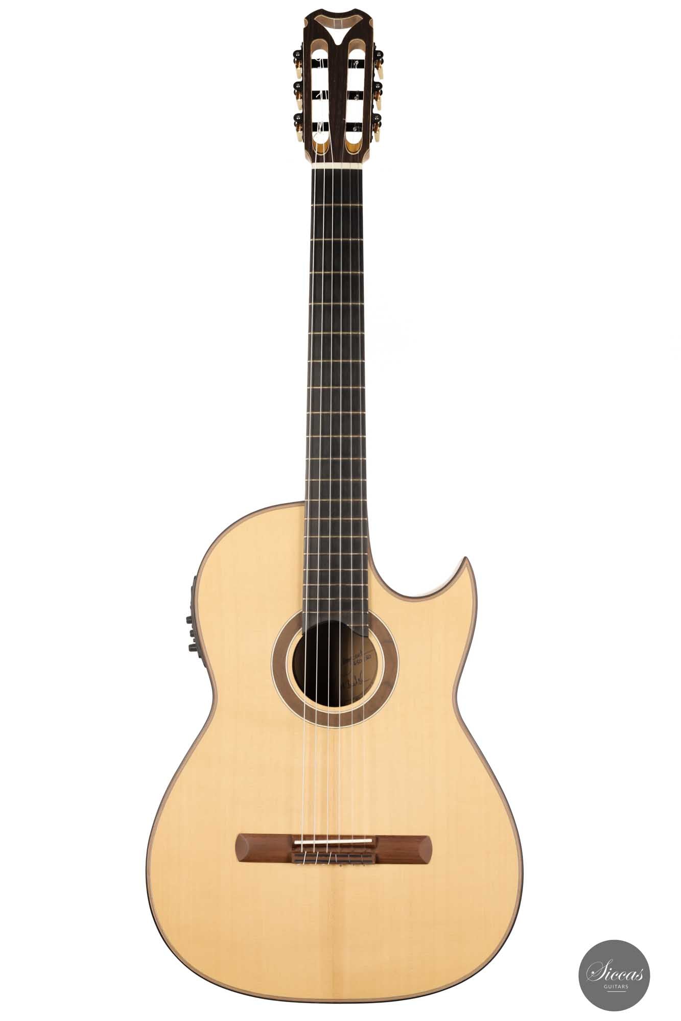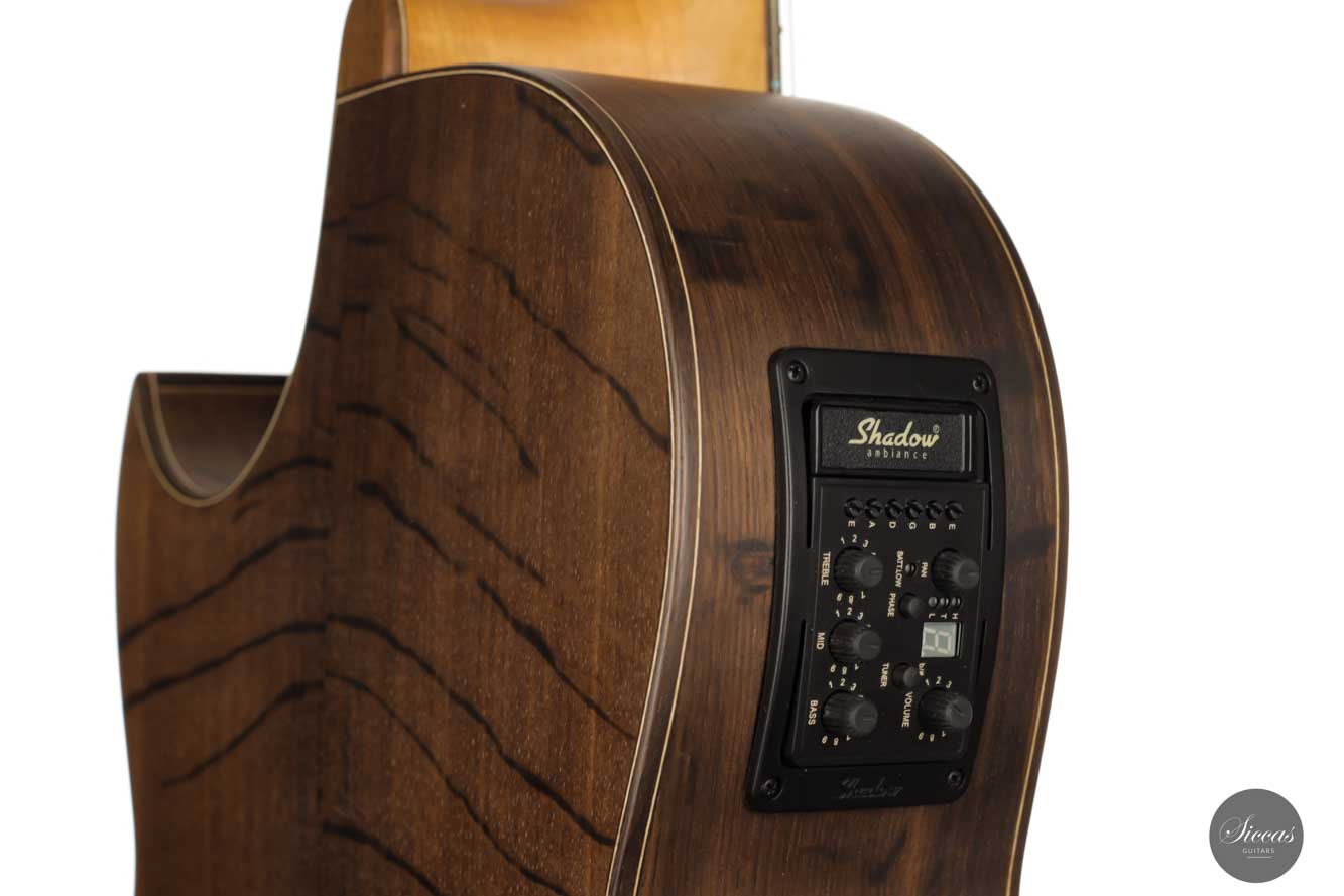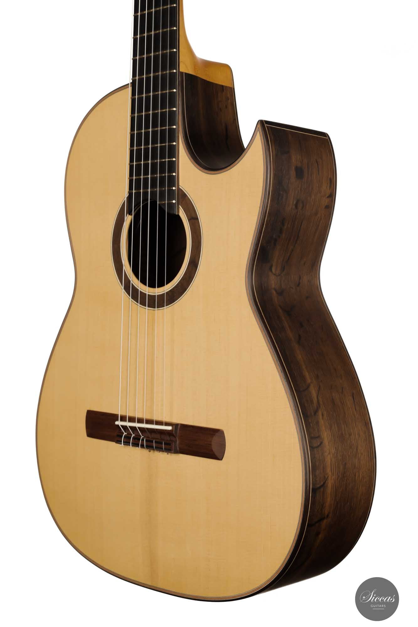 The flow cut model is a cutaway classical guitar that was developed for easy fingering and improved playability in the high registers. This guitar's volume and tonal qualities are also ideal for demanding improvisations and jazz pieces. This beautiful instrument features a unique selection of woods: a beautiful spruce soundboard combined with smoked oak back and sides. Furthermore, the fingerboard has a 12" radius, which makes this instrument exceptionally comfortable to play for the left hand. This brand-new guitar also features a Shadow SH4020 pickup system.
