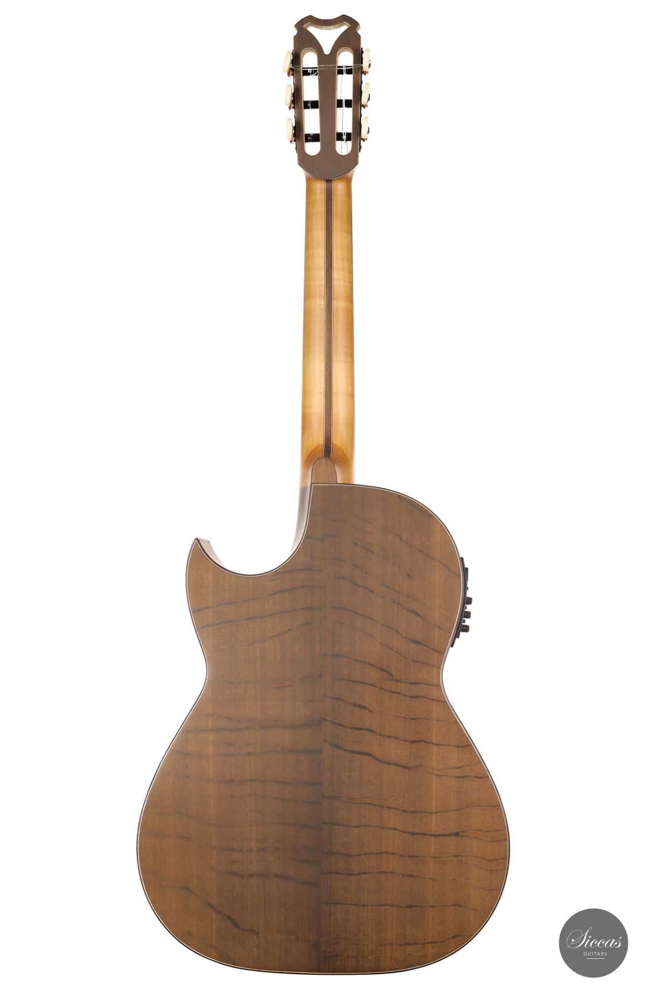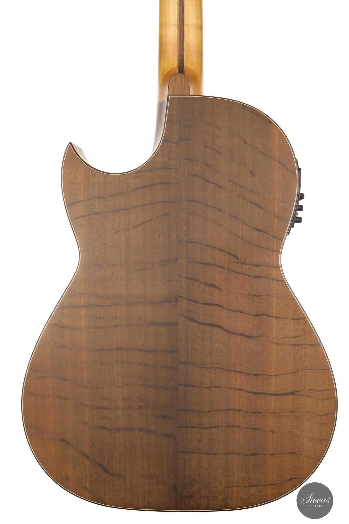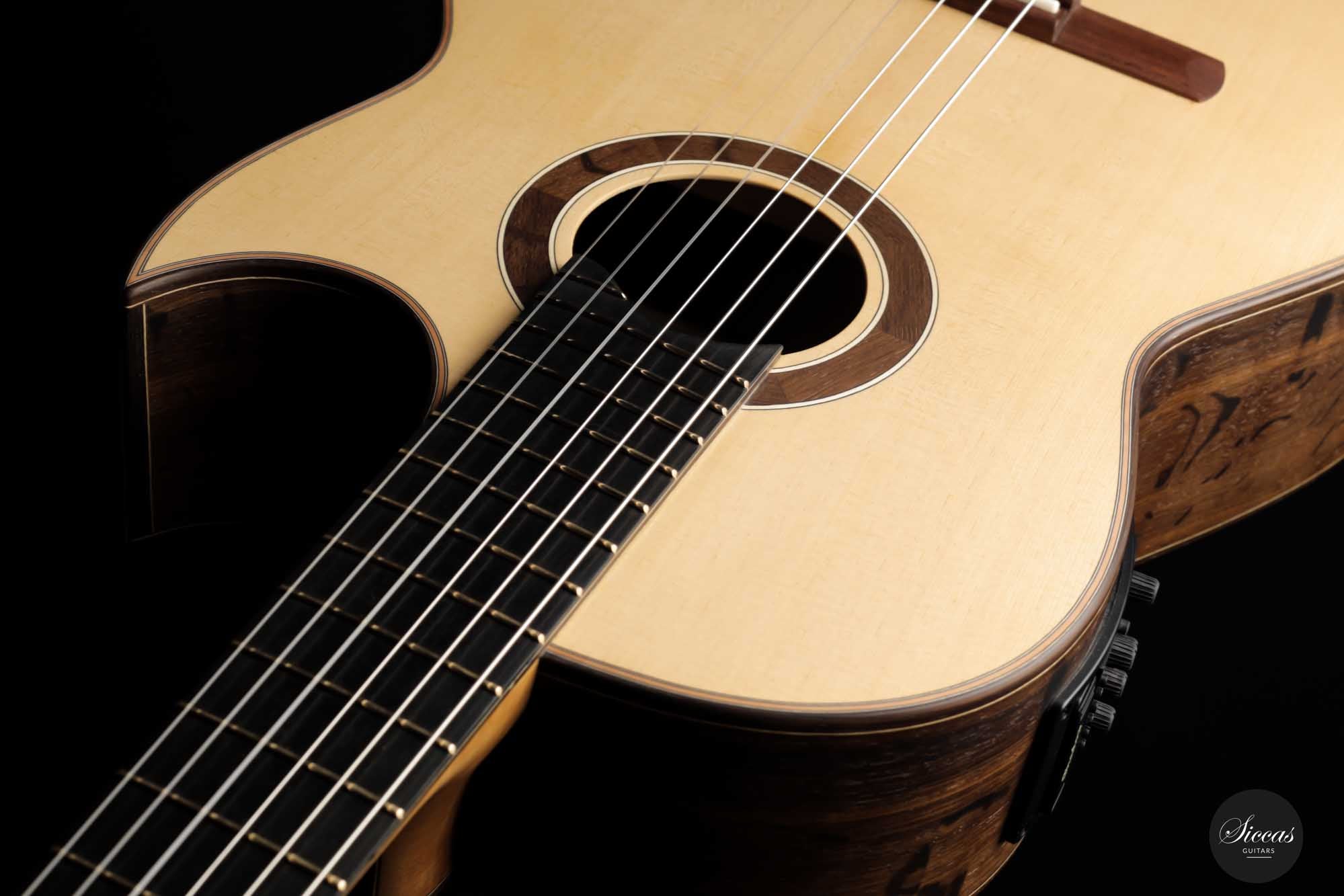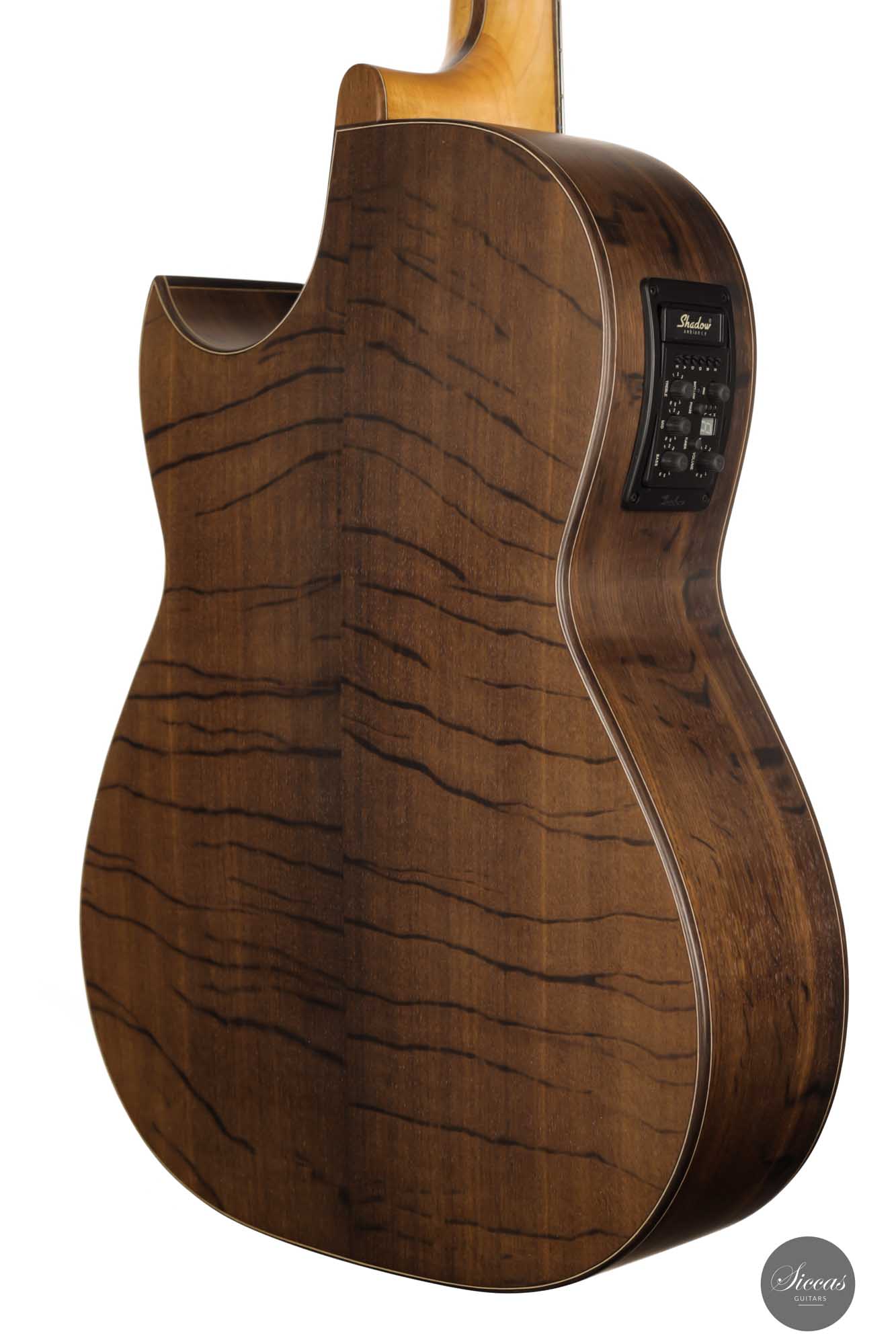 The flow cut model is a cutaway classical guitar that was developed for easy fingering and improved playability in the high registers. This guitar's volume and tonal qualities are also ideal for demanding improvisations and jazz pieces. This beautiful instrument features a unique selection of woods: a beautiful spruce soundboard combined with smoked oak back and sides. Furthermore, the fingerboard has a 12" radius, which makes this instrument exceptionally comfortable to play for the left hand. This brand-new guitar also features a Shadow SH4020 pickup system.