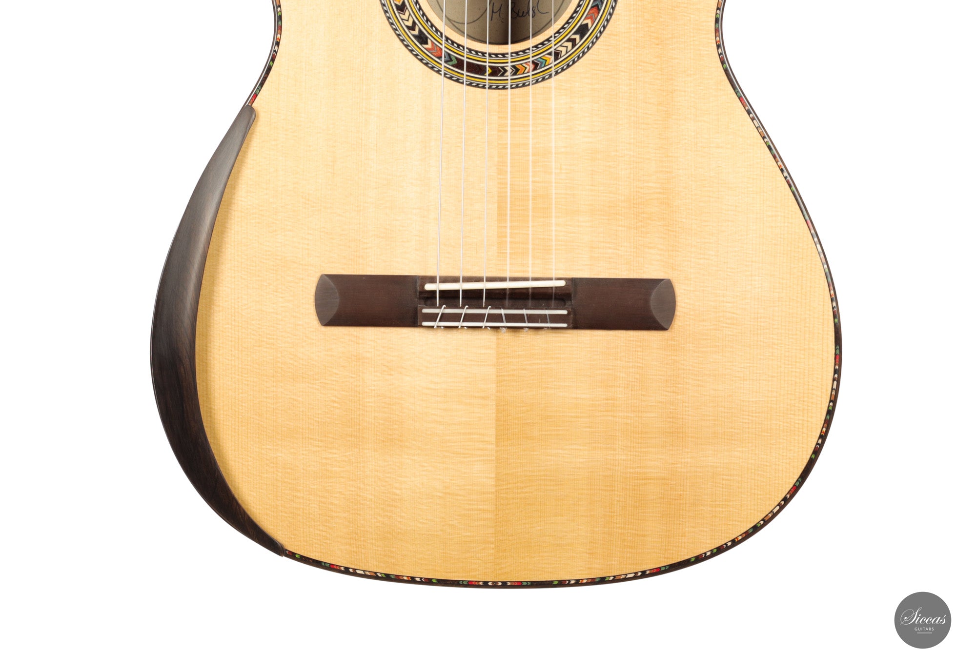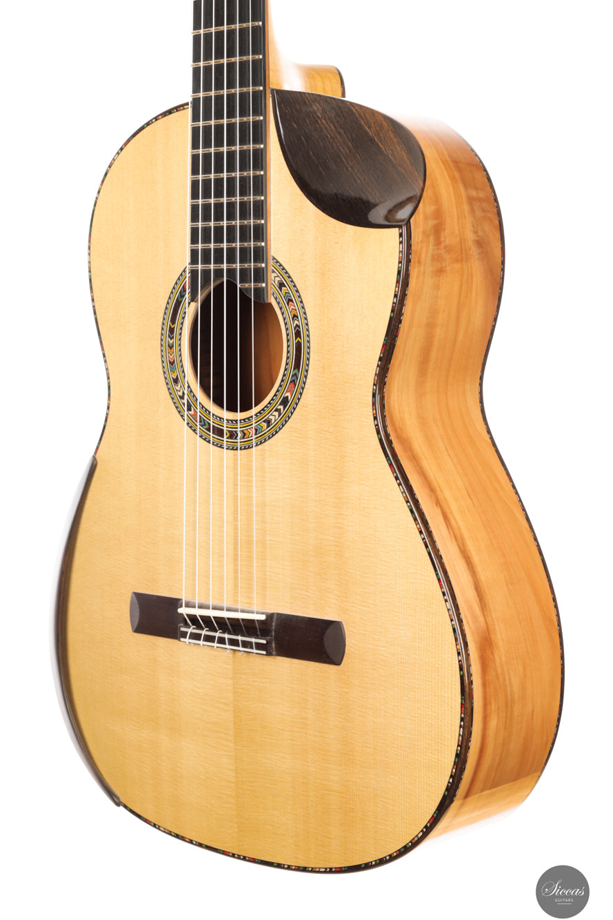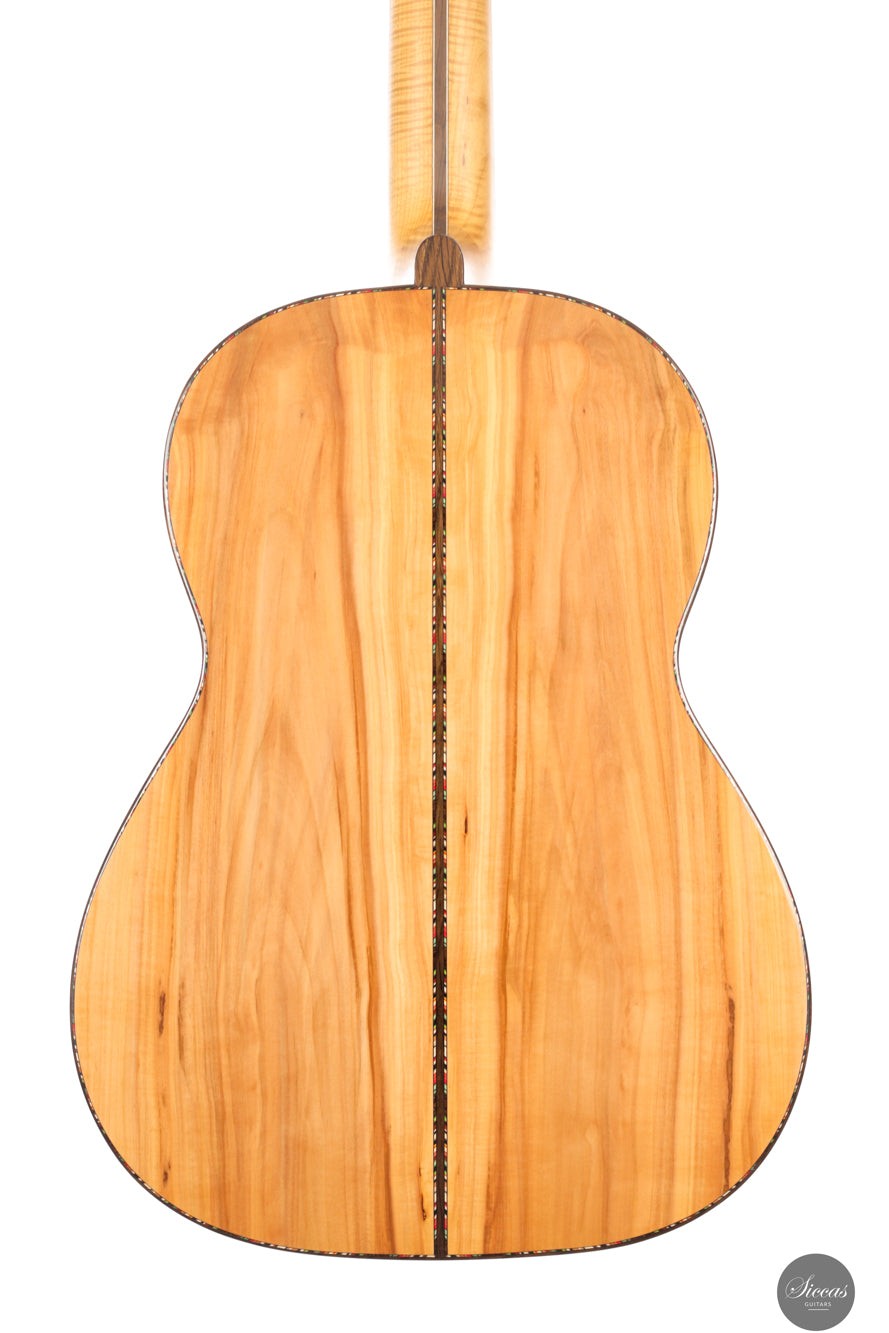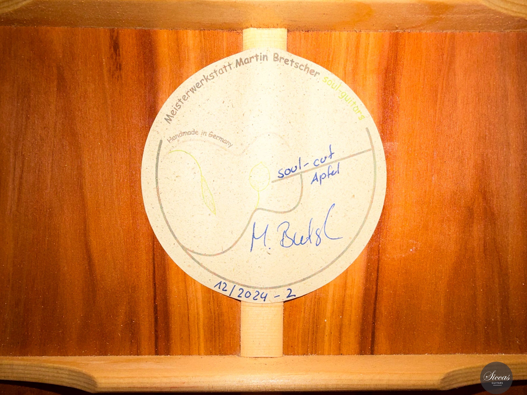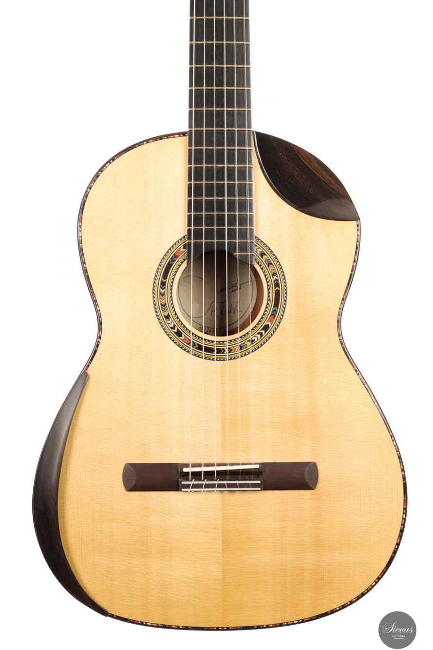 This Soul Cut model from 2025 is a lattice braced concert guitar that reflects Martin Bretscher’s contemporary approach to sound and playability. The spruce top is paired with apple wood back and sides and finished in French polish, resulting in a lightweight yet structurally efficient instrument. The lattice construction allows the soundboard to react freely while maintaining control, supporting a direct and immediate tonal response.
