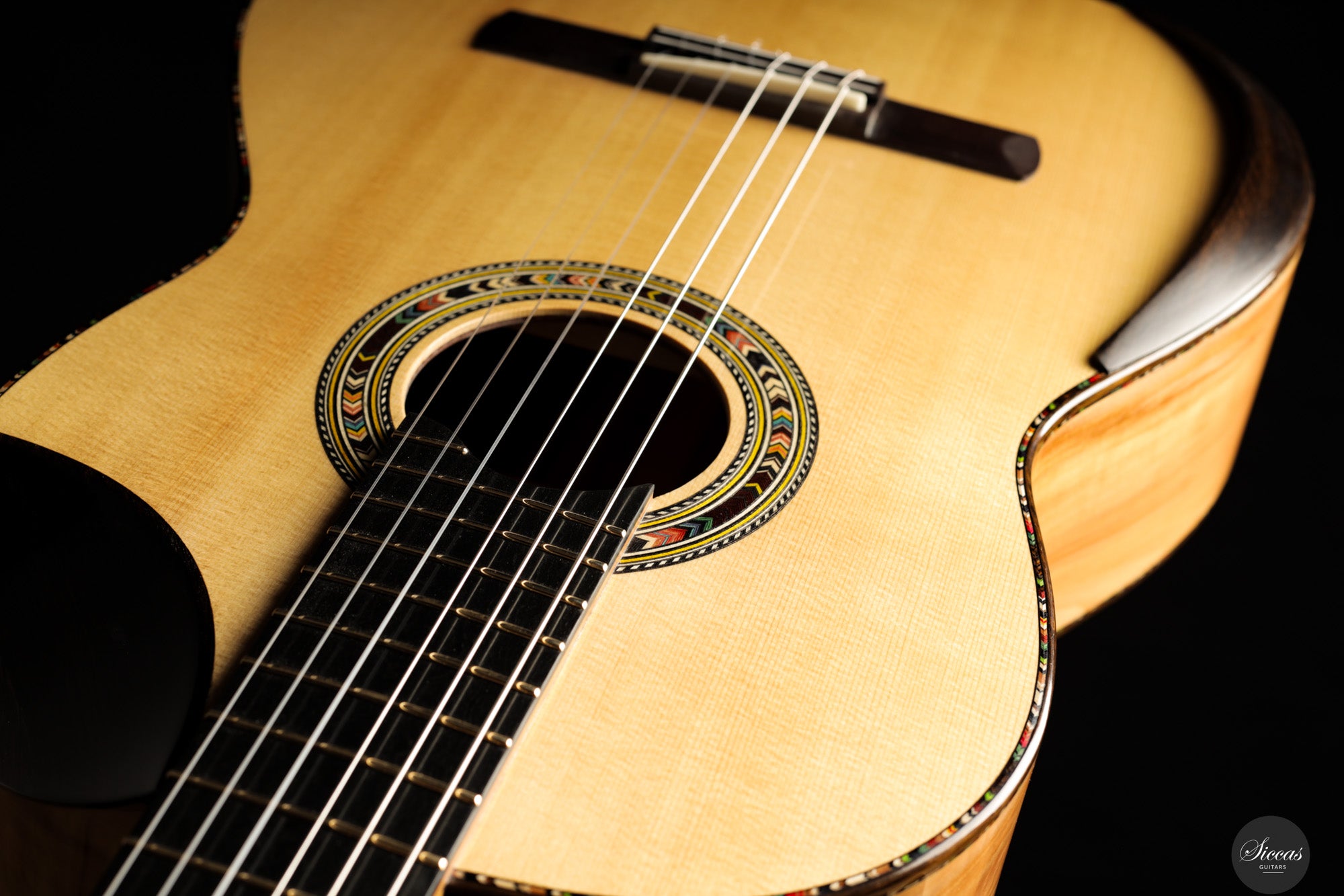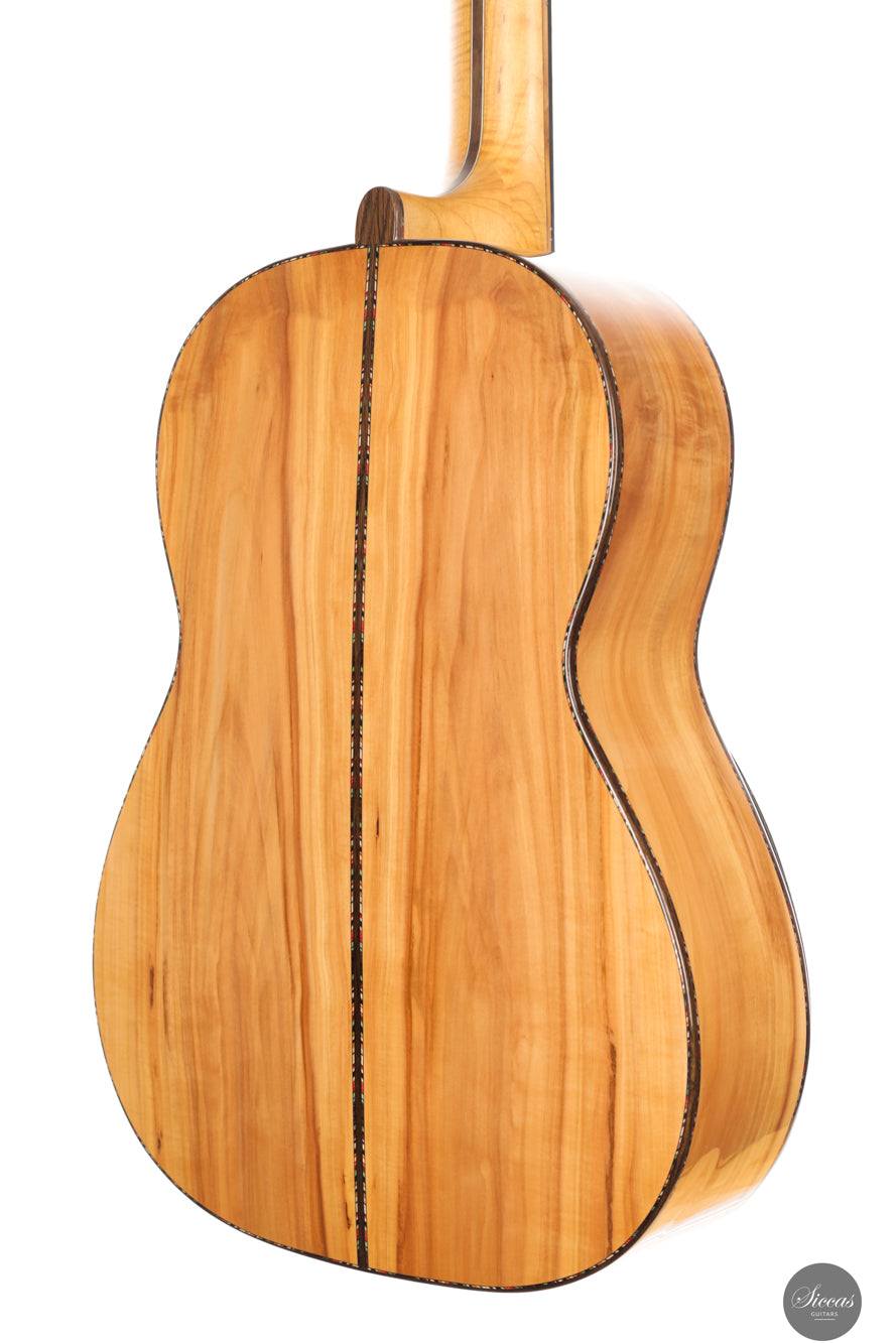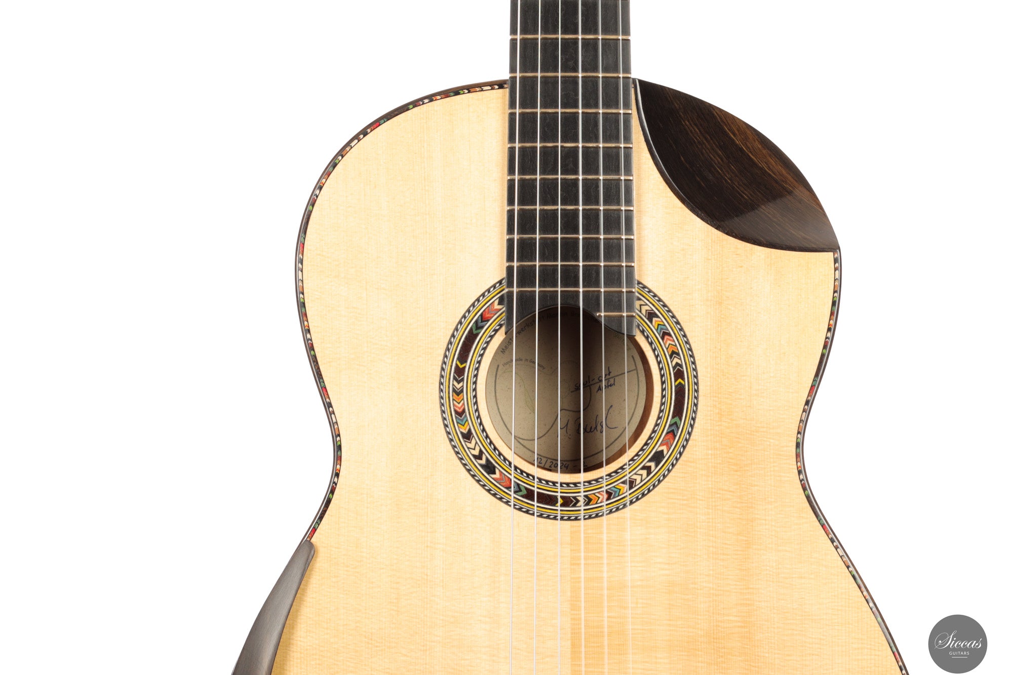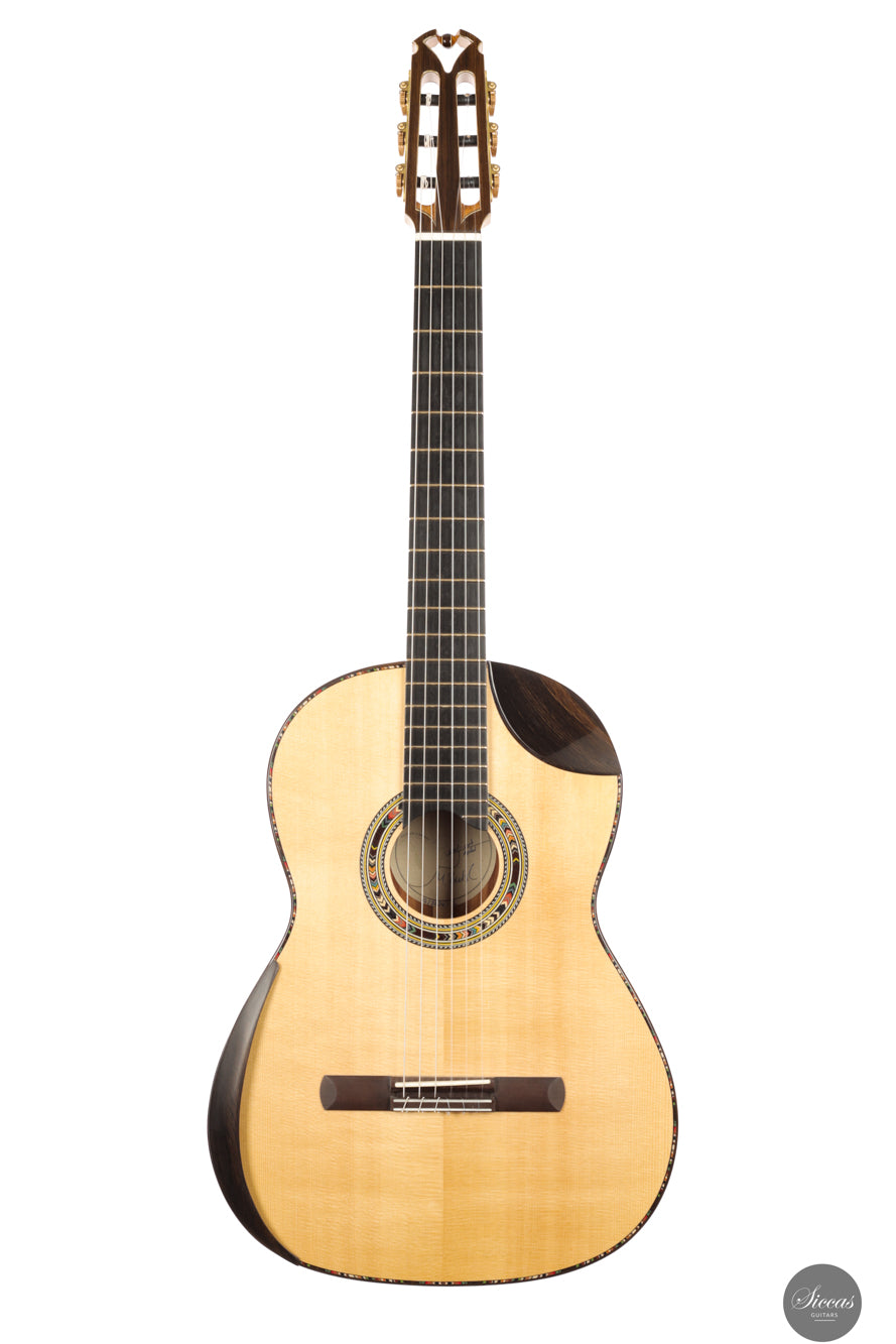 In sound the guitar is notably soft, round and pleasant, with an even response across all registers. The balance is consistent from bass to treble, giving each note the same sense of presence and intensity. Tones emerge easily without physical effort and are supported by a clear and stable sustain. The instrument resonates openly and reacts quickly, making fast passages and dynamic changes feel natural and unforced. Despite its modern construction, the sound remains cohesive and calm, offering a refined voice that rewards attentive shaping rather than sheer volume.