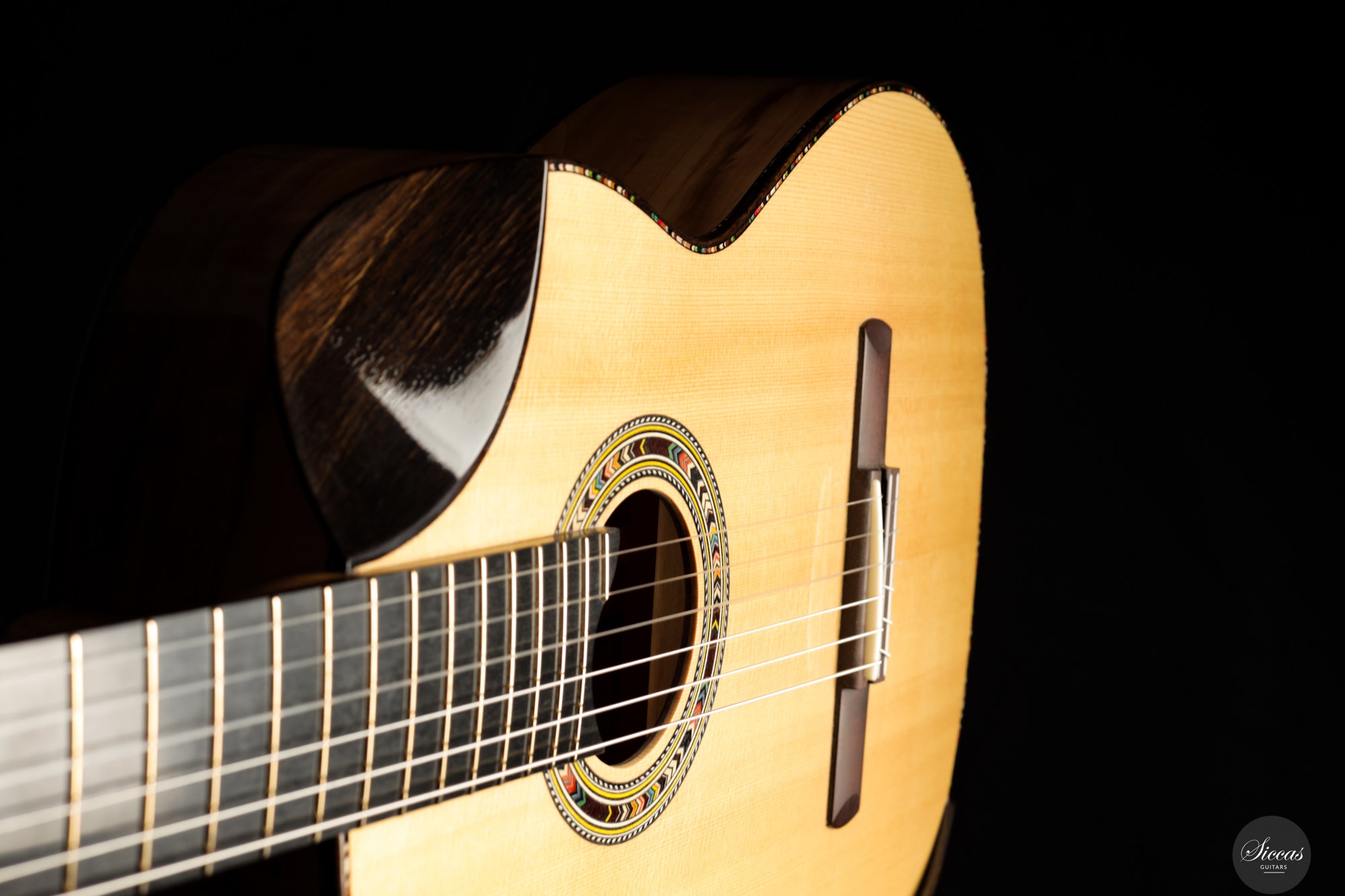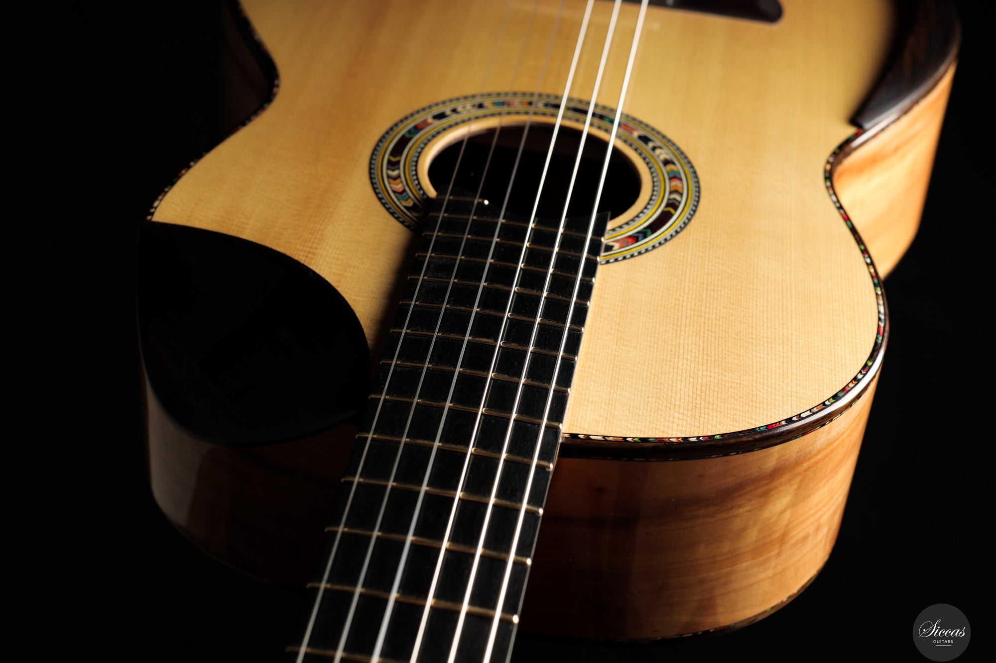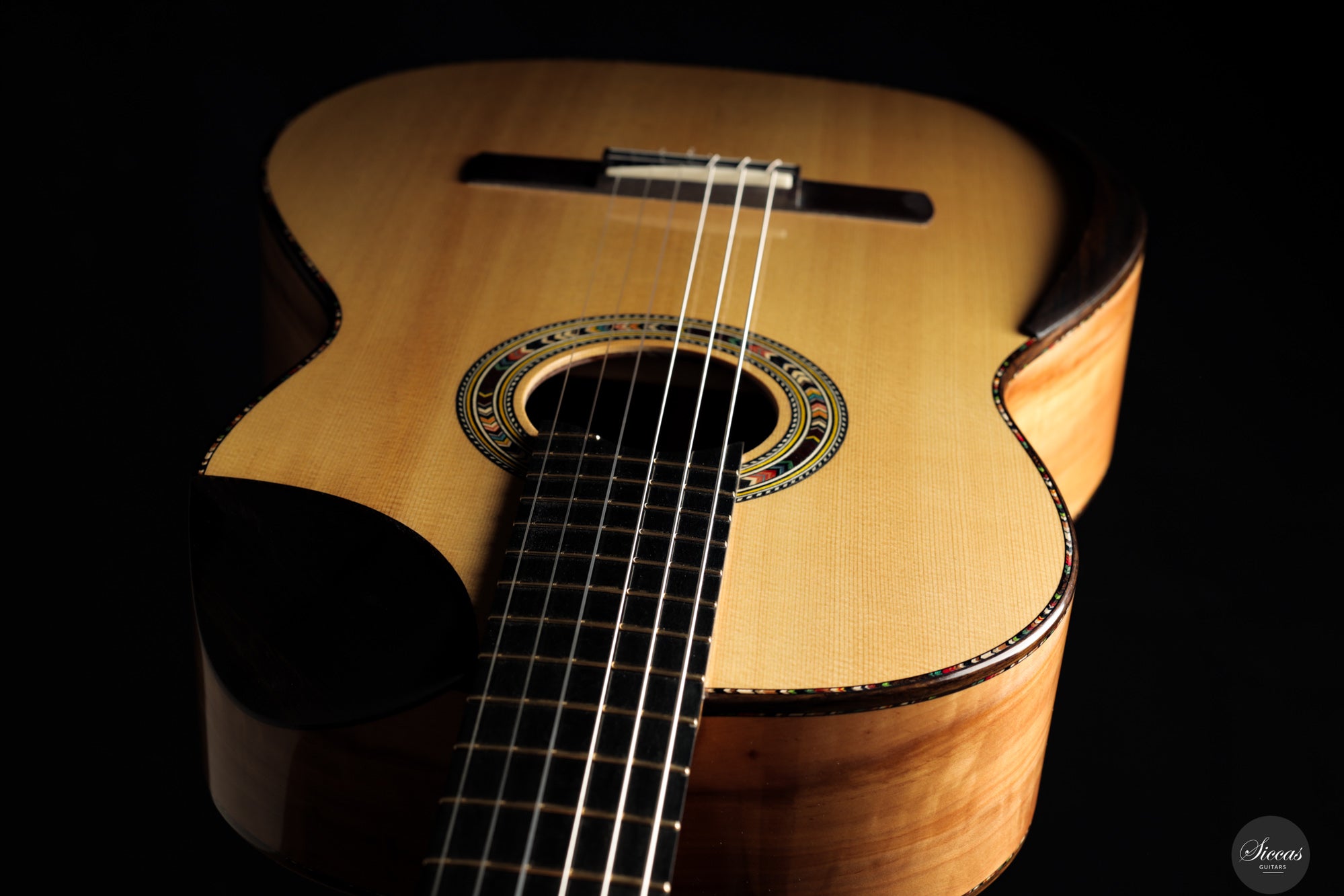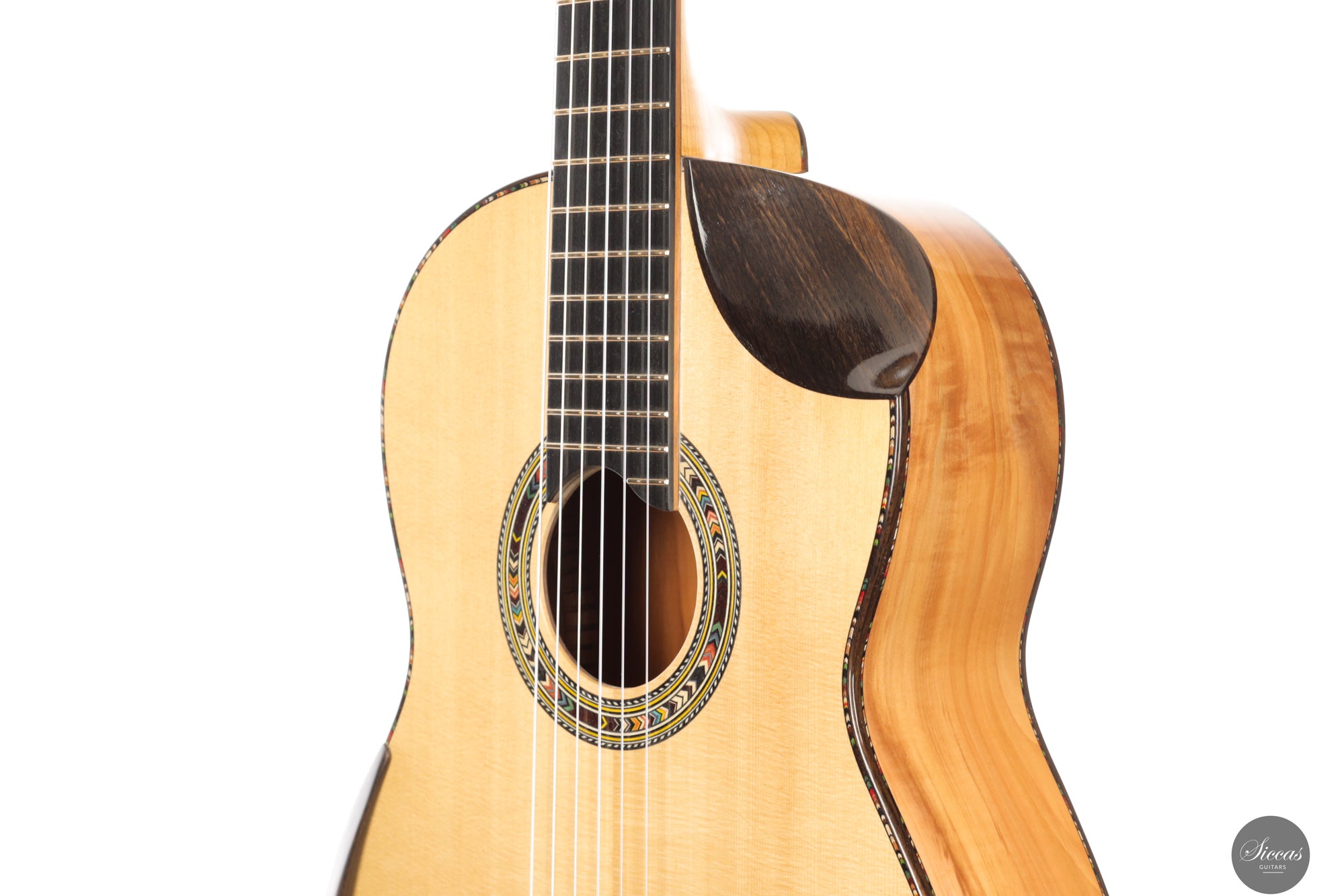In sound the guitar is notably soft, round and pleasant, with an even response across all registers. The balance is consistent from bass to treble, giving each note the same sense of presence and intensity. Tones emerge easily without physical effort and are supported by a clear and stable sustain. The instrument resonates openly and reacts quickly, making fast passages and dynamic changes feel natural and unforced. Despite its modern construction, the sound remains cohesive and calm, offering a refined voice that rewards attentive shaping rather than sheer volume.