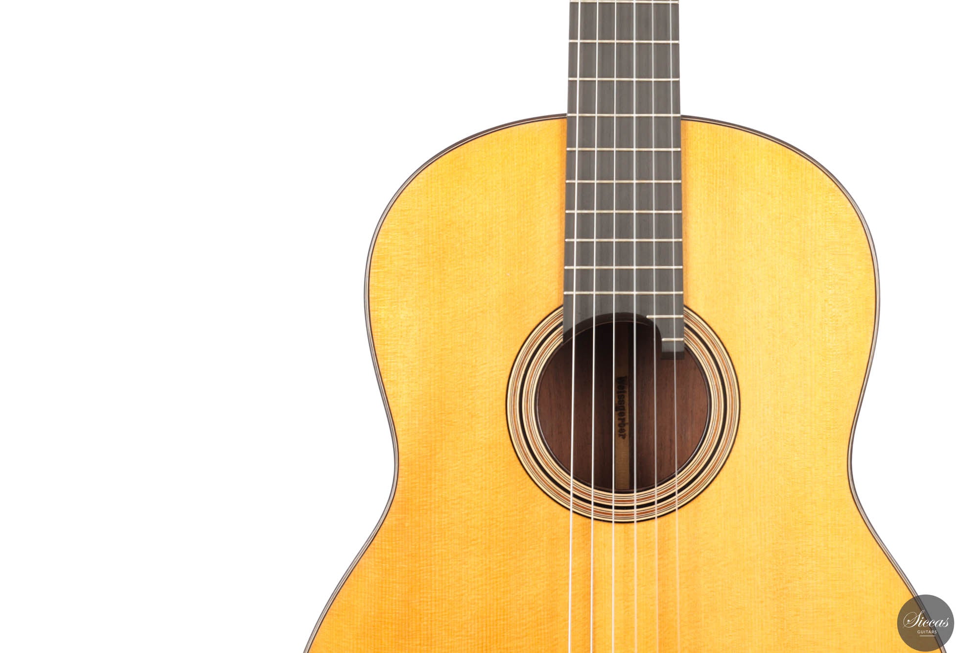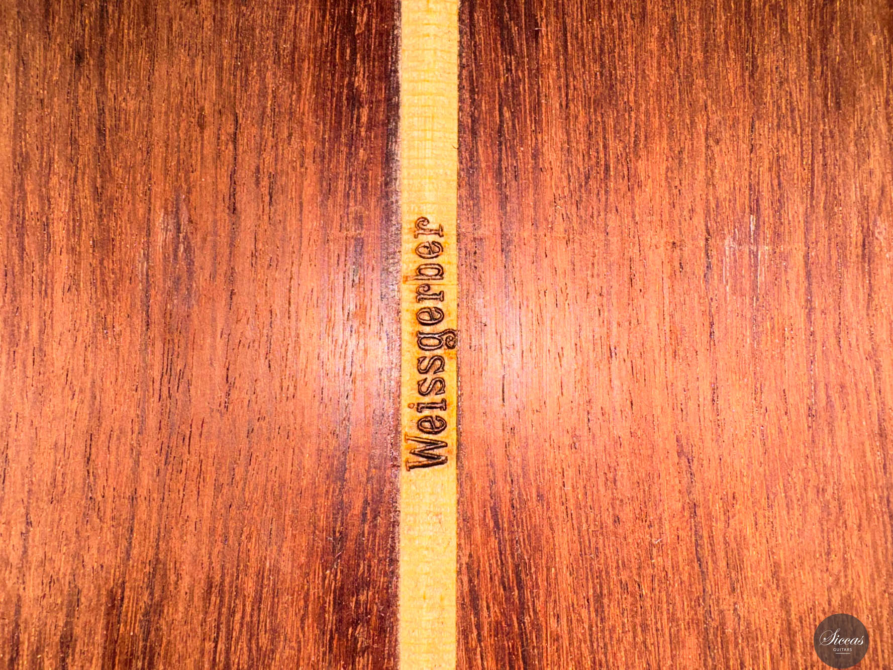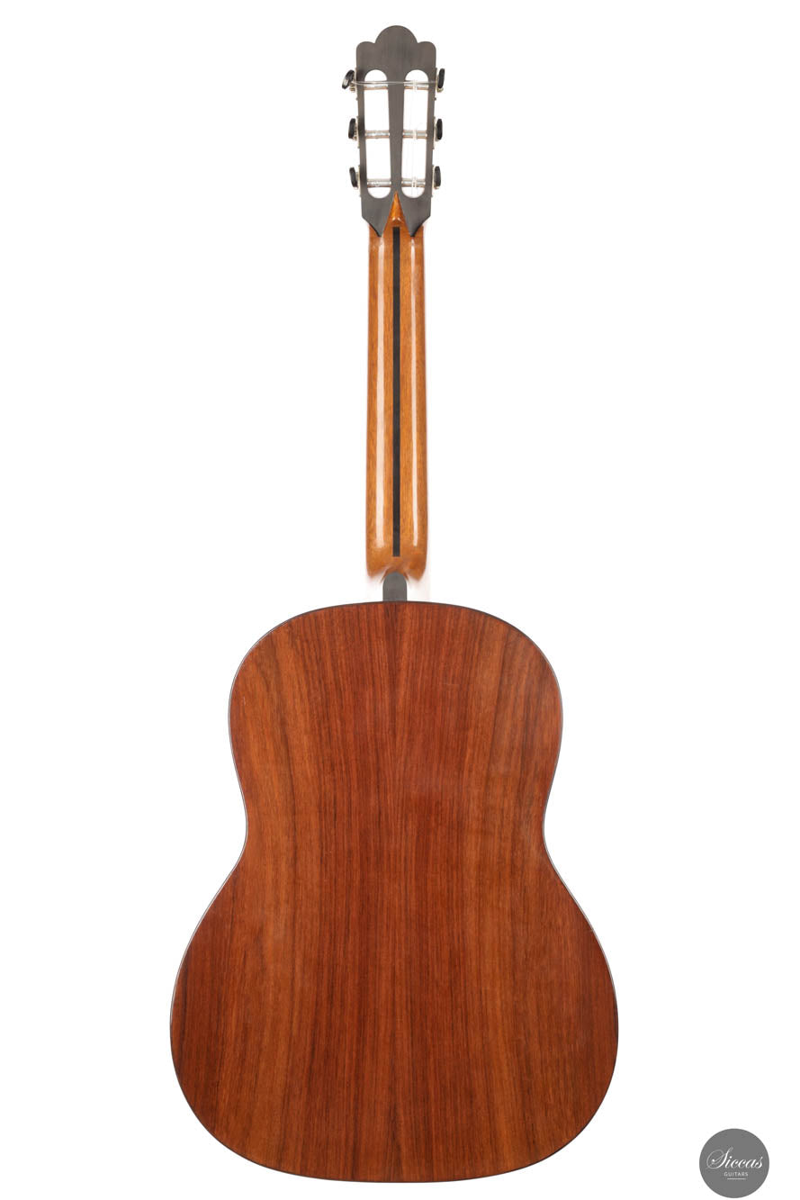 This beautiful guitar was built around 1960 by Martin Jacob. Although it does not bear a label — which is quite common for Weissgerber guitars — there is an ‘MJ’ stamp inside, indicating that the instrument was made for Martin Jacob. A distinctive feature of this guitar is that, in addition to the ‘MJ’ stamp, it also carries the same Weissgerber brand stamp that was used by his father, Richard Jacob Weissgerber. This can be seen as a sign of his artistic emancipation: in terms of construction and sound quality, his guitars are in no way inferior to those of his father. Due to its dimensions and body shape, the guitar is classified as a “Große Spanische Modell,” closely inspired by traditional Spanish guitar design. The instrument was once owned by Maria Jacob, daughter of Martin Jacob, and it remains in excellent condition, with no structural issues. In terms of sound, the guitar delivers dry, punchy, and present basses, while the trebles are clean, clear, and focused. Structurally, the spruce soundboard features four fan bracings, complemented by two V-shaped bars angled outward toward the sides. This unusual yet effective internal bracing contributes to the guitar’s rich resonance and overall stability. A fine example of German craftsmanship with the soul of Spanish guitar tradition—a rare and expressive instrument with both historical and musical value.