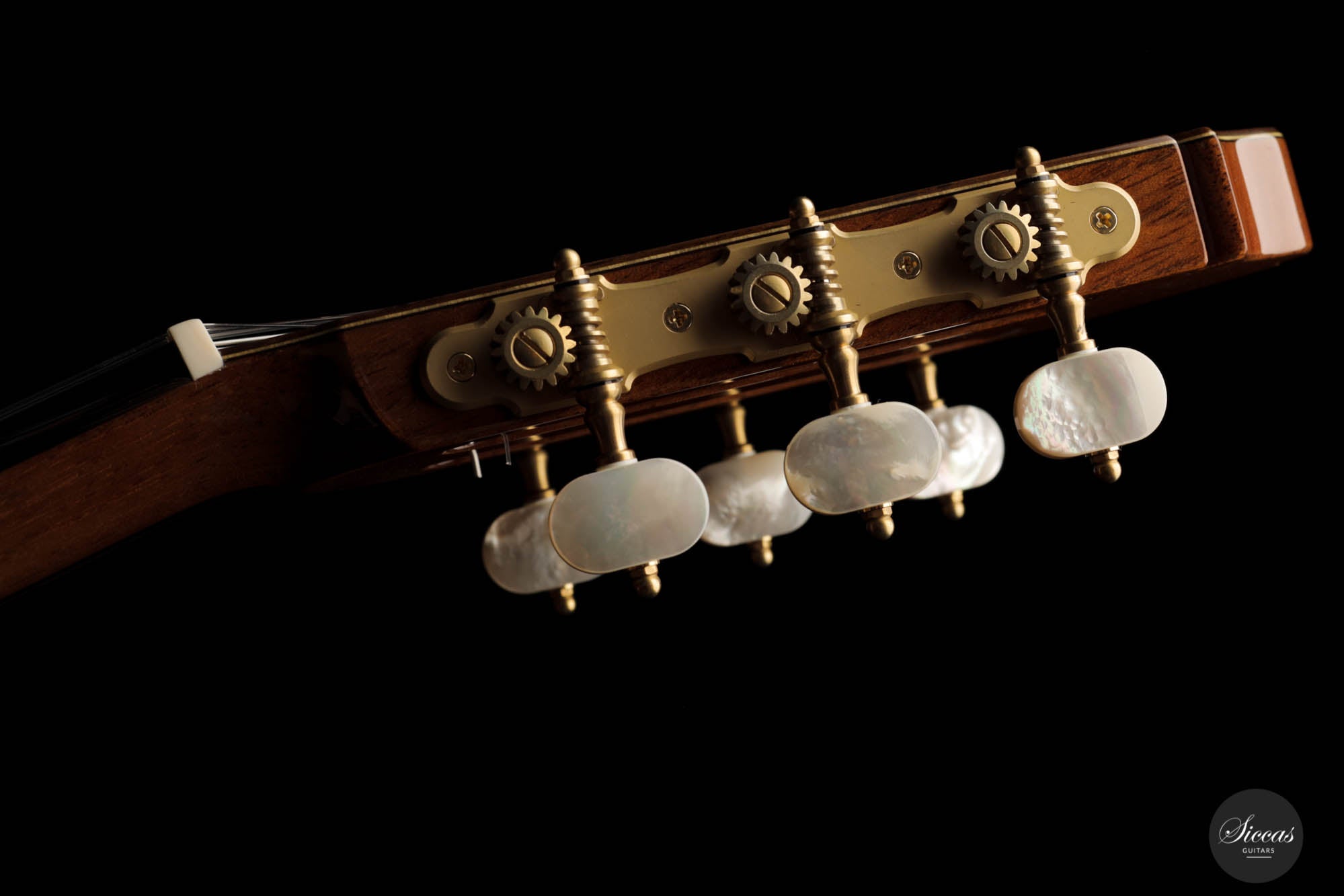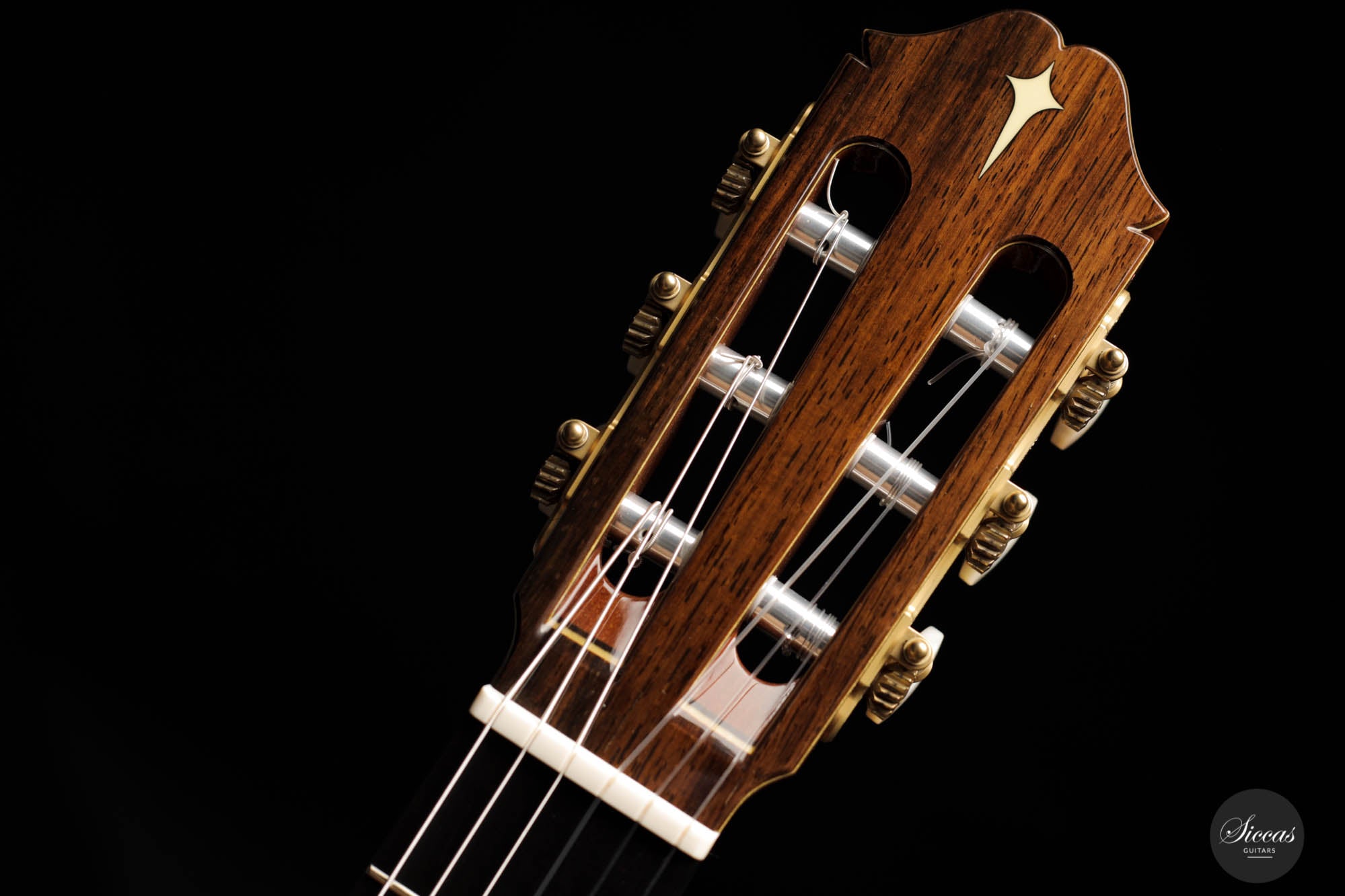 This beautiful guitar has all the aesthetic qualities of Kohno guitars, such as perfect craftsmanship and a fine-grained soundboard. The shape of the headstock is a combination of the head shape of the guitars of Robert Bouchet and Masaru Kohno. The tuners are made by Gotoh and have the peculiarity of having silver barrels.