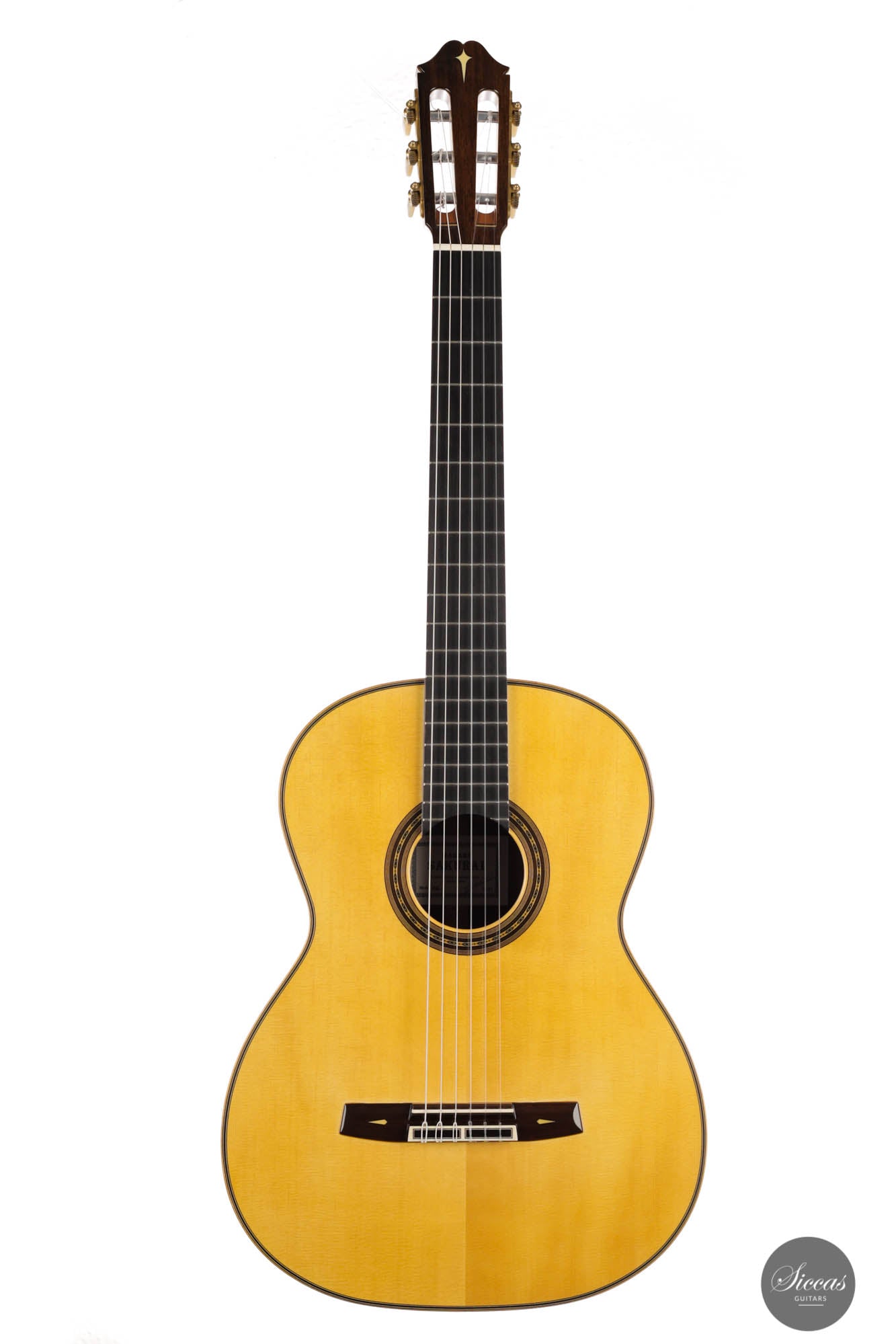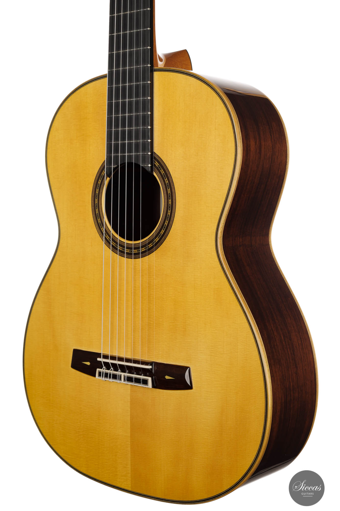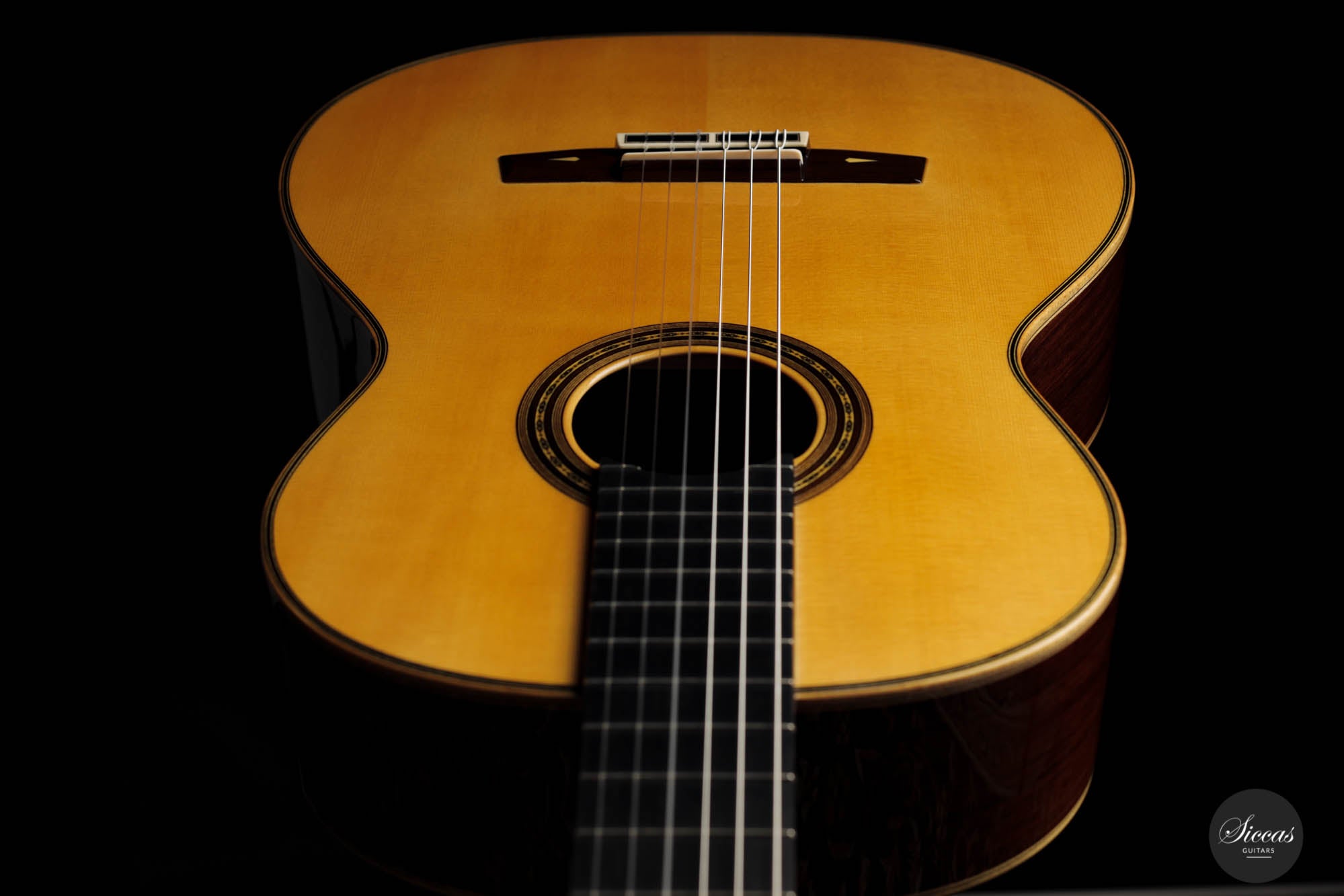 This elegant and classy guitar is a one-to-one replica of the instrument that won Mazaki Sakurai the first prize at the 1988 prestigious Paris International Guitar Luthiers Competition. This model "PC", standing for "Paris Competition", crystallizes Mazaki Sakurai's decades of experience in one guitar. It is characterized by the finest woods, most elaborate bracing pattern, and richest sound.