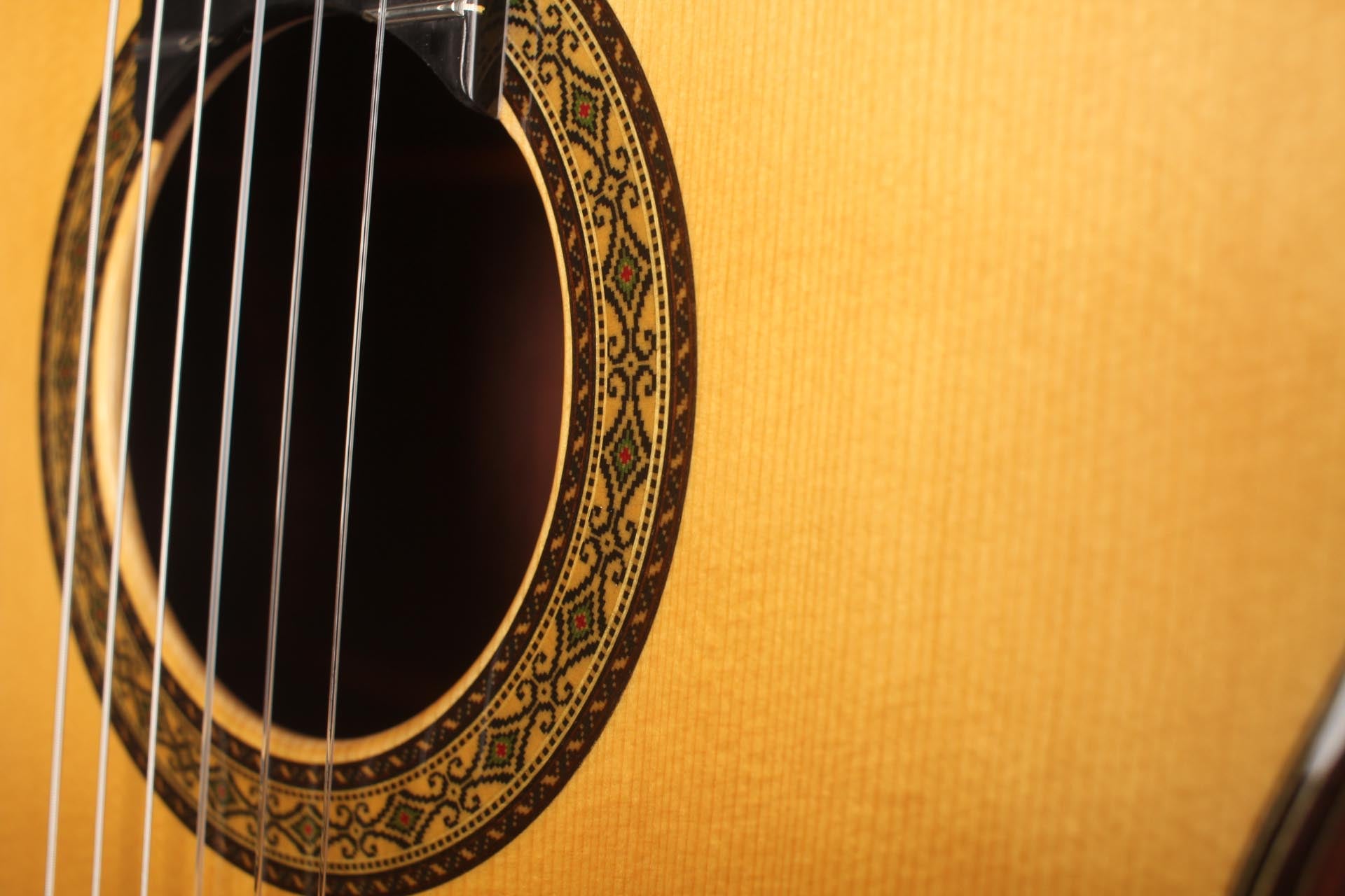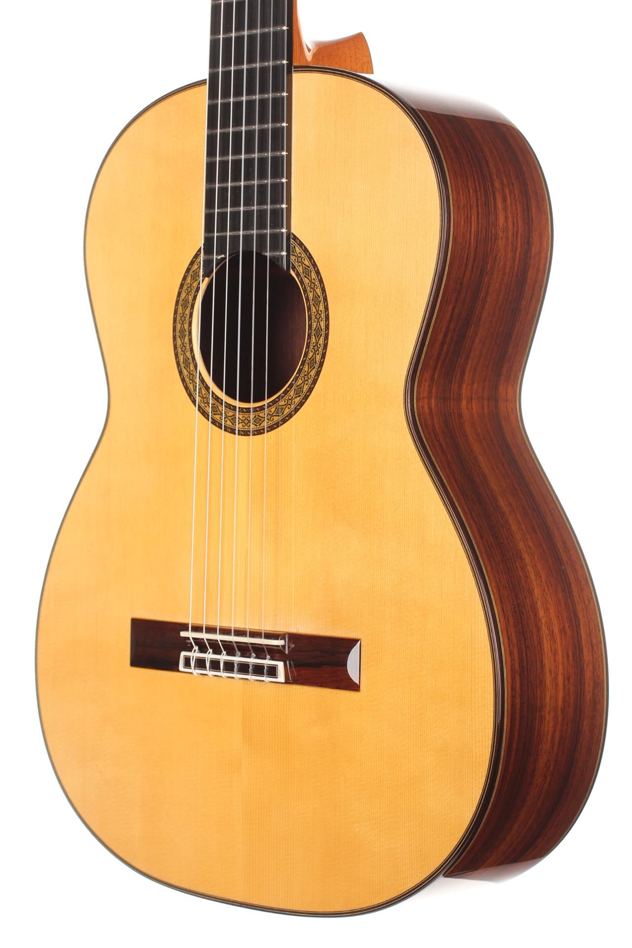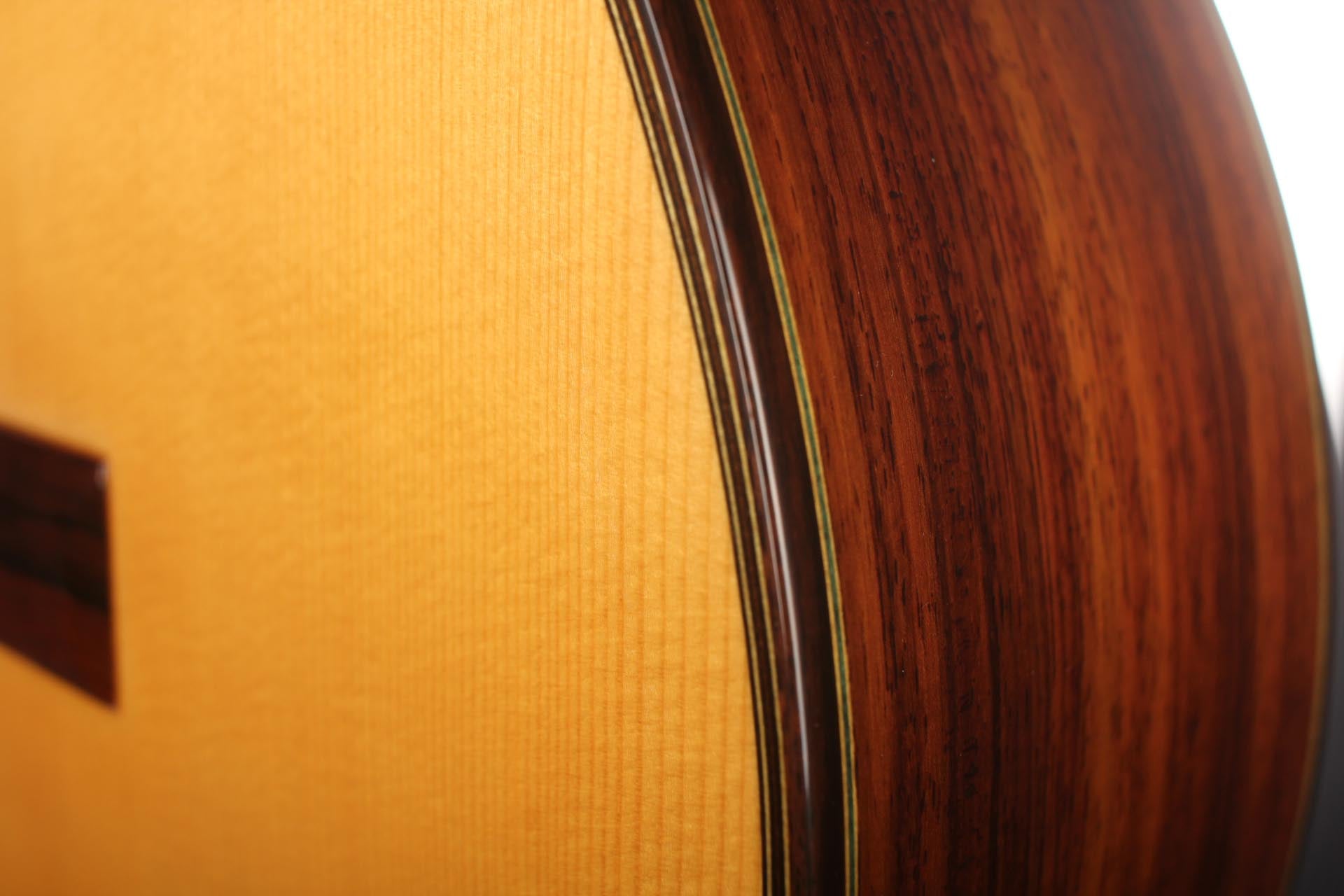 About the guitar: This Concert-R model was made by So Kimishima. He is the grandson of Masaru Kohno and the nephew of Masaki Sakurai, and he has worked for over 10 years as a luthier in the Sakurai workshop. The spruce top of this beautiful guitar and the red-hued Indian Rosewood back and sides give the guitar a warm, appealing appearance. The rosewood binding and back strip are embedded between two plain green stripes. The sound is warm but forceful with pearly trebles, and it has an excellent response. The tuners are made by Fustero. A hard-shell case is included.